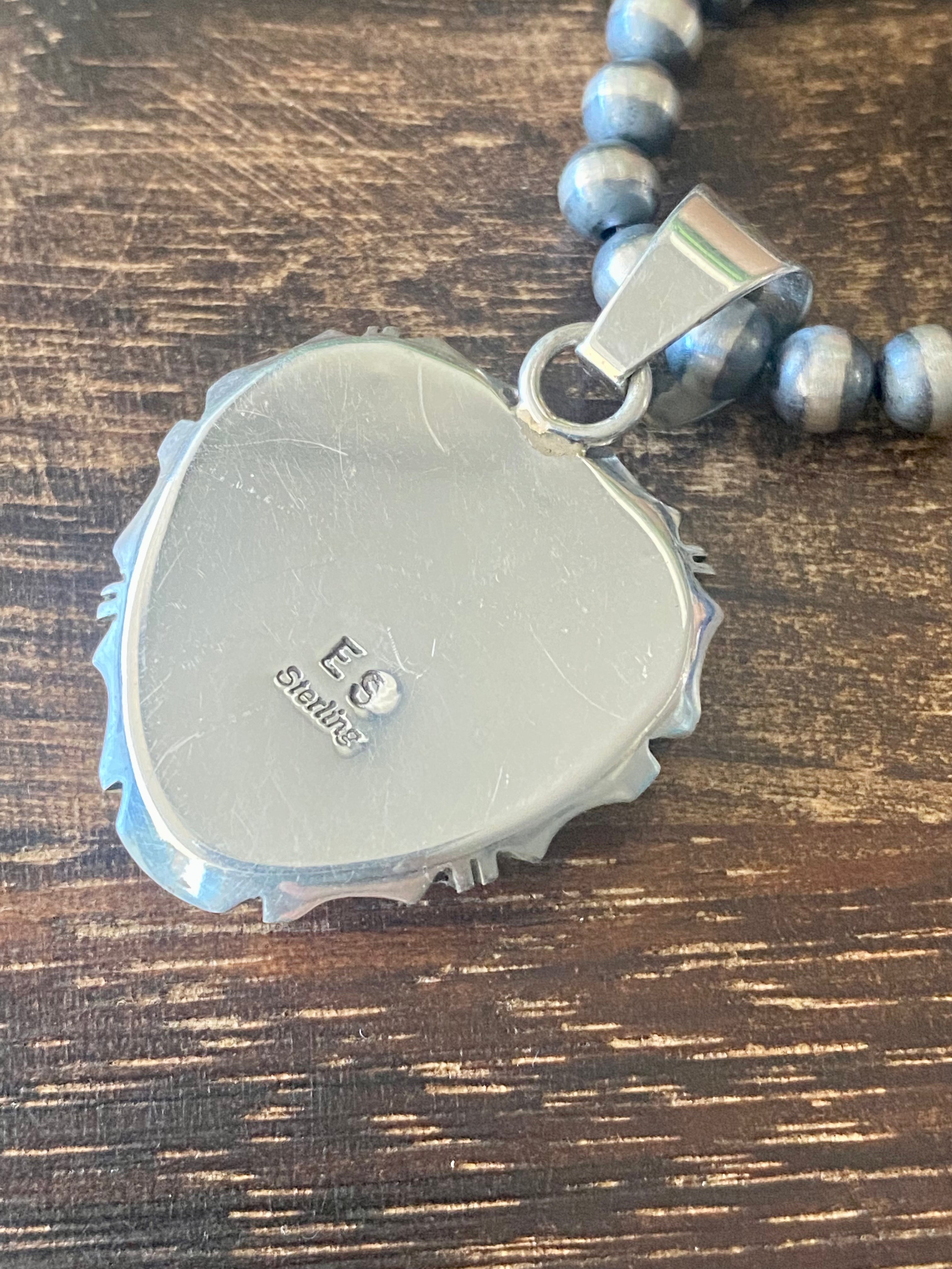Eddie Secatero Ribbon Royston Turquoise & Sterling Silver Heart Pendant. It measures 2 inches long and 1 1/4 inches wide. Pendant Only!! Signed by the artist and stamped sterling silver.