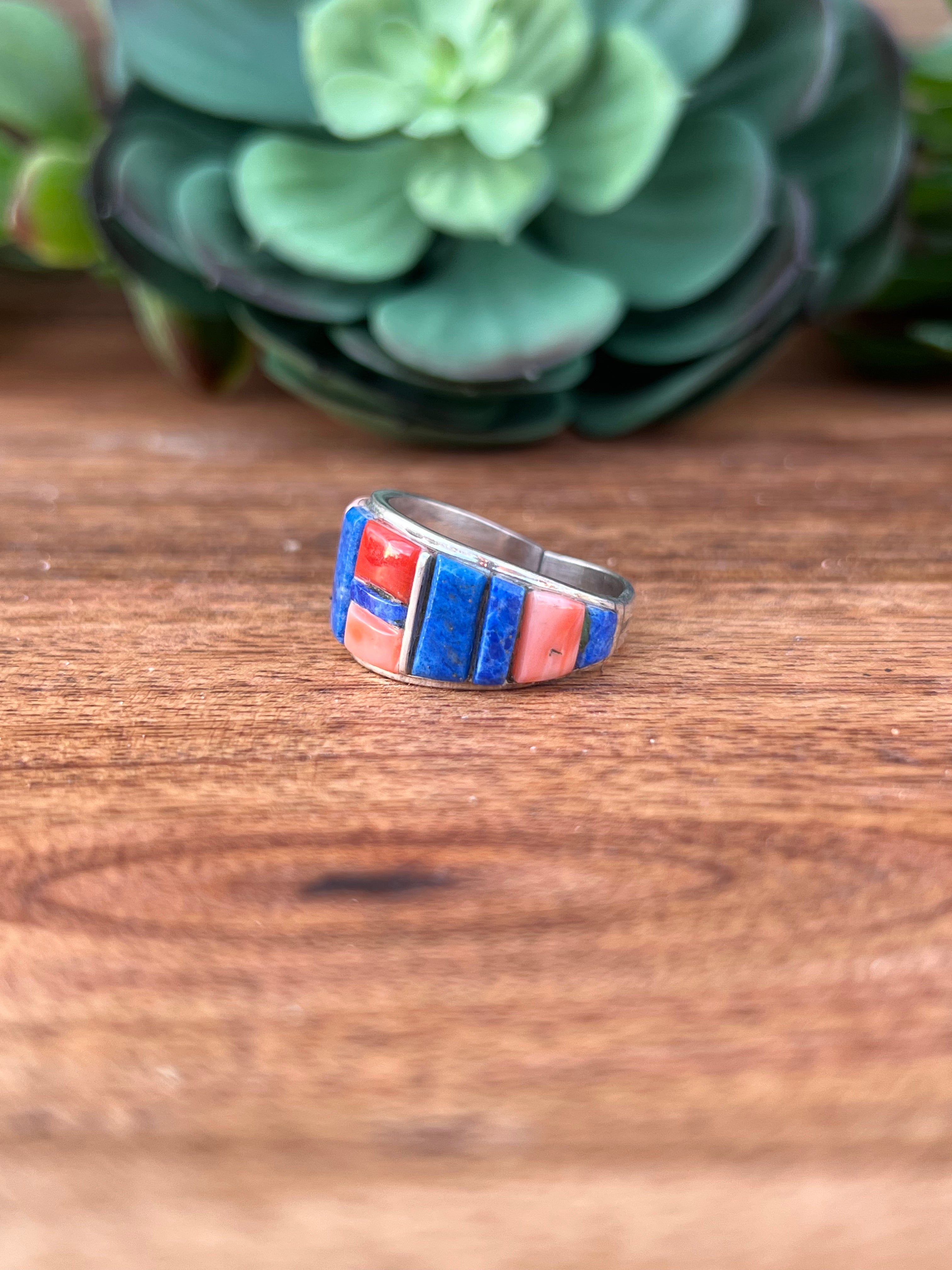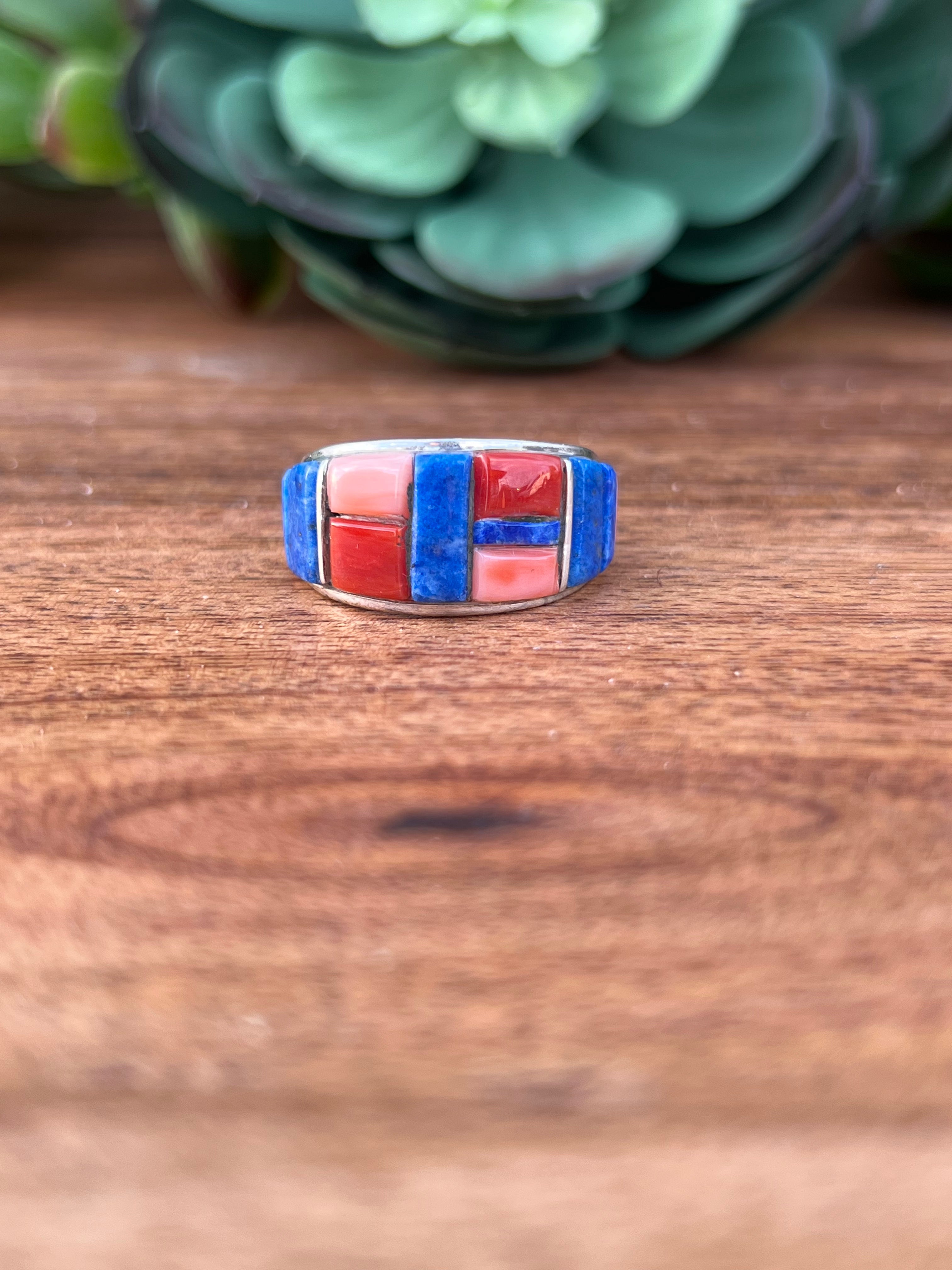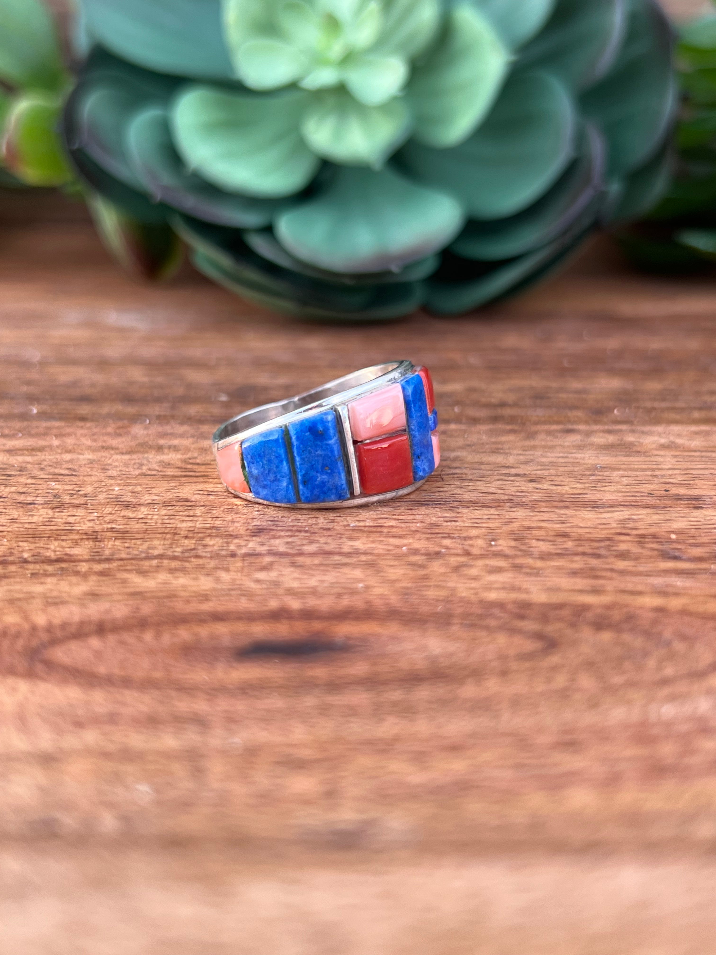 Edison Yazzie Multi Stone & Sterling Silver Inlay Ring Size 10.5