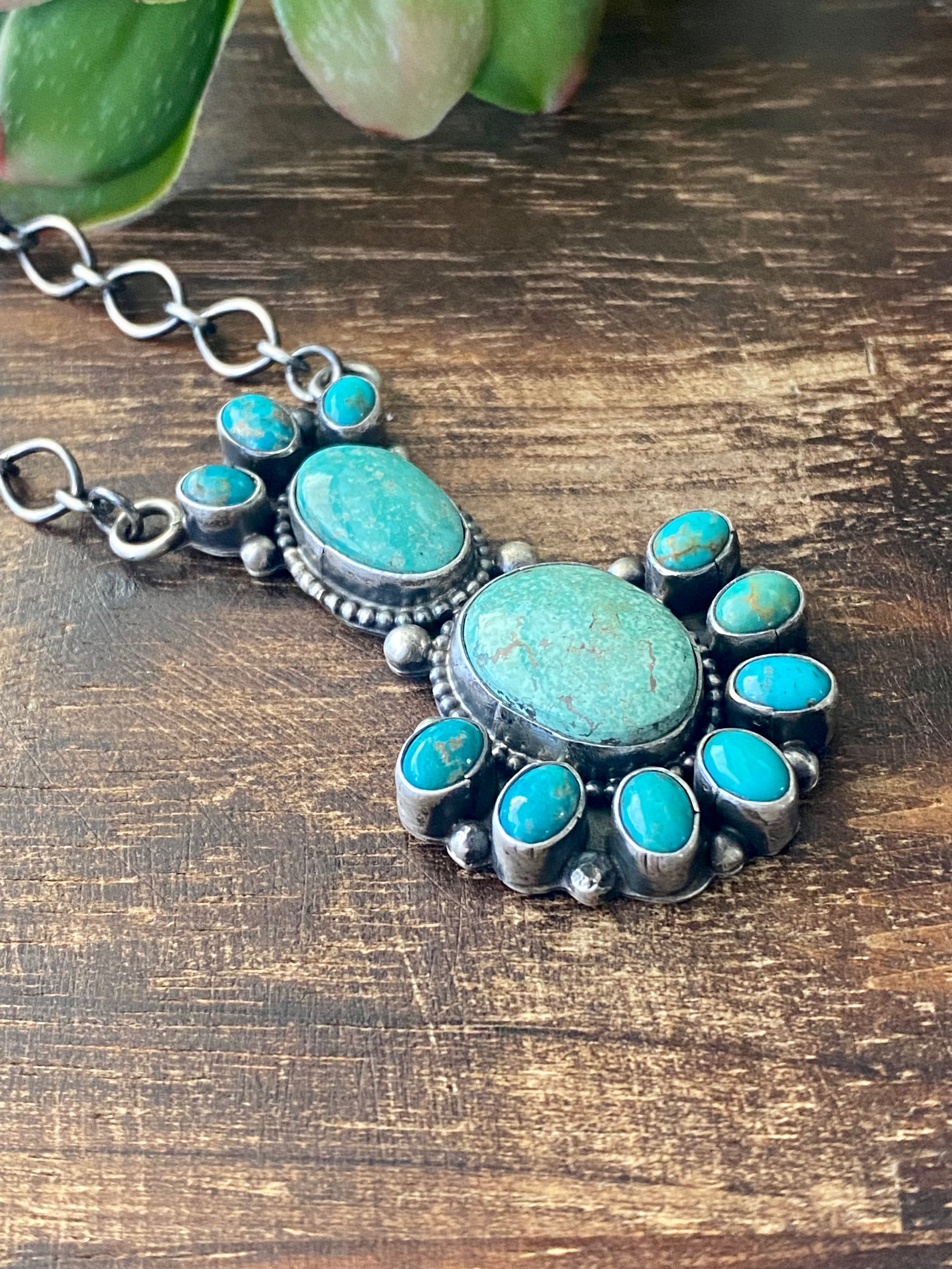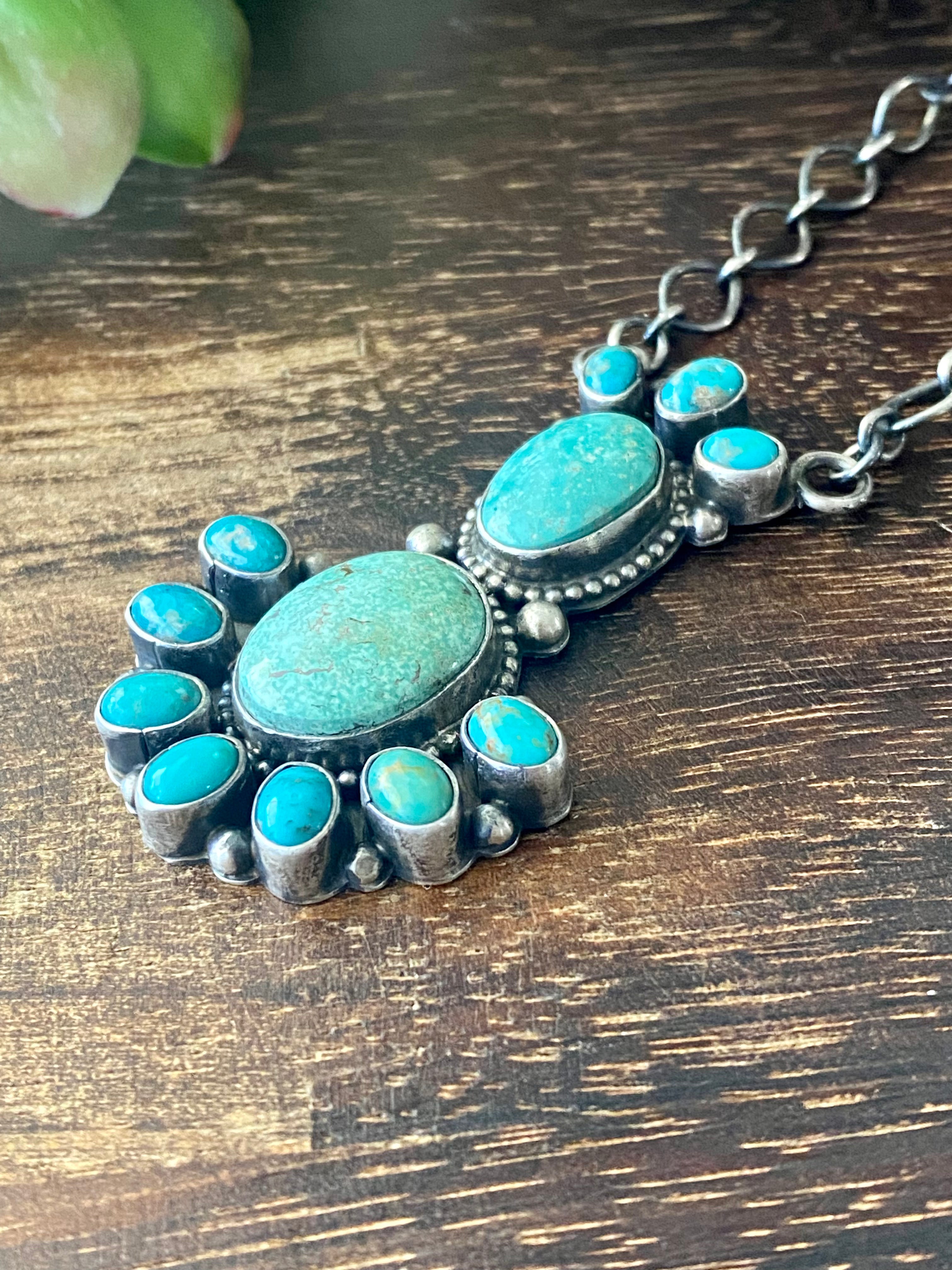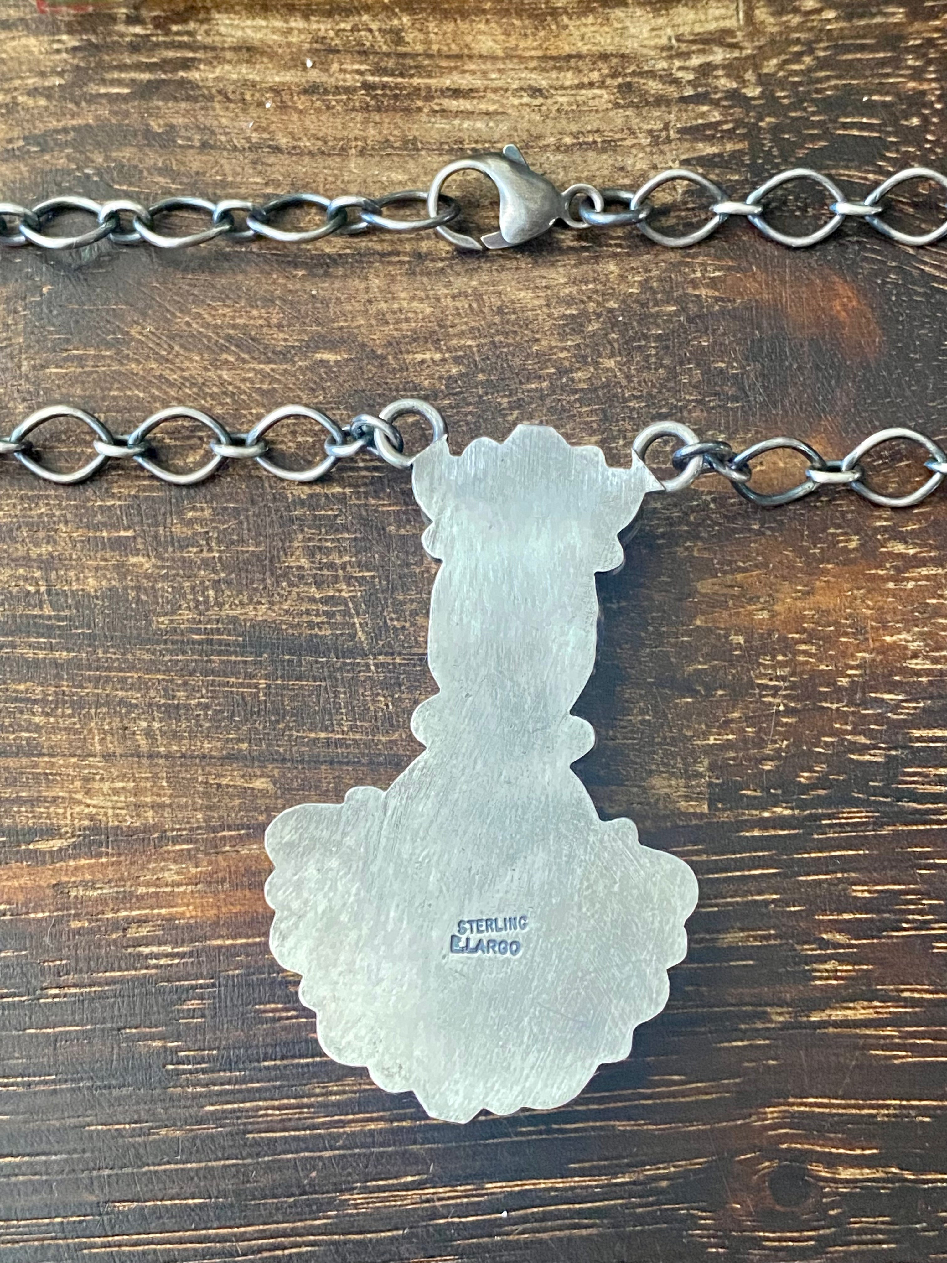 Eleanor Largo Royston Turquoise & Sterling Silver Necklace. It measures 23 inches long with hang while the chain measures 19 inches long. Signed by the artist and stamped sterling silver.