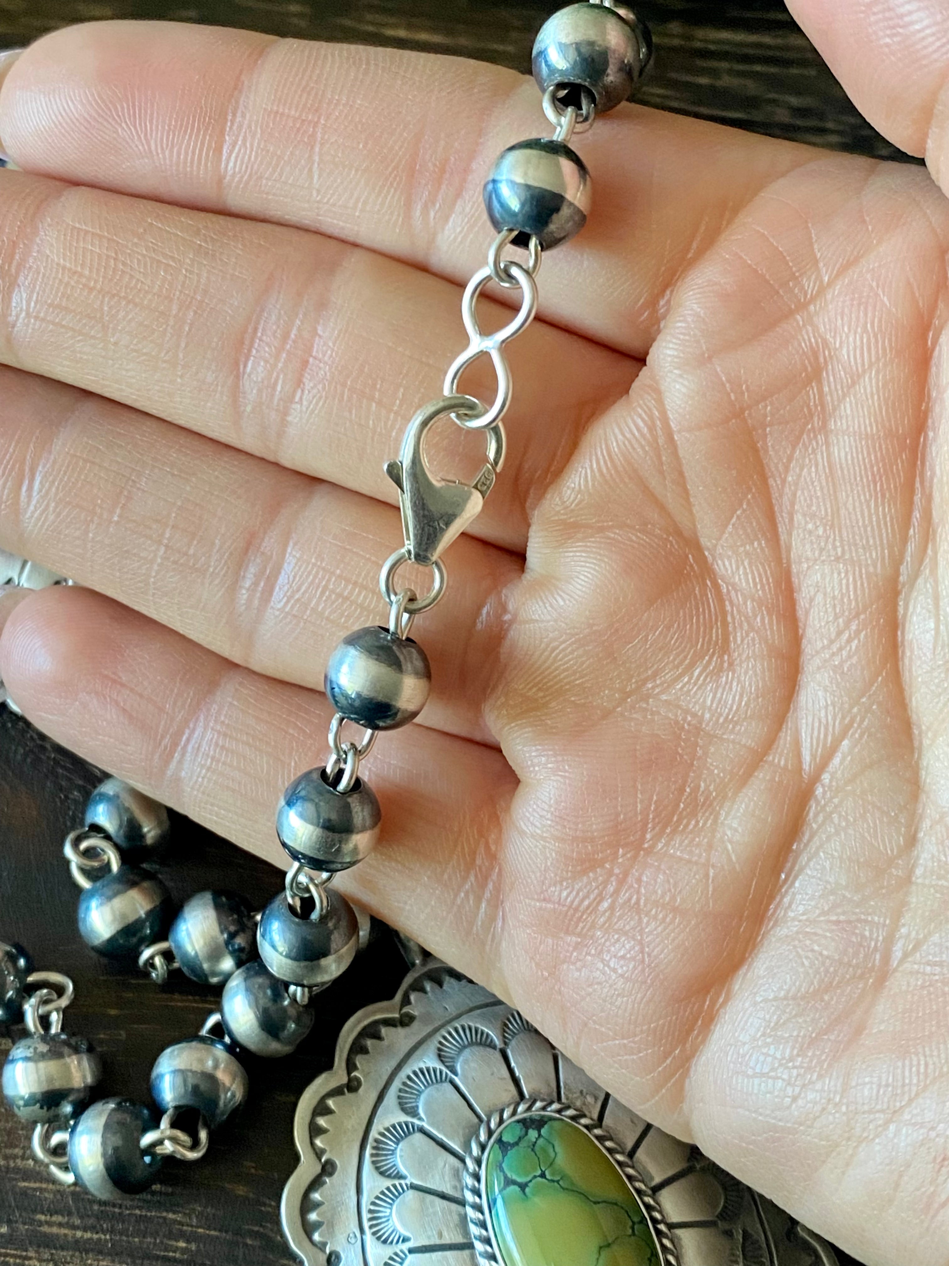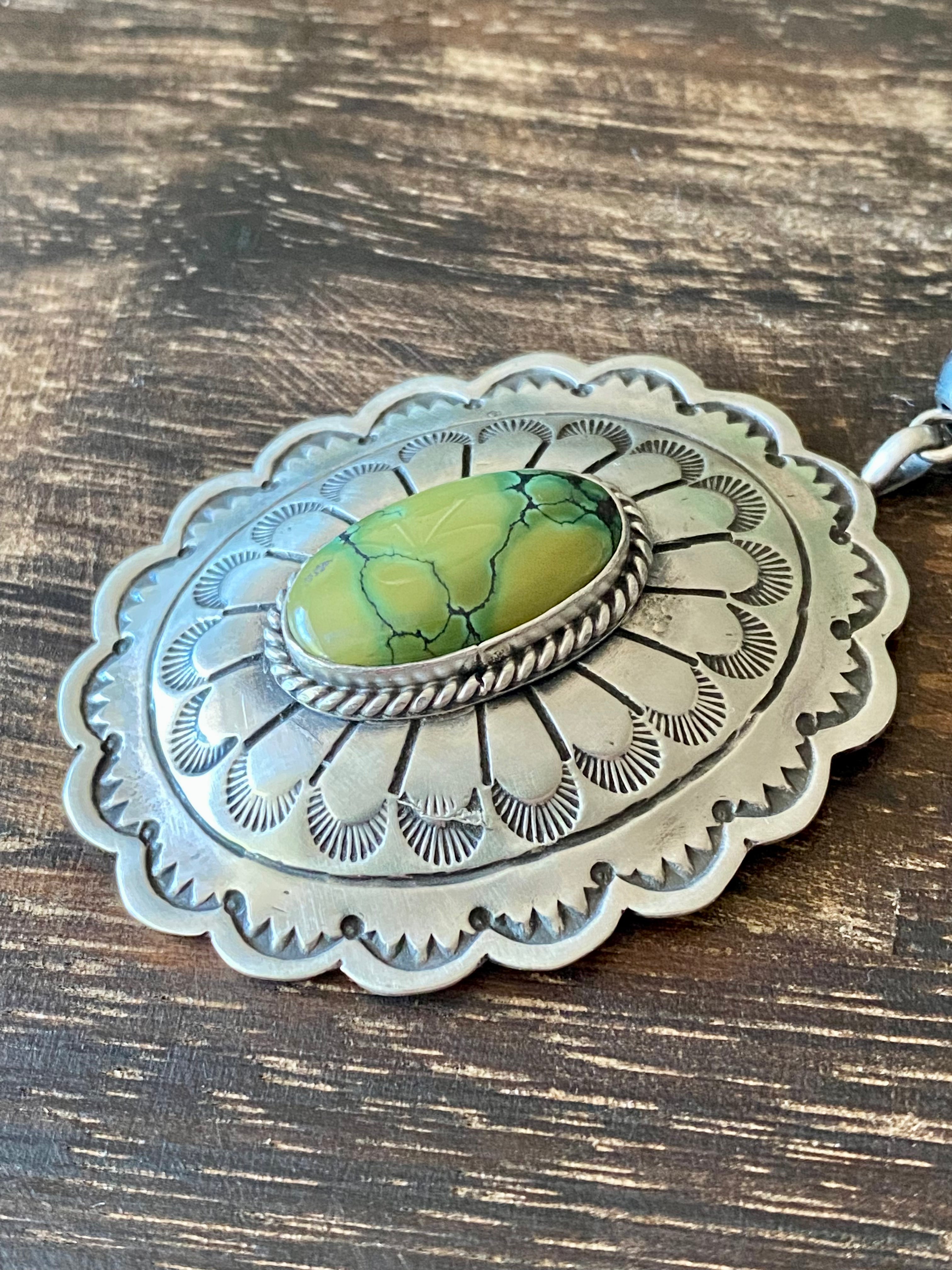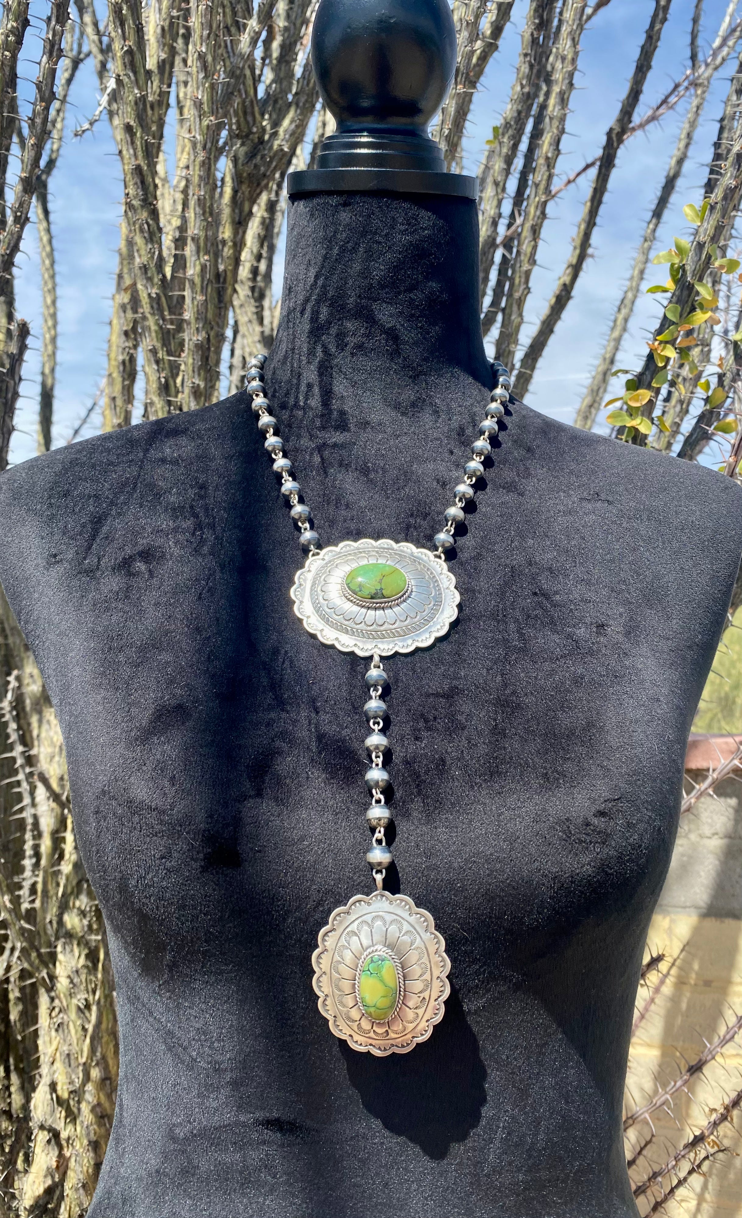 Eleanor Richards Hubei Turquoise & Sterling Silver Concho Drop Necklace. It measures 34 inches long with hang while the chain by itself measures 18 inches long. Signed by the artist and stamped sterling silver.