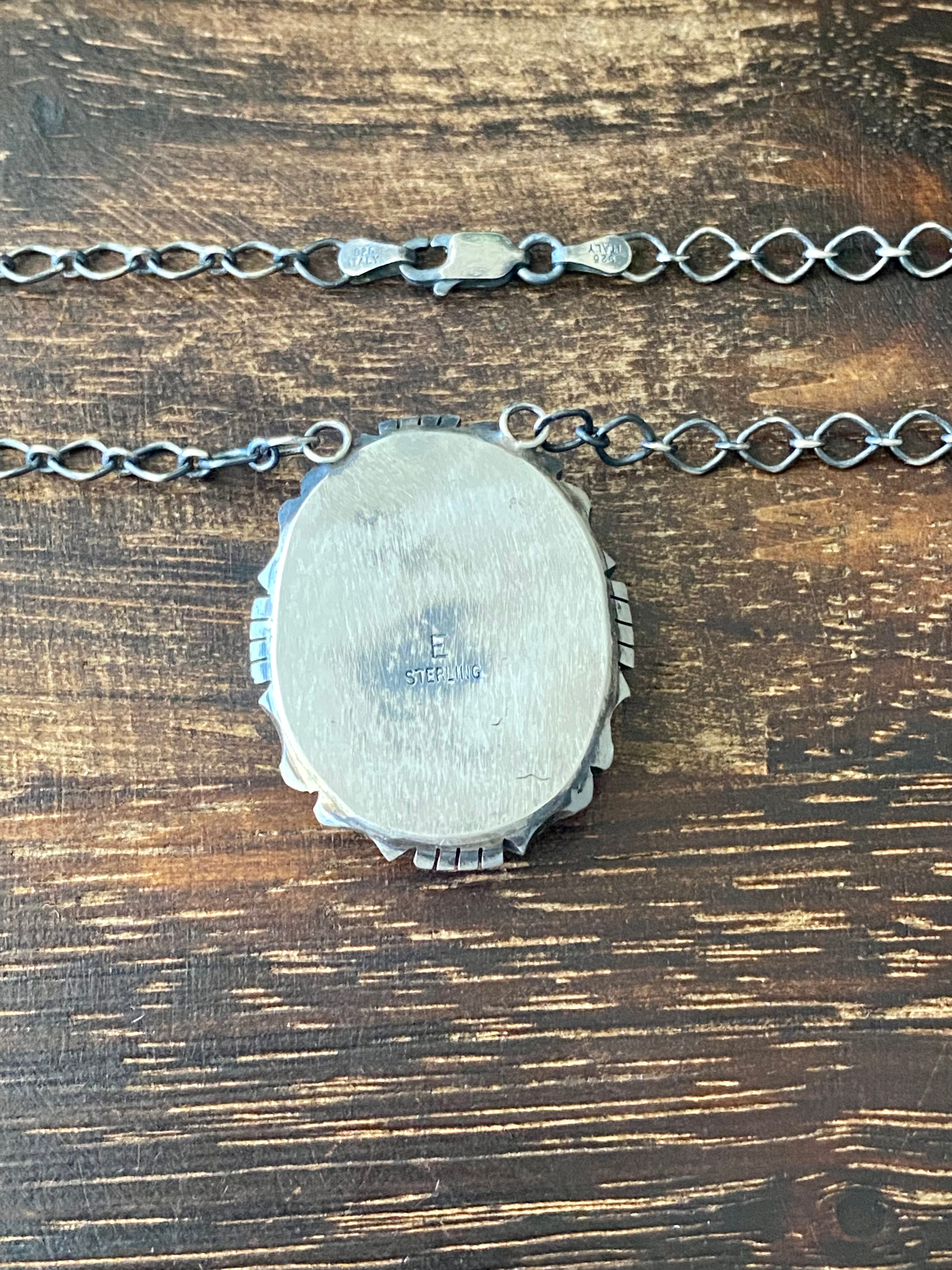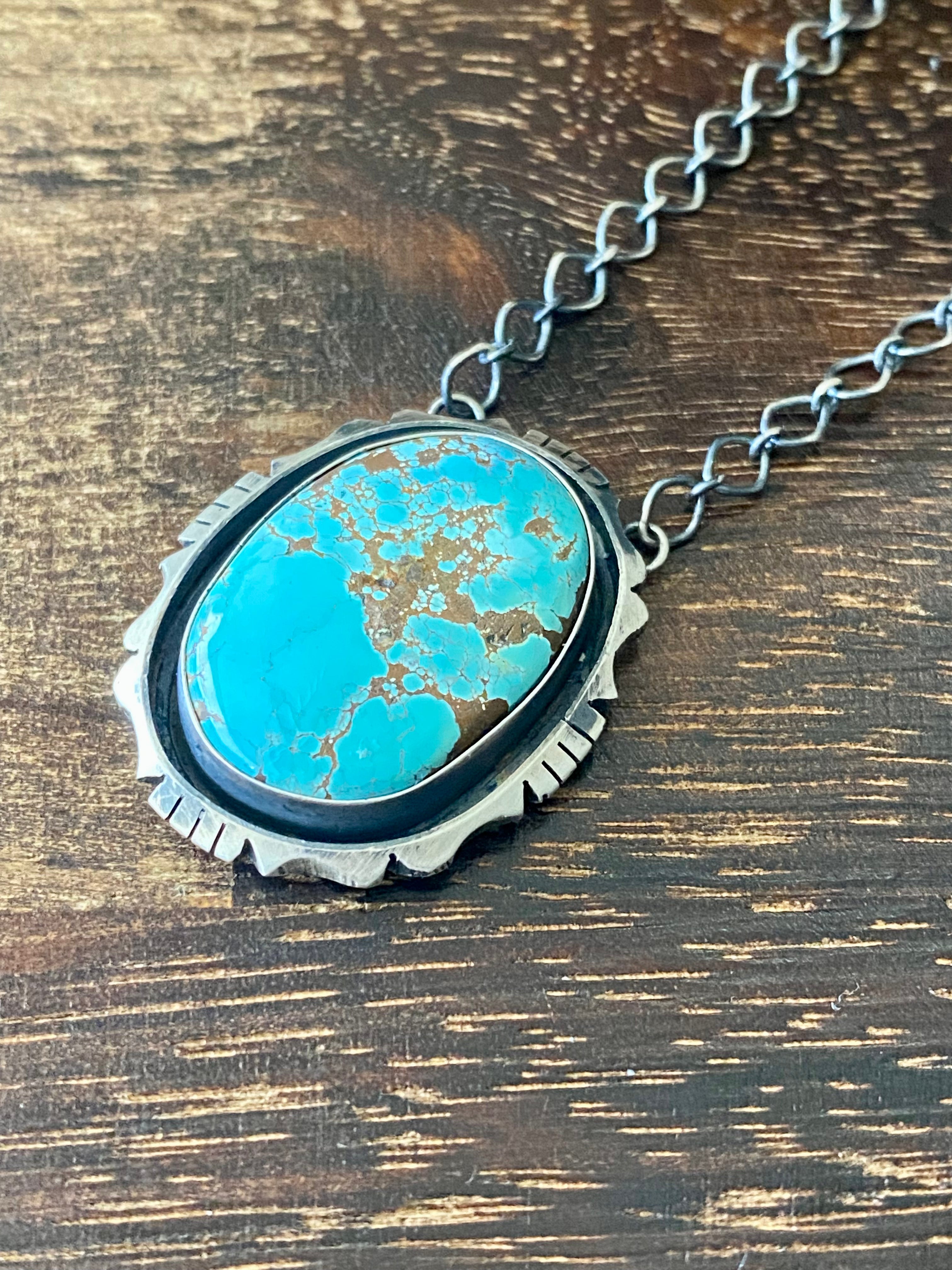 Eli Skeets #8 Turquoise & Sterling Silver Necklace. It measures 18 inches long with hang while the chain by itself measures 16 inches long. Signed by the artist and stamped sterling silver.