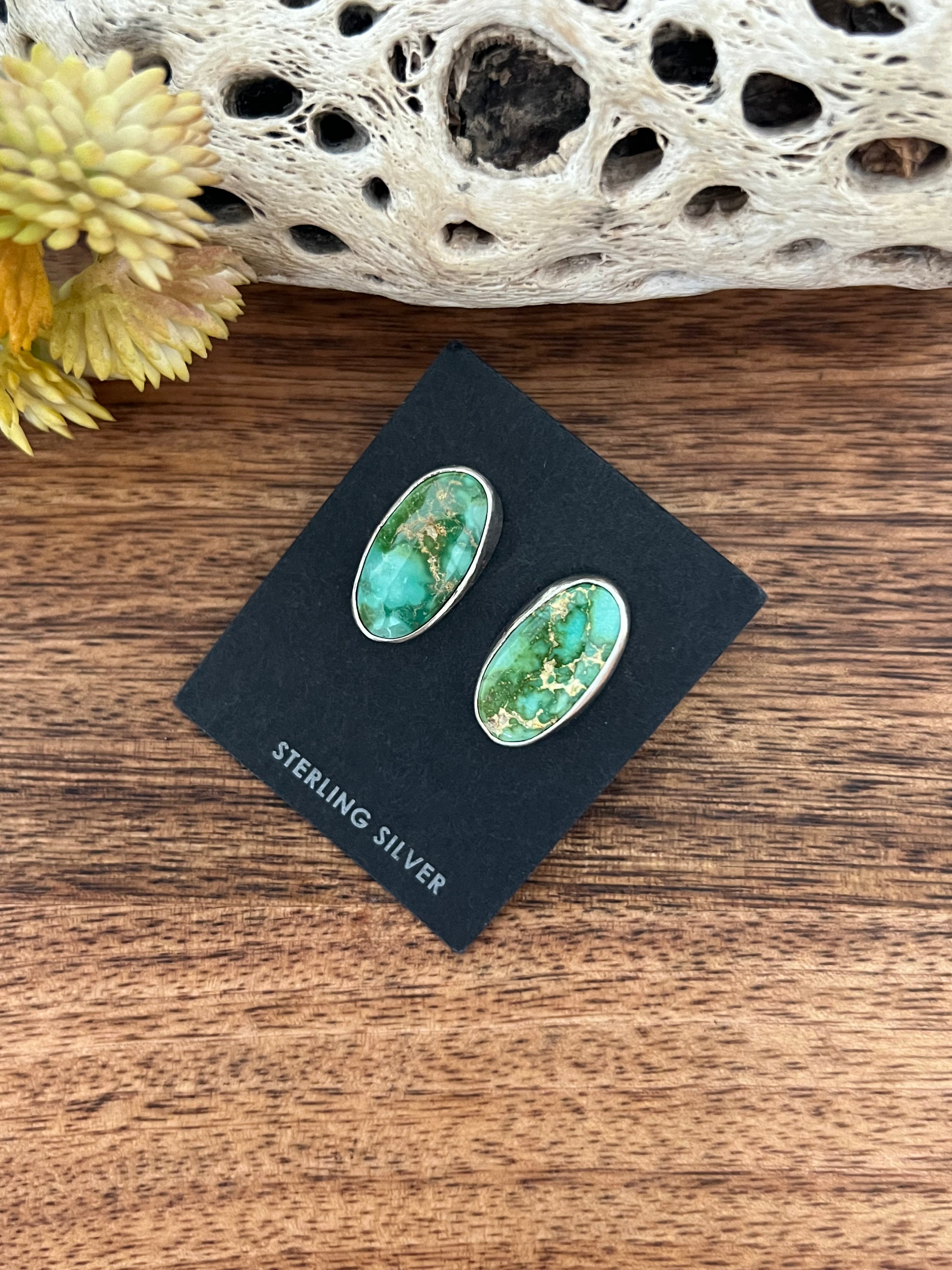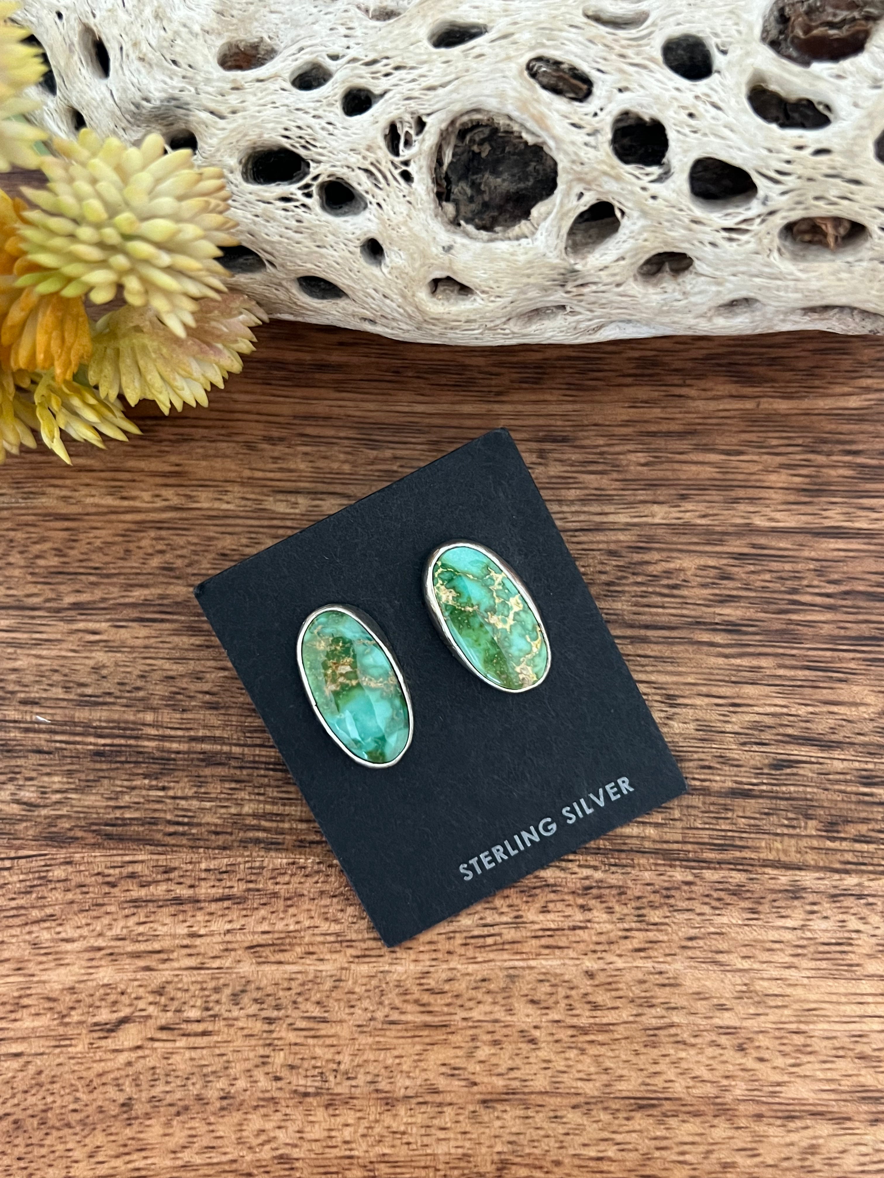 Eli Skeets Sonoran Gold & Sterling Silver Post Earring. It measures just over 1/2 an inch long and 3/8 of an inch wide. Signed by artist and stamped sterling silver.