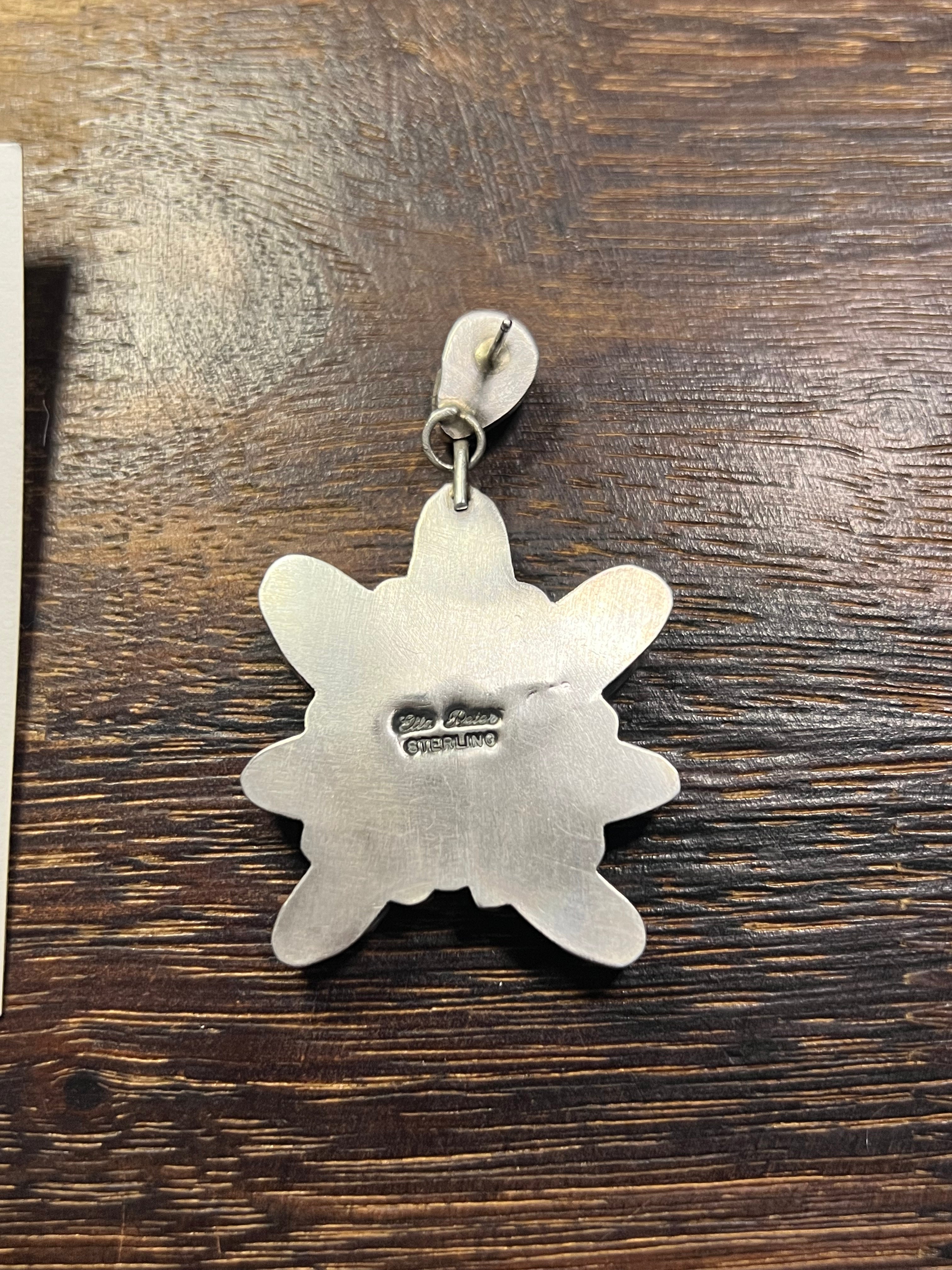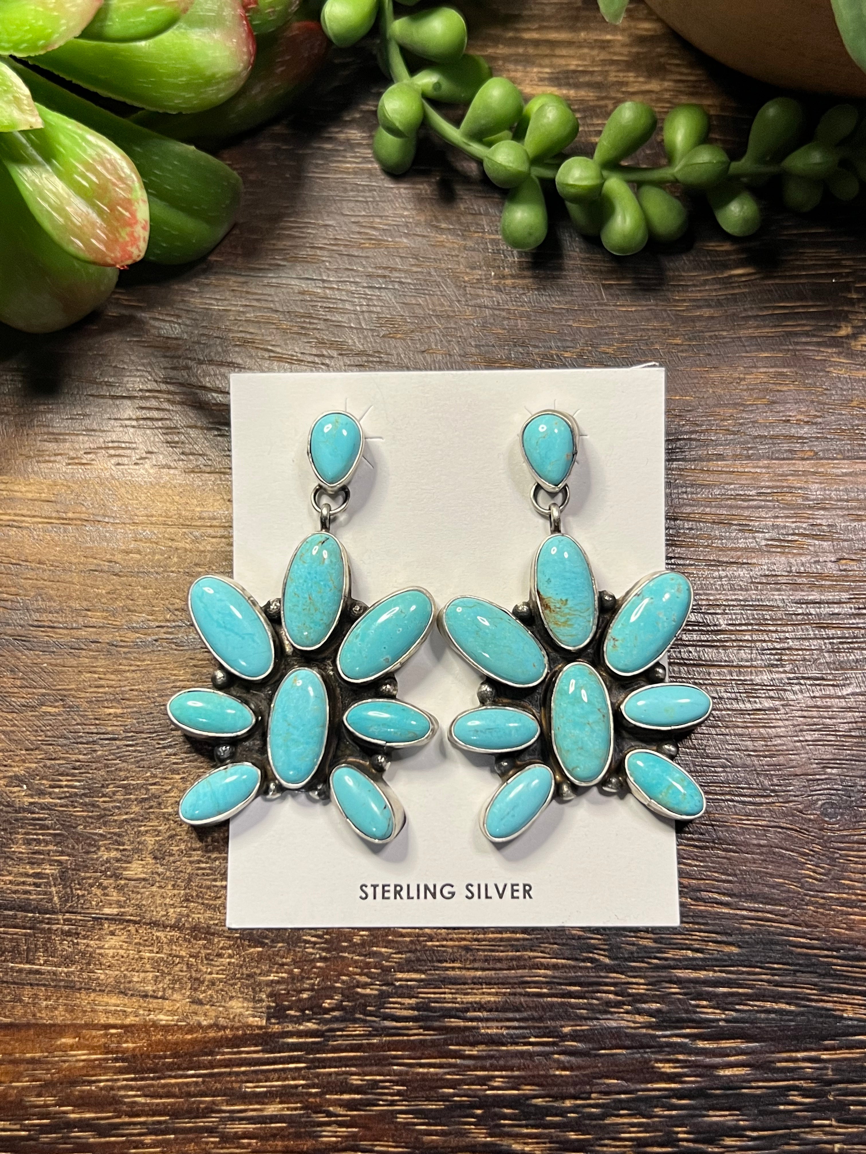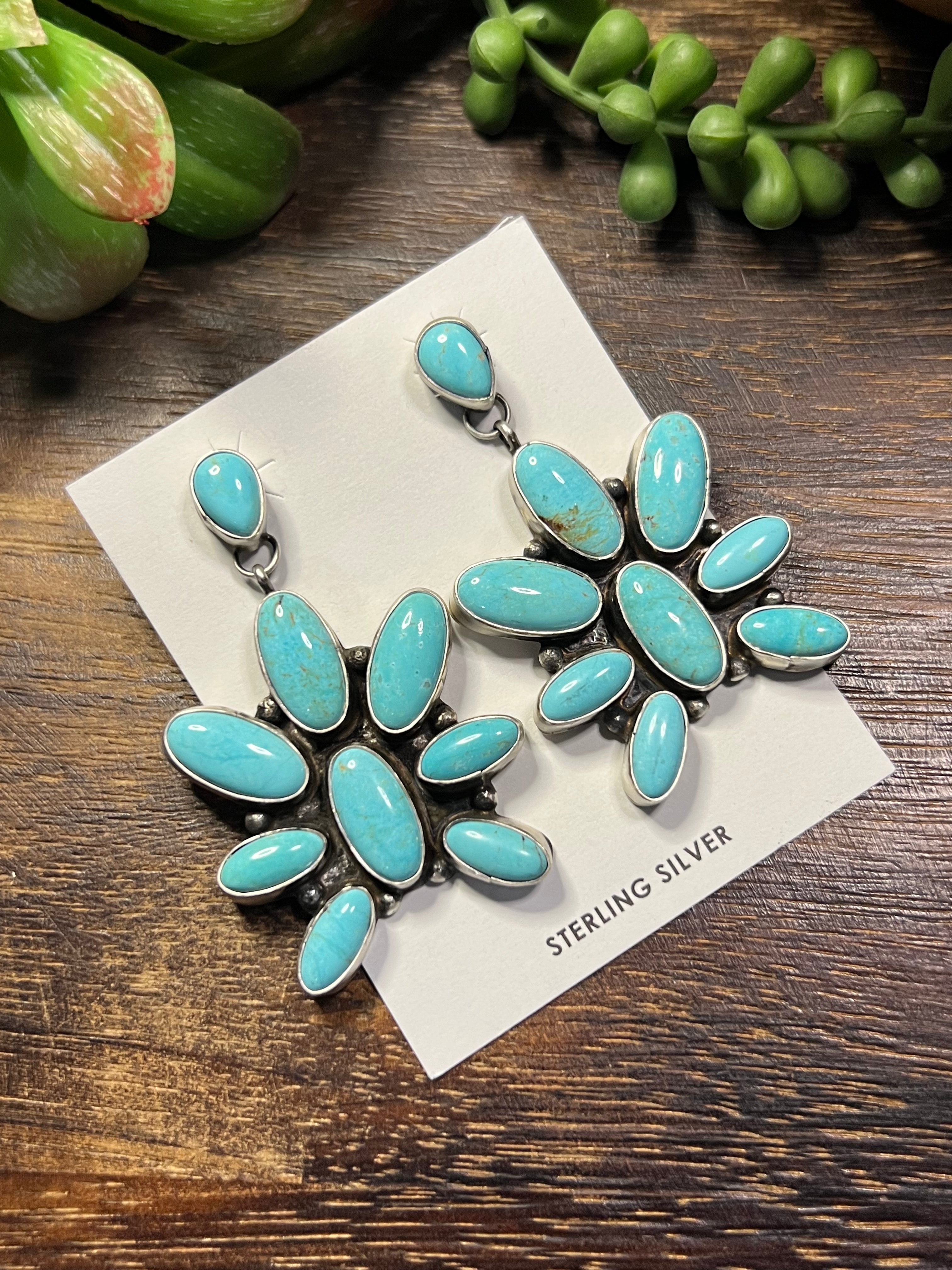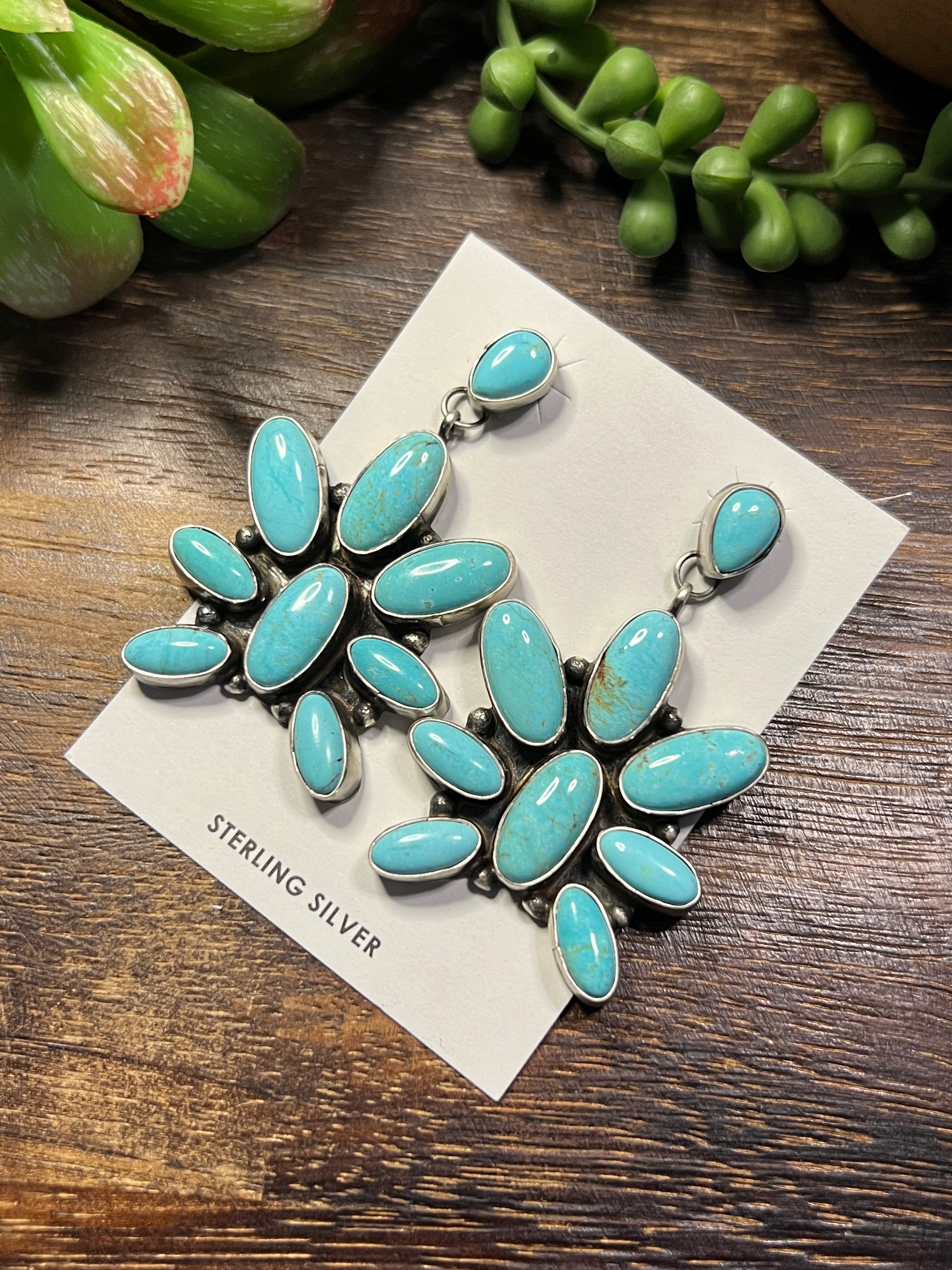 Ella Peters Royston Turquoise & Sterling Silver Dangle Earrings. It measures just over 2 1/4inch long and 1 3/8 inches wide. Signed by artist and stamped sterling silver.