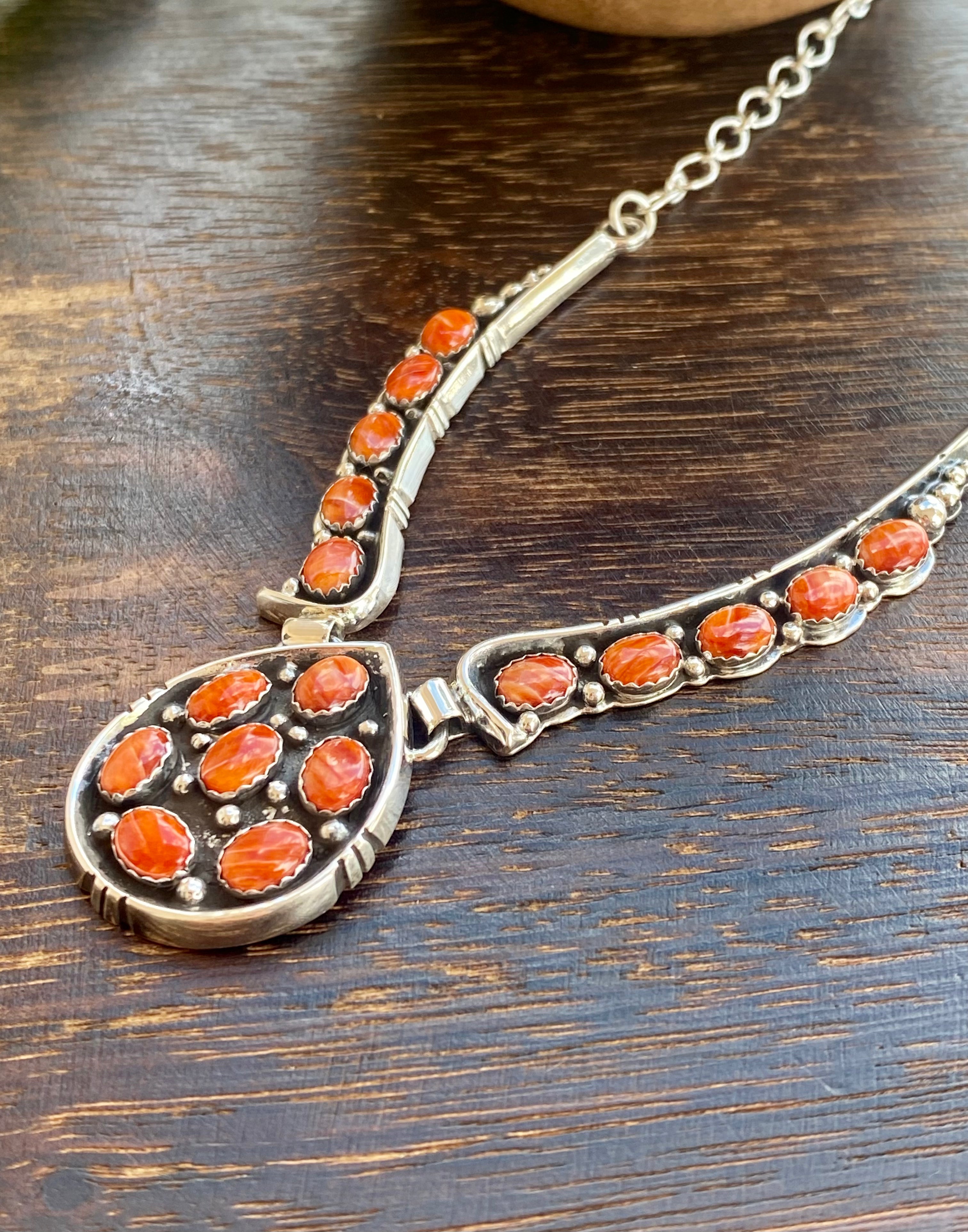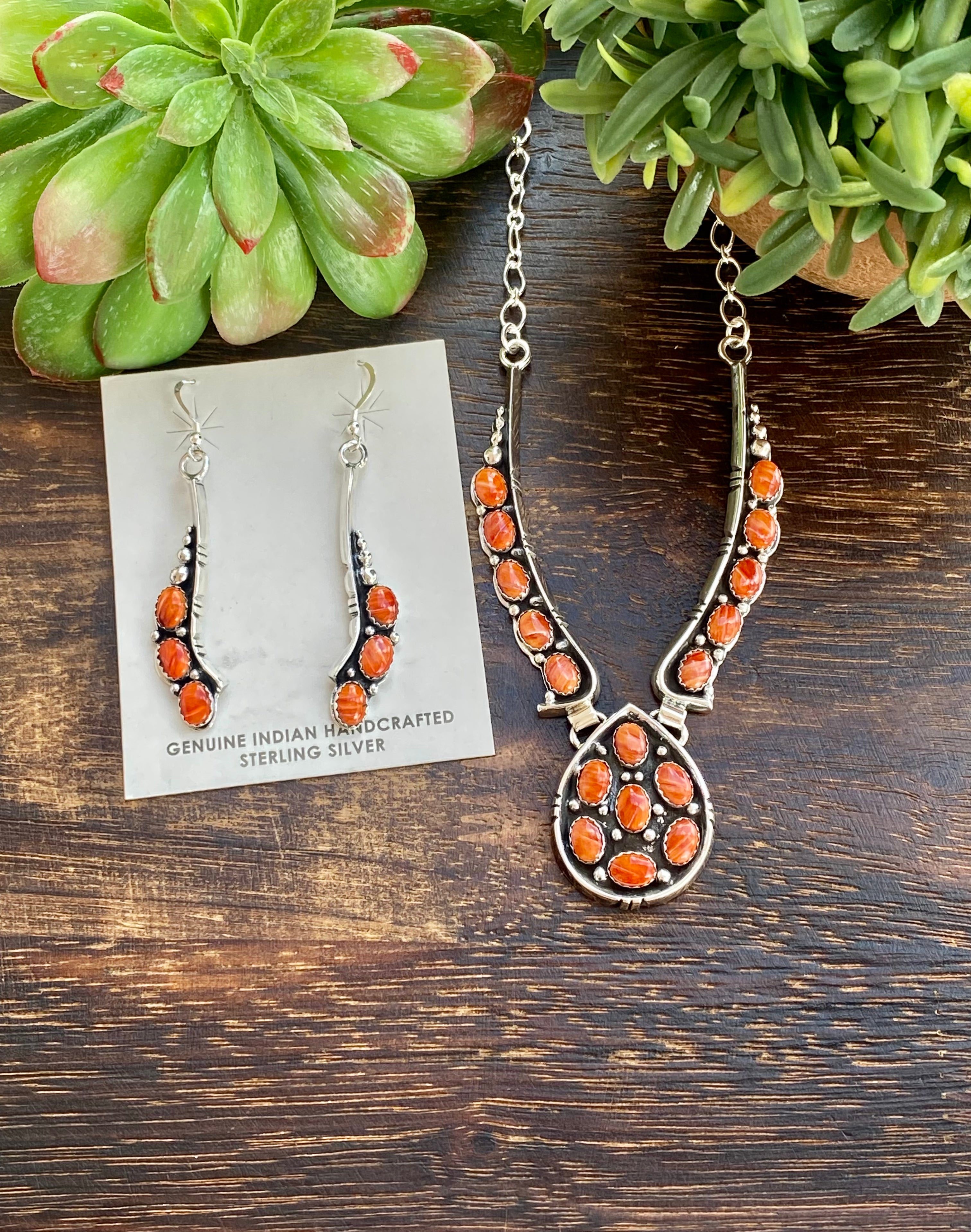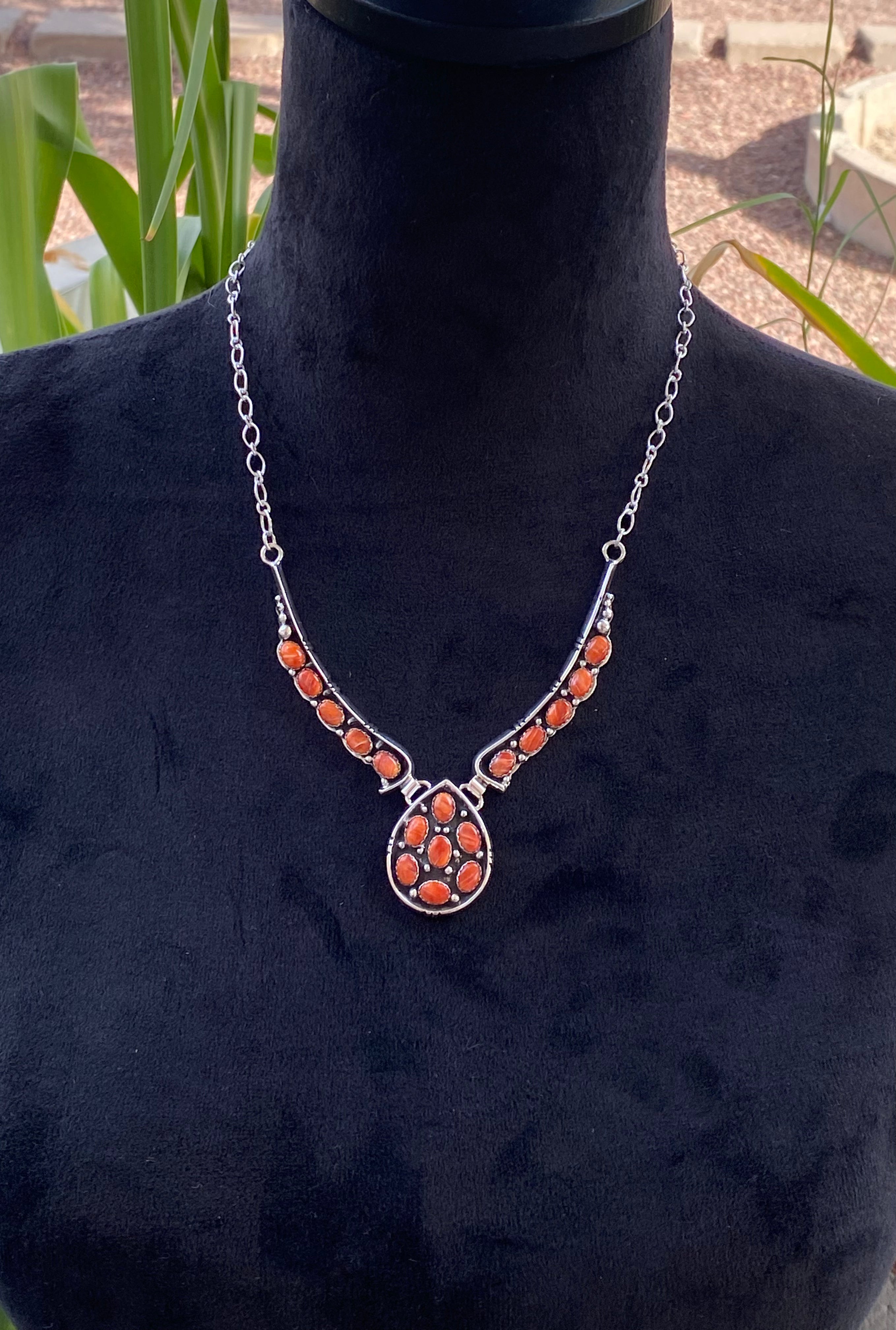 Emer Thompson Red Spiny Oys & Sterling Silver Cluster Necklace Set. It measures just under 22 inches long with hang while earrings are 2 1/2 inches long and just under 1/2 of an inch wide. Signed by the artist and stamped sterling silver.