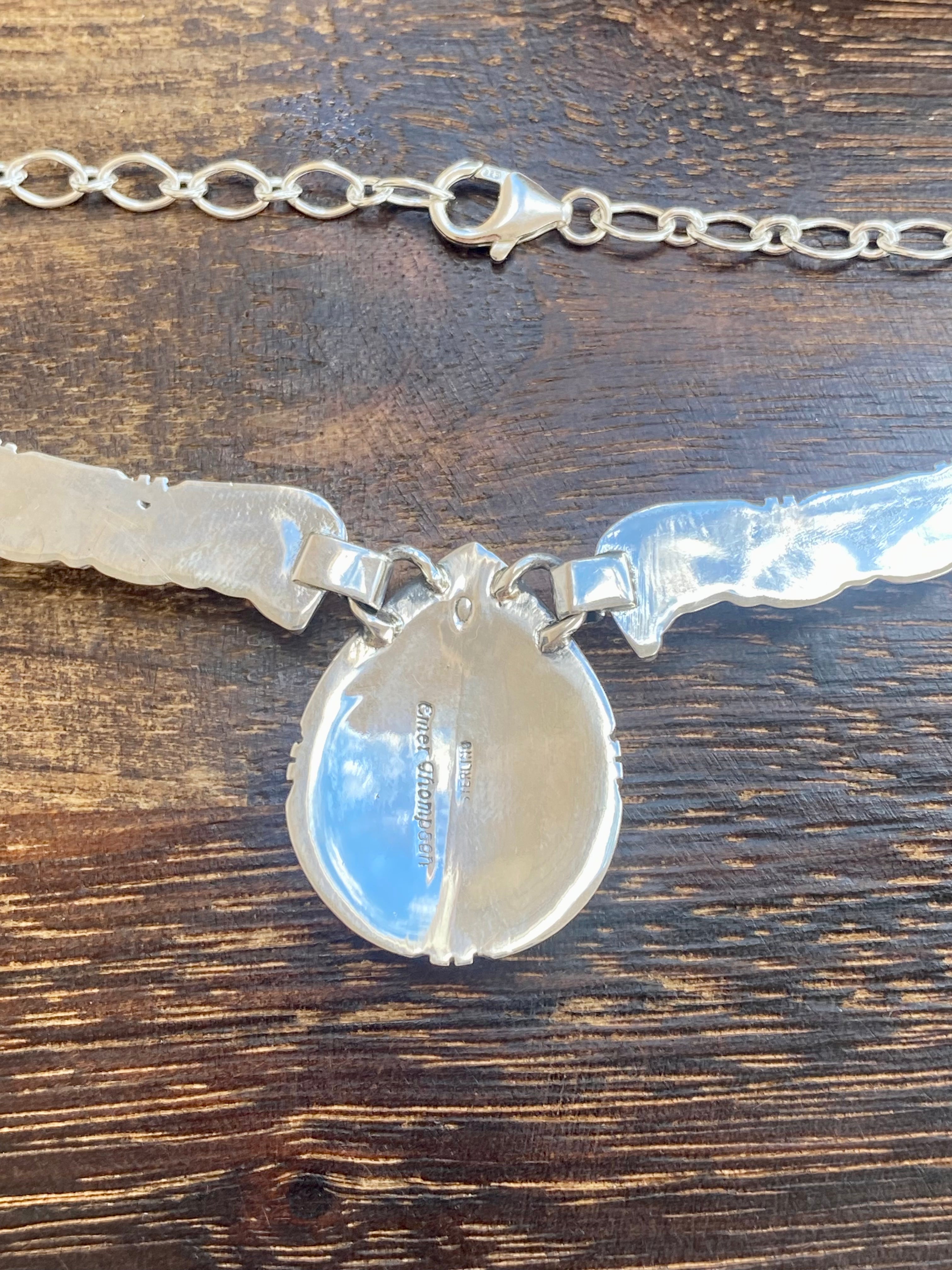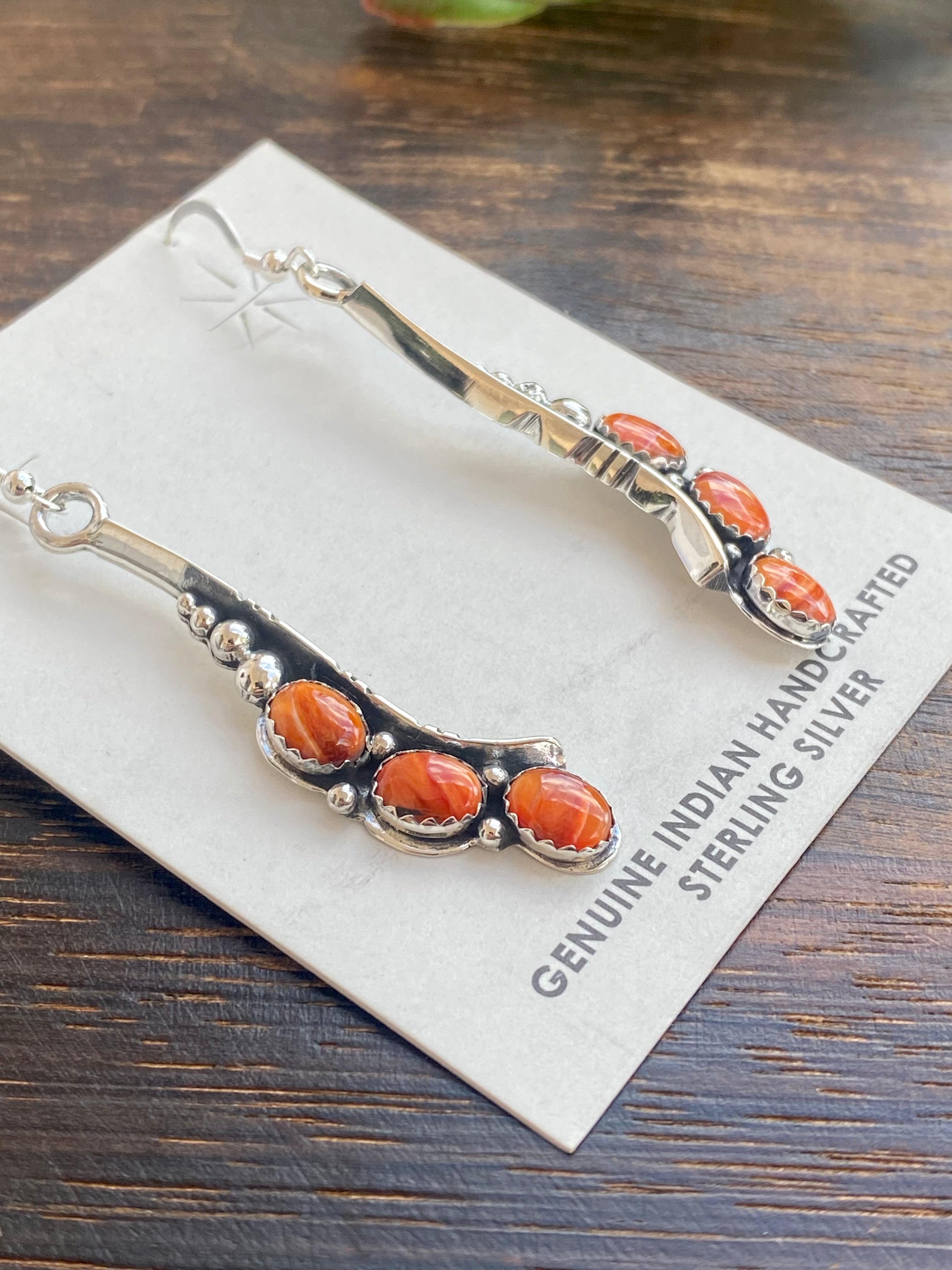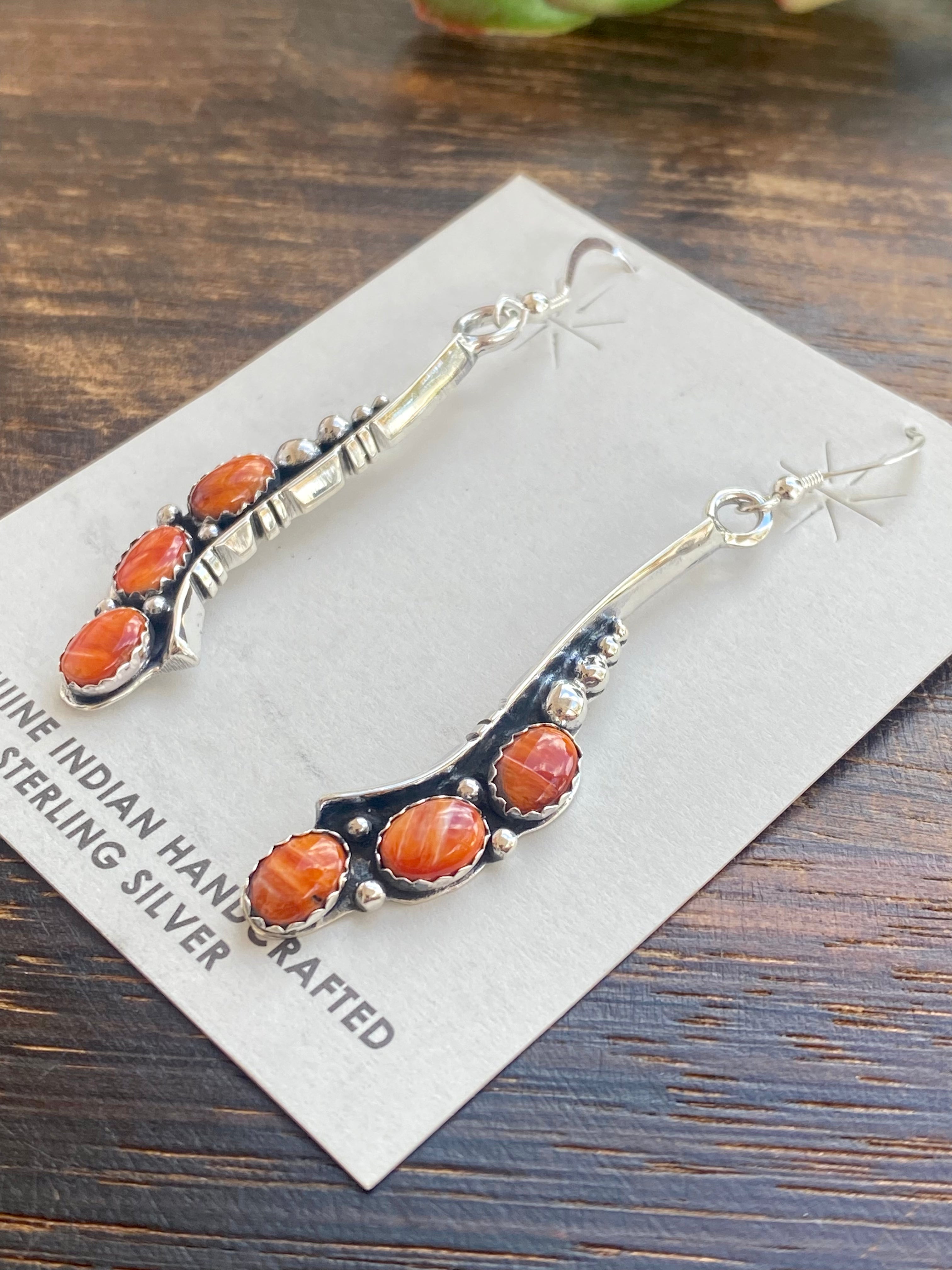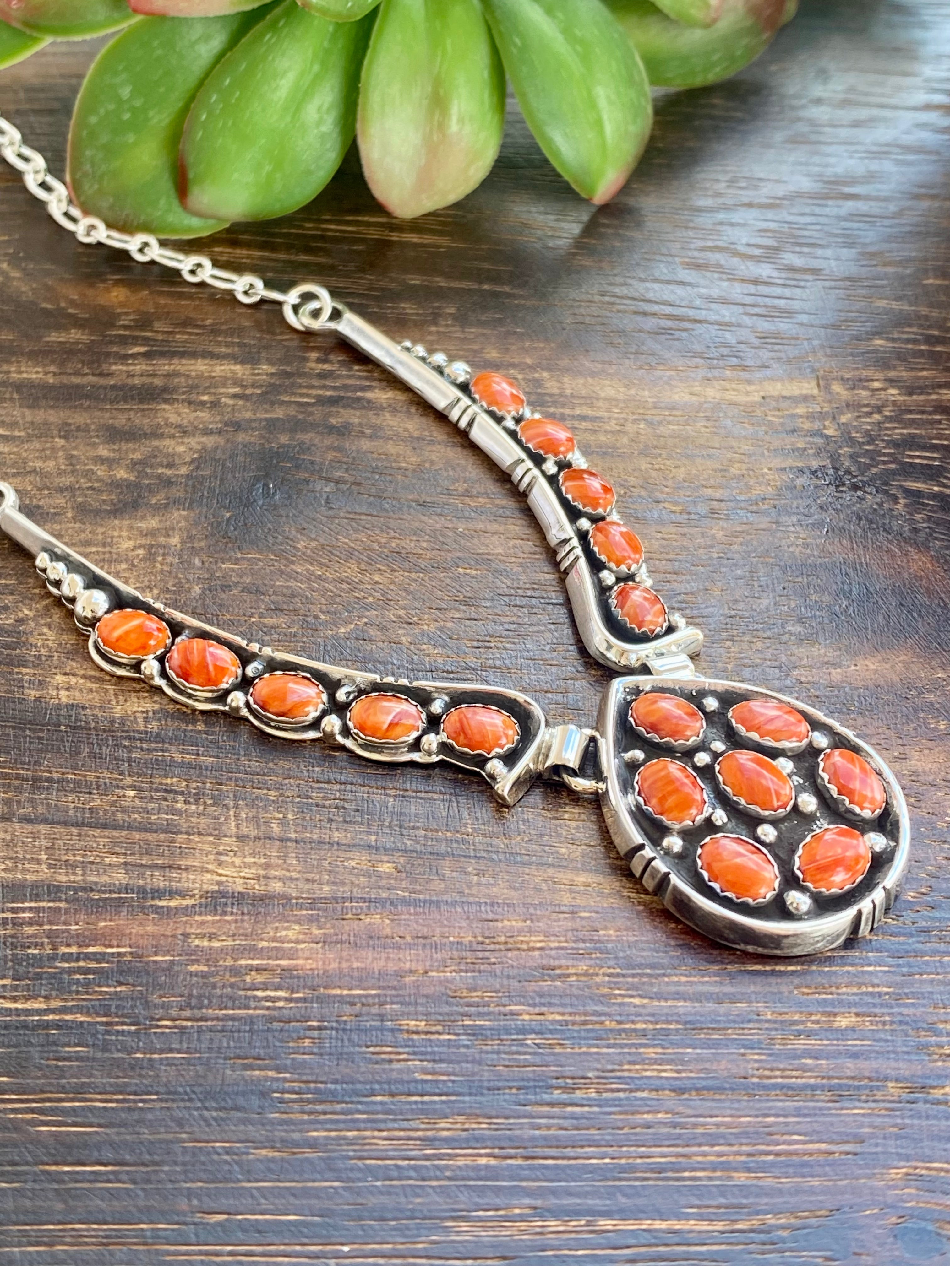 Emer Thompson Red Spiny Oys & Sterling Silver Cluster Necklace Set. It measures just under 22 inches long with hang while earrings are 2 1/2 inches long and just under 1/2 of an inch wide. Signed by the artist and stamped sterling silver.