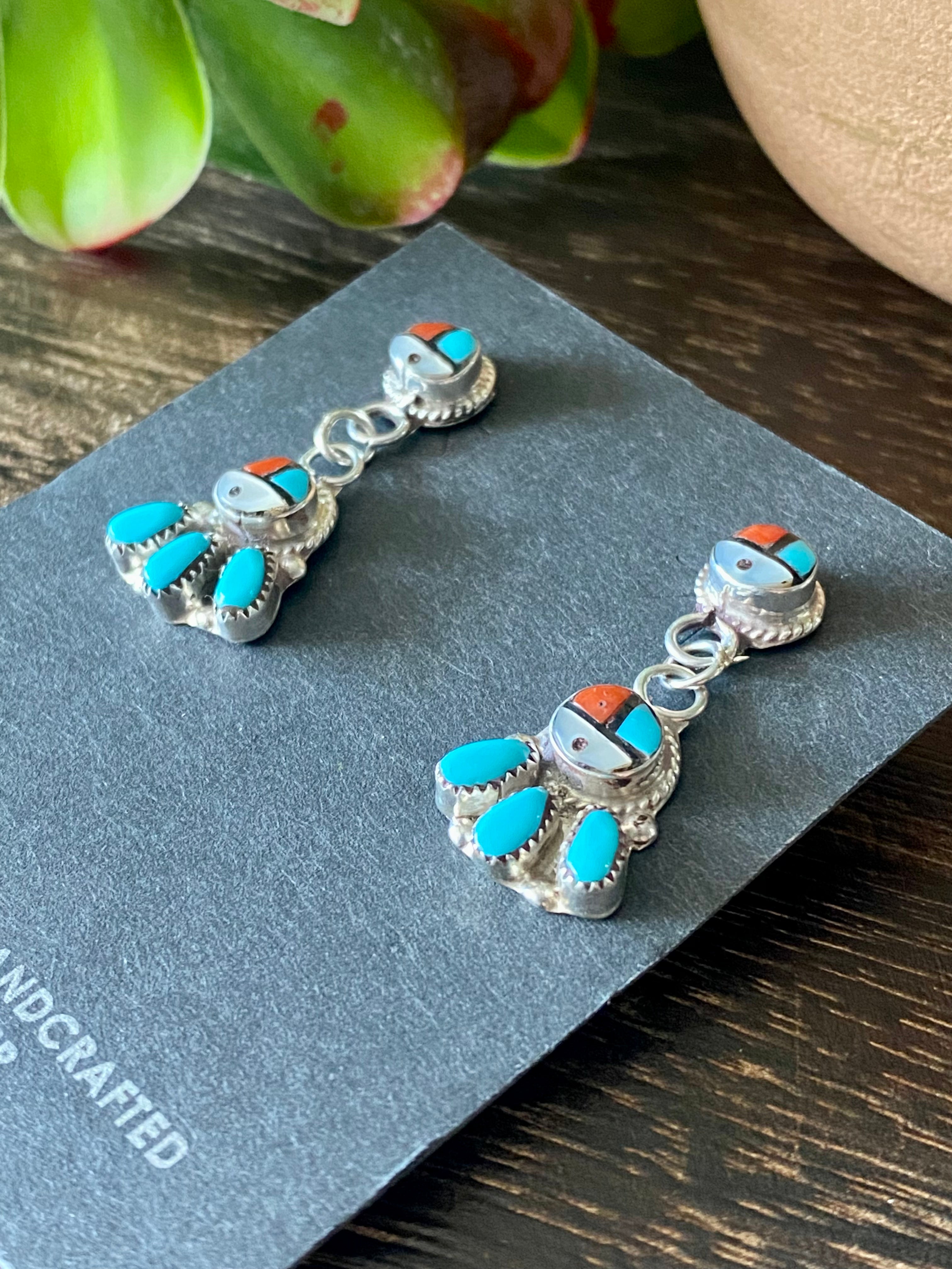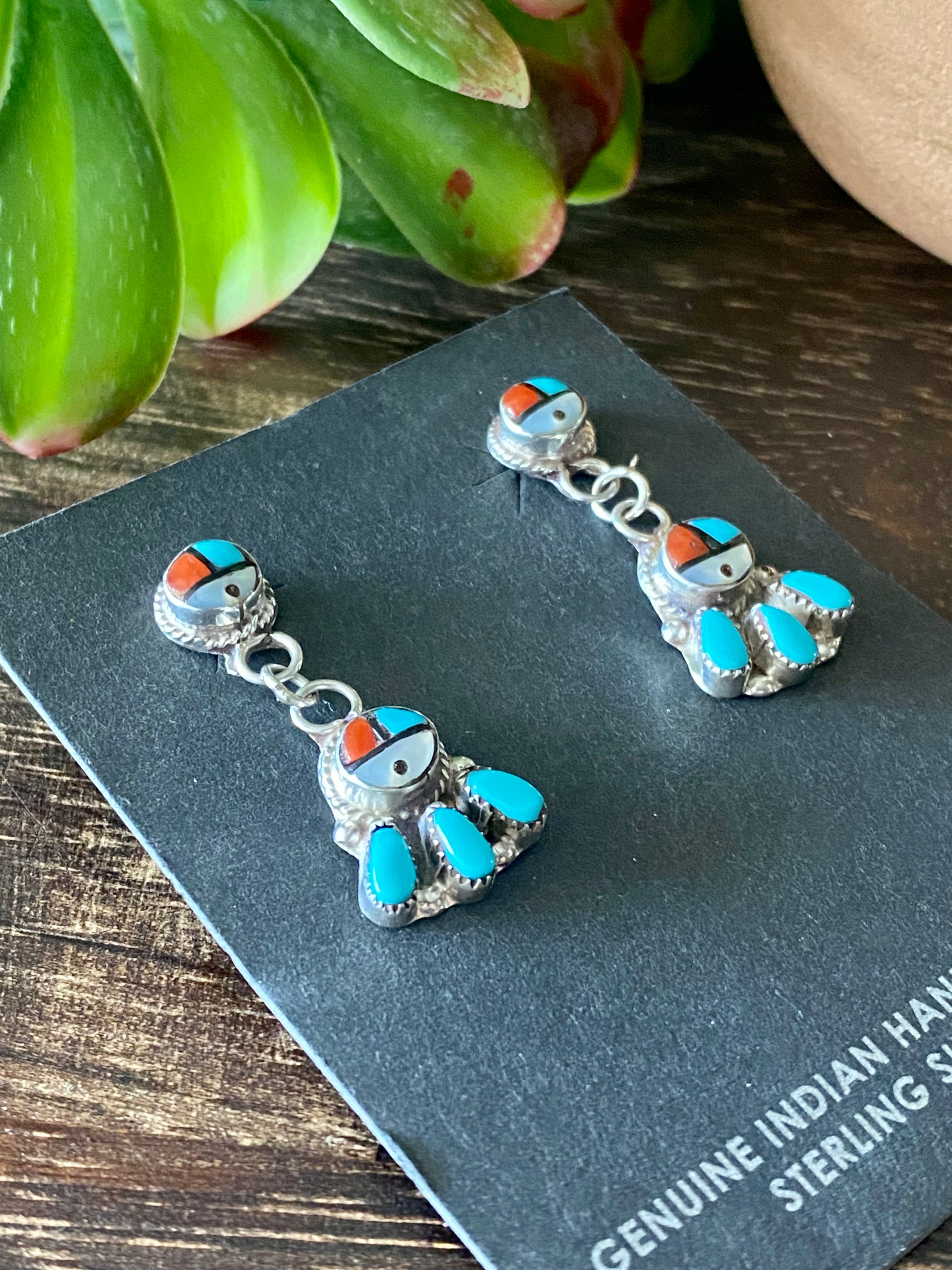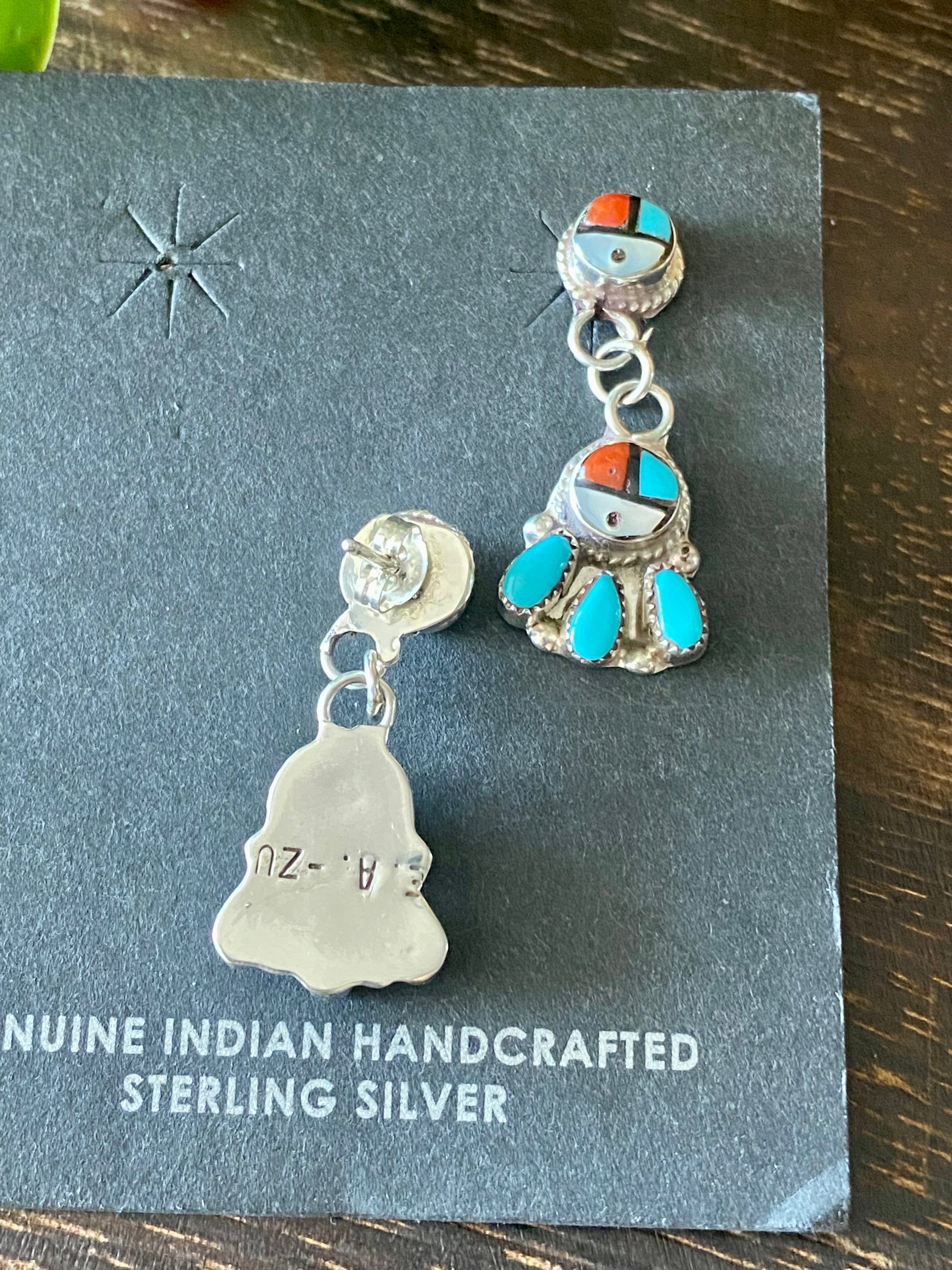 Emerson Vallo Multi Stone & Sterling Silver Sunface Post Dangle Earrings. They measure 1 1/4 inches long and just over 1/2 of an inch wide. Signed by the artist.
