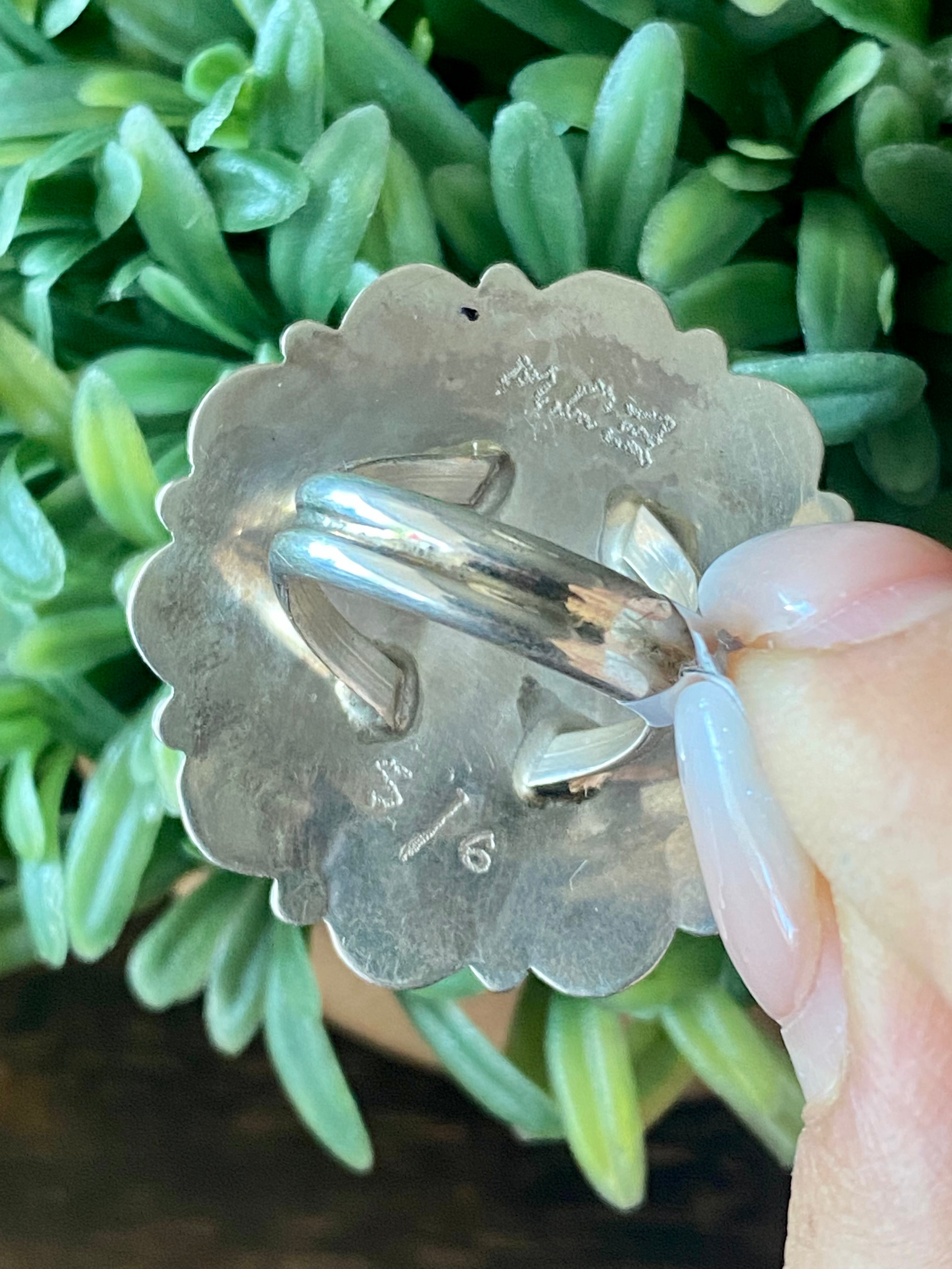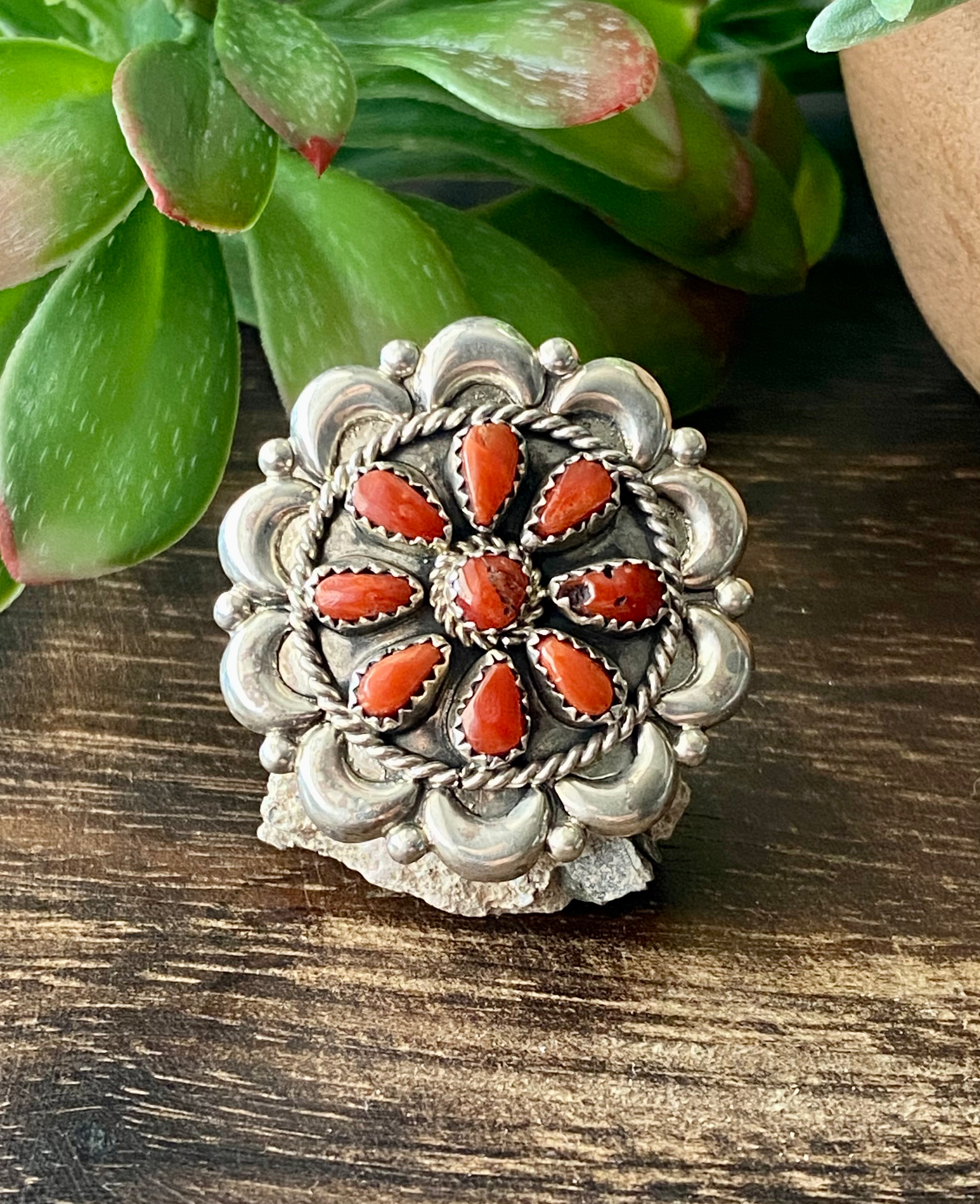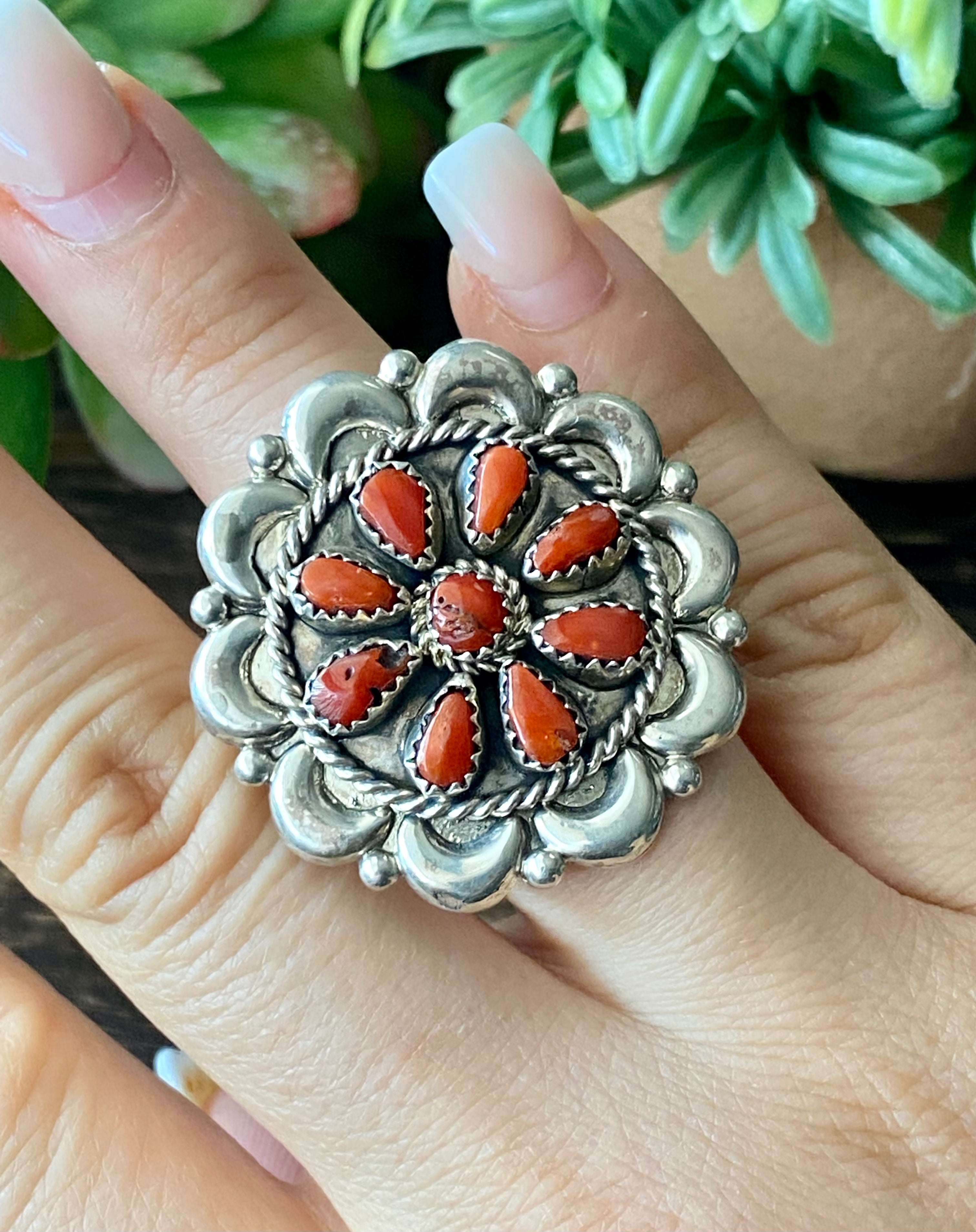 Eunis Wilson Coral & Sterling Silver Cluster Ring Size 7.25. It measures 1 1/2 inches round. Signed by the artist and stamped sterling silver.