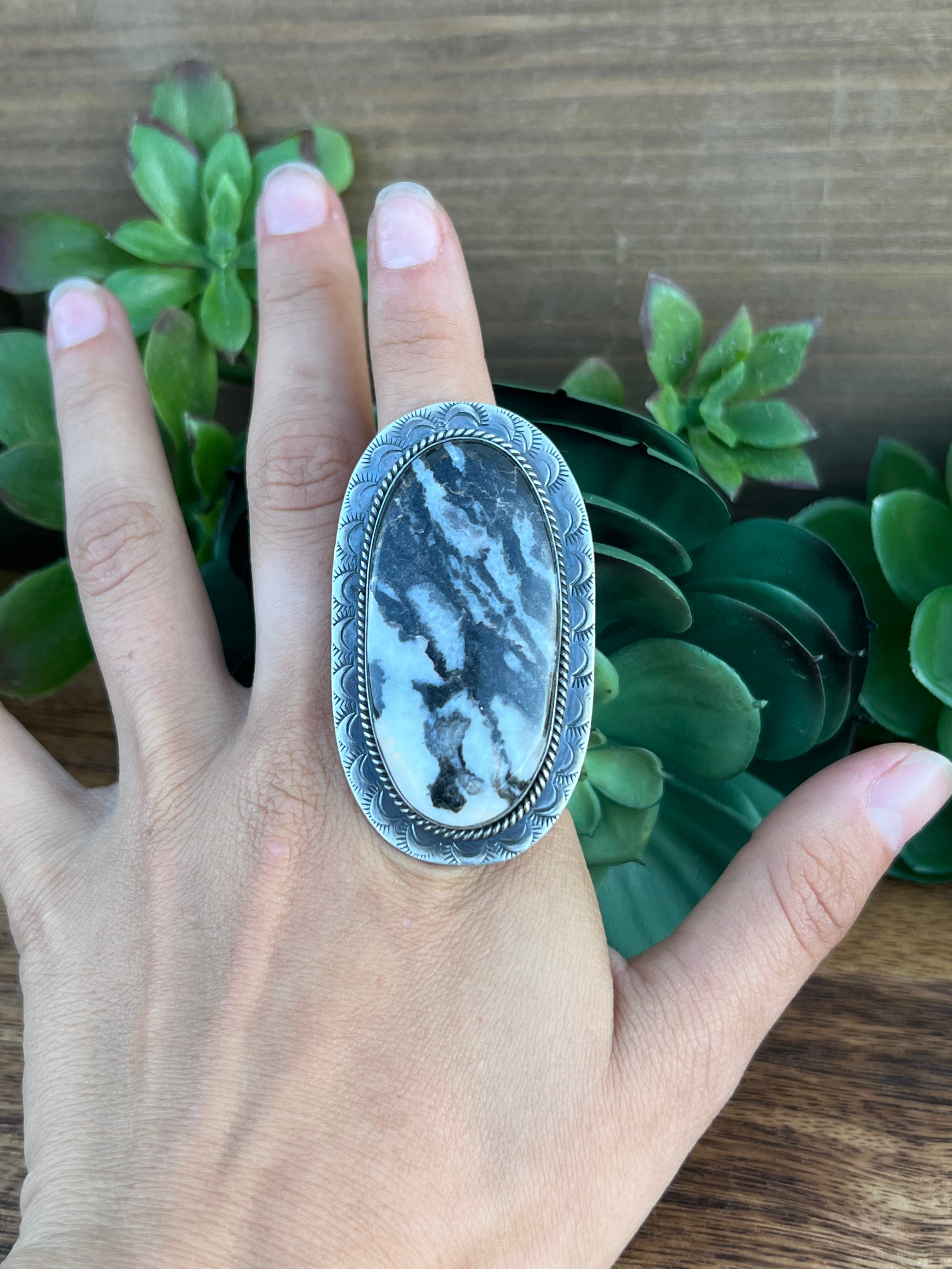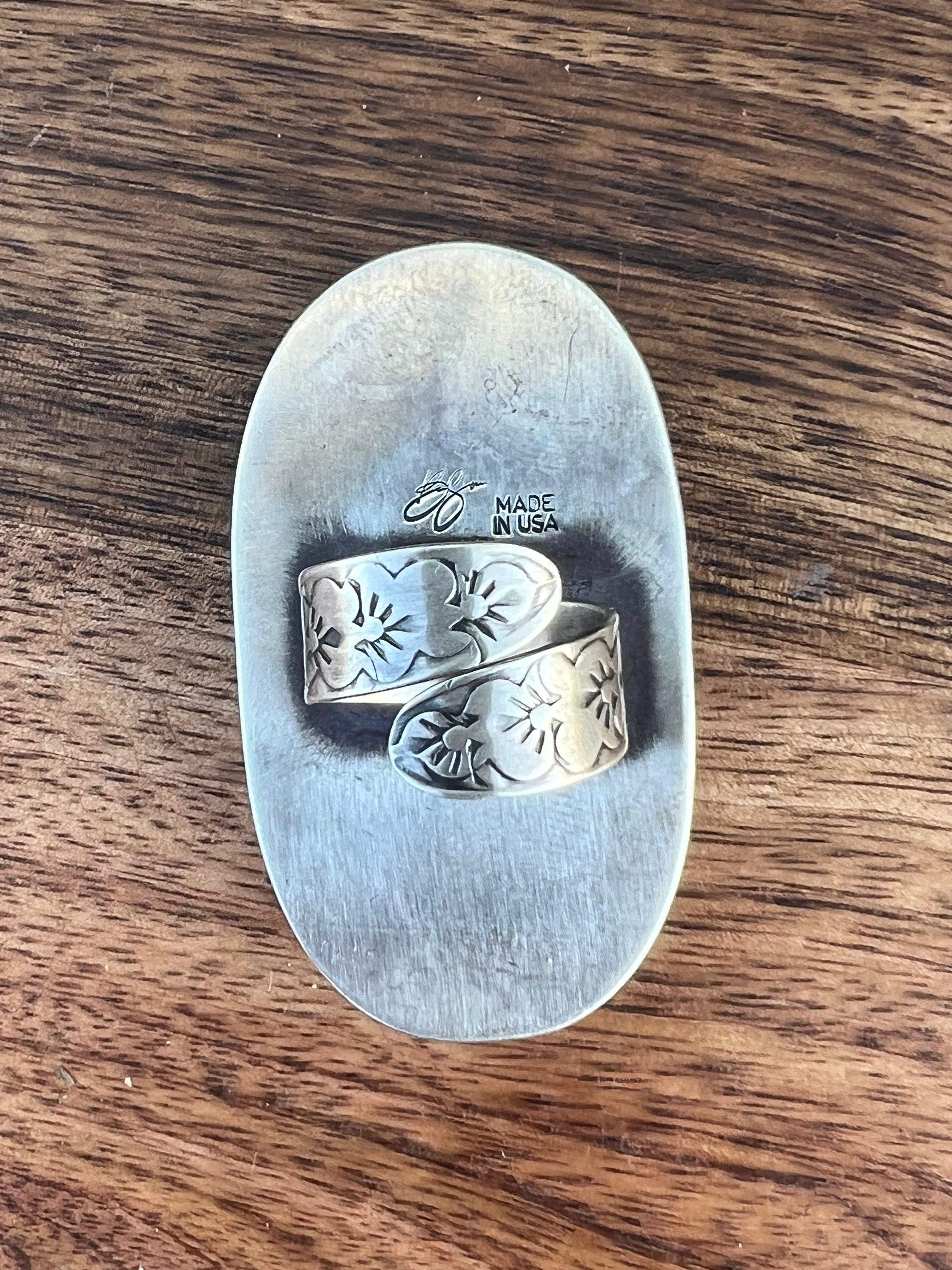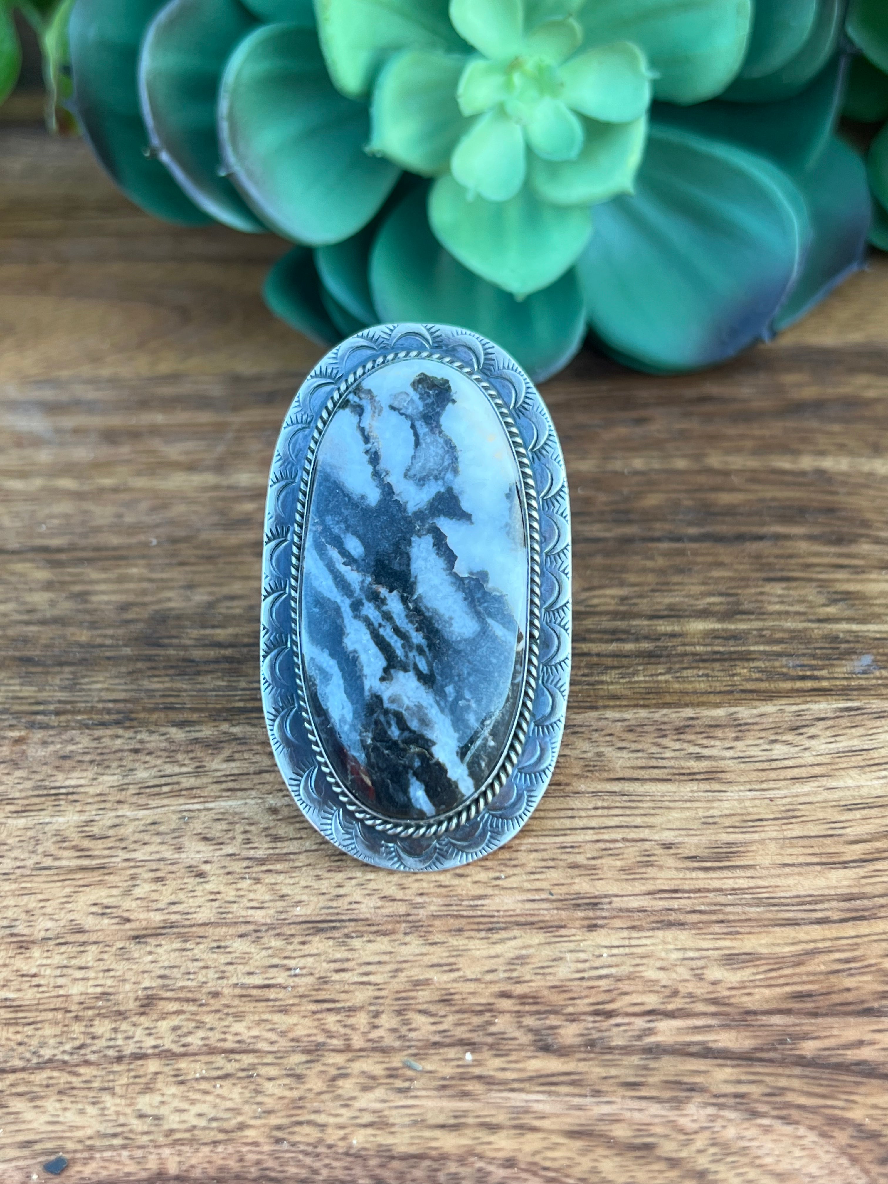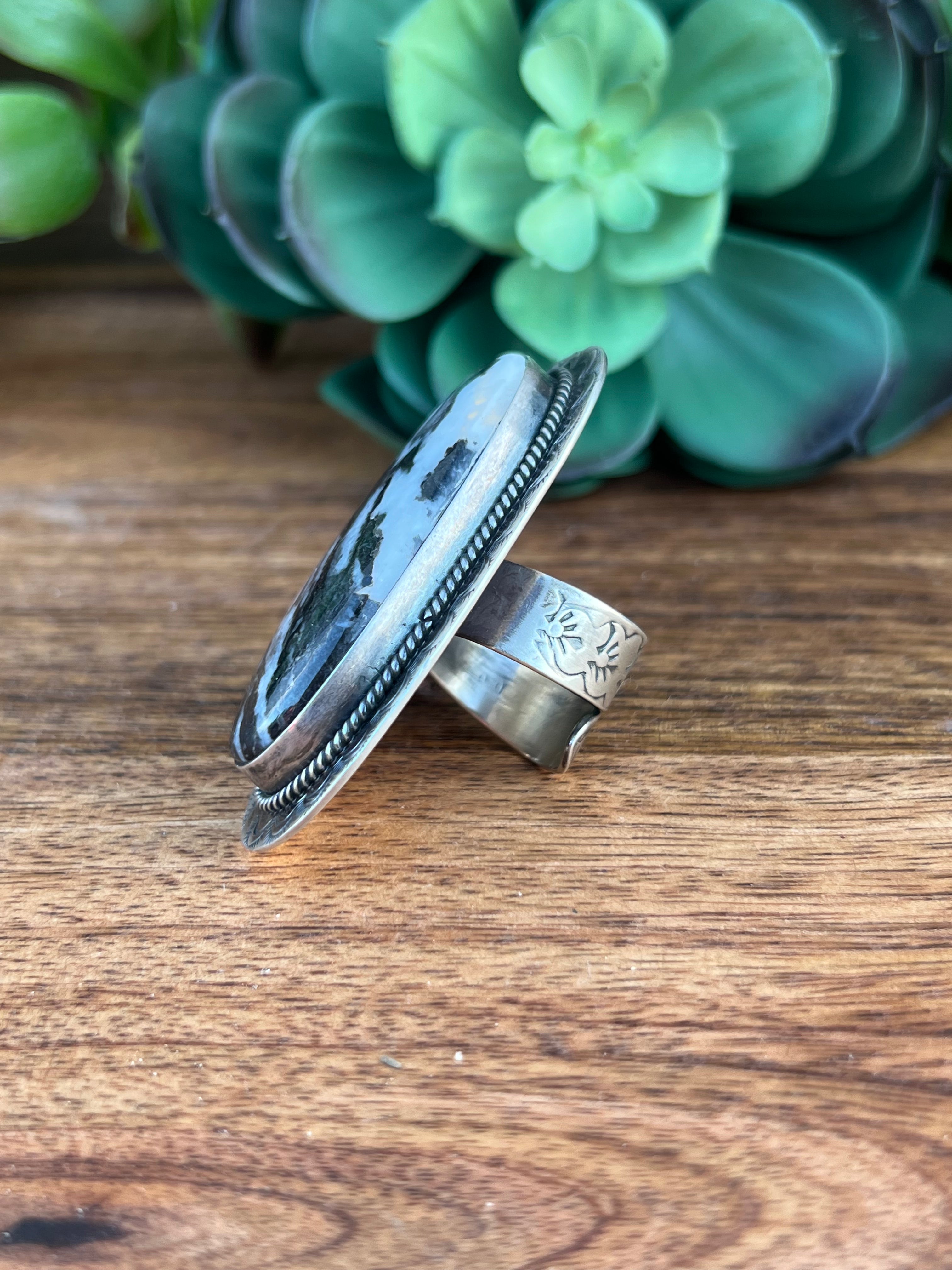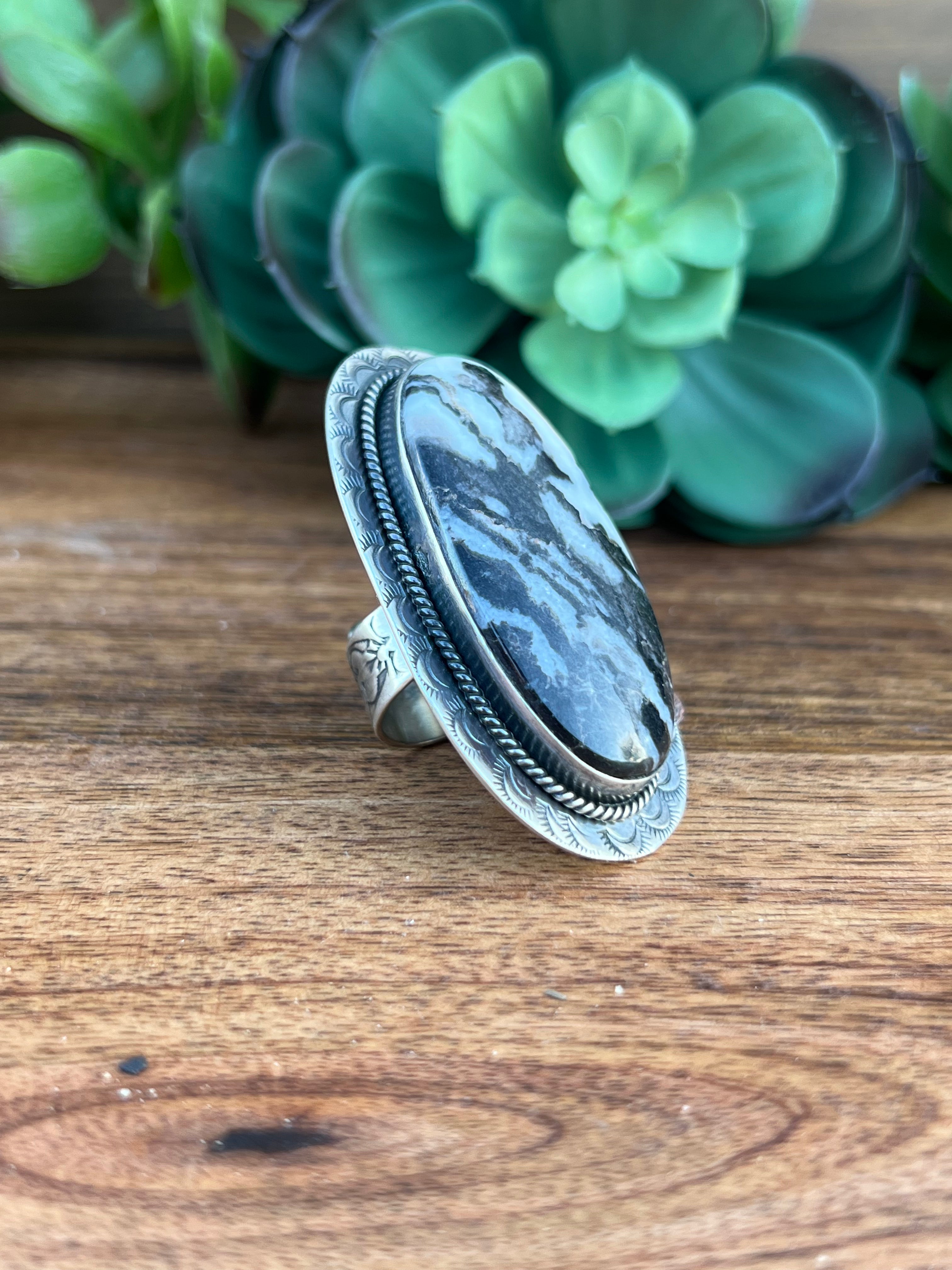Gabby Spencer Zebra Jasper & Sterling Silver Adjustable Ring Size 8. It measures 2 1/4 inches long and 1 1/4 inches wide. Signed by the artist and stamped sterling silver.