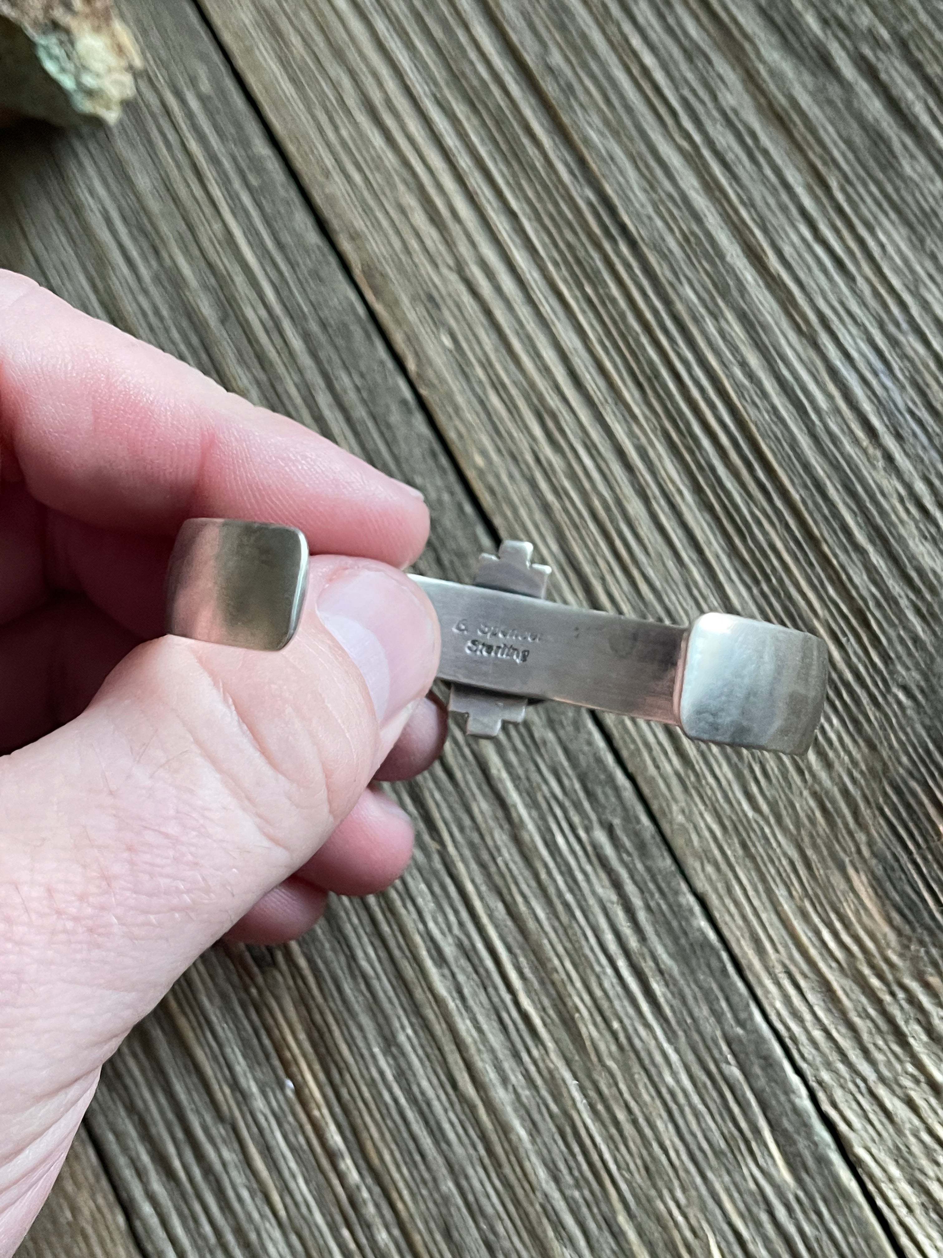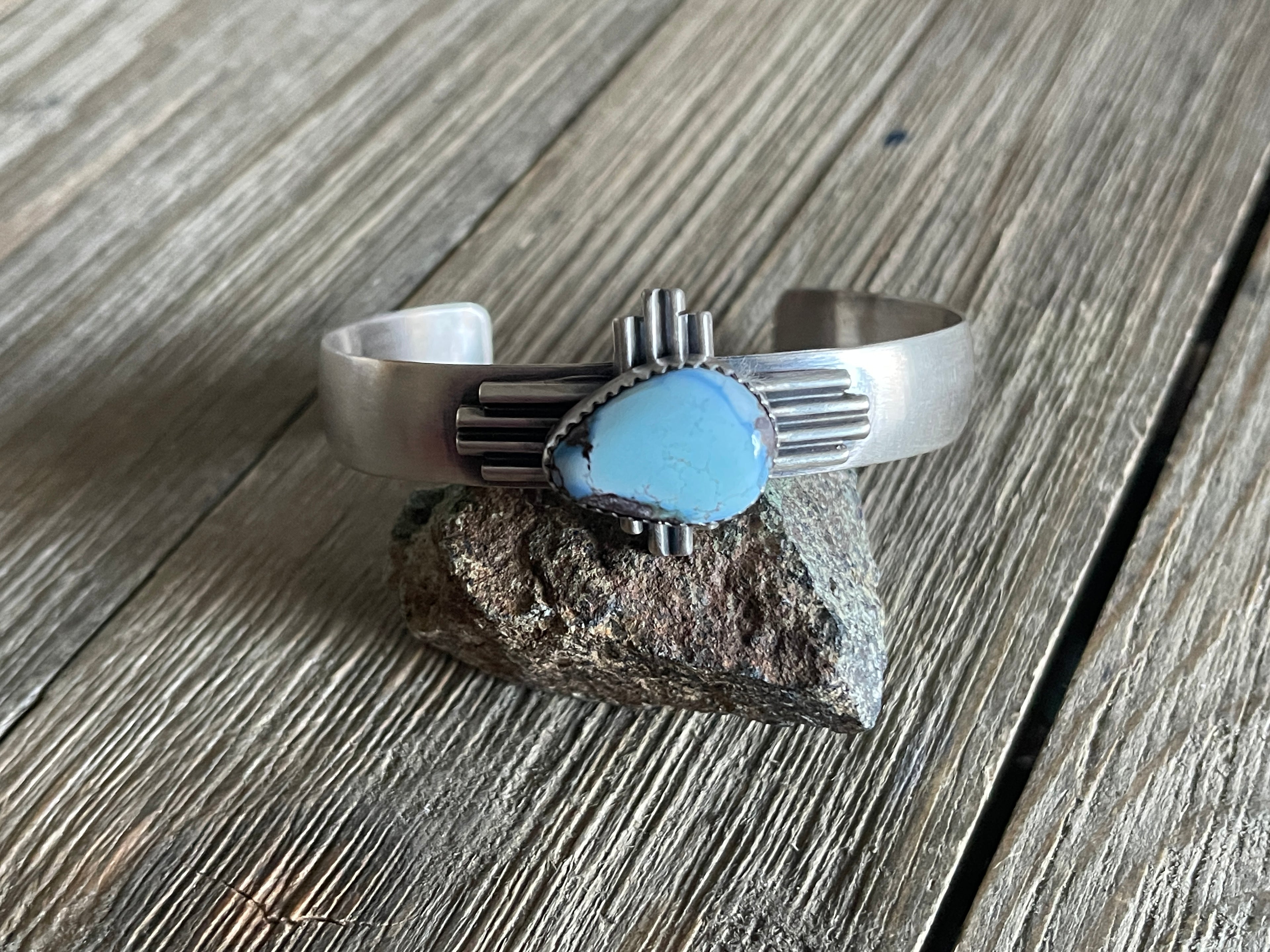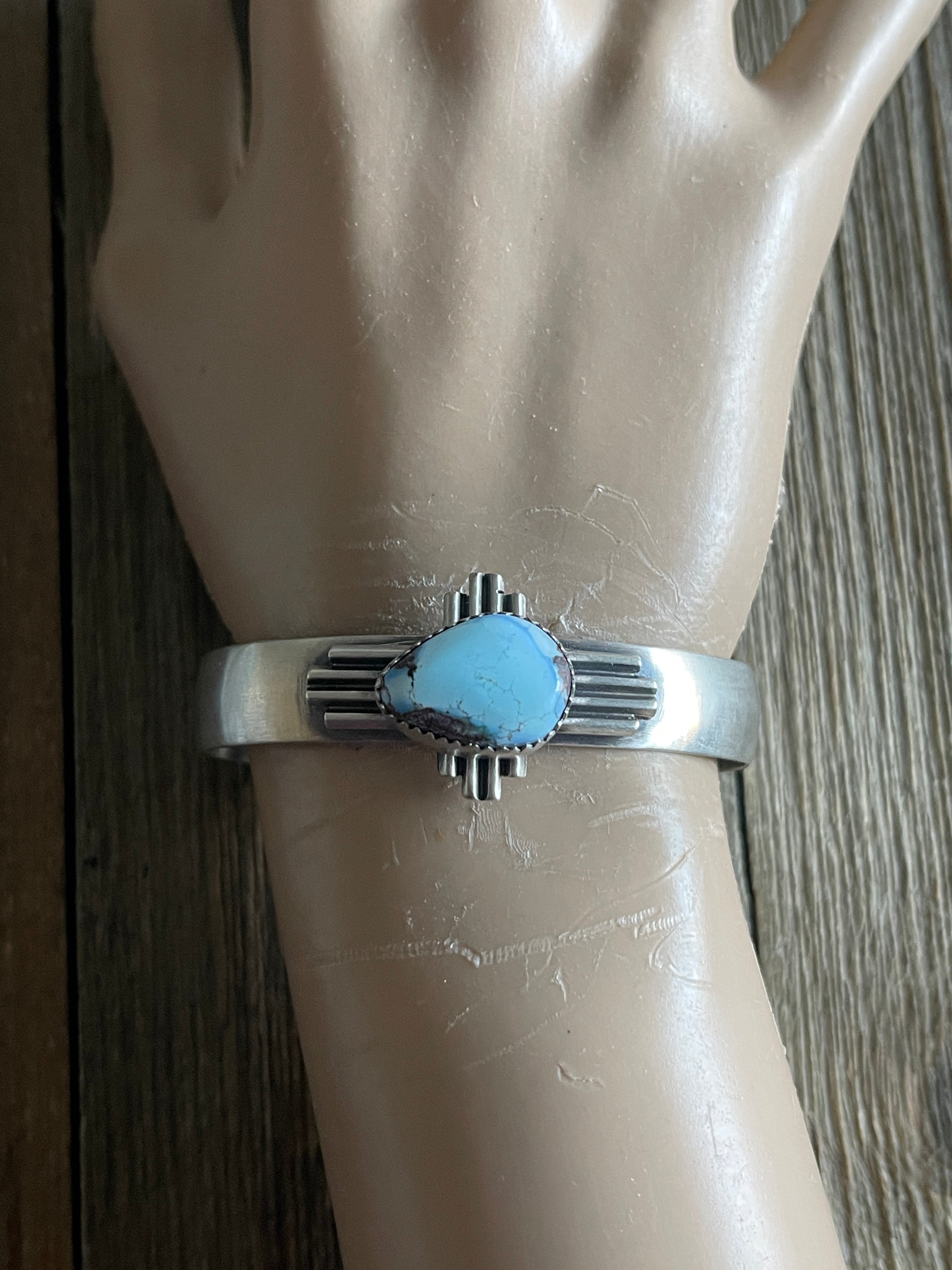 Gary Spencer Golden Hill’s Turquoise & Sterling Silver Zia Cuff Bracelet. It measures 7/8 of an inch wide with an inside circumference of 5 1/4 inches and a gap of 1 1/4 inches. Signed by the artist and stamped sterling silver.