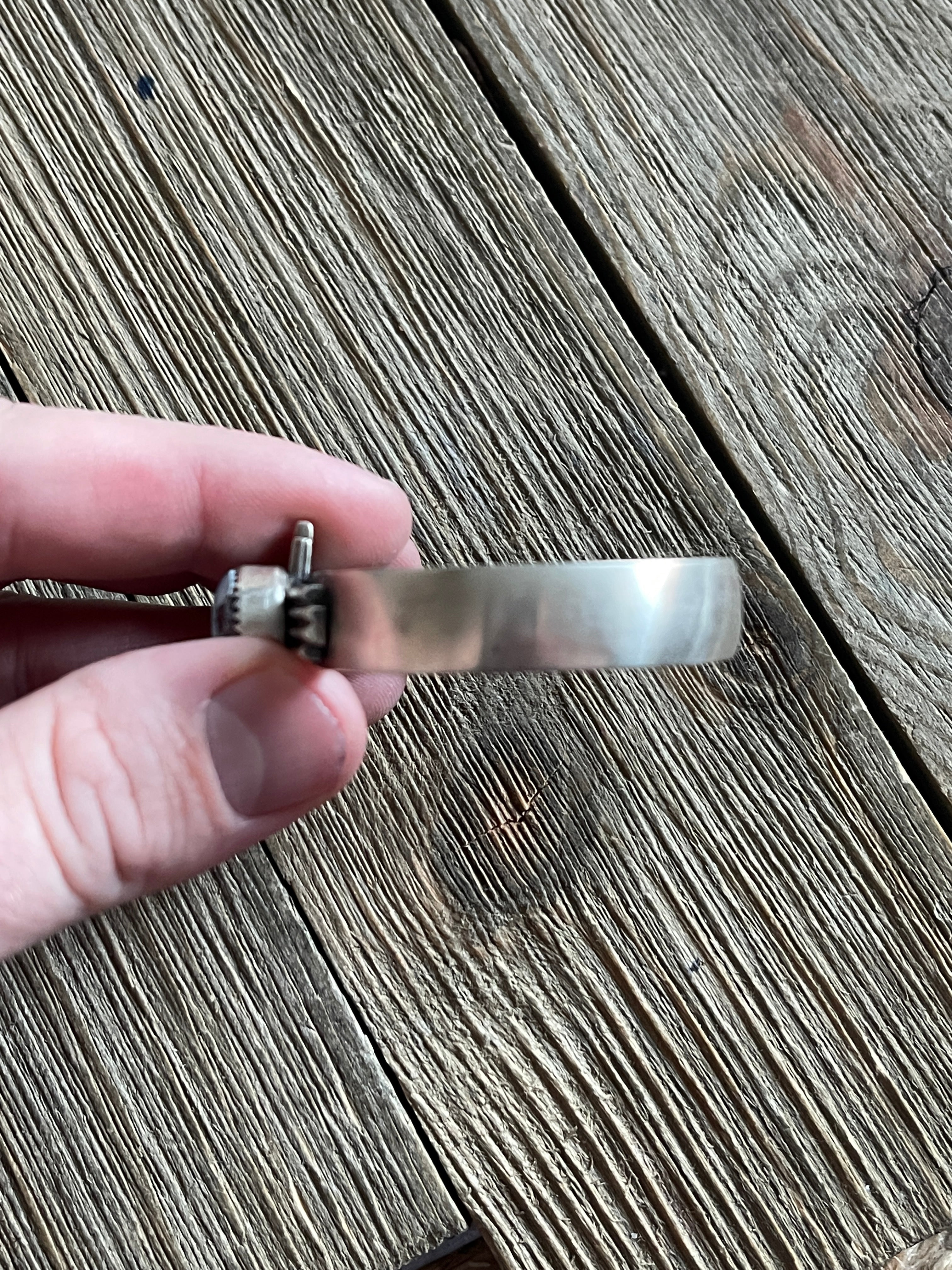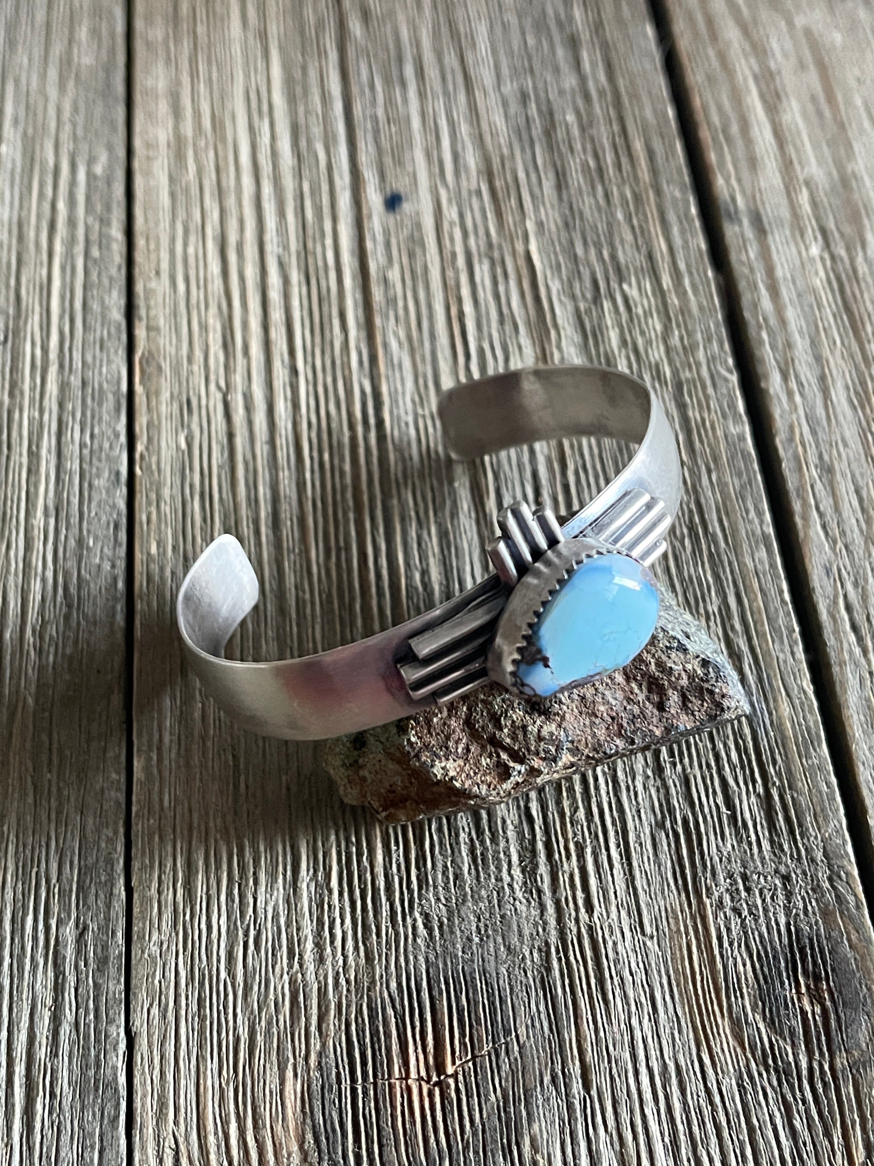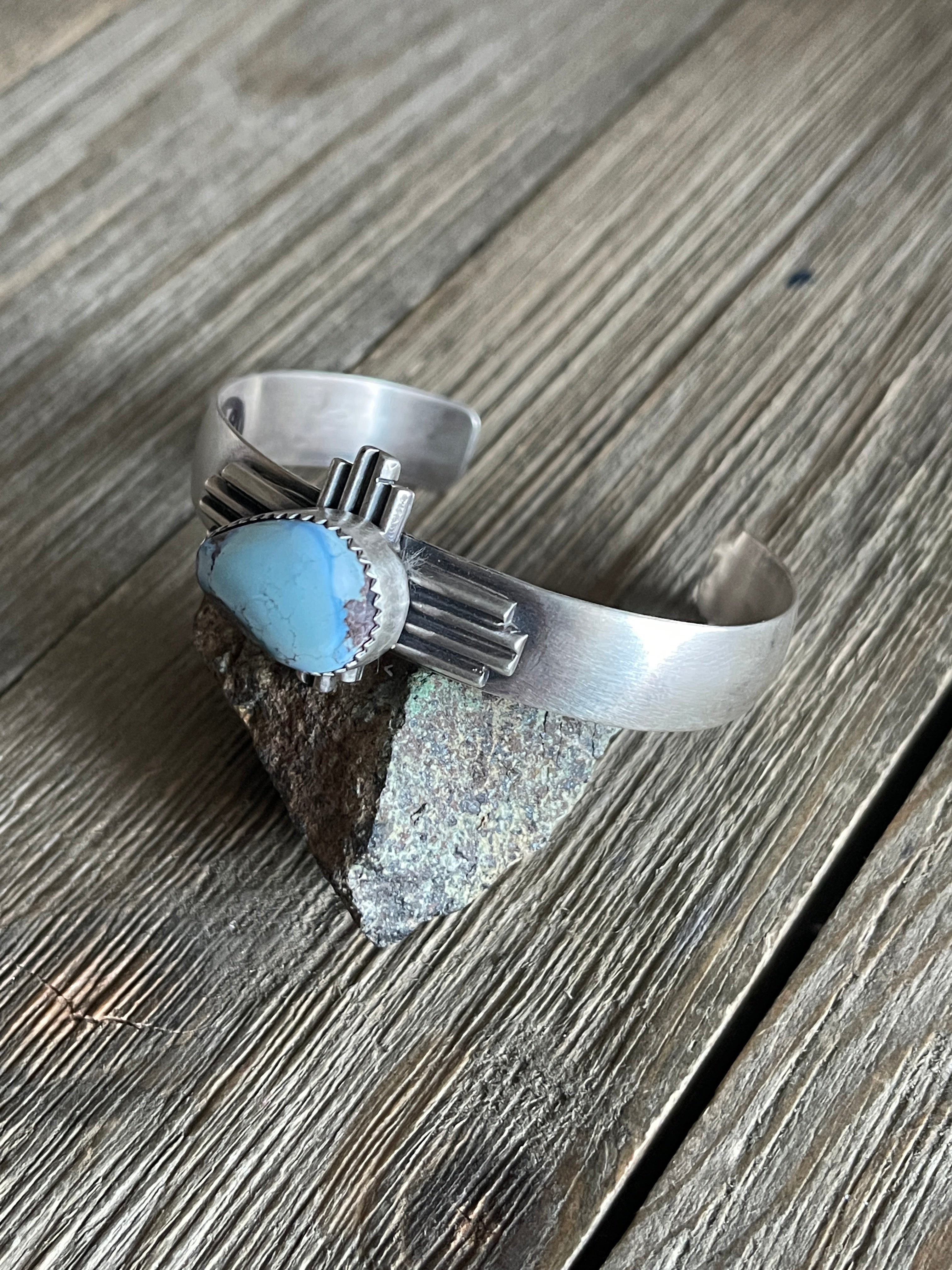 Gary Spencer Golden Hill’s Turquoise & Sterling Silver Zia Cuff Bracelet. It measures 7/8 of an inch wide with an inside circumference of 5 1/4 inches and a gap of 1 1/4 inches. Signed by the artist and stamped sterling silver.
