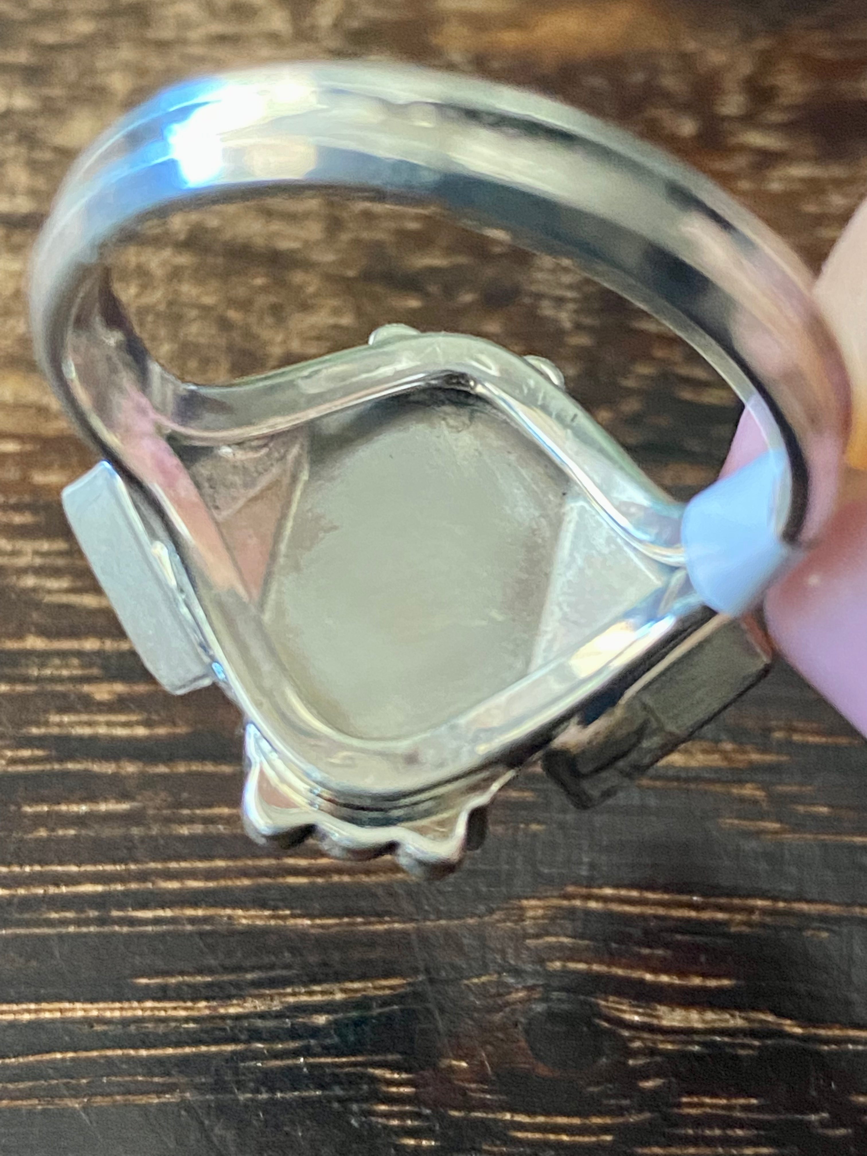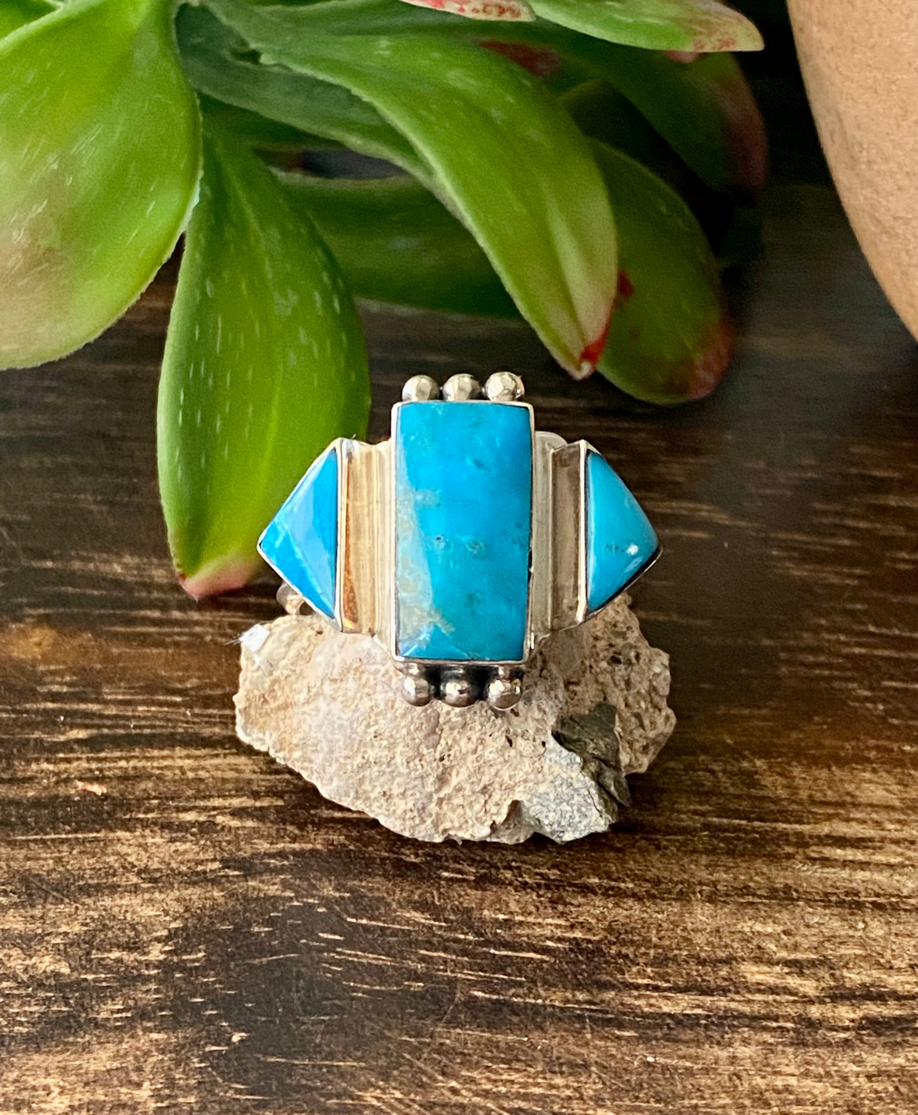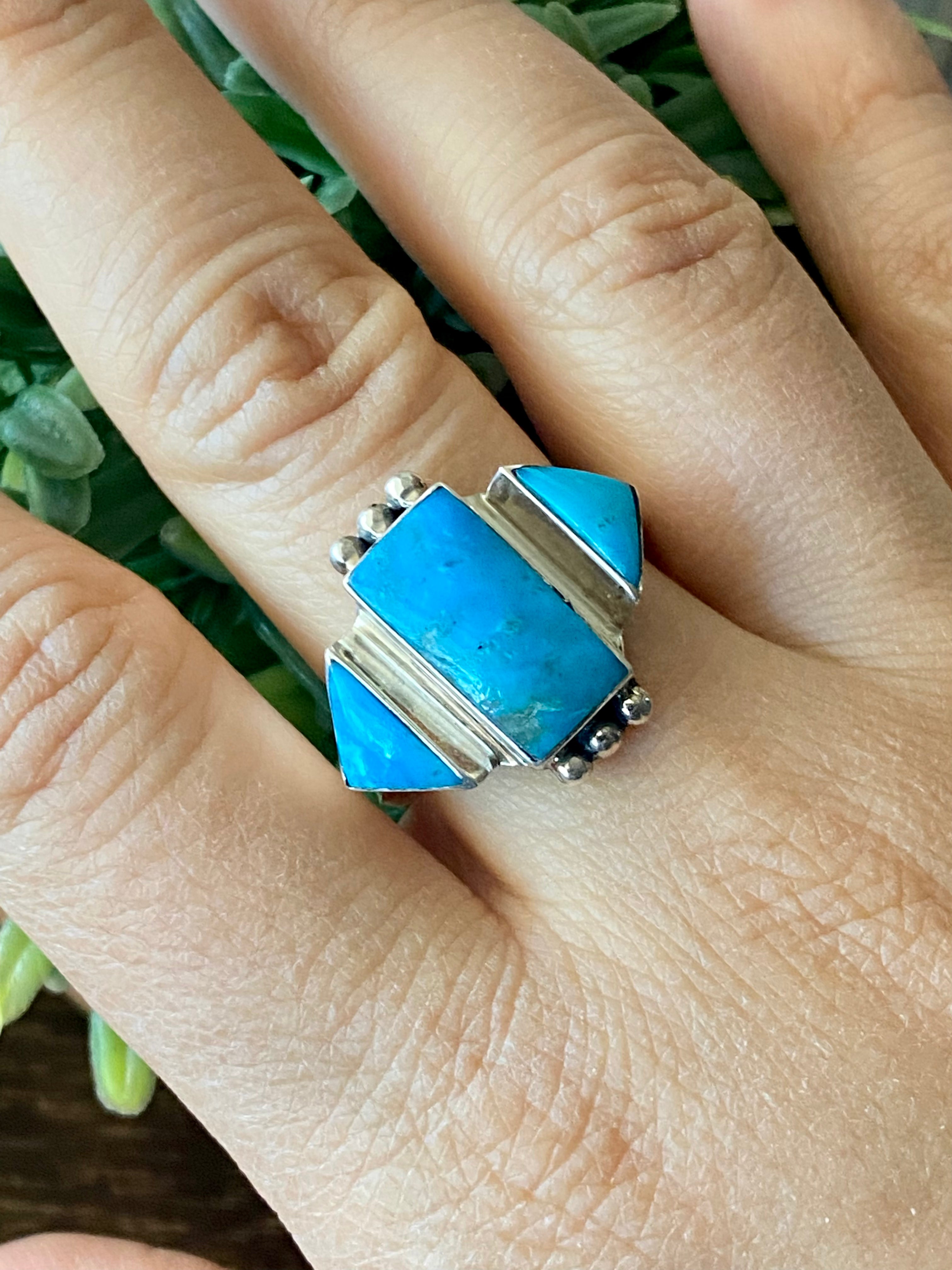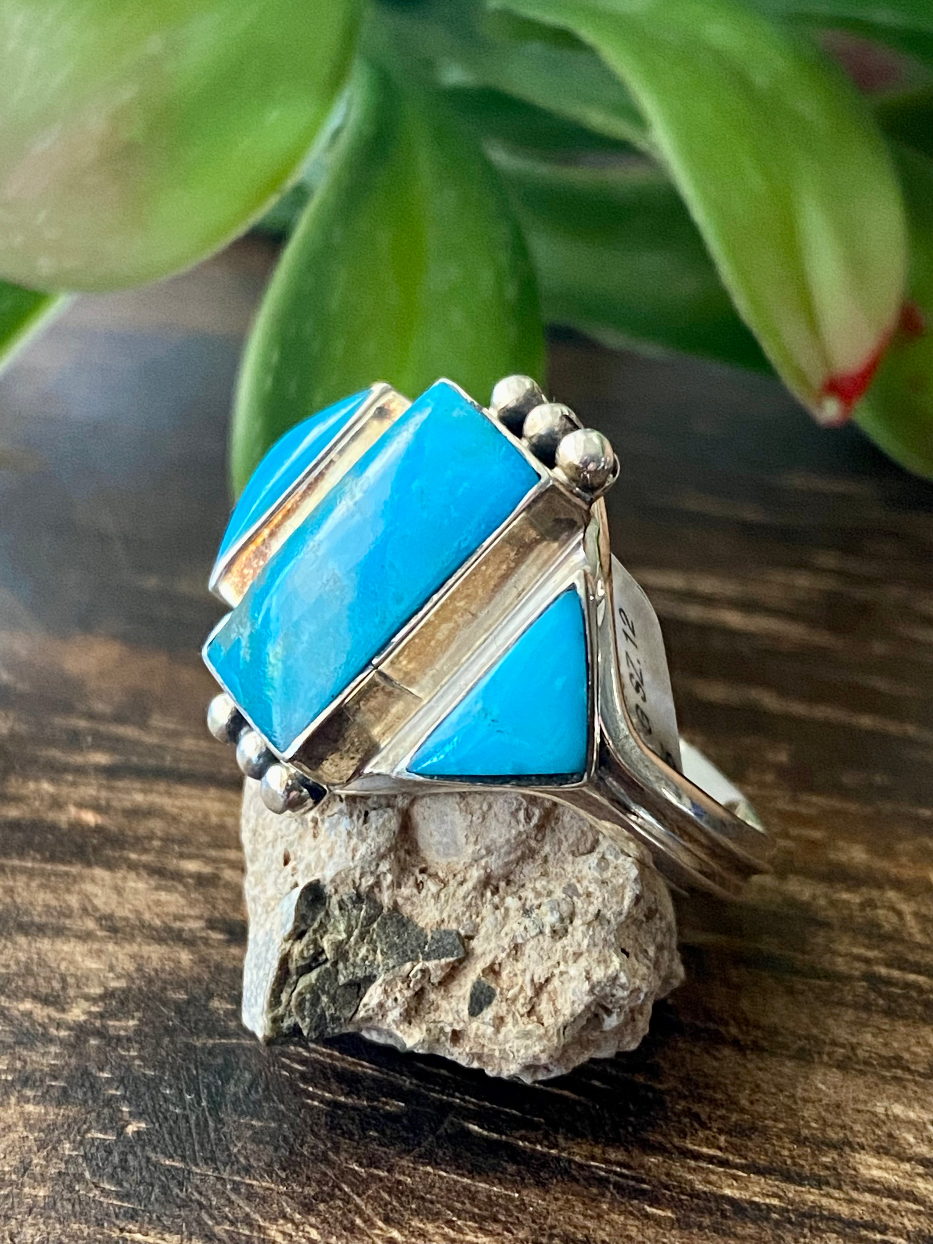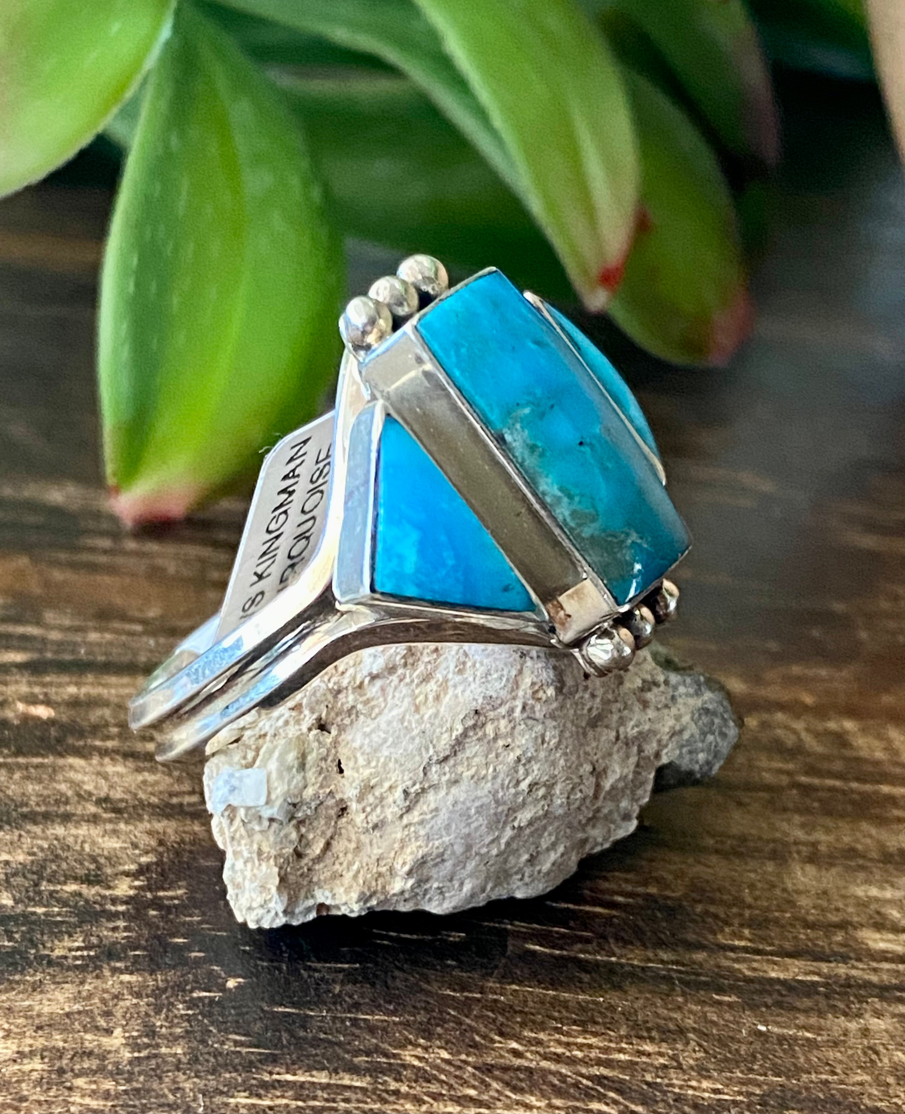 Genevieve Francisco Kingman Turquoise & Sterling Silver Ring Size 12. It measures 7/8 of an inch long and 7/8 of an inch wide.