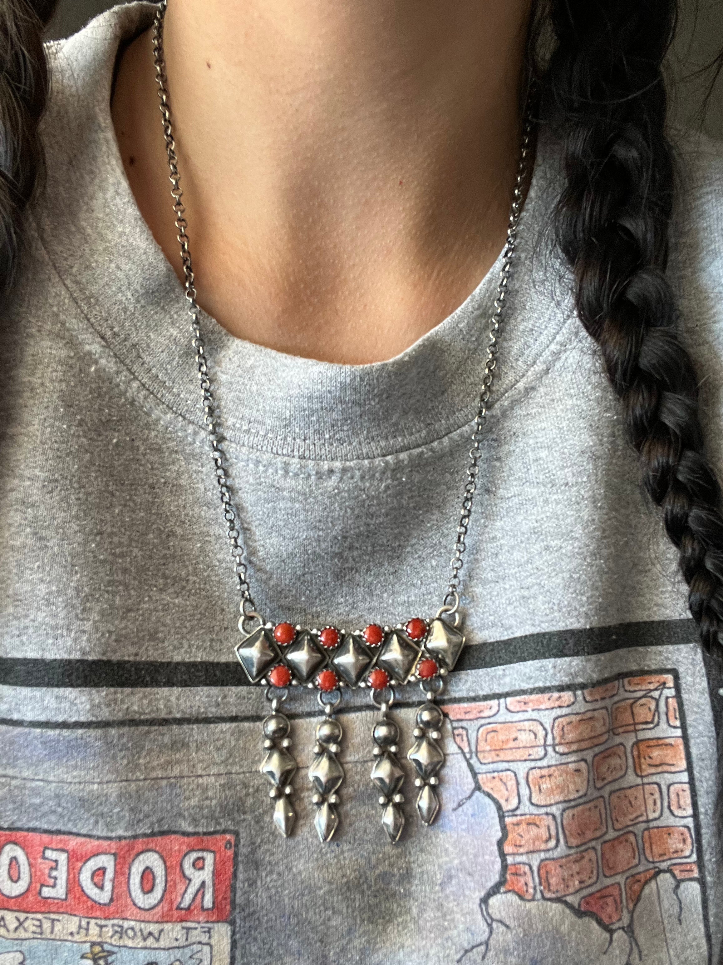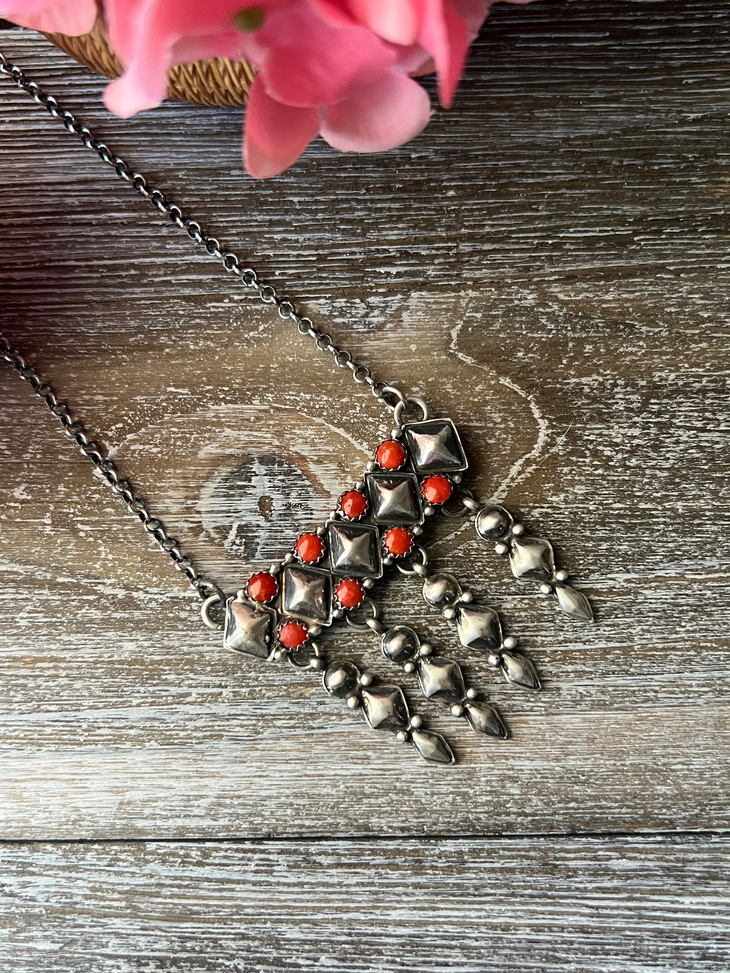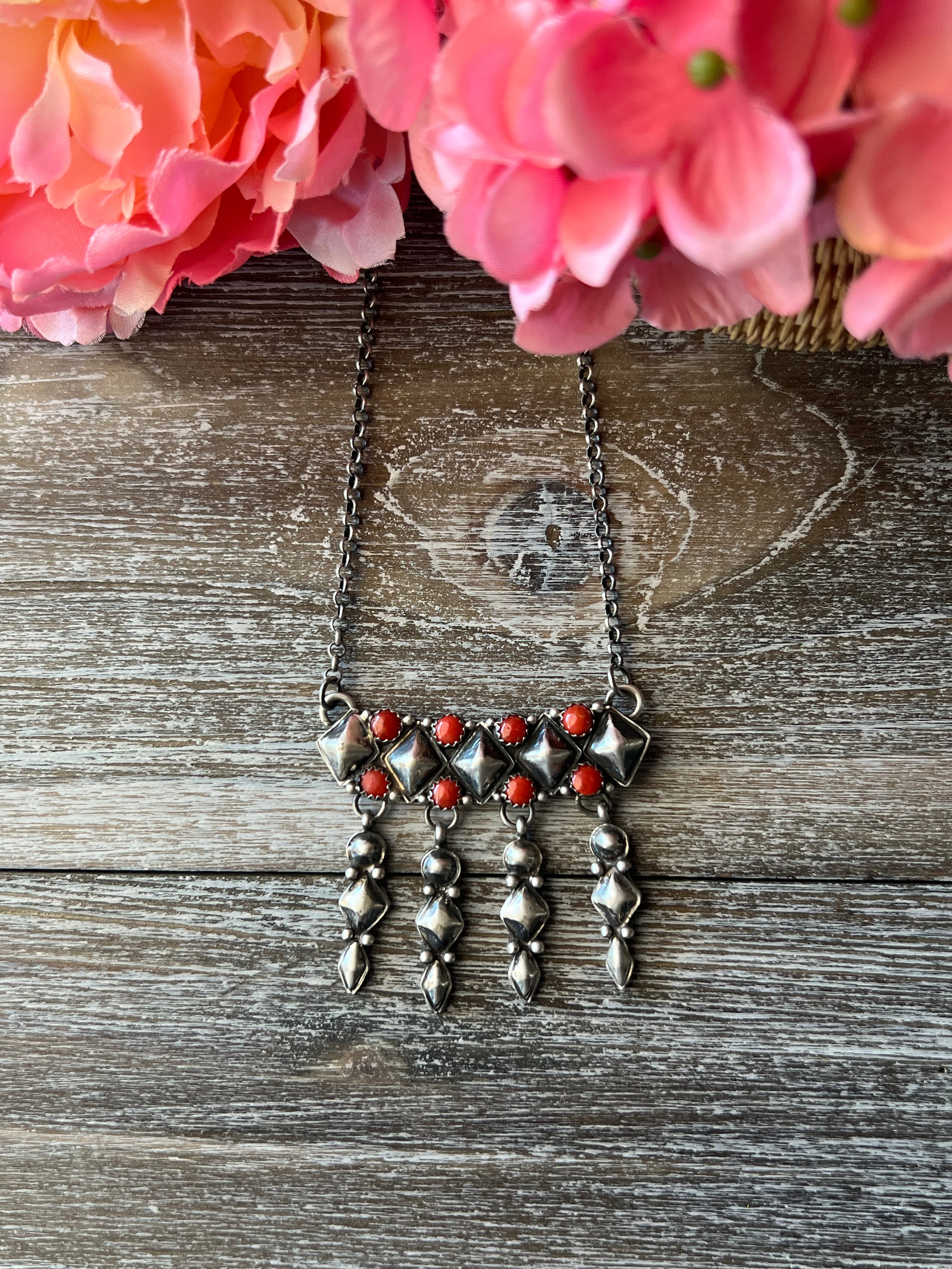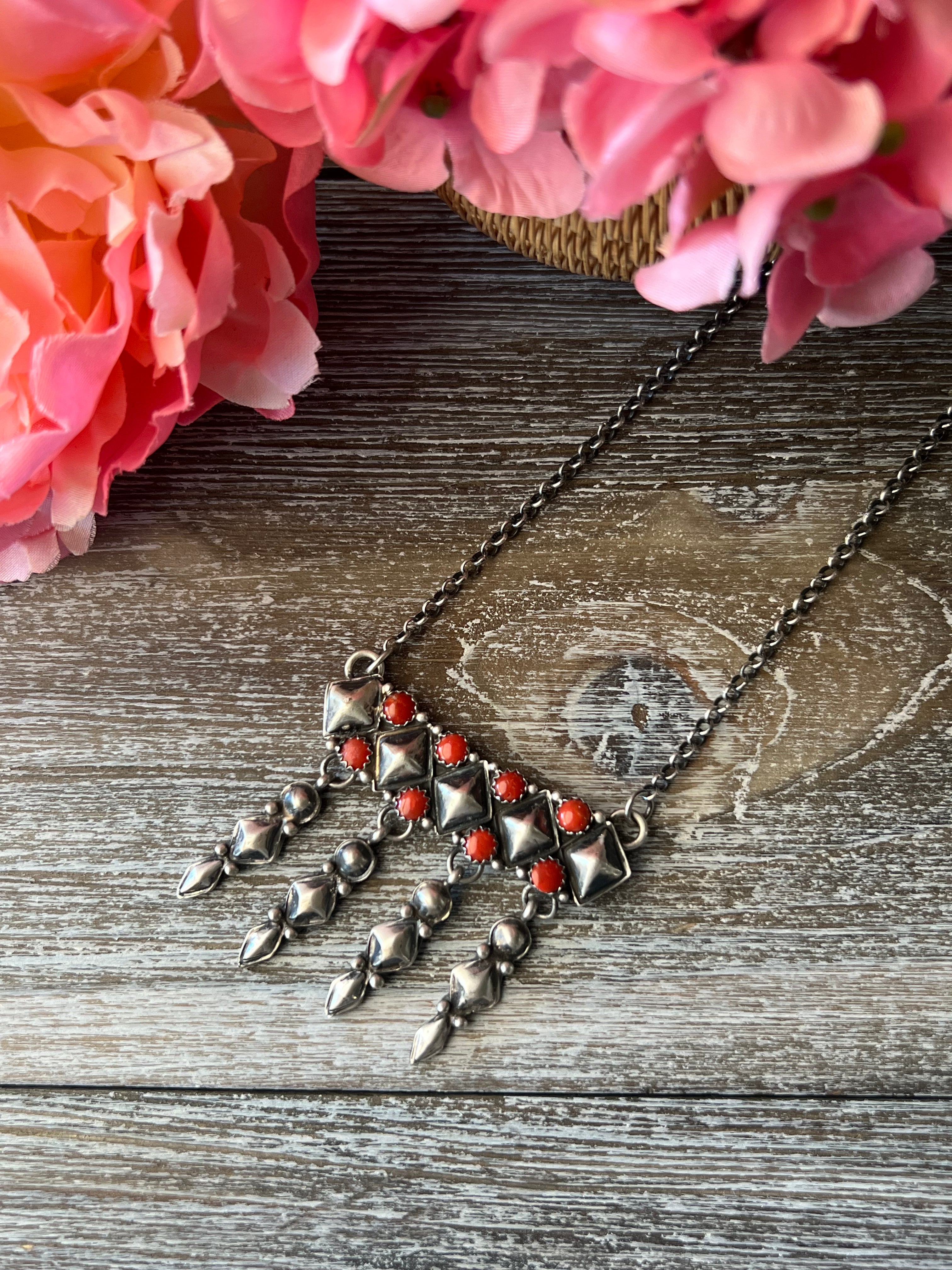 Geraldine James Coral & Sterling Silver Necklace. It measures just over 22 inches long with hang. Signed by the artist and stamped sterling silver.