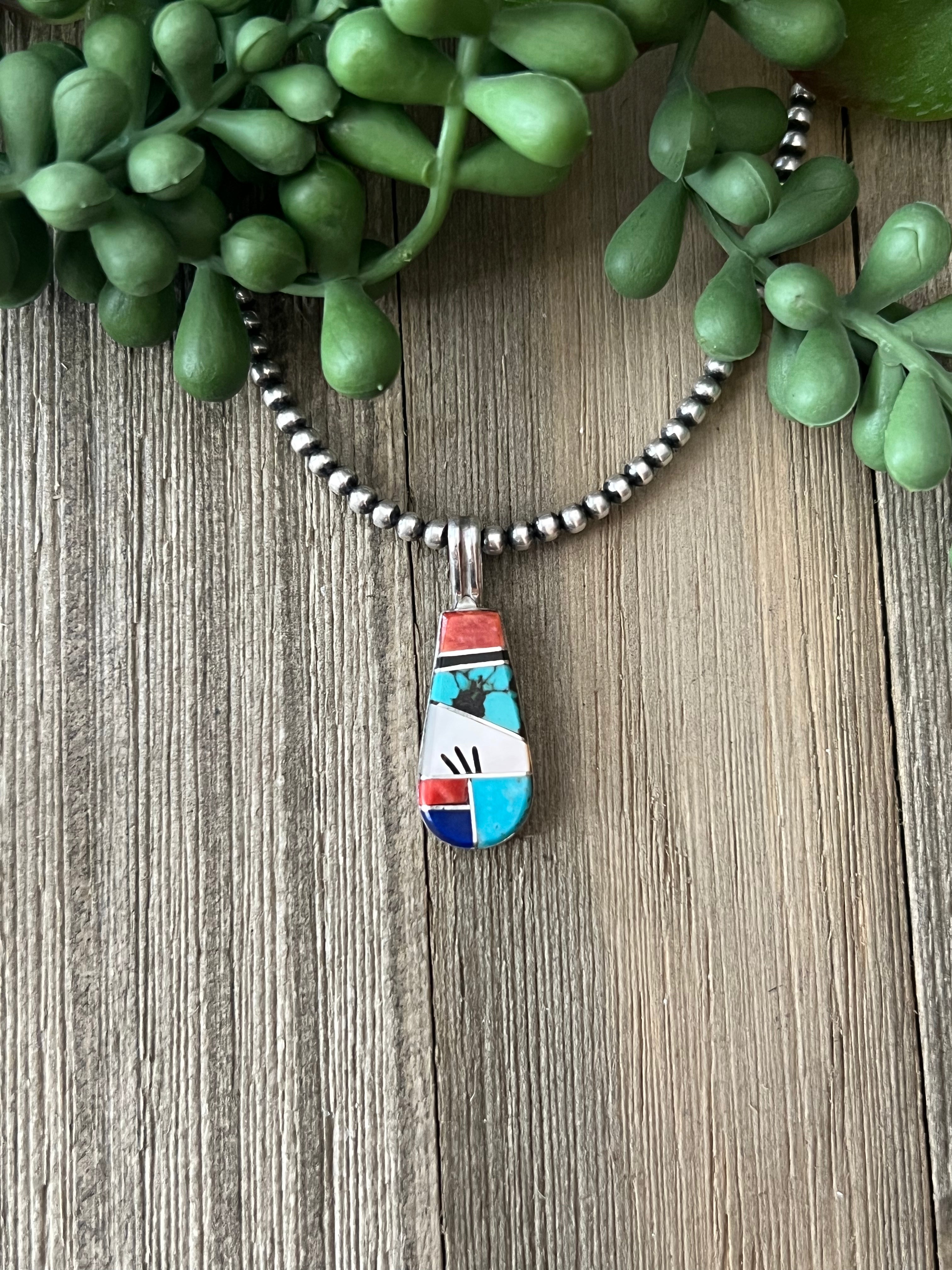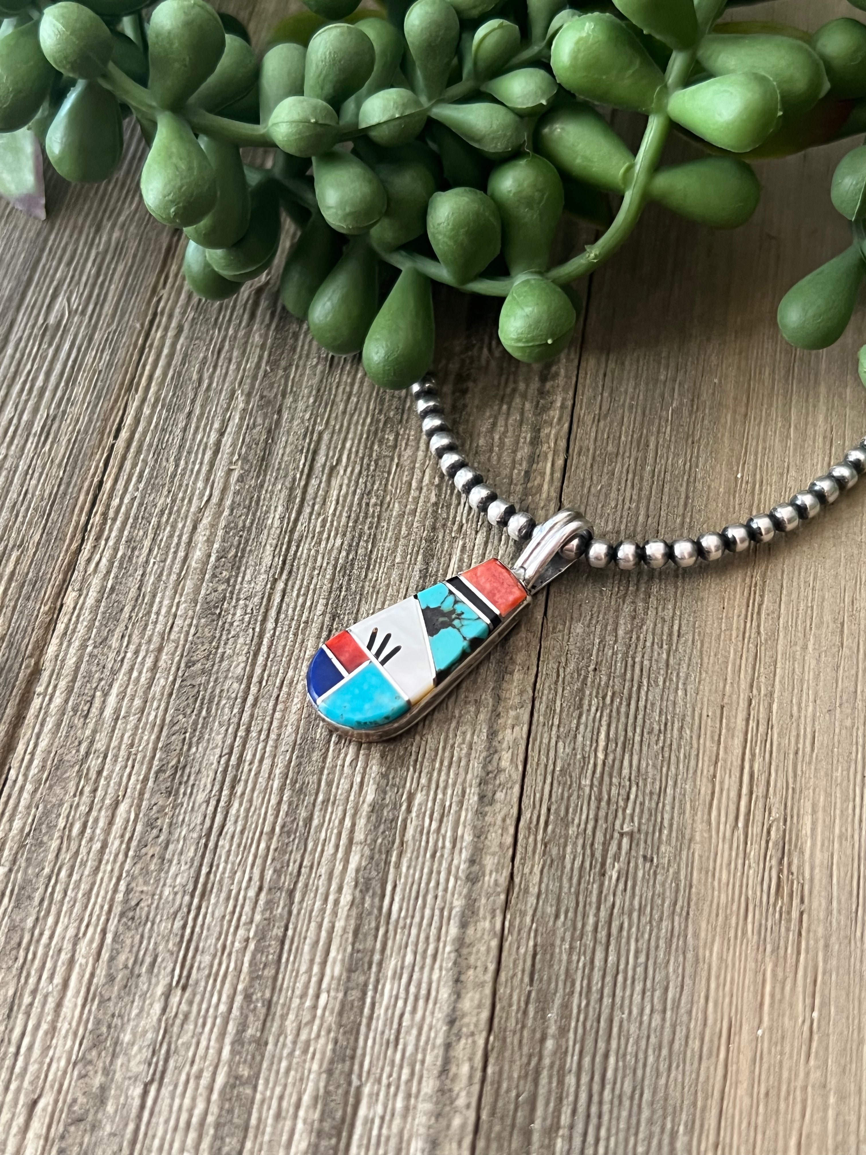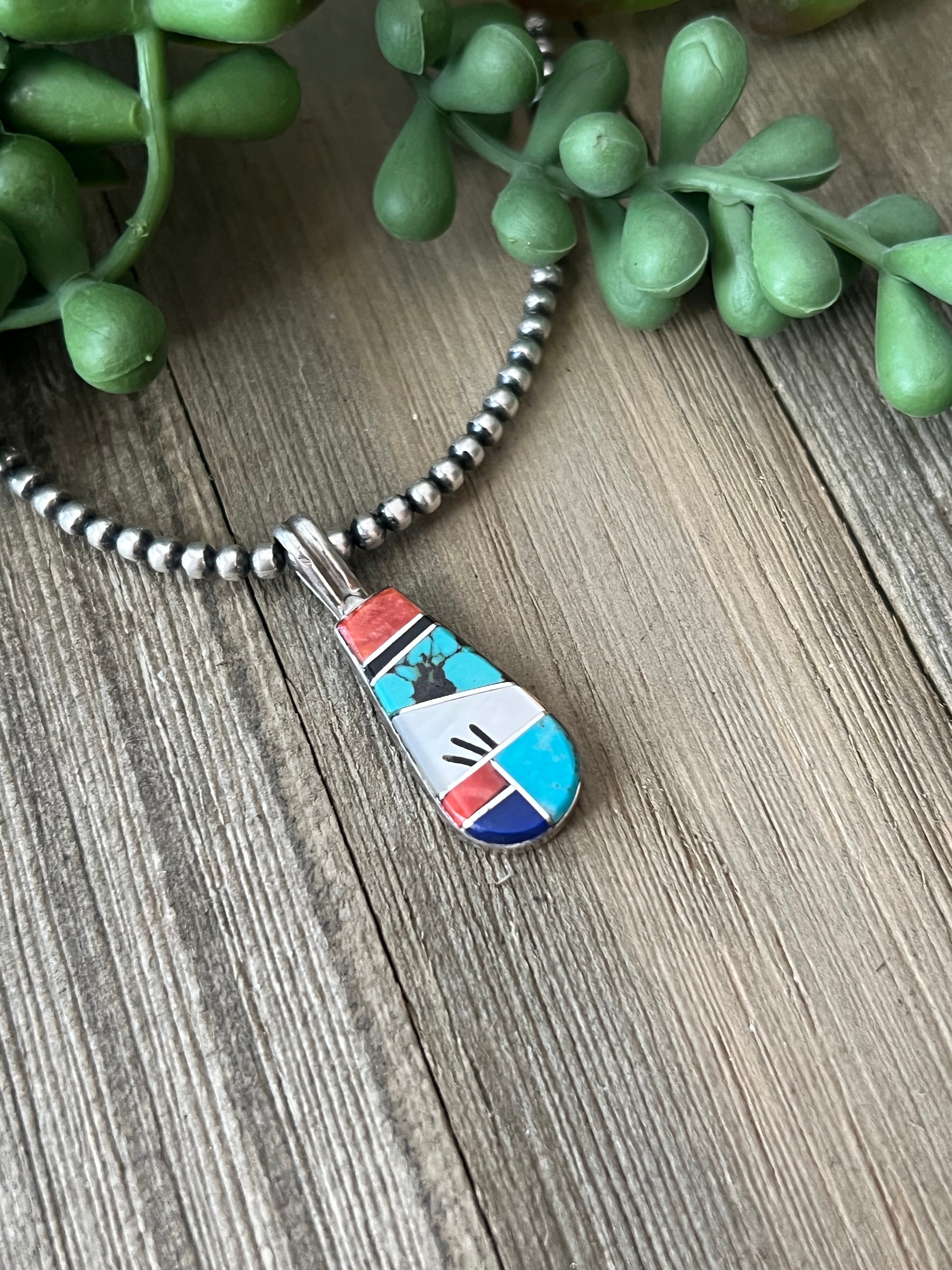 Germane Smith Multi Stone & Sterling Silver Inlay Pendant. It measures 2 3/8 inches long and 1/2 of an inch wide. Pendant Only!! Signed by the artist and stamped sterling silver.