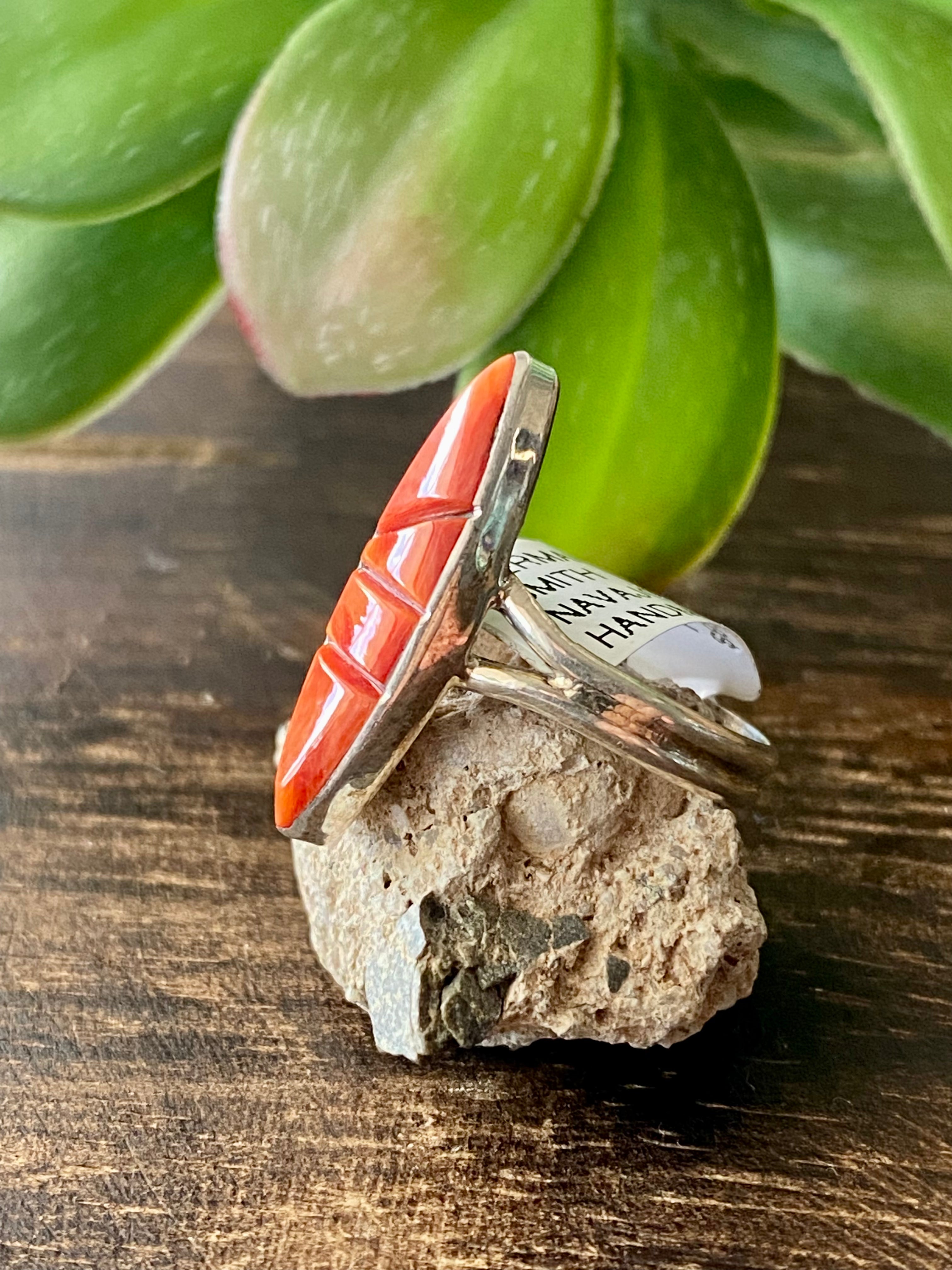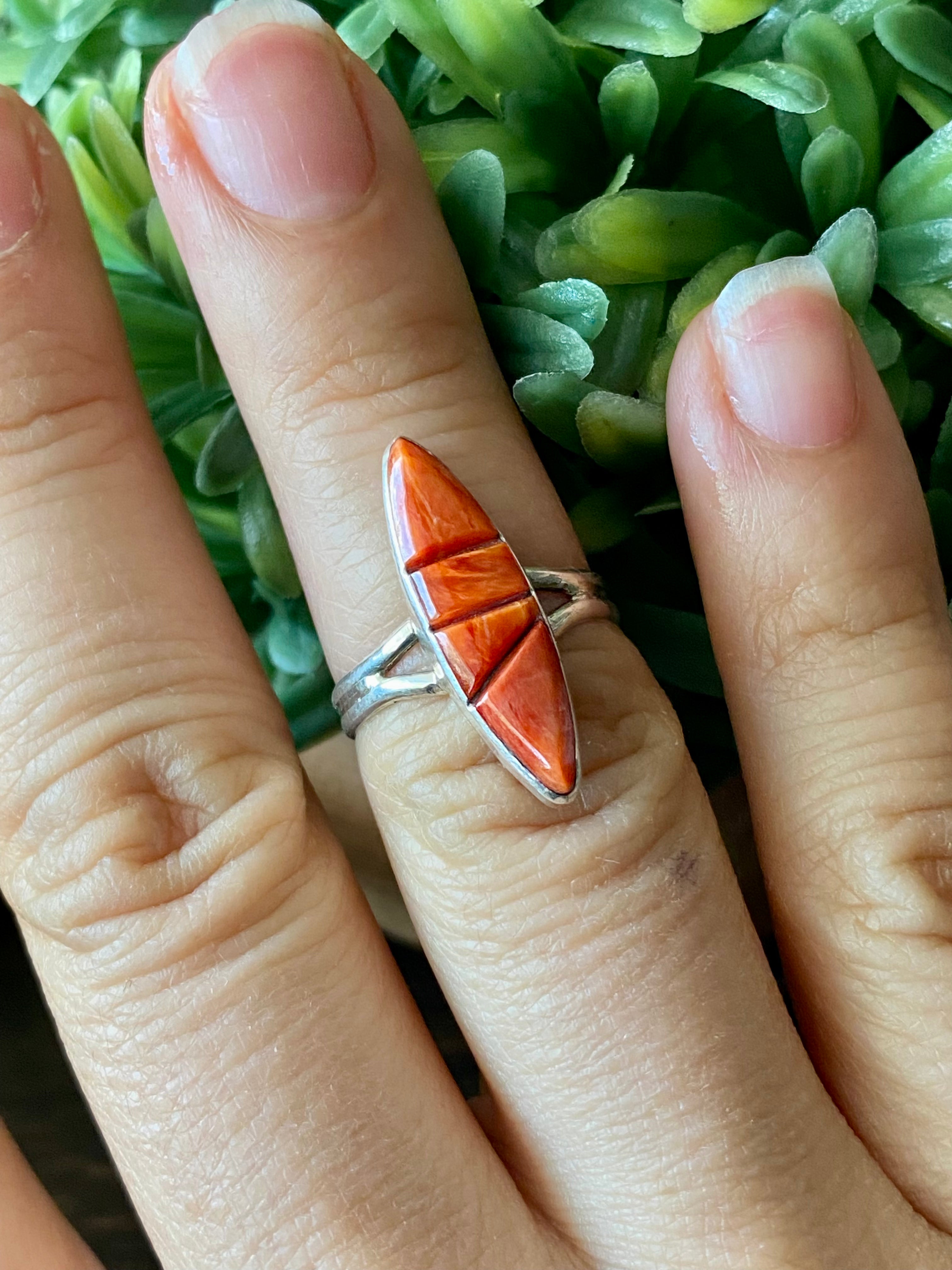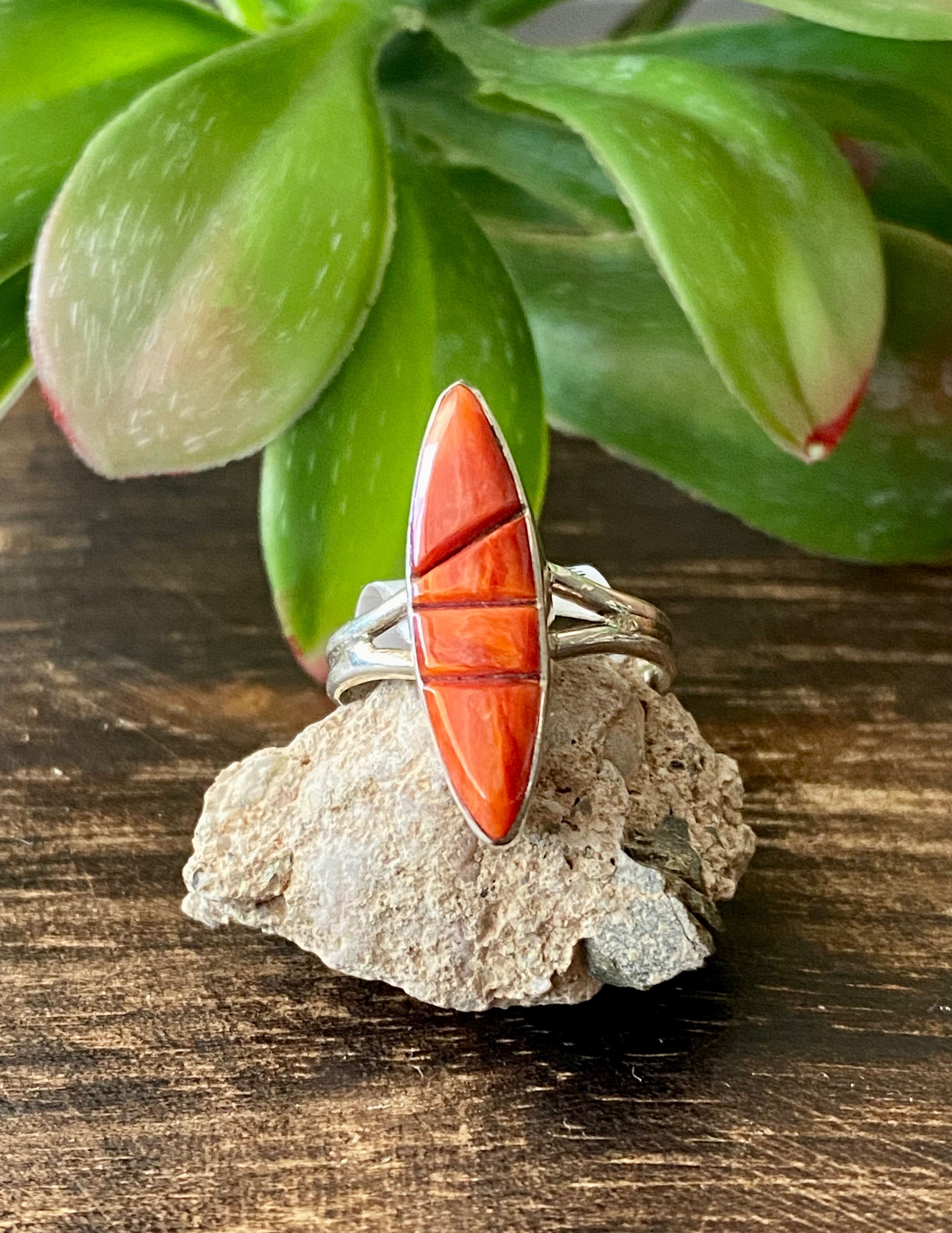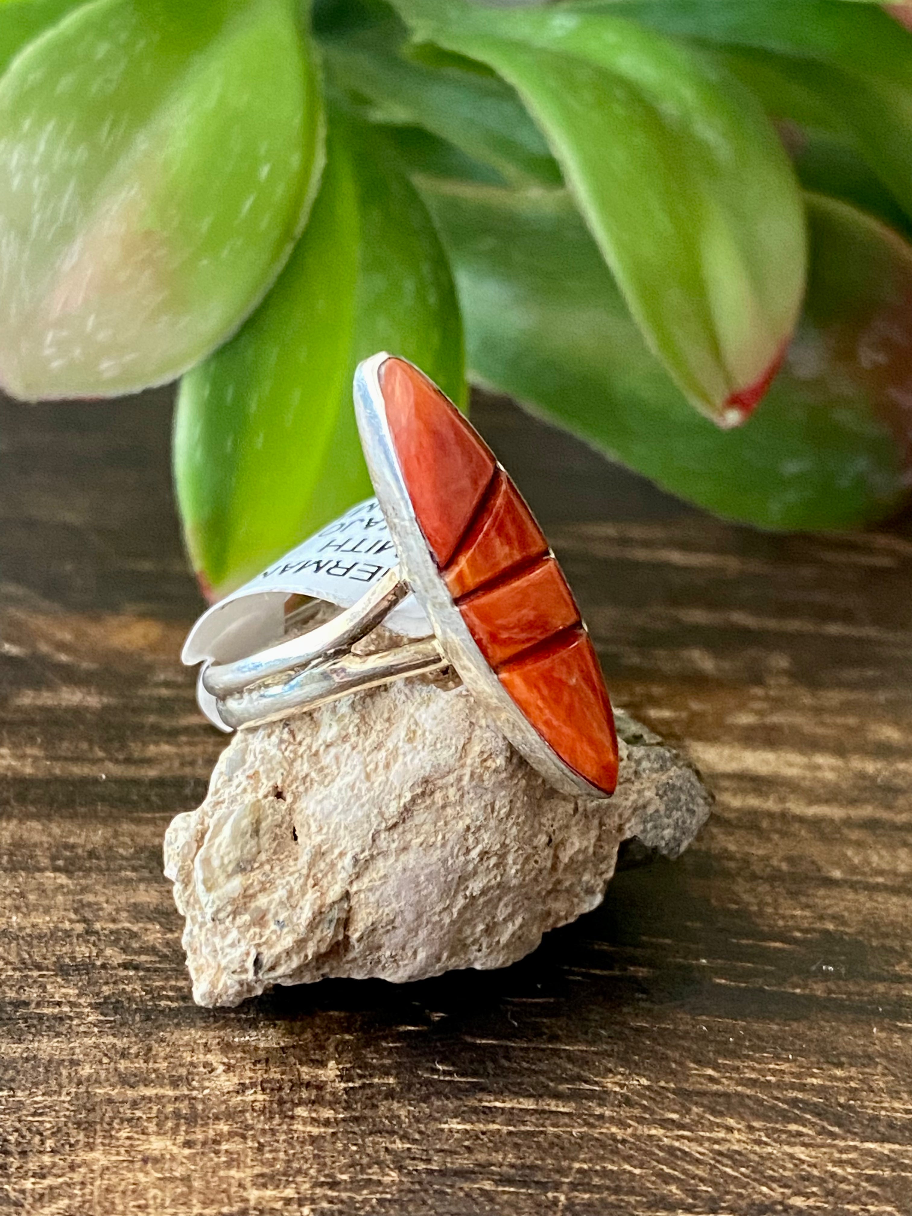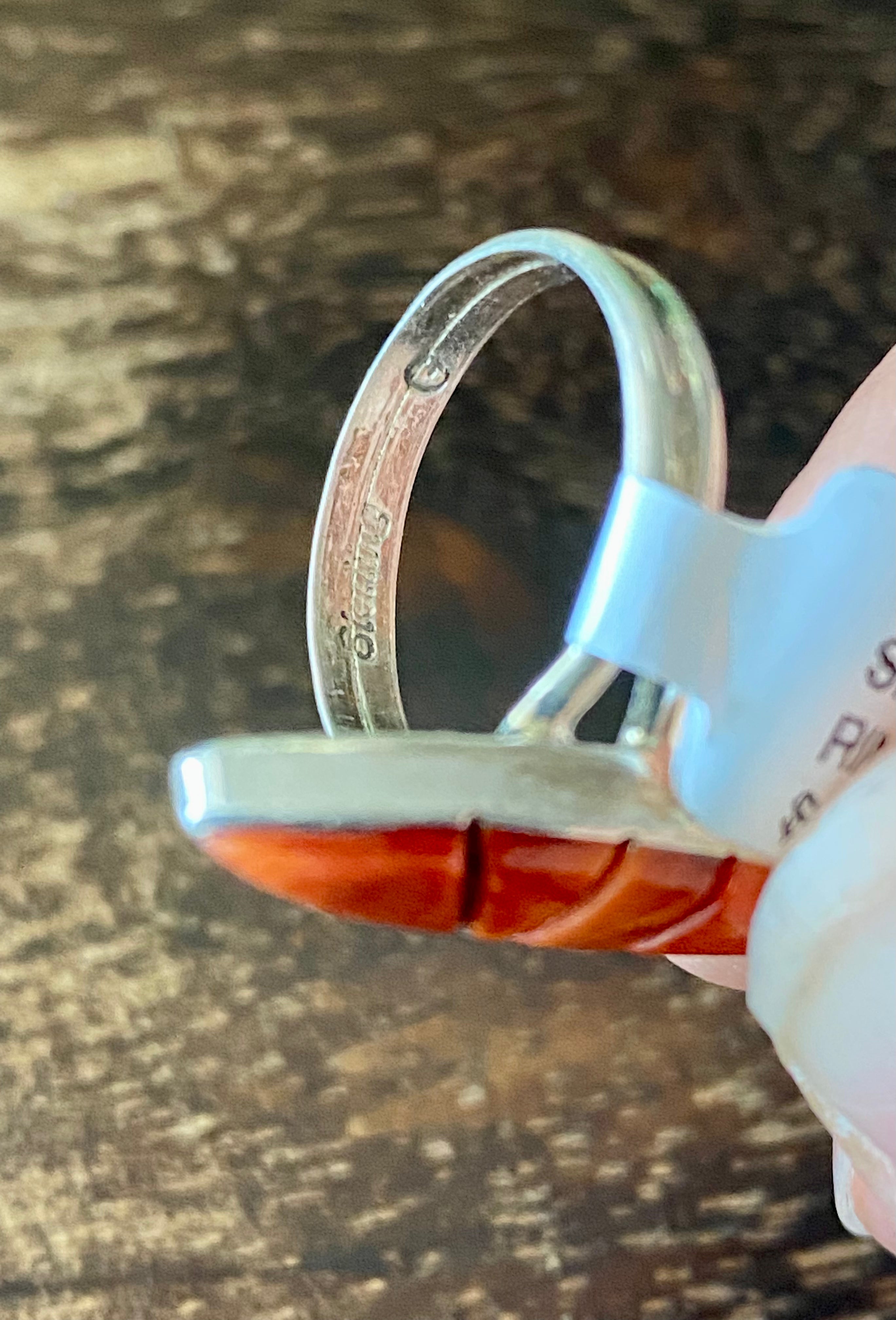 Germane Smith Spiny Oys & Sterling Silver Cobblestone Ring Size 6.5. It measures 7/8 of an inch long and just over 1/8 of an inch wide. Signed by the artist and stamped sterling silver.