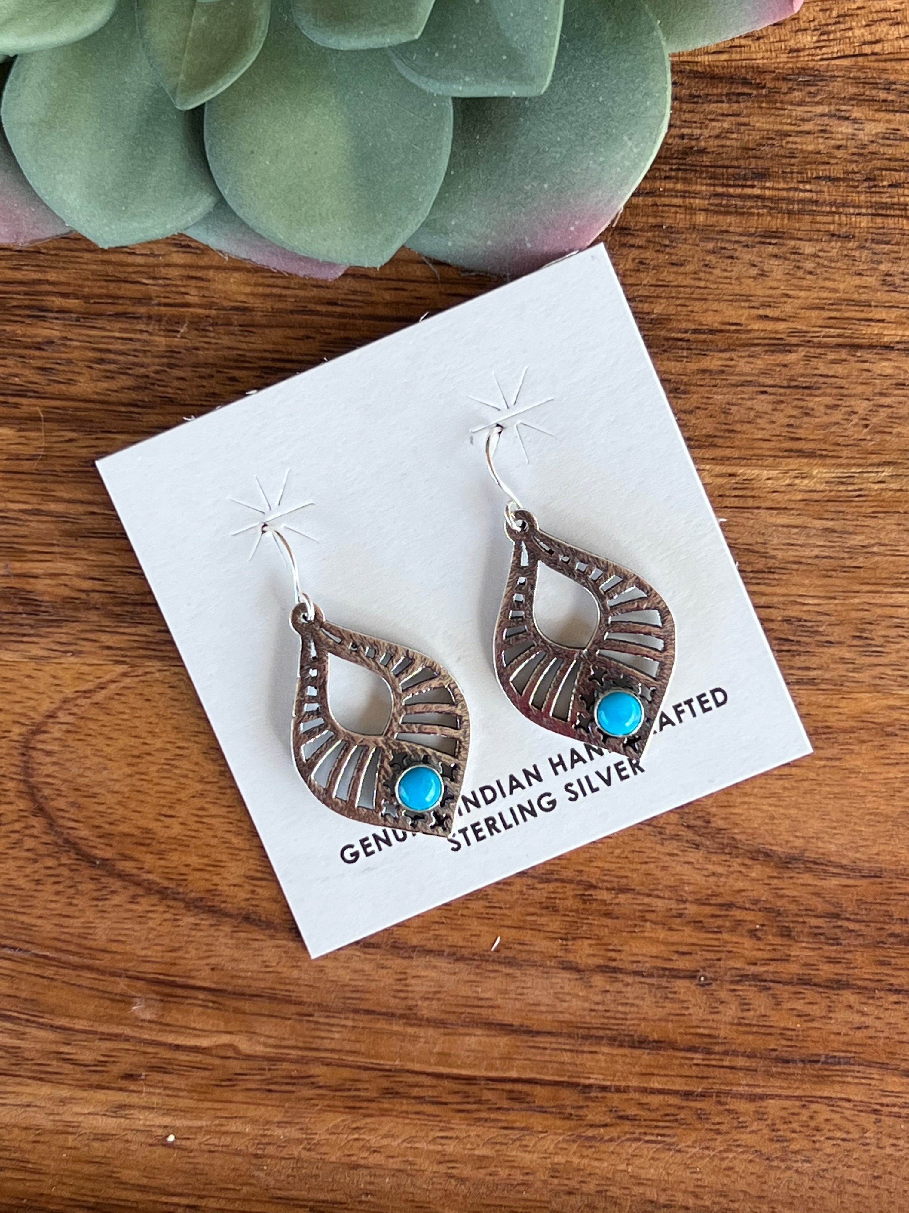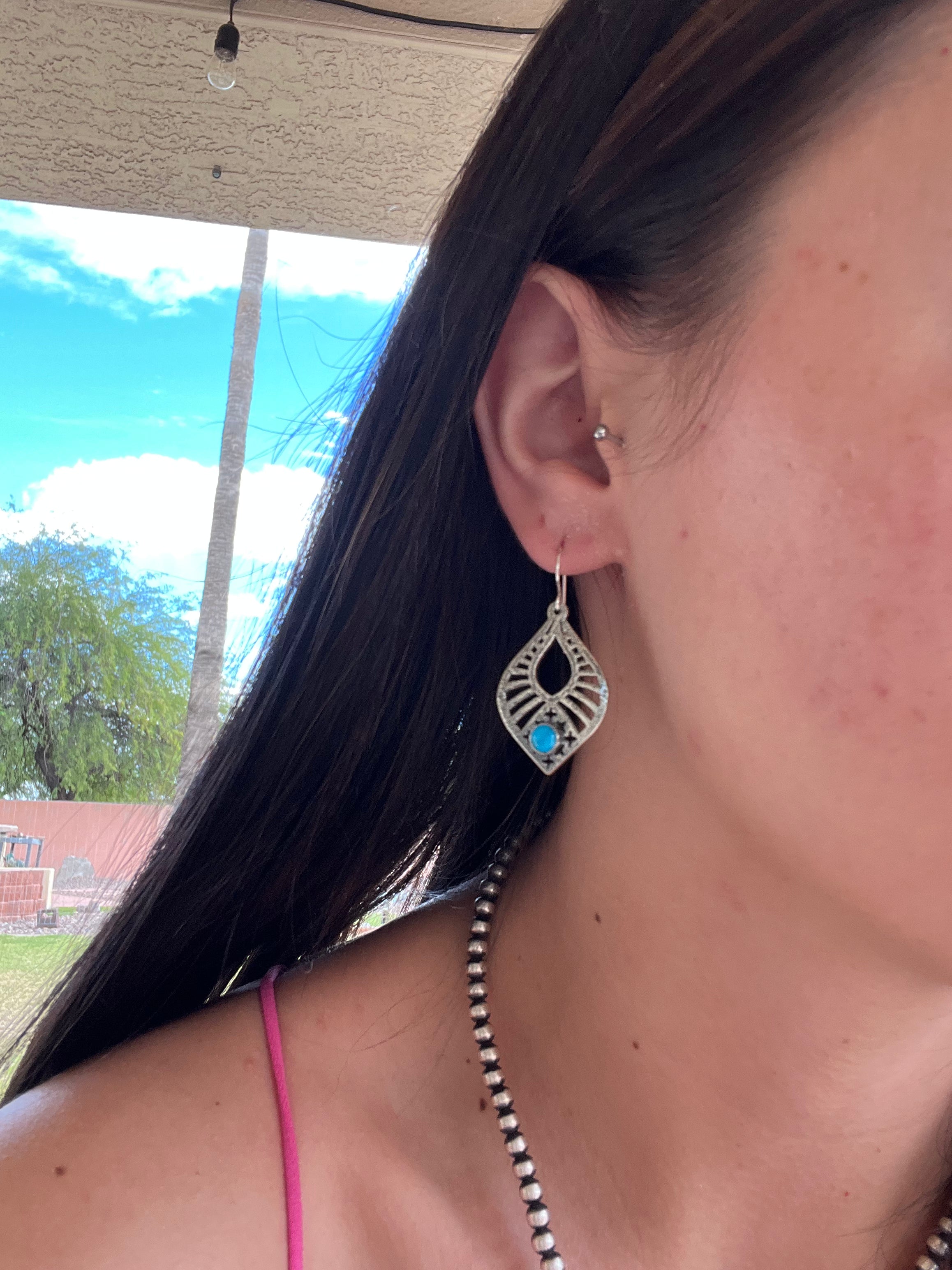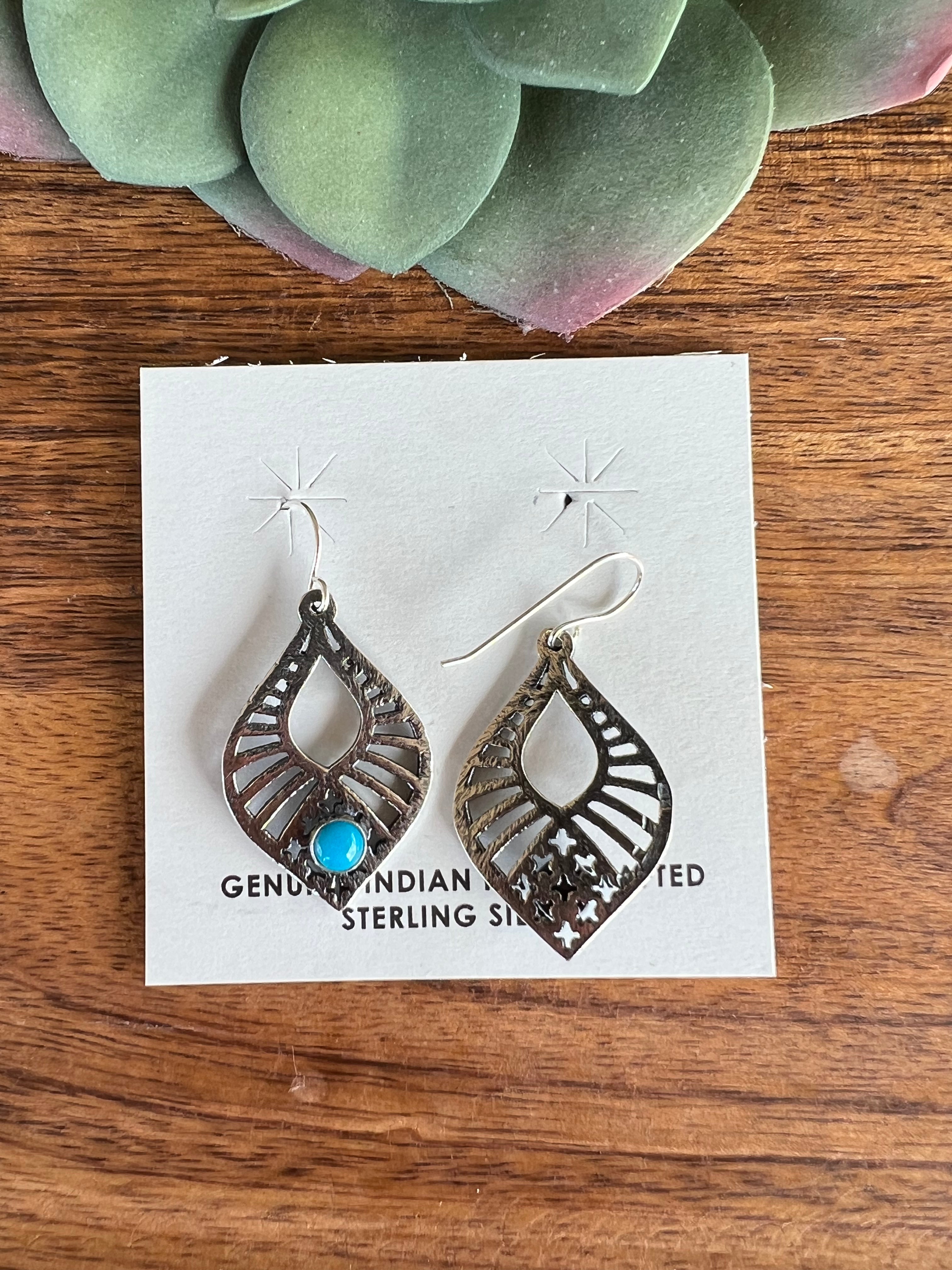 Harold Joe Kingman Turquoise & Sterling Silver Dangle Earrings. It measures 1 1/2 inches long and just under 7/8 of an inch wide. Signed by artist and stamped sterling silver.