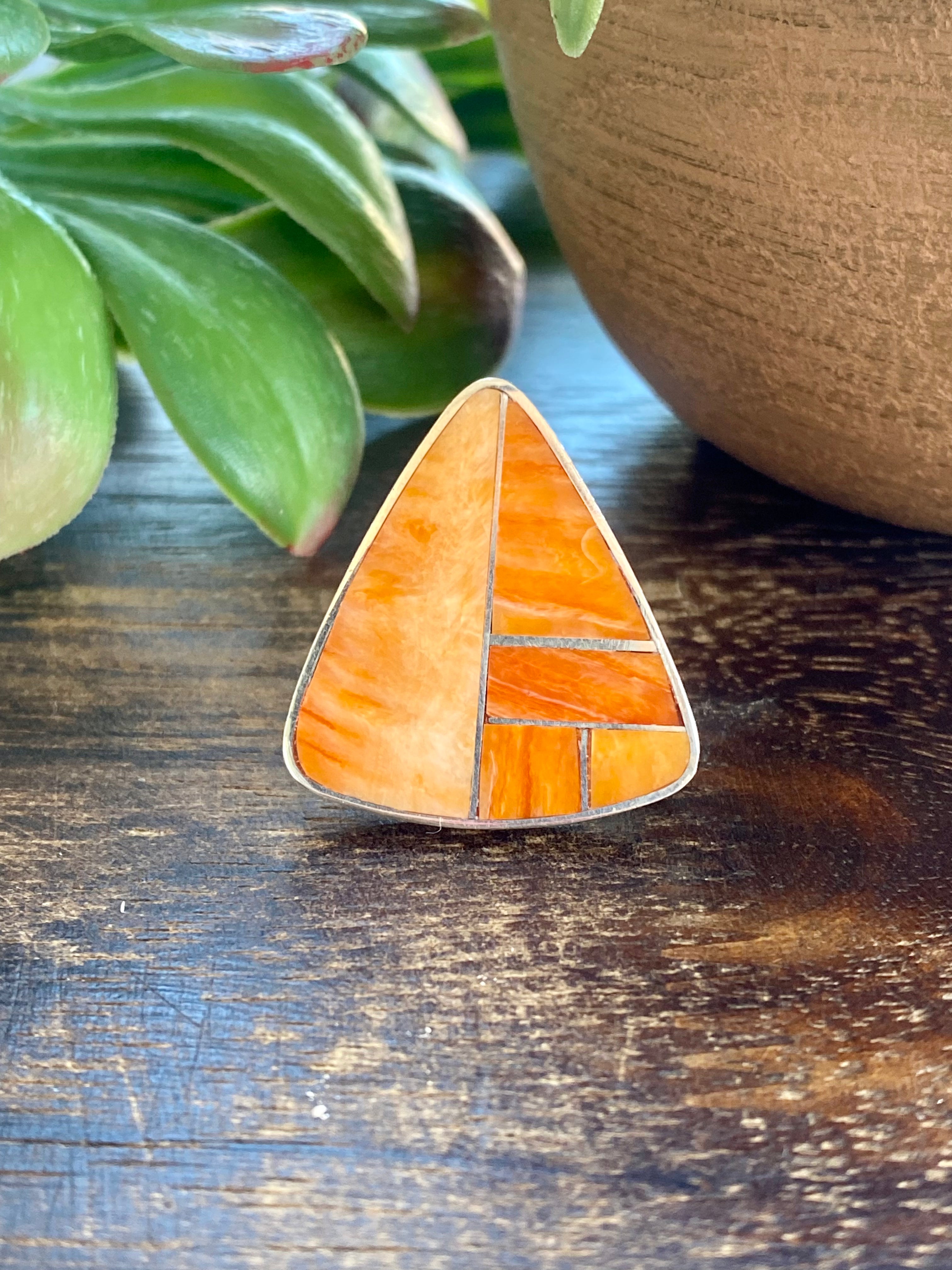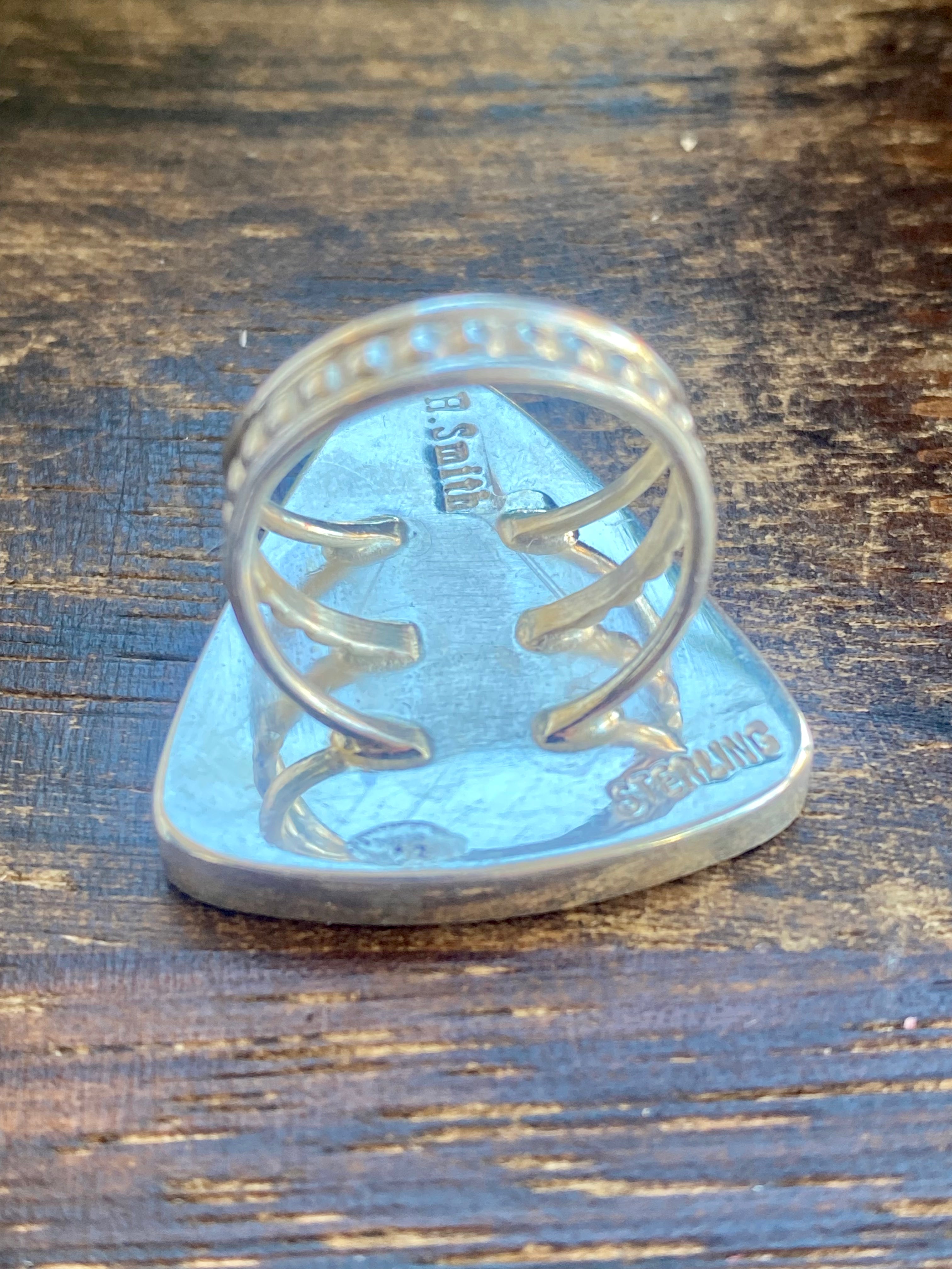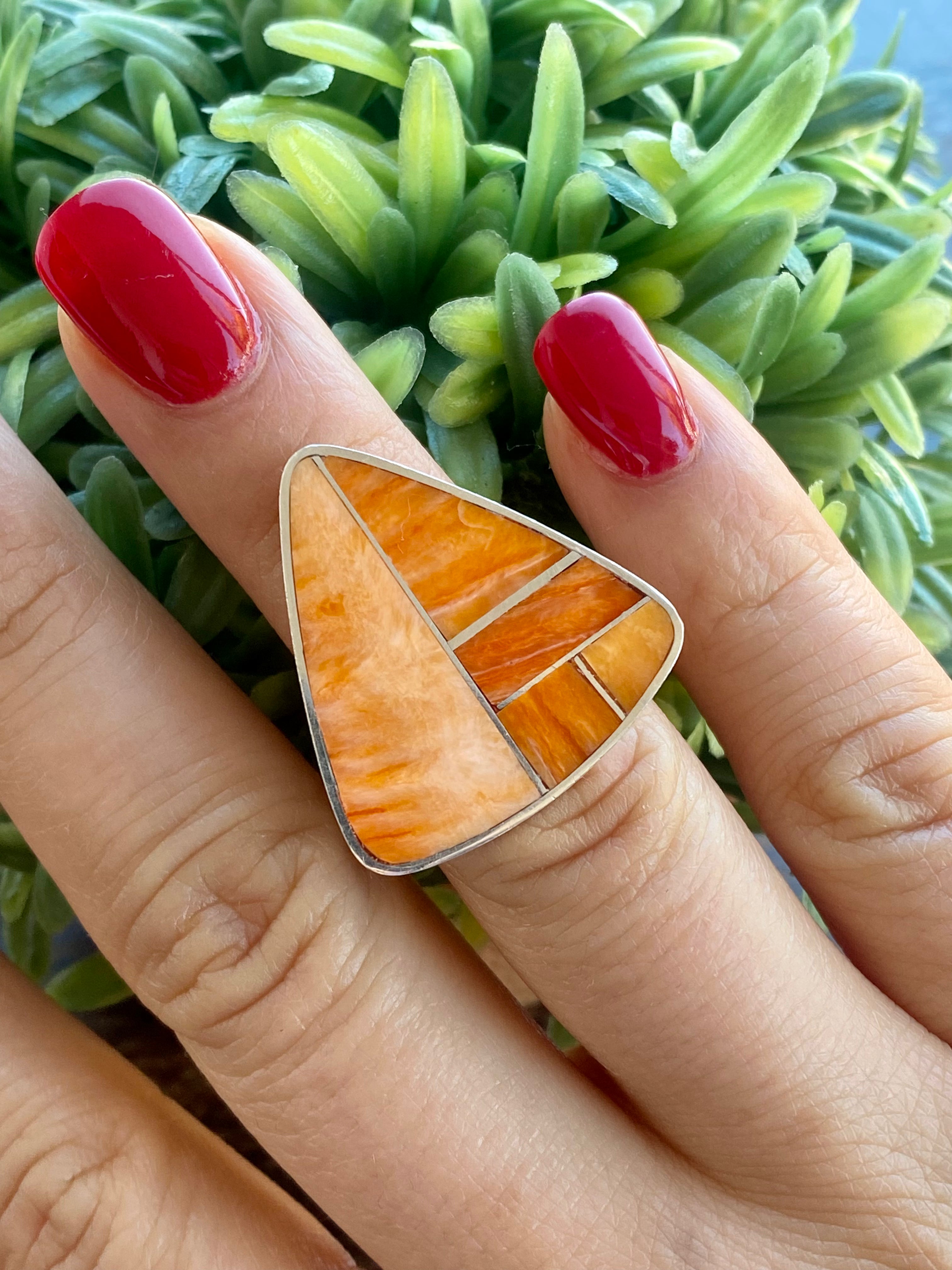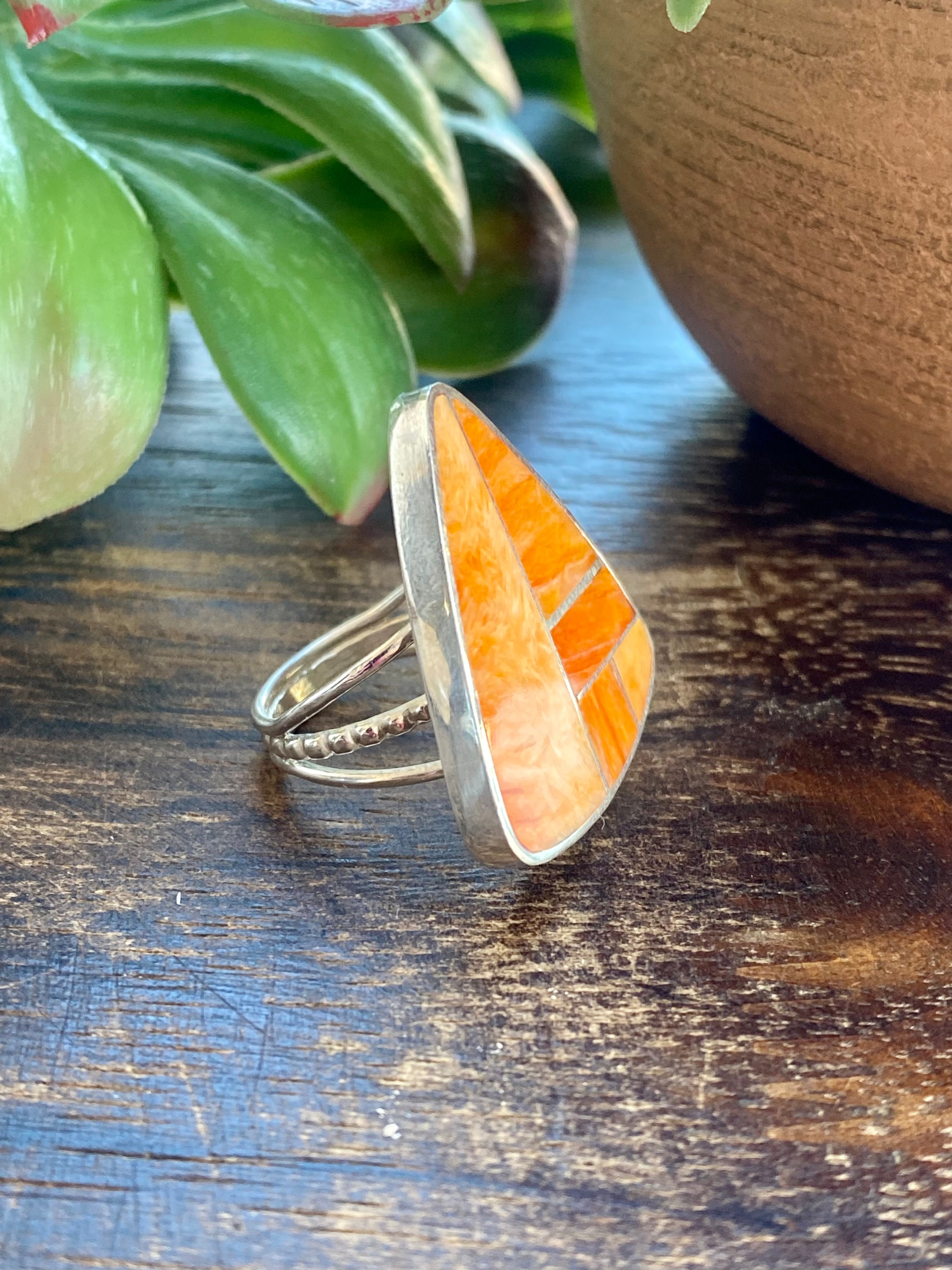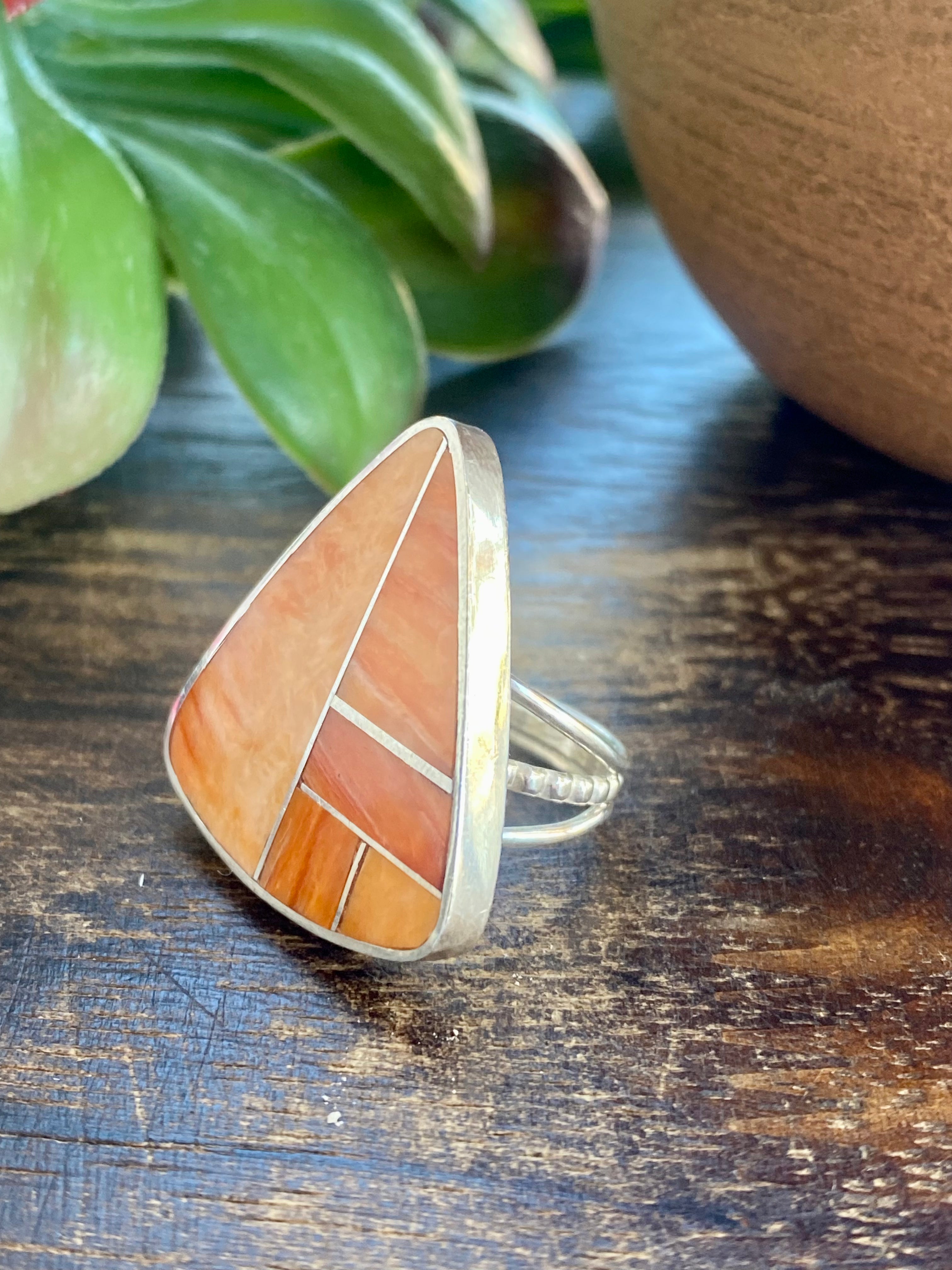 Harold Smith Spiny Oys & Sterling Silver Inlay Ring Size 5.75. It measures 1 1/8 inches long and just over 1 inch wide. Signed by the artist and stamped sterling silver.