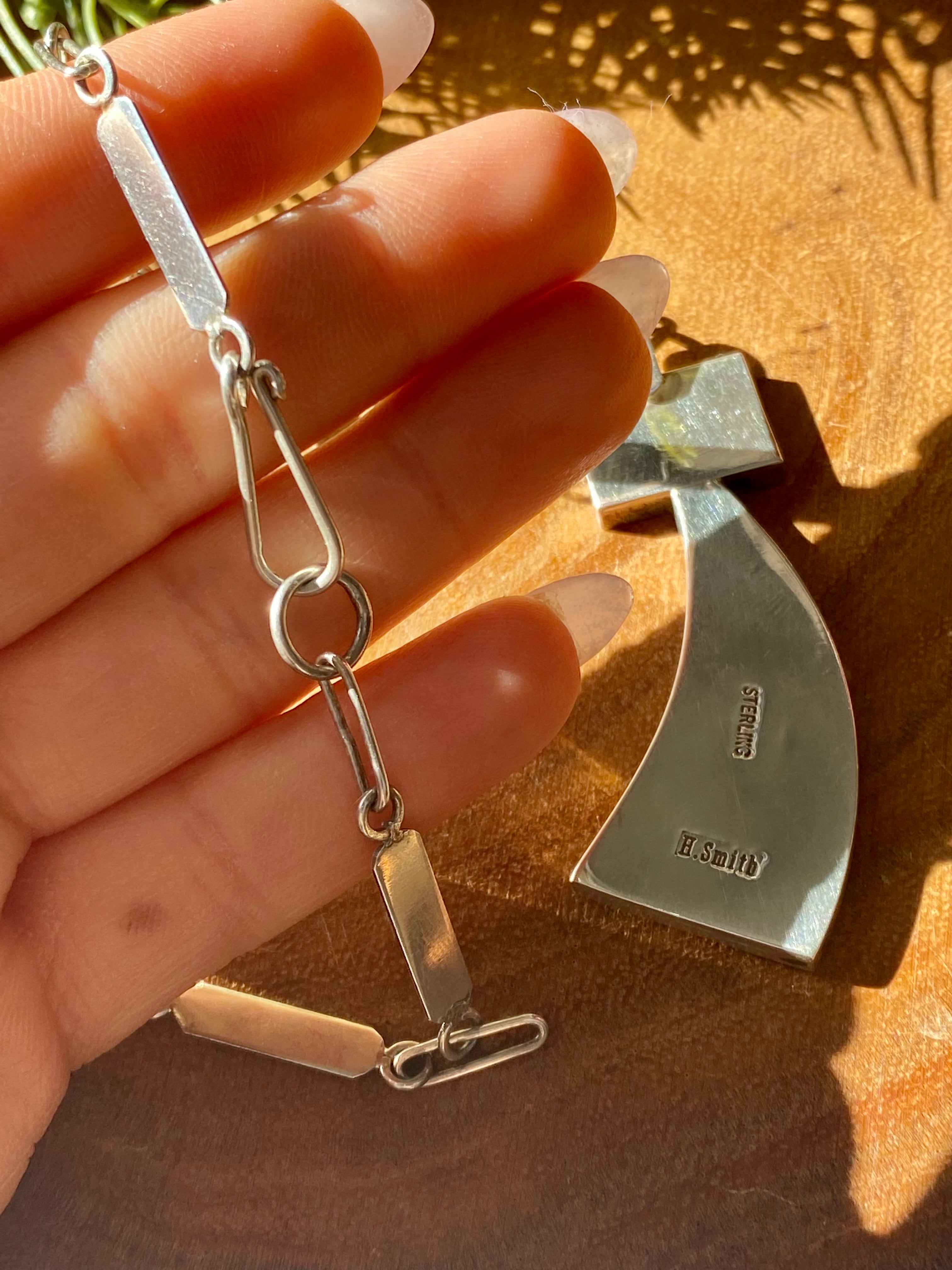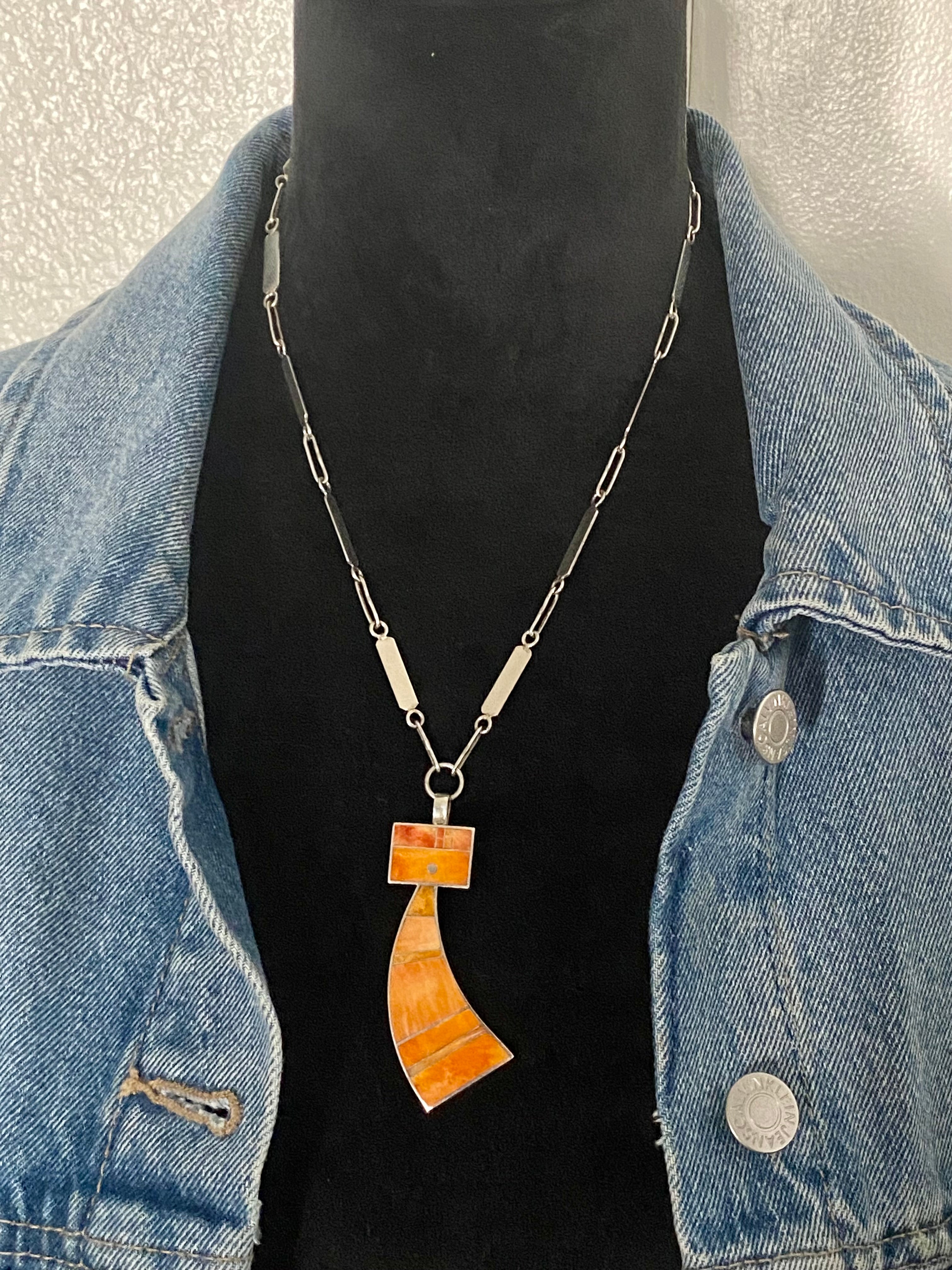 Harold Smith Spiny Oyster & Sterling Silver Inlay Necklace. It measures 26 inches long with hang while the necklace by itself measures 20 inches long. Signed by the artist and stamped sterling silver.