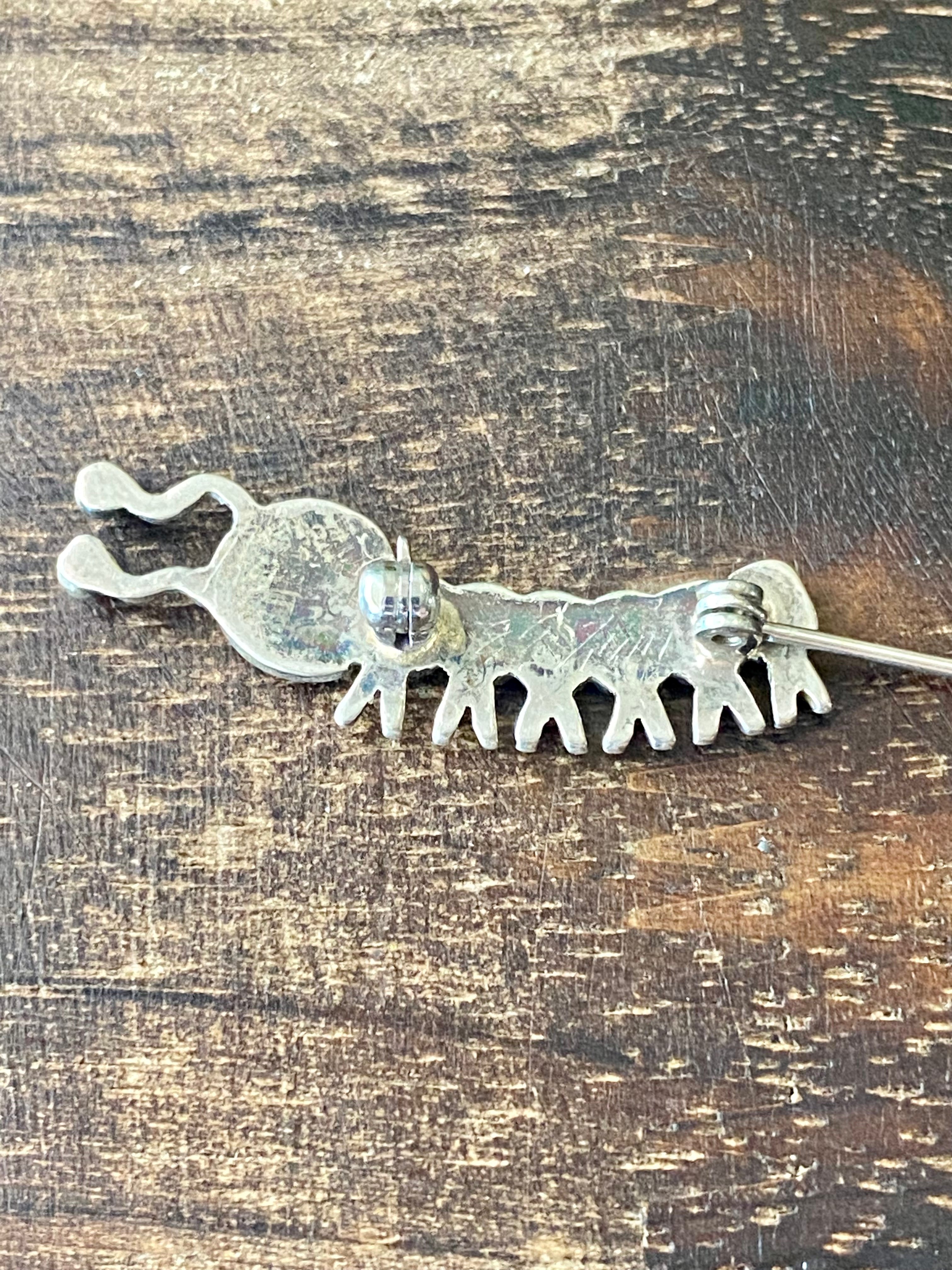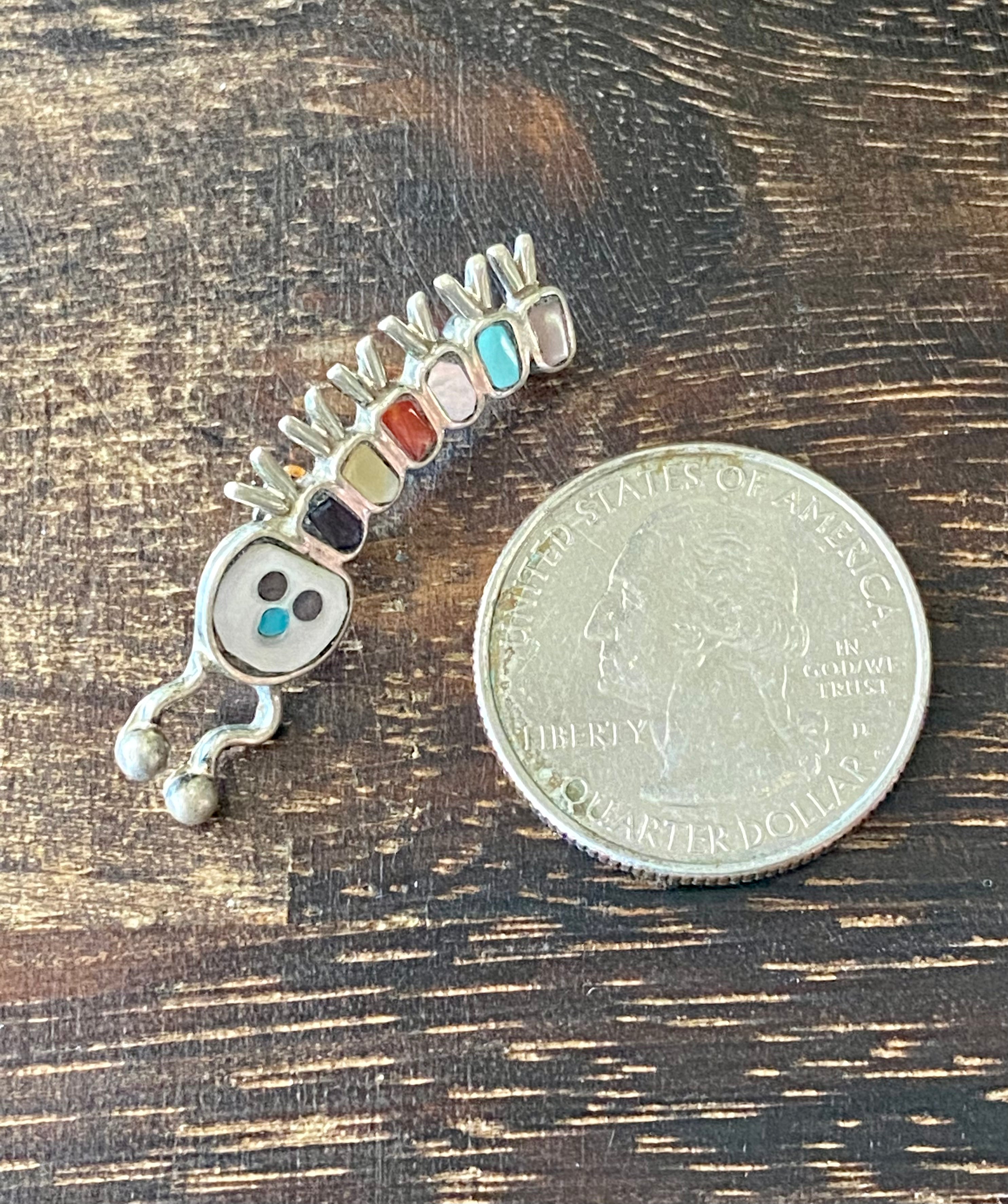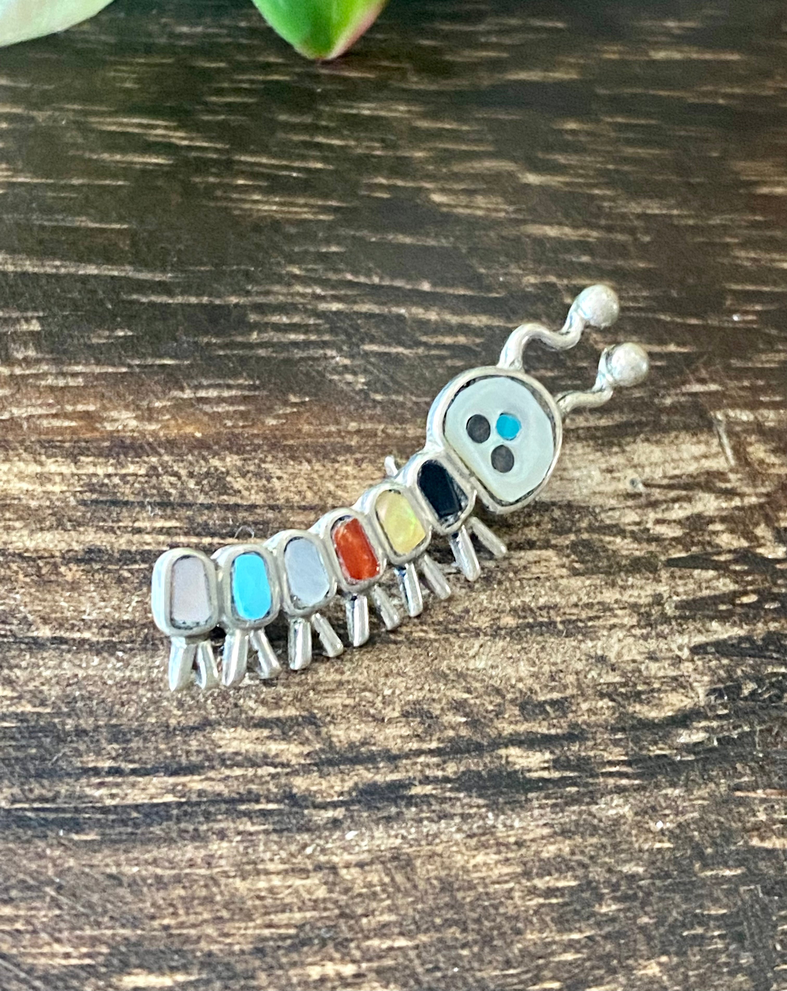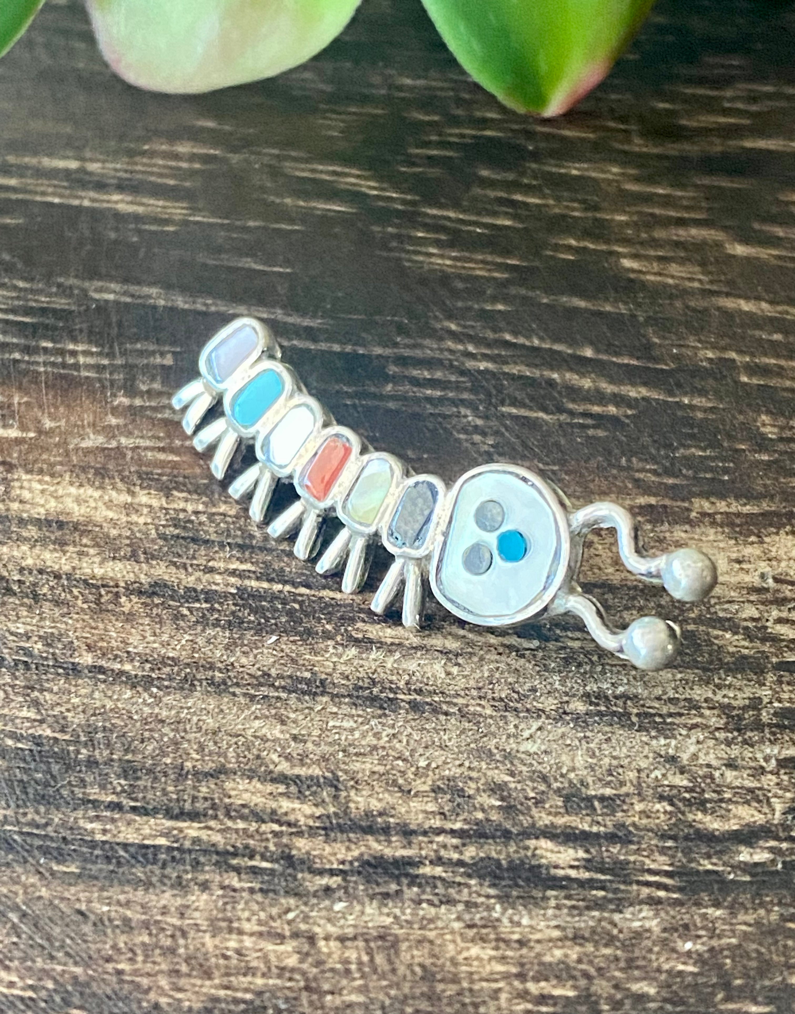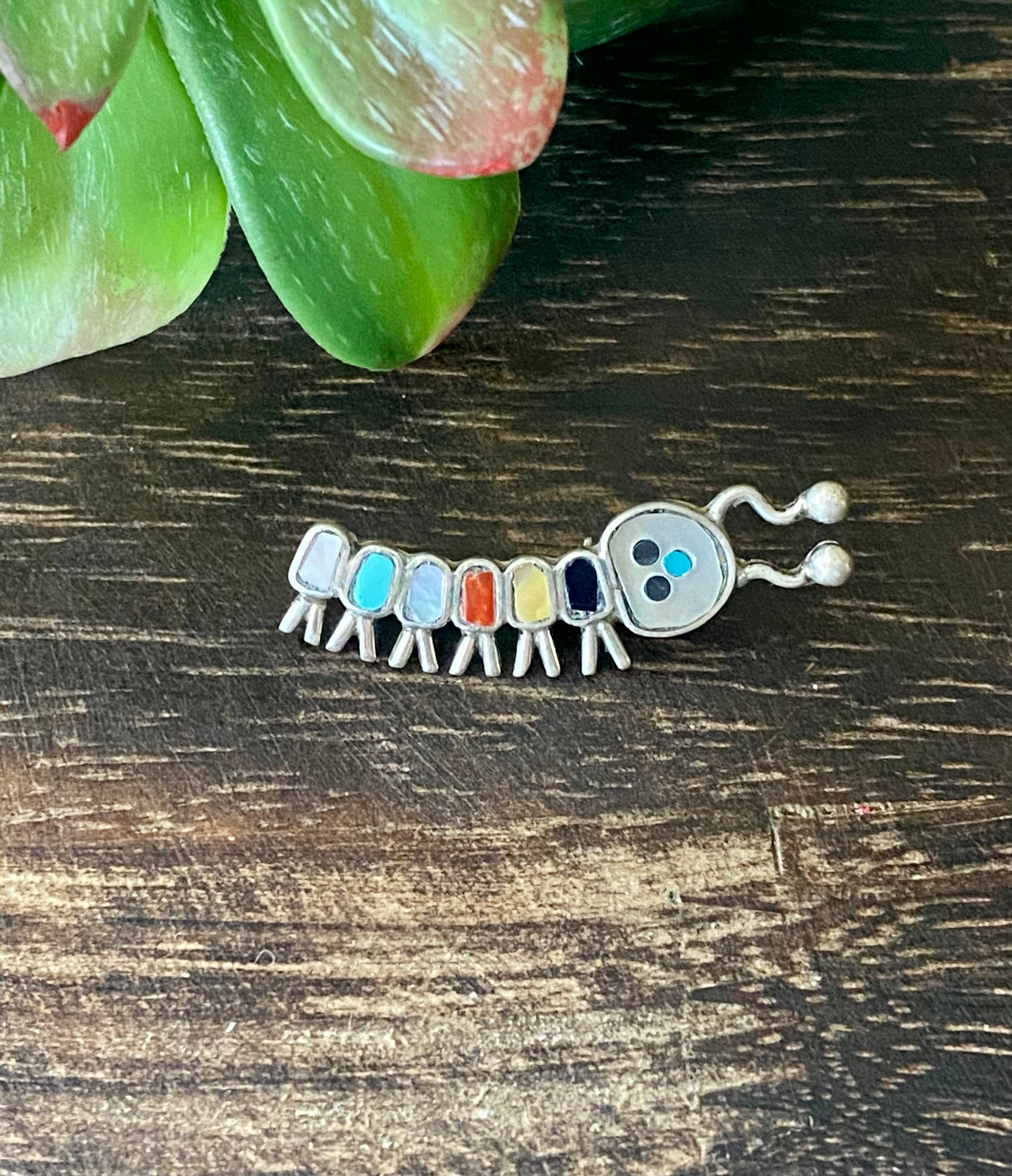 Howard Shelendewa Multi Stone & Sterling Silver Inlay Caterpillar Pin. It measures 3/8 of an inch long and 1 3/8 inches wide. Signed by the artist.