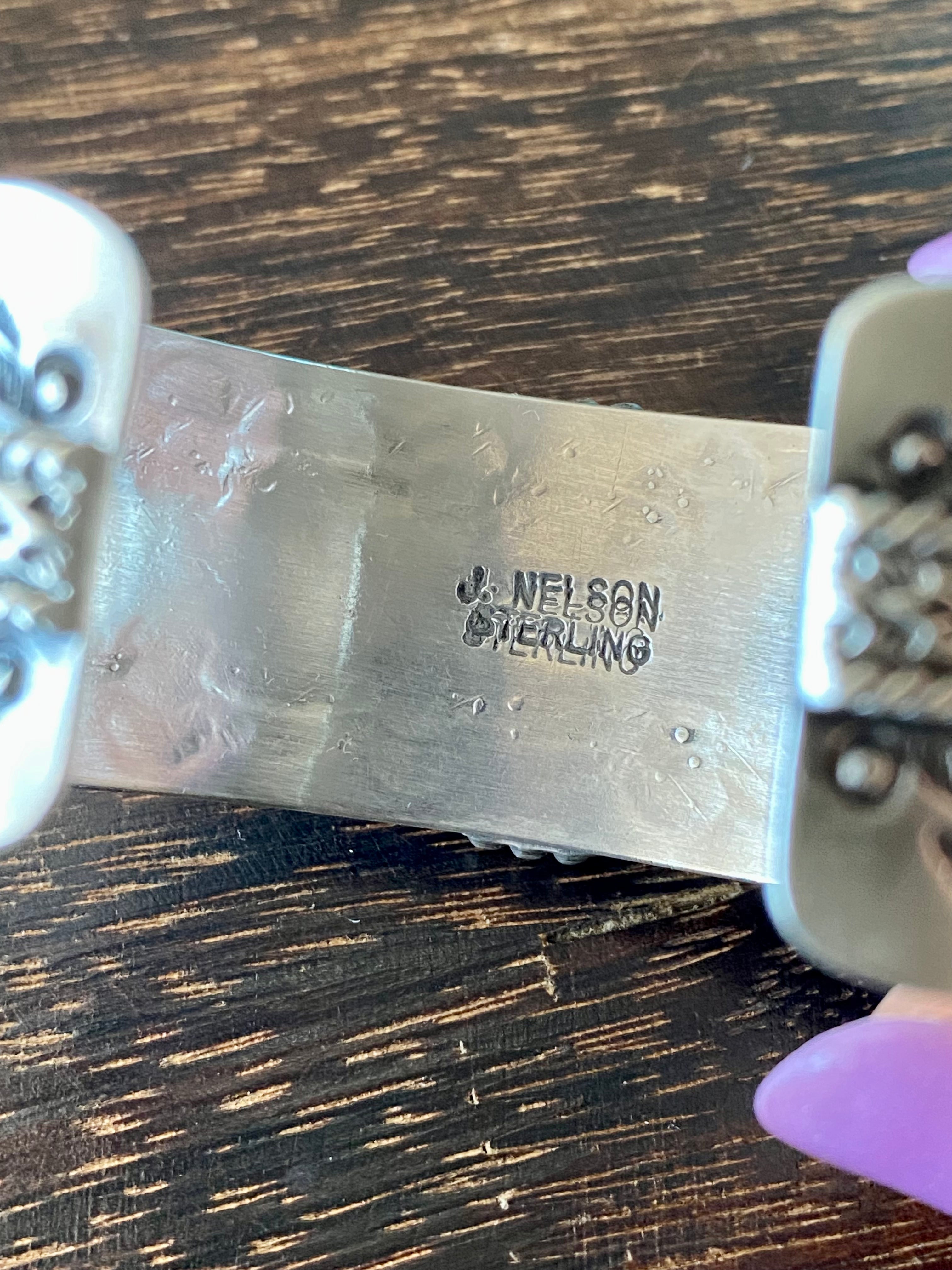 J Nelson Carico Lake Turquoise & Sterling Silver Cuff Bracelet. It measures 1 1/8 inches wide with an inside circumference of 5 3/4 inches and a gap of 1 inch. Signed by the artist and stamped sterling silver.