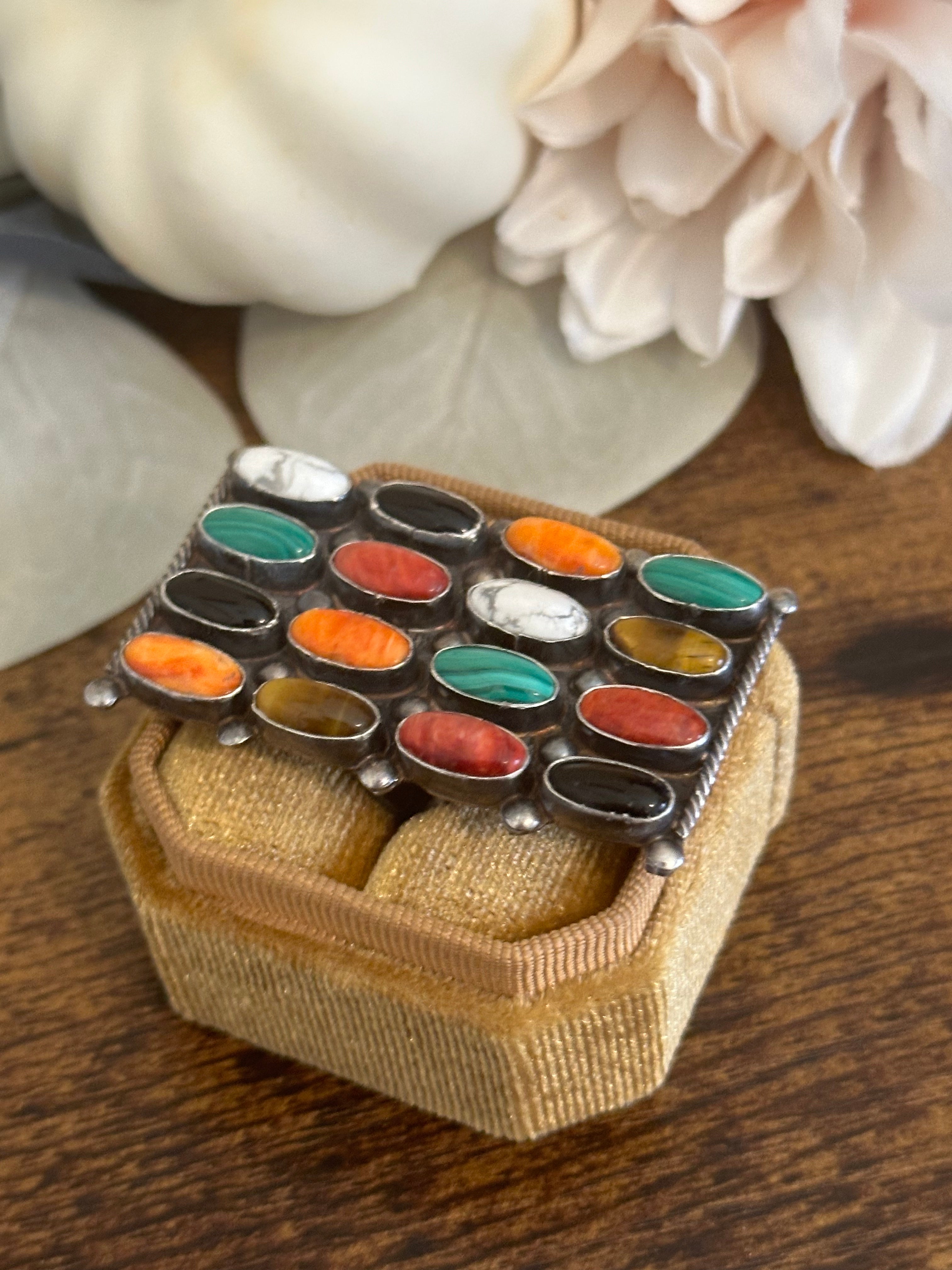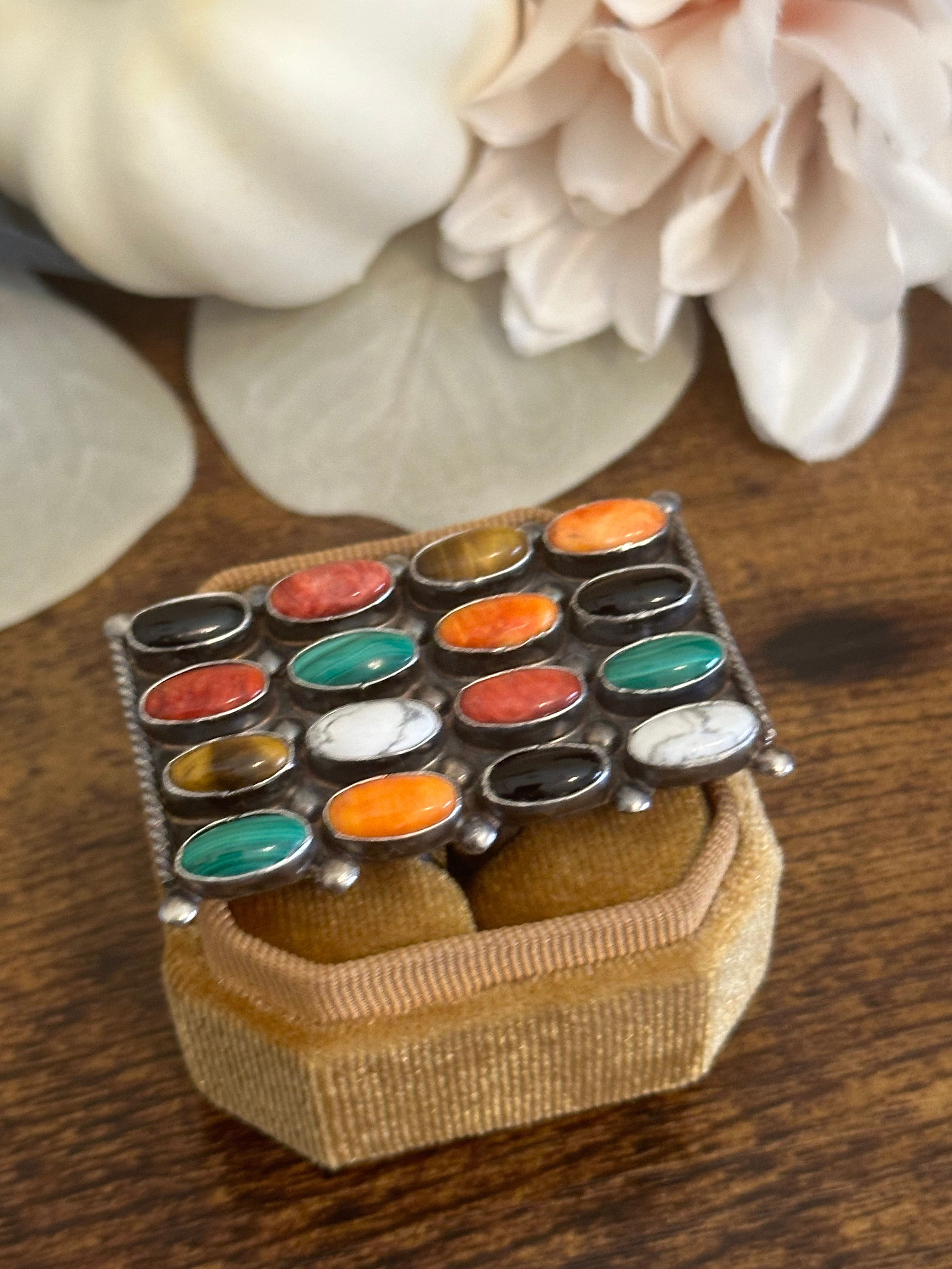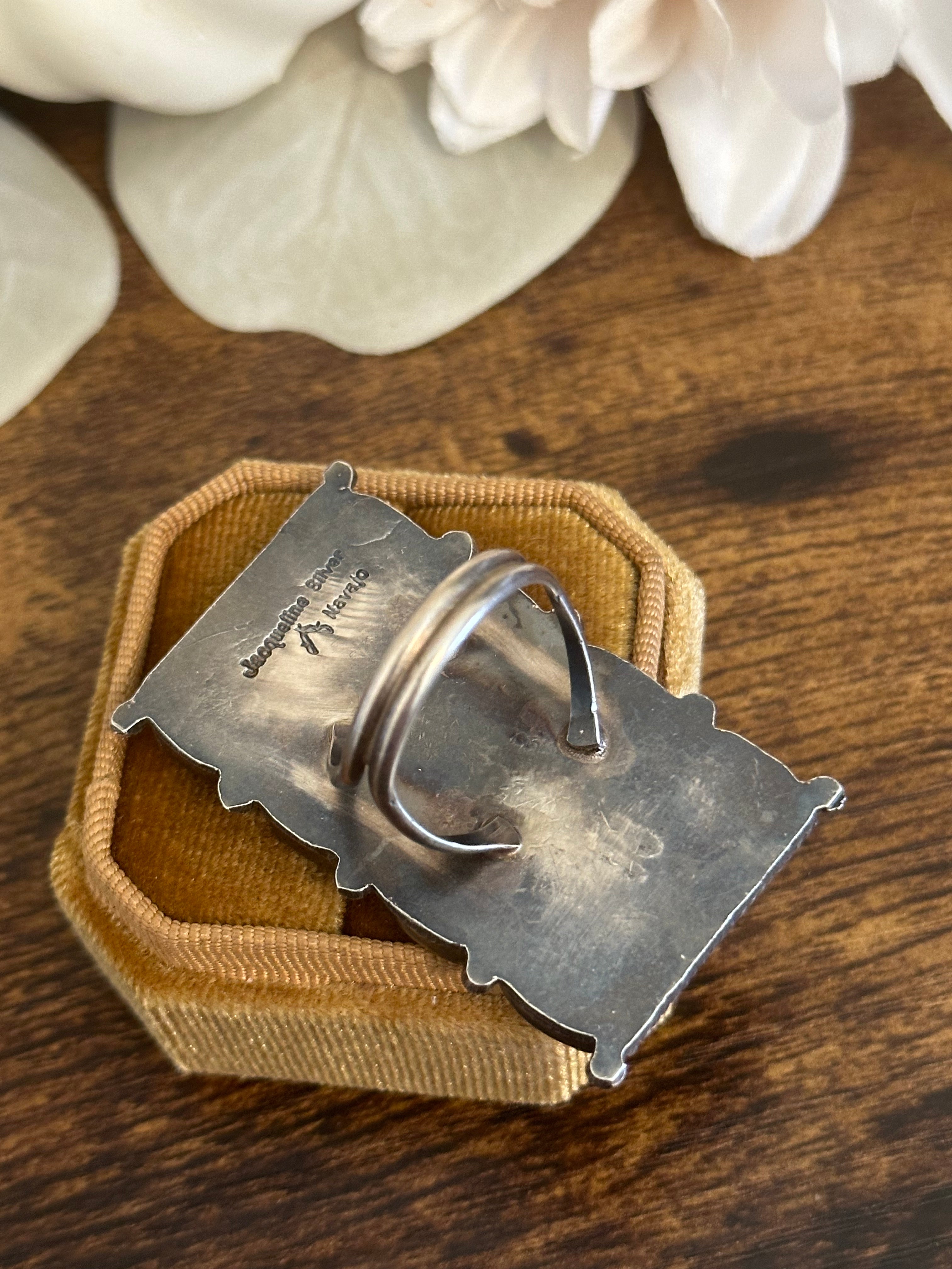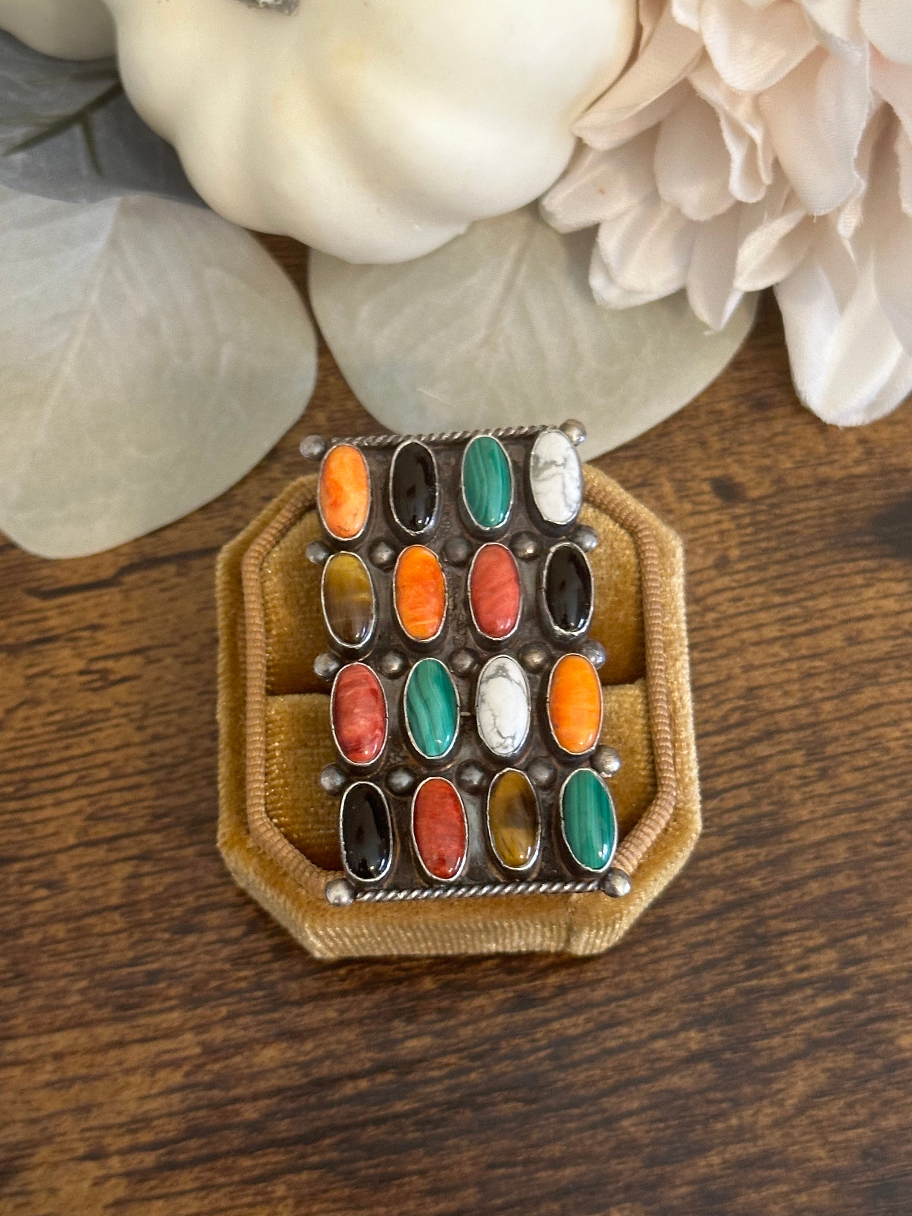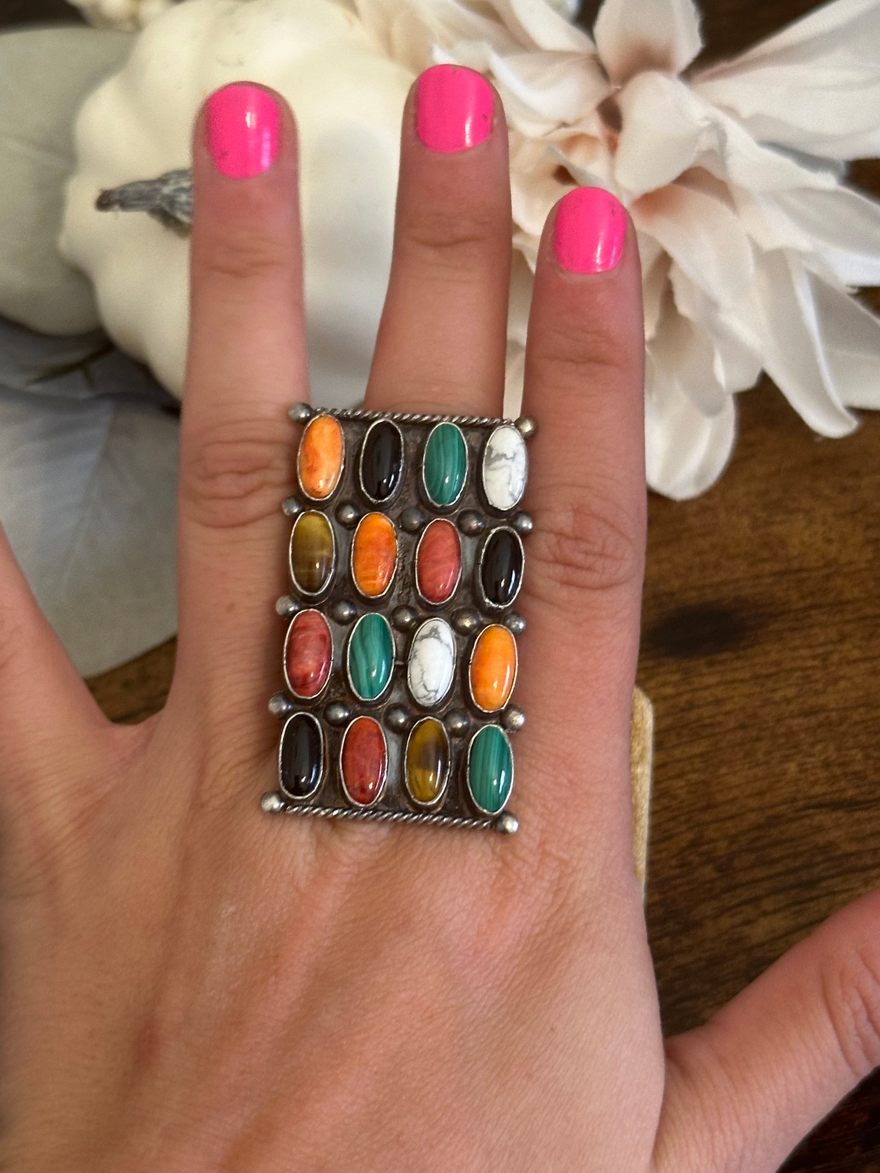 Beautiful ring, Jacqueline Silver Multi Stone & Sterling Silver Cluster Ring Size 9. It measures 1 7/8 inches long and 1 1/8 inches wide. Signed and stamped.