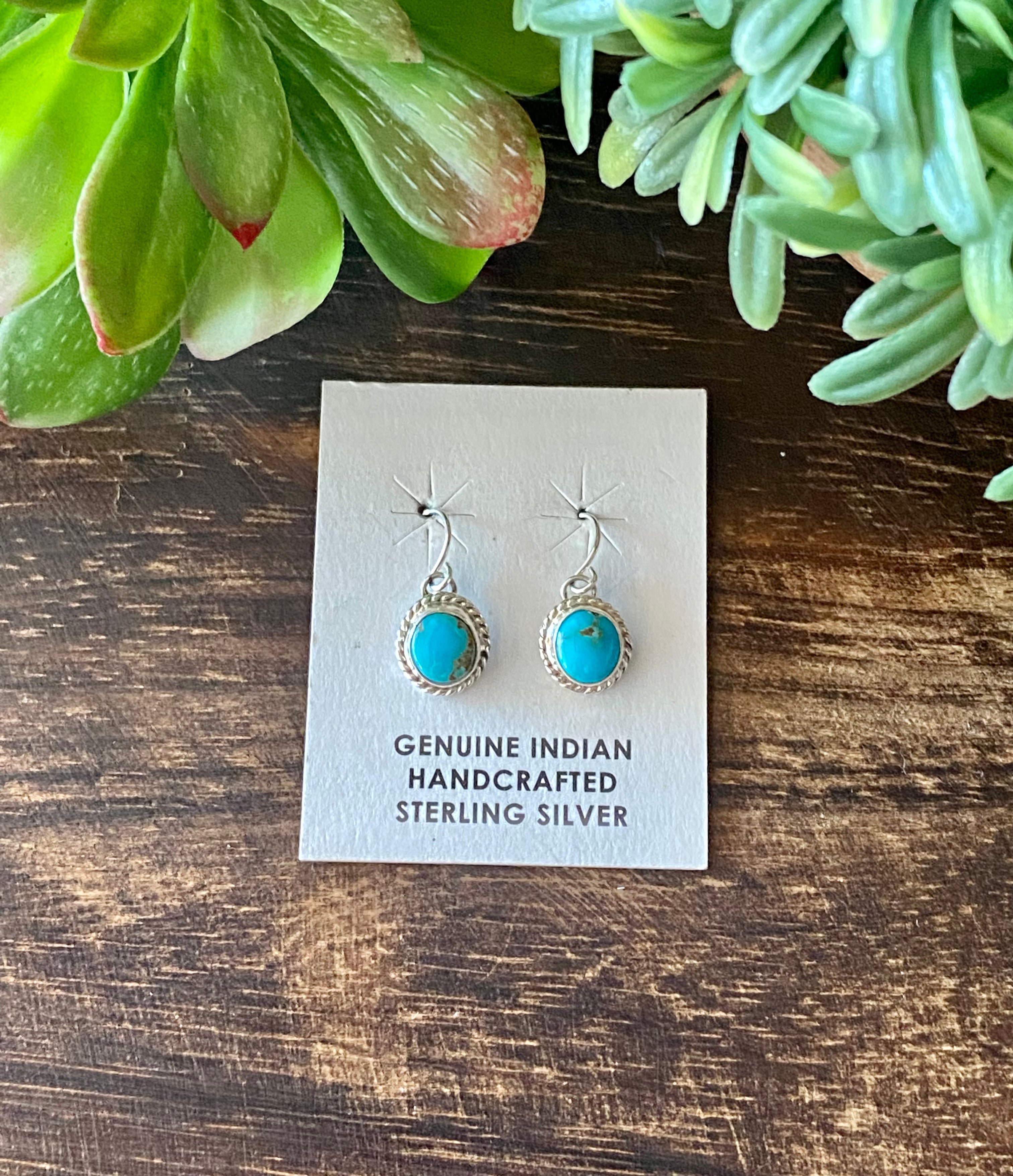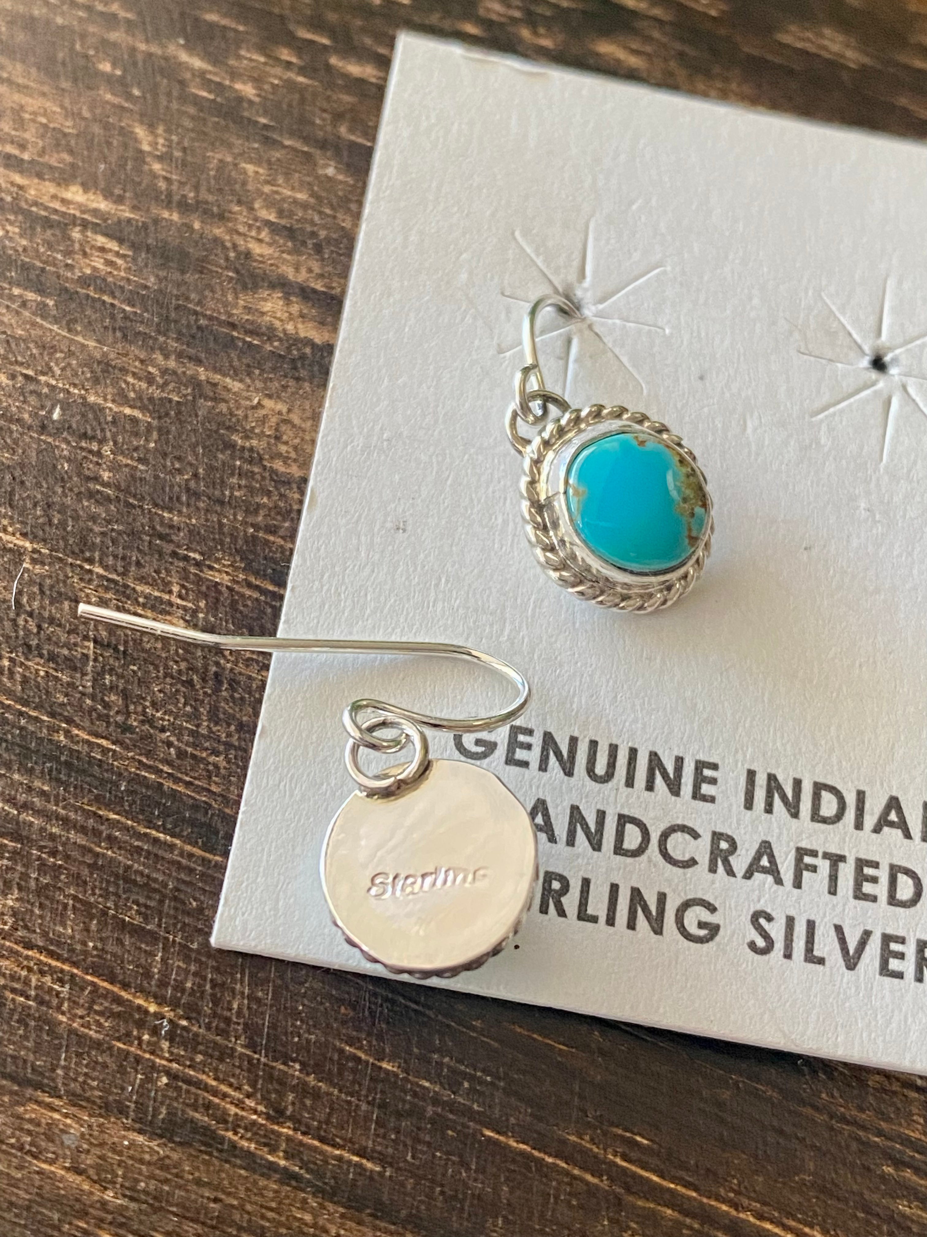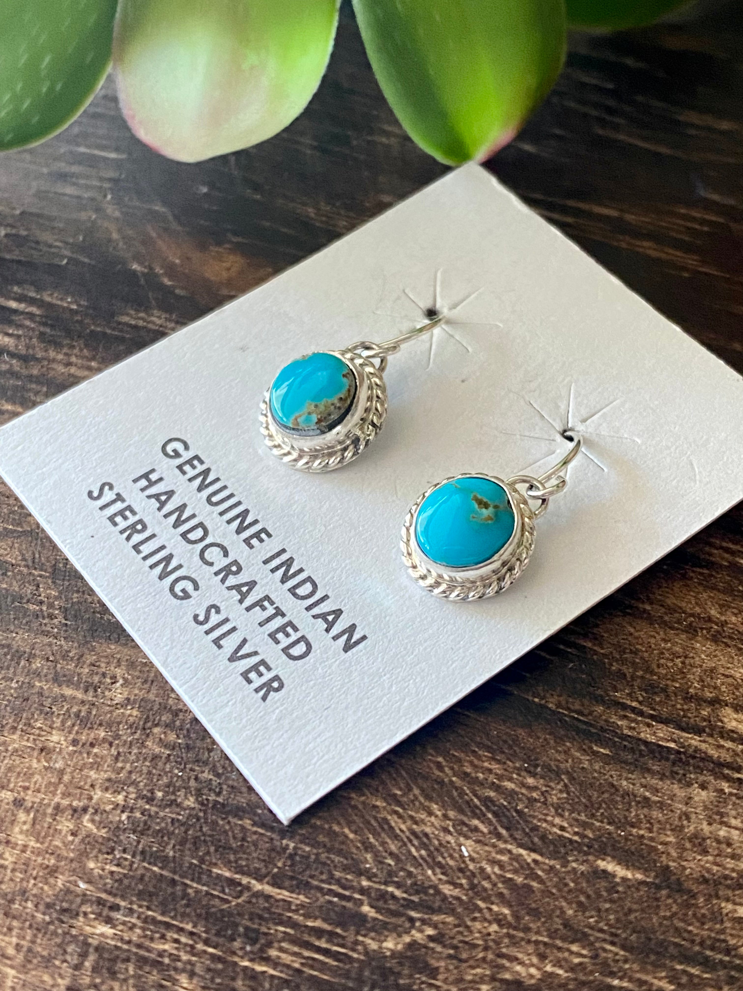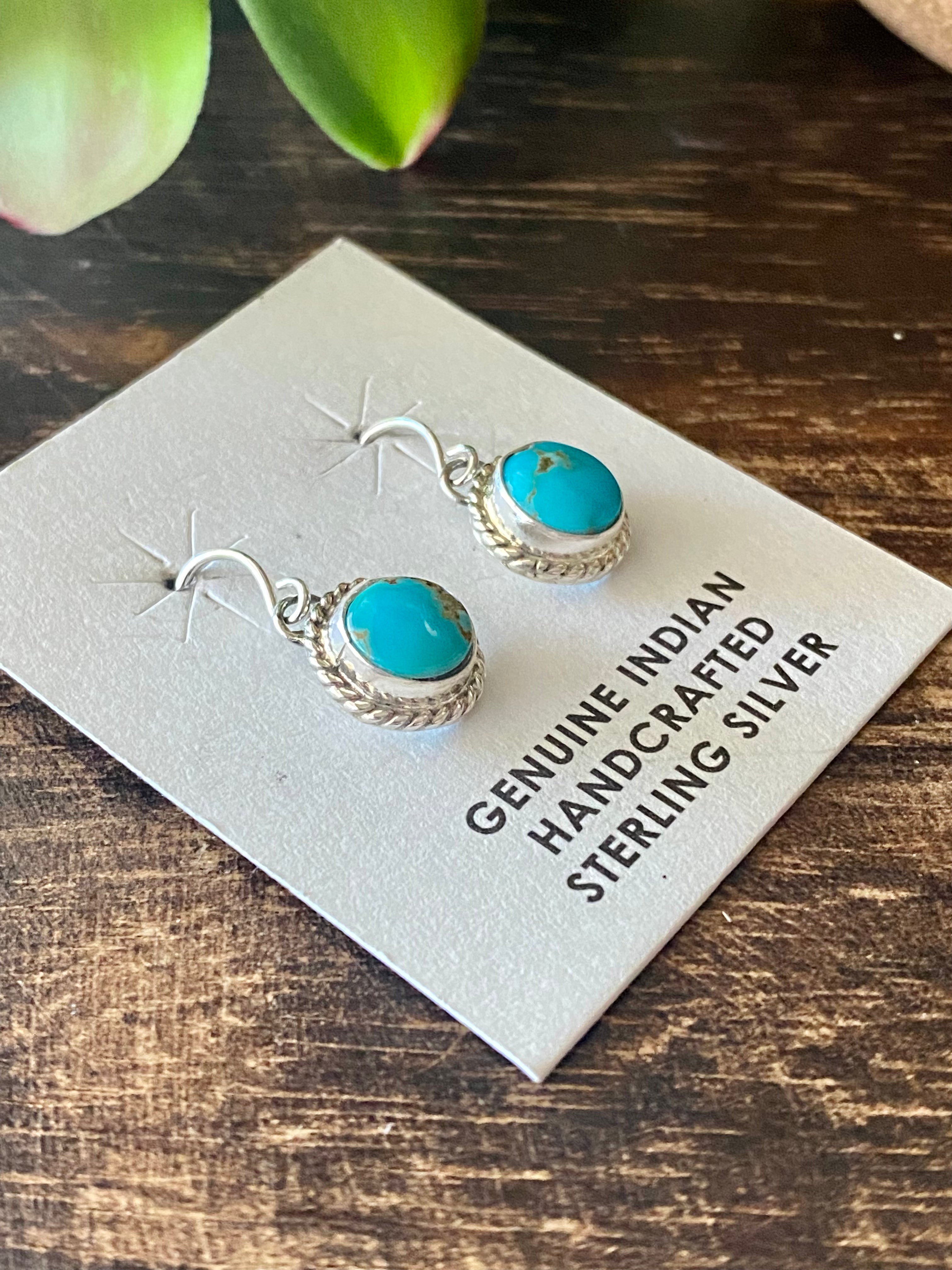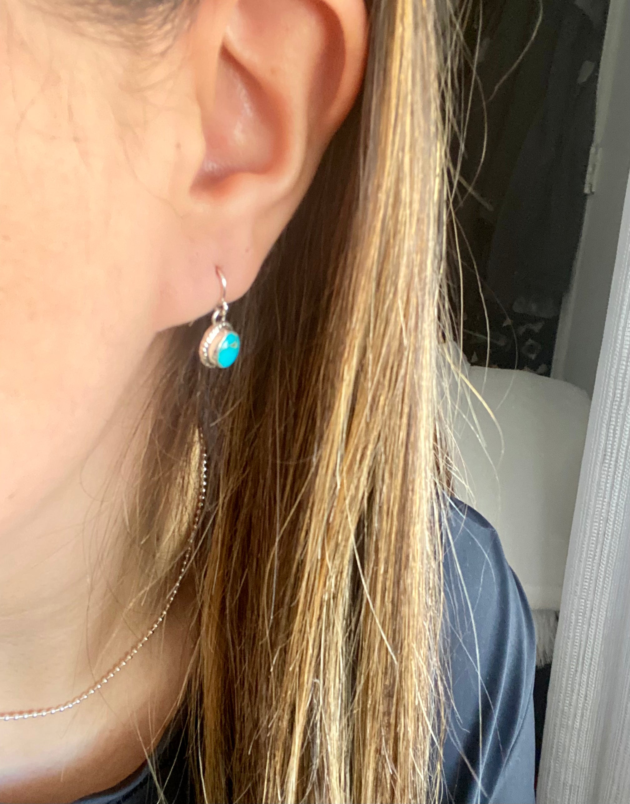 Jan Mariano Kingman Turquoise & Sterling Silver Dangle Earrings. They measure just over 3/4 of an inch long and just over 3/8 of an inch wide. Stamped sterling silver.