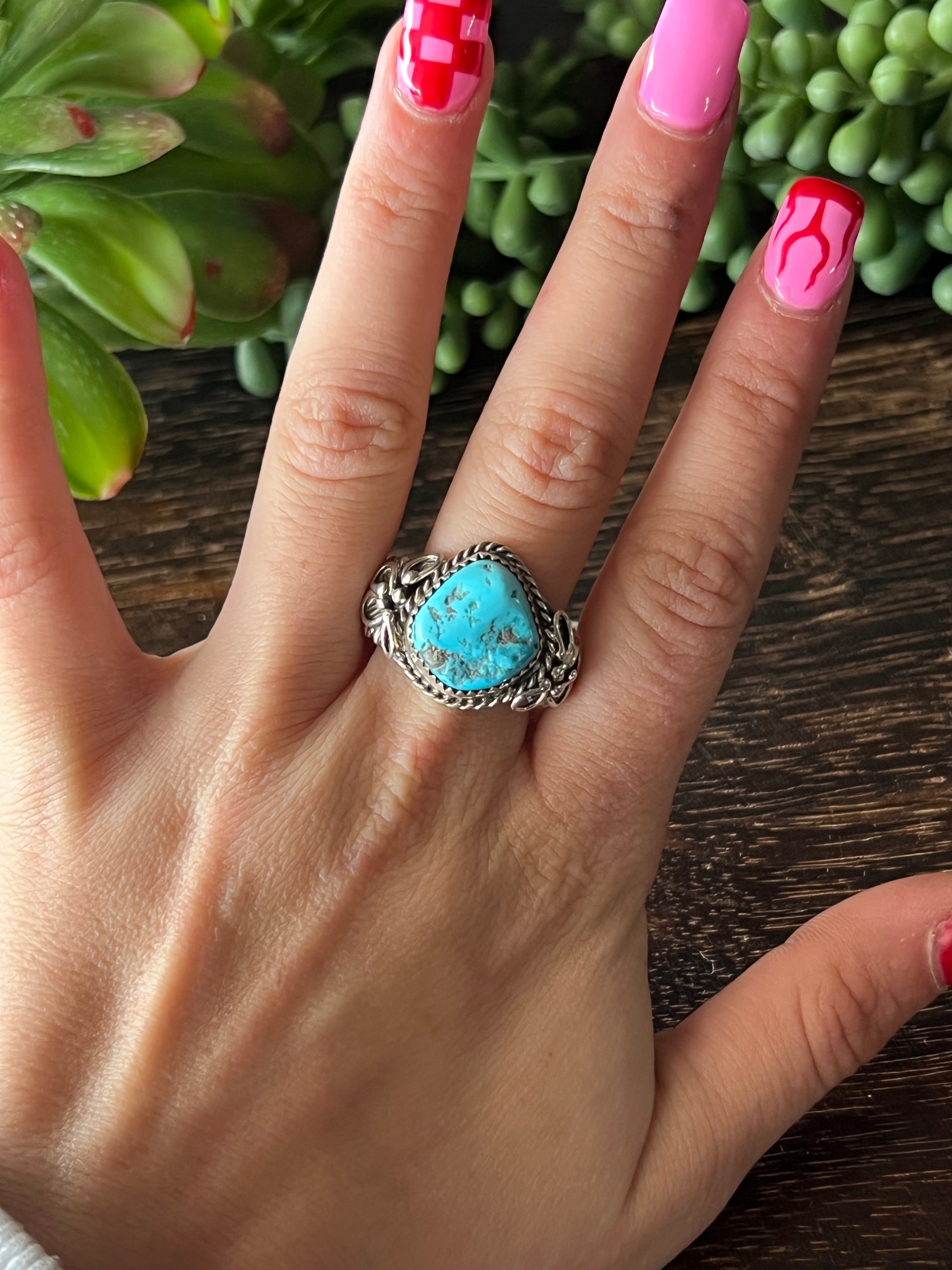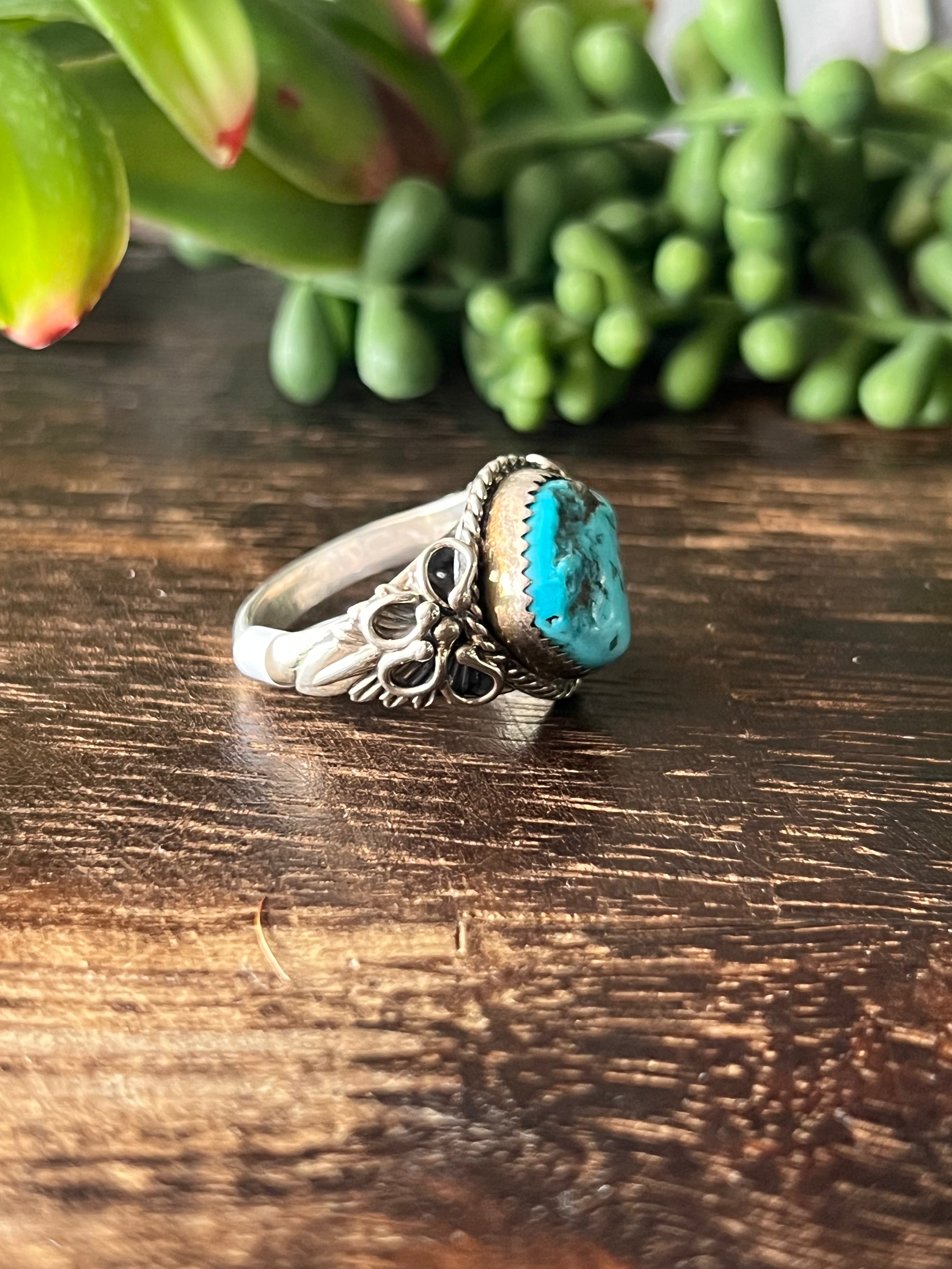 Jeannette Sanders Kingman Turquoise & Sterling Silver Ring Size 12. It measures 3/4 of an inch long and 7/8 of an inch wide. Signed by the artist and stamped sterling silver.
