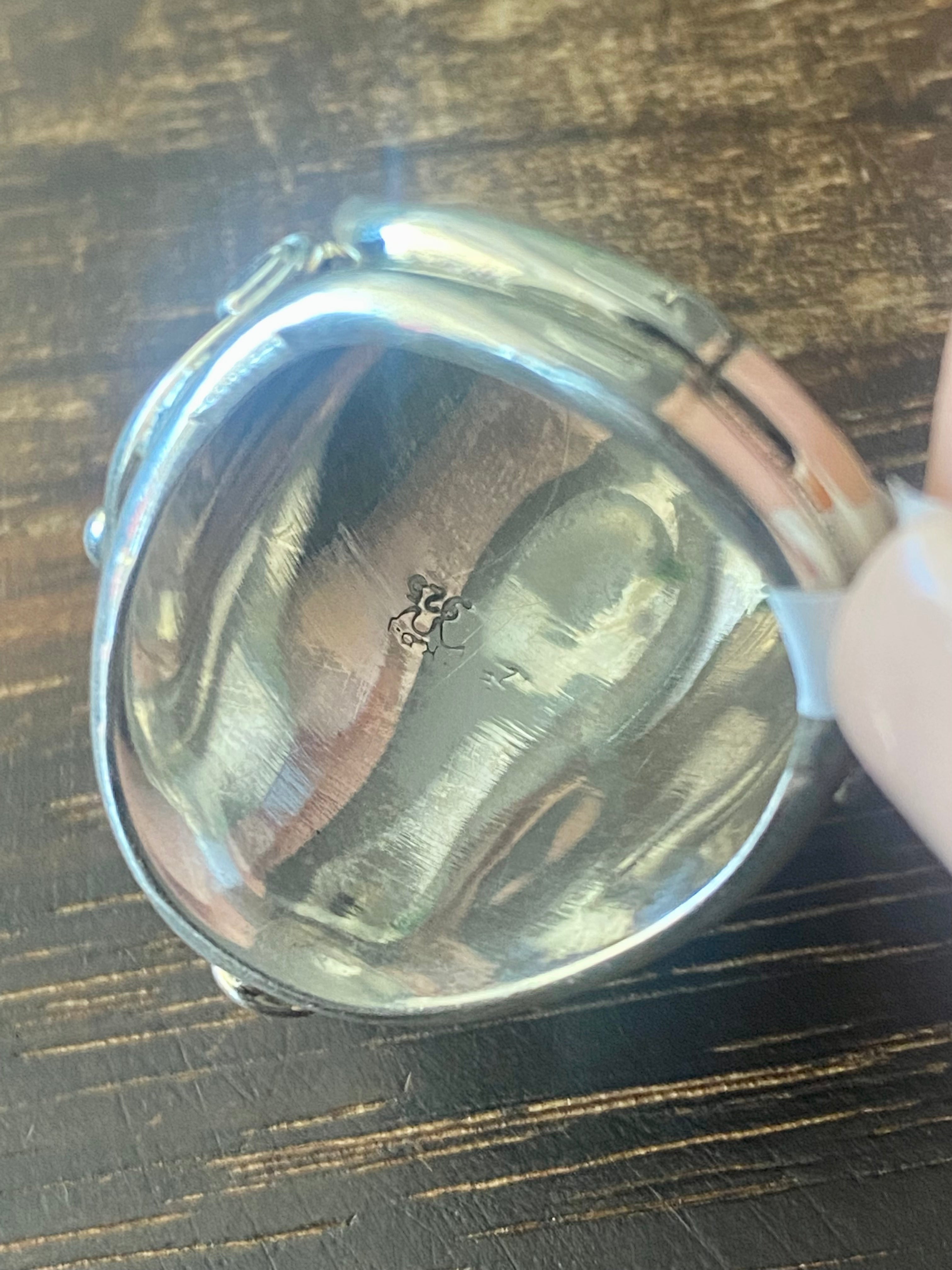 Jeannette Sanders Kingman Turquoise & Sterling Silver Ring Size 9.75. It measures 1 1/8 inches long and 3/4 of an inch wide. Signed by the artist and stamped sterling silver.