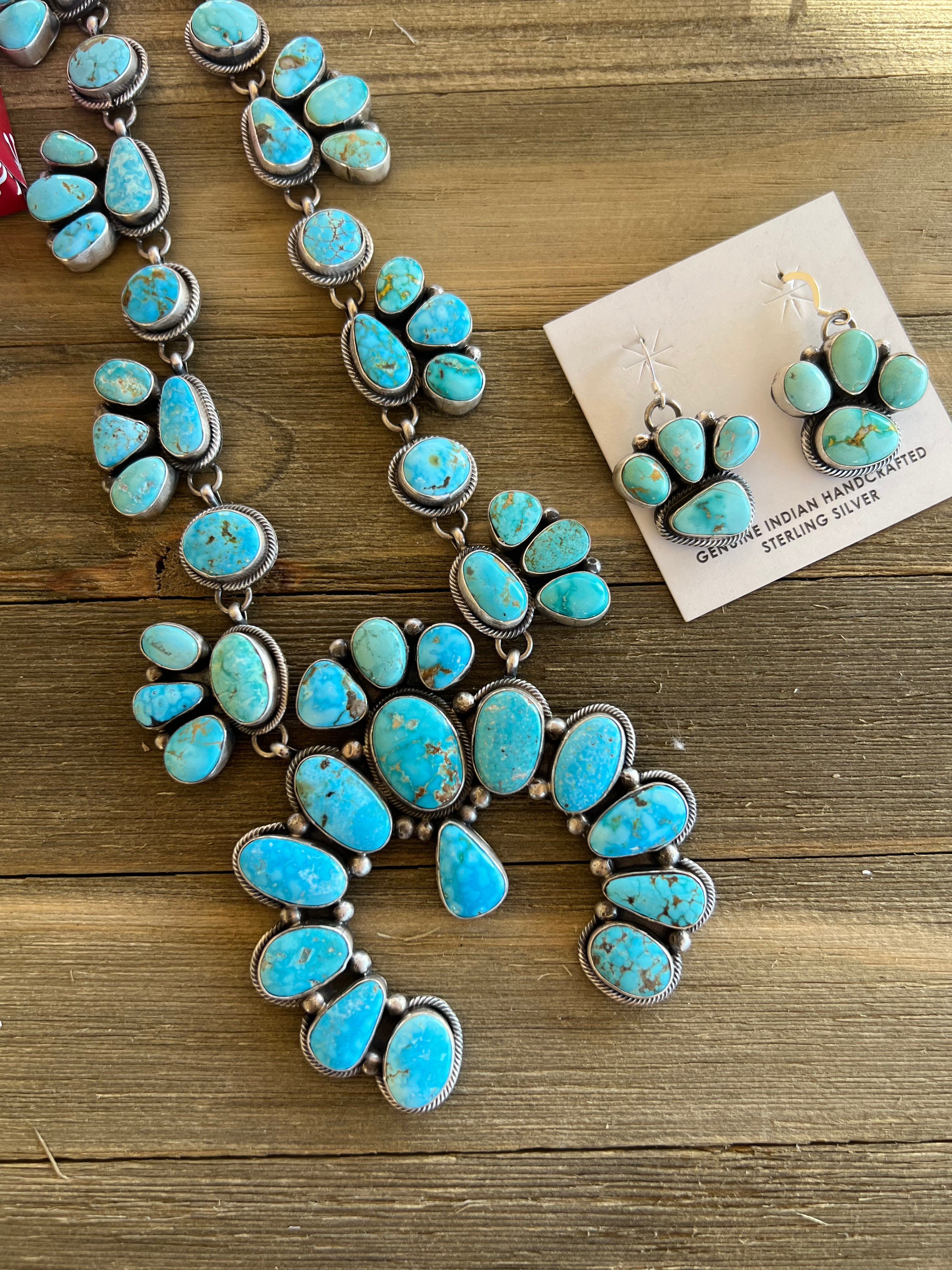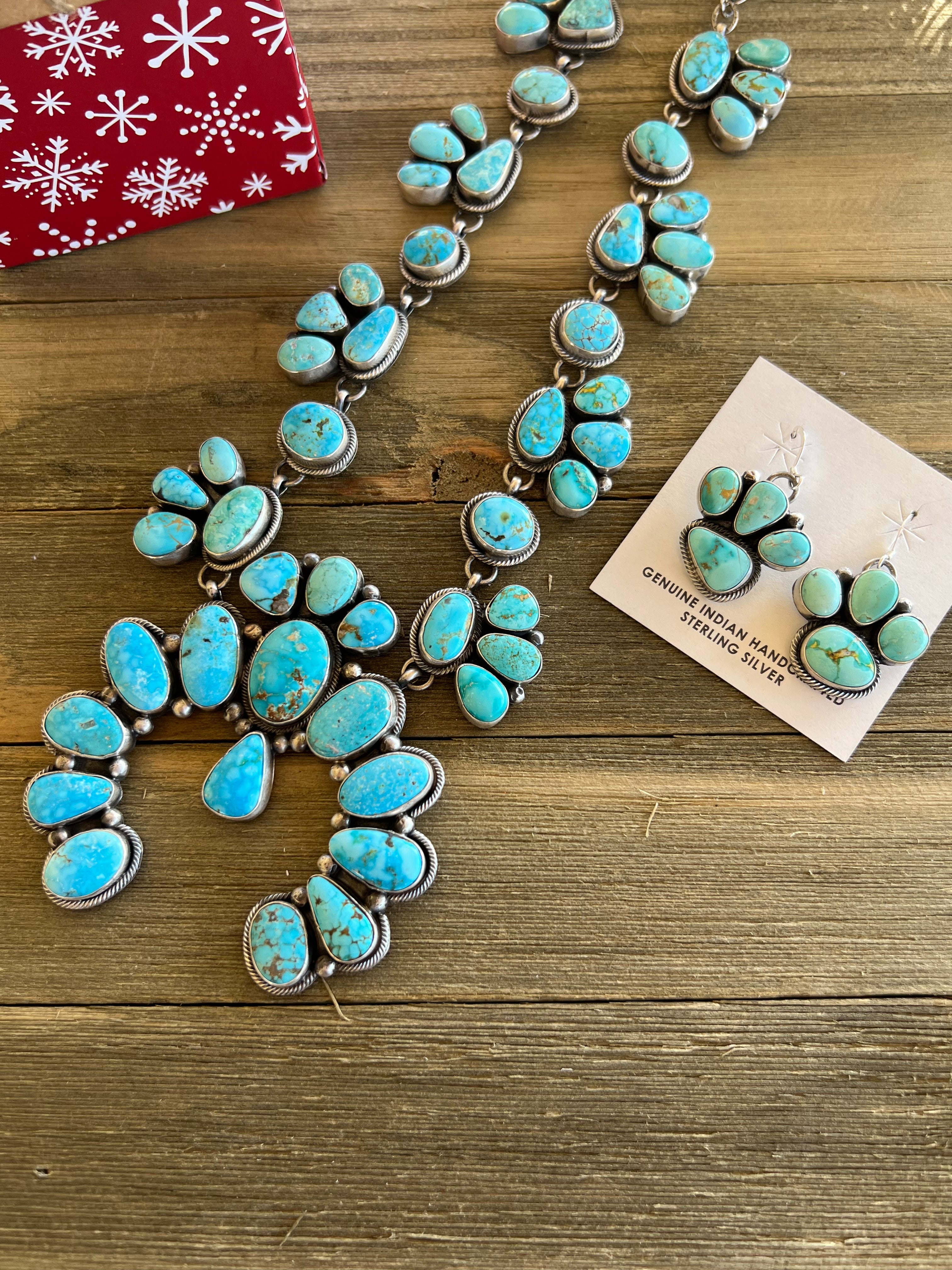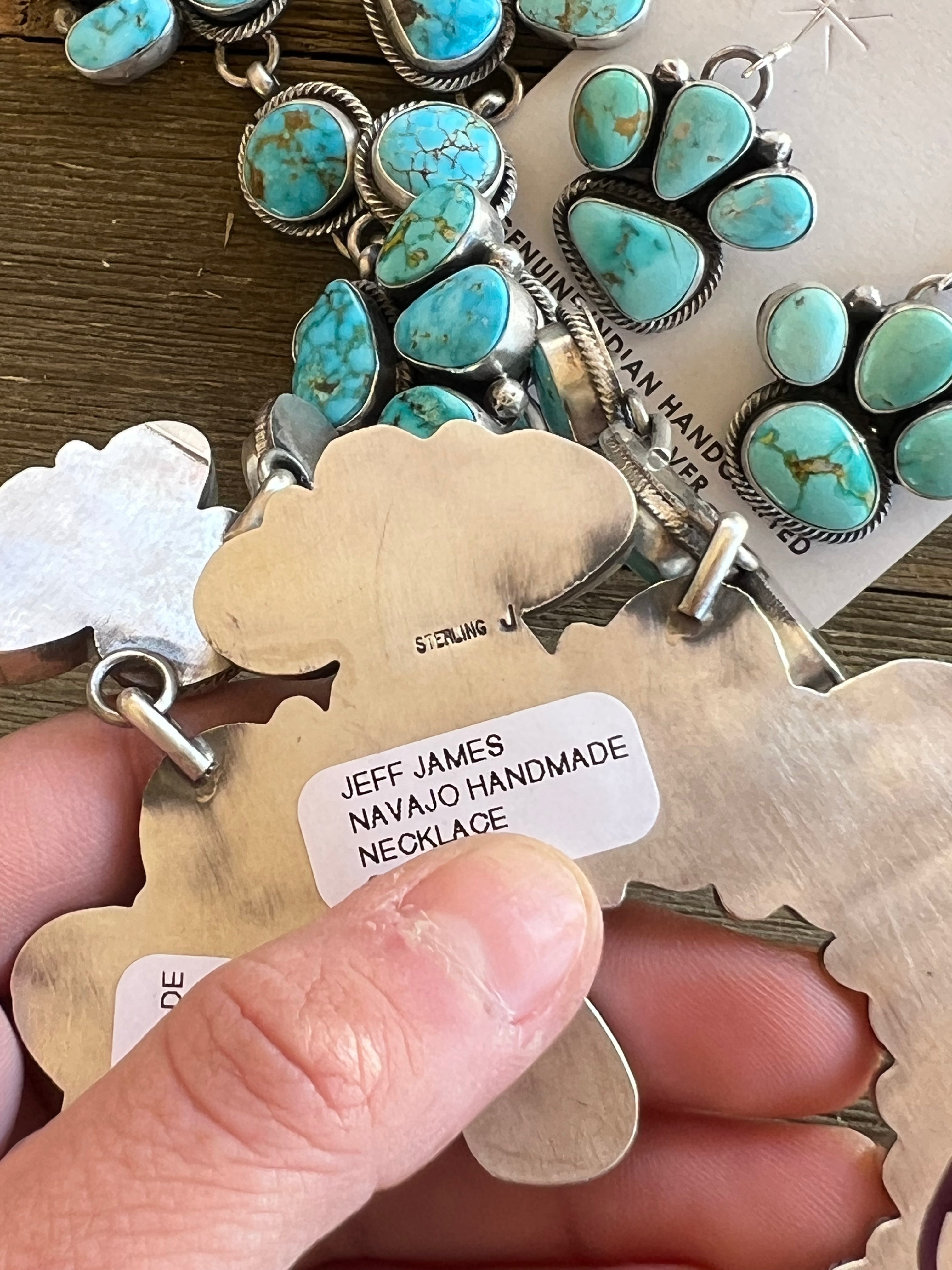 Jeff James Sonoran Gold & Sterling Silver Necklace Set. It measures 22 inches long with hang while earrings measure 1 5/8 inches long and just over 1 inch wide. Signed by the artist and stamped sterling silver.