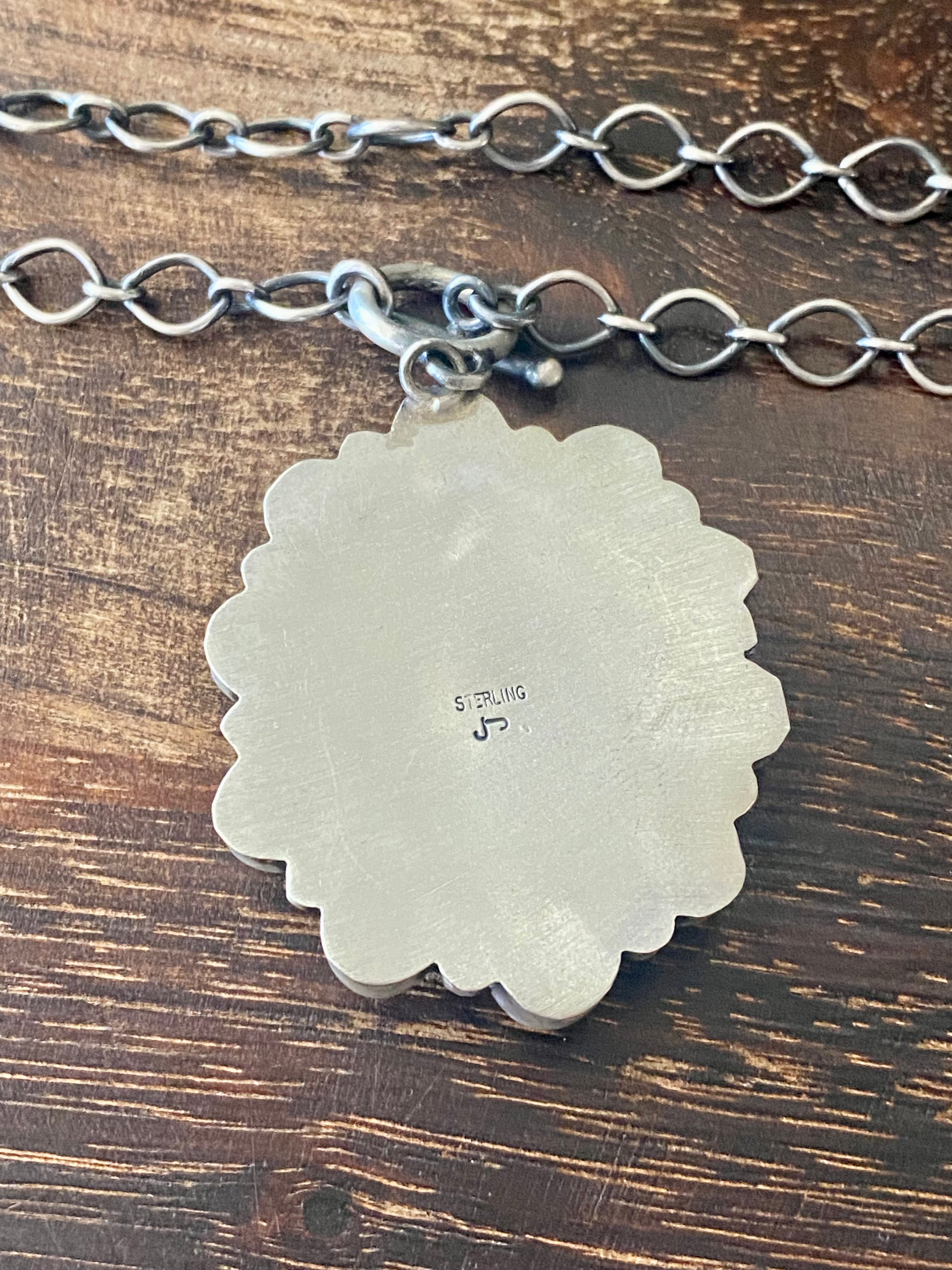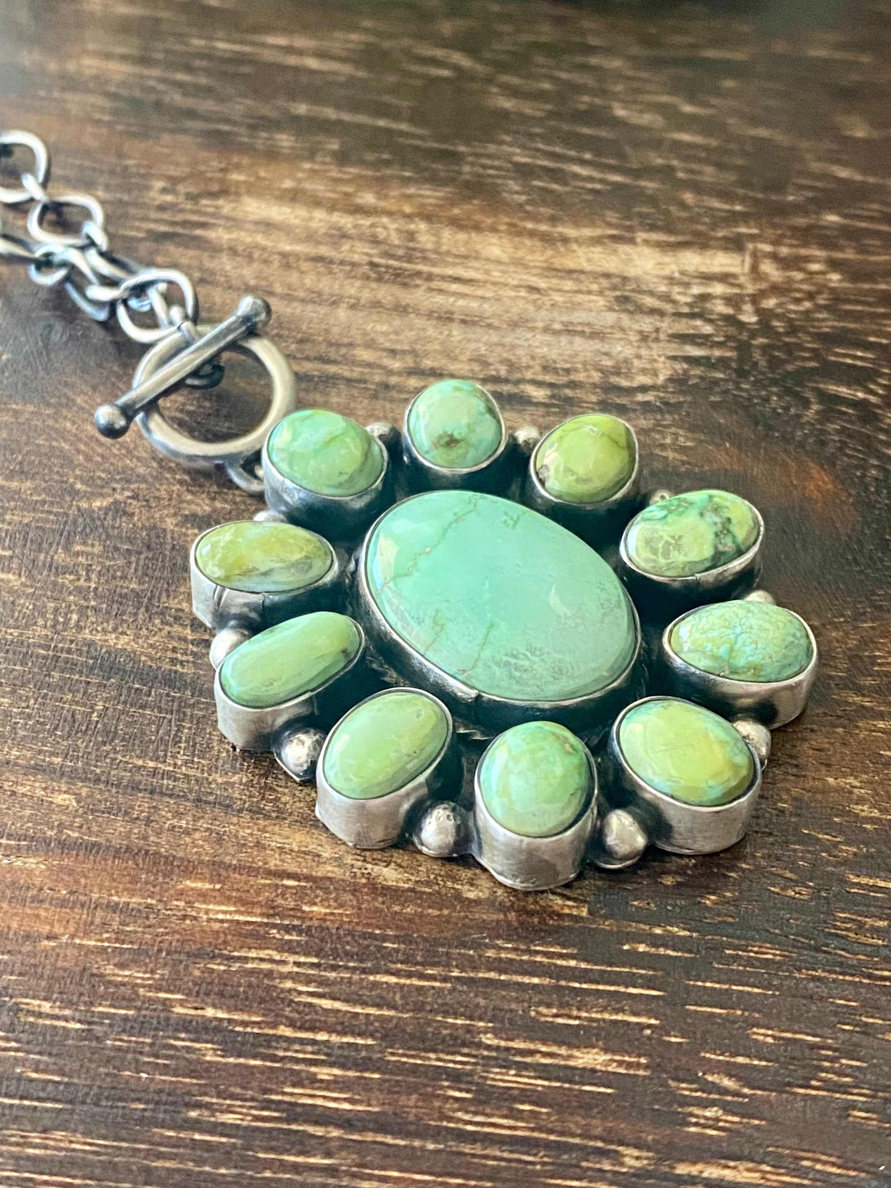 Jeff James Sonoran Gold Turquoise & Sterling Silver Cluster Necklace. It measures 29 inches long with hang while chain measures 24 inches long. Signed by the artist and stamped sterling silver.