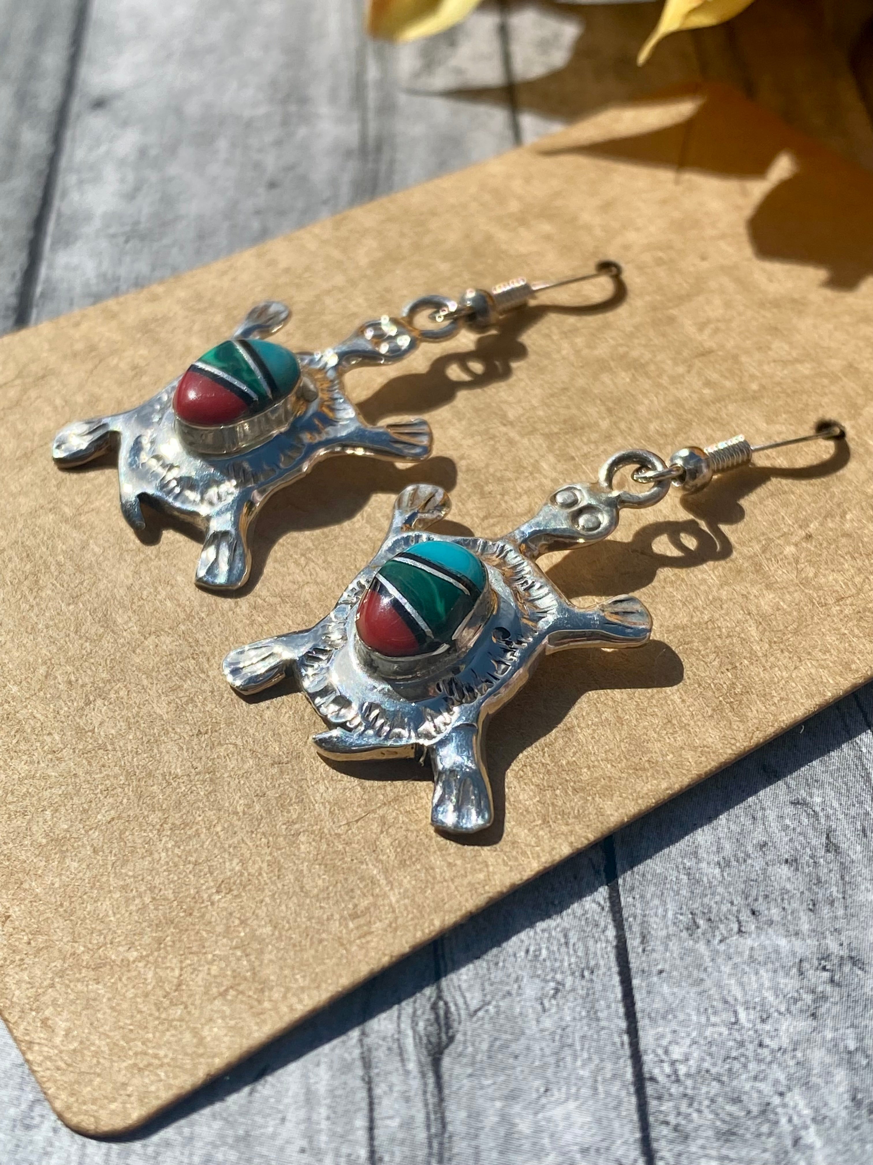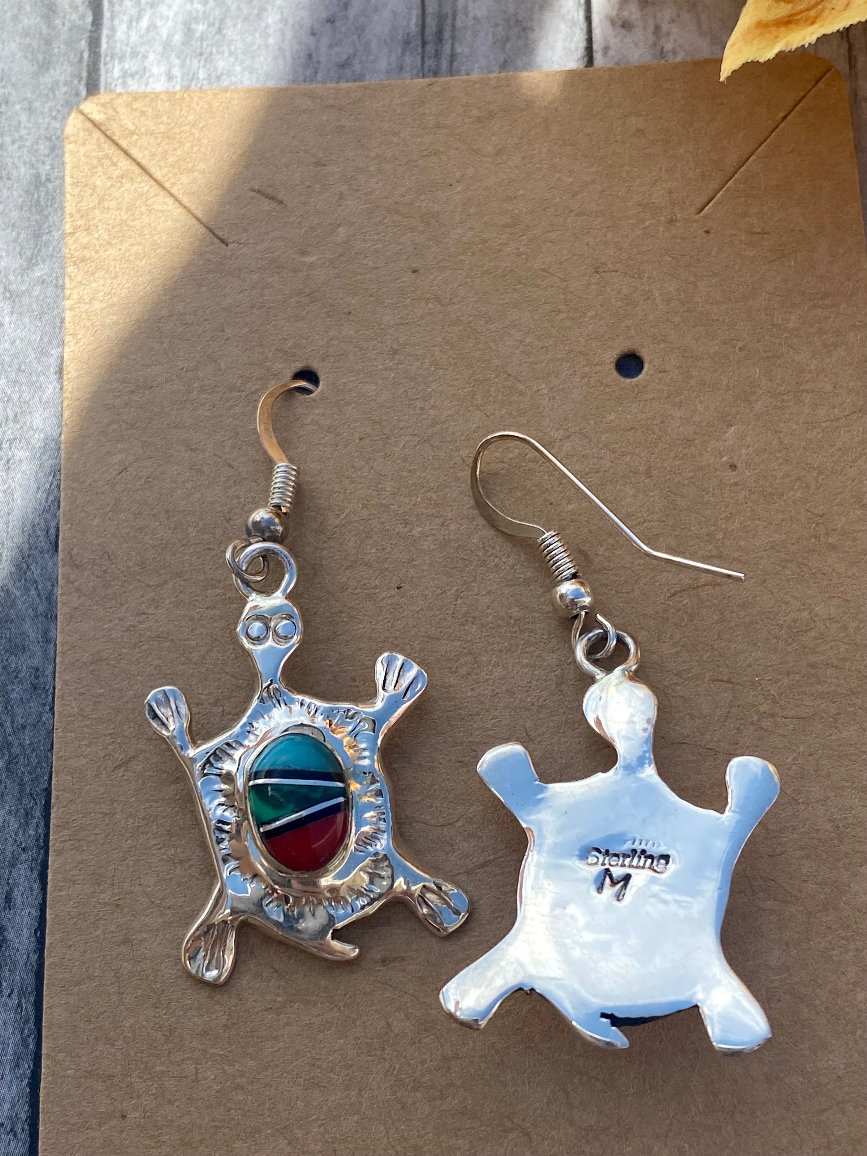 Joe Martinez Multi Stone & Sterling Silver Inlay Turtle Dangle Earrings