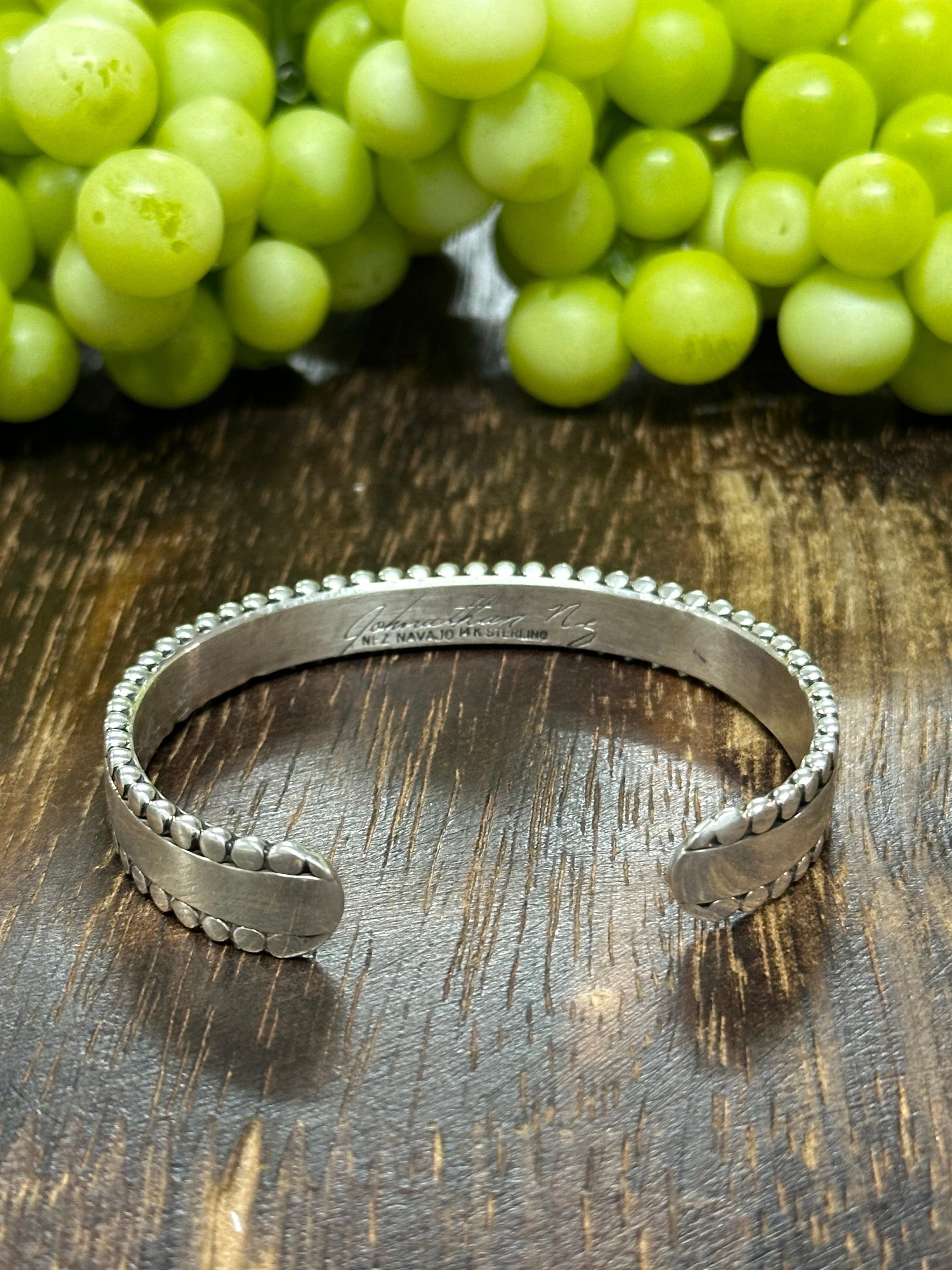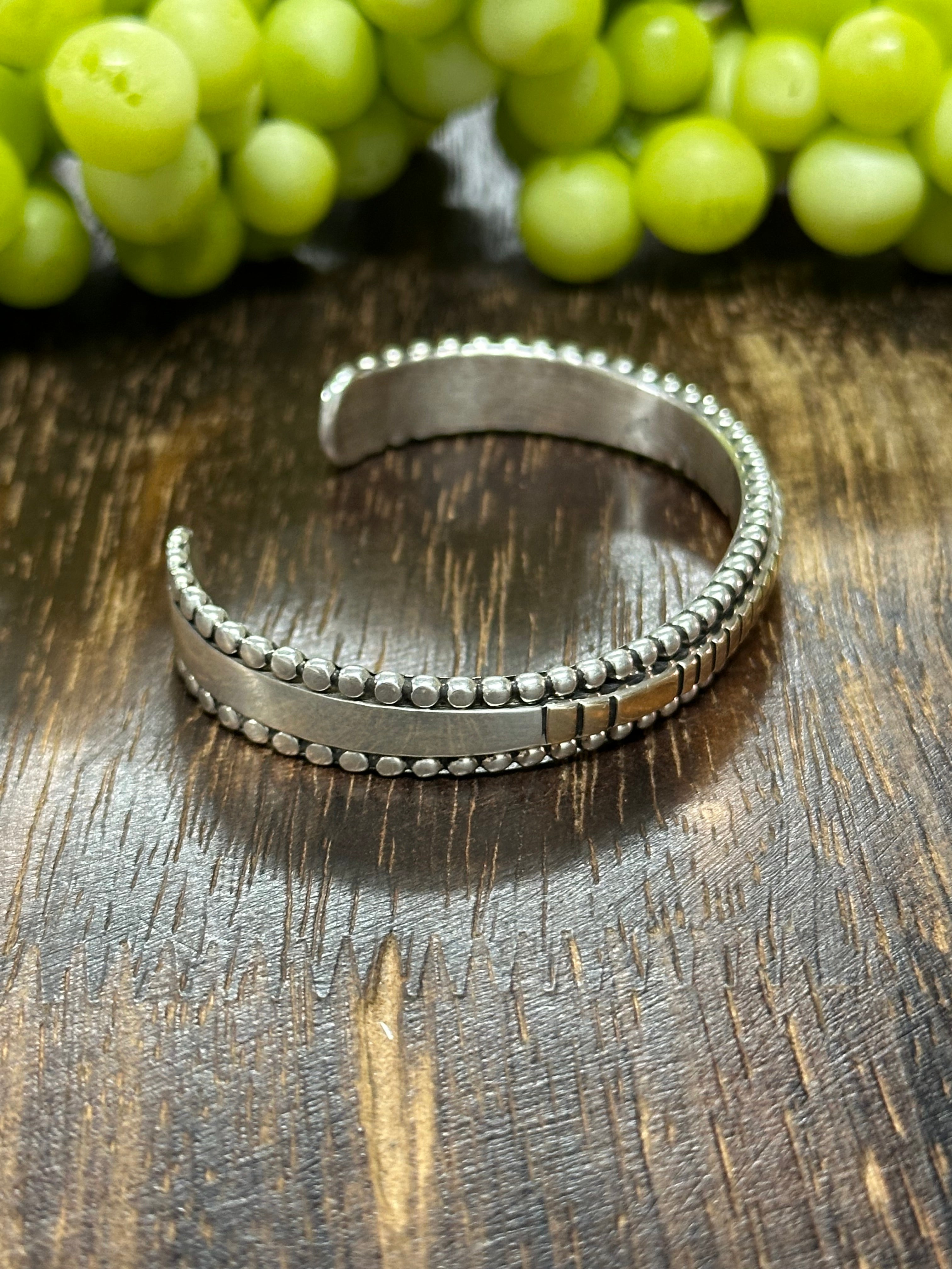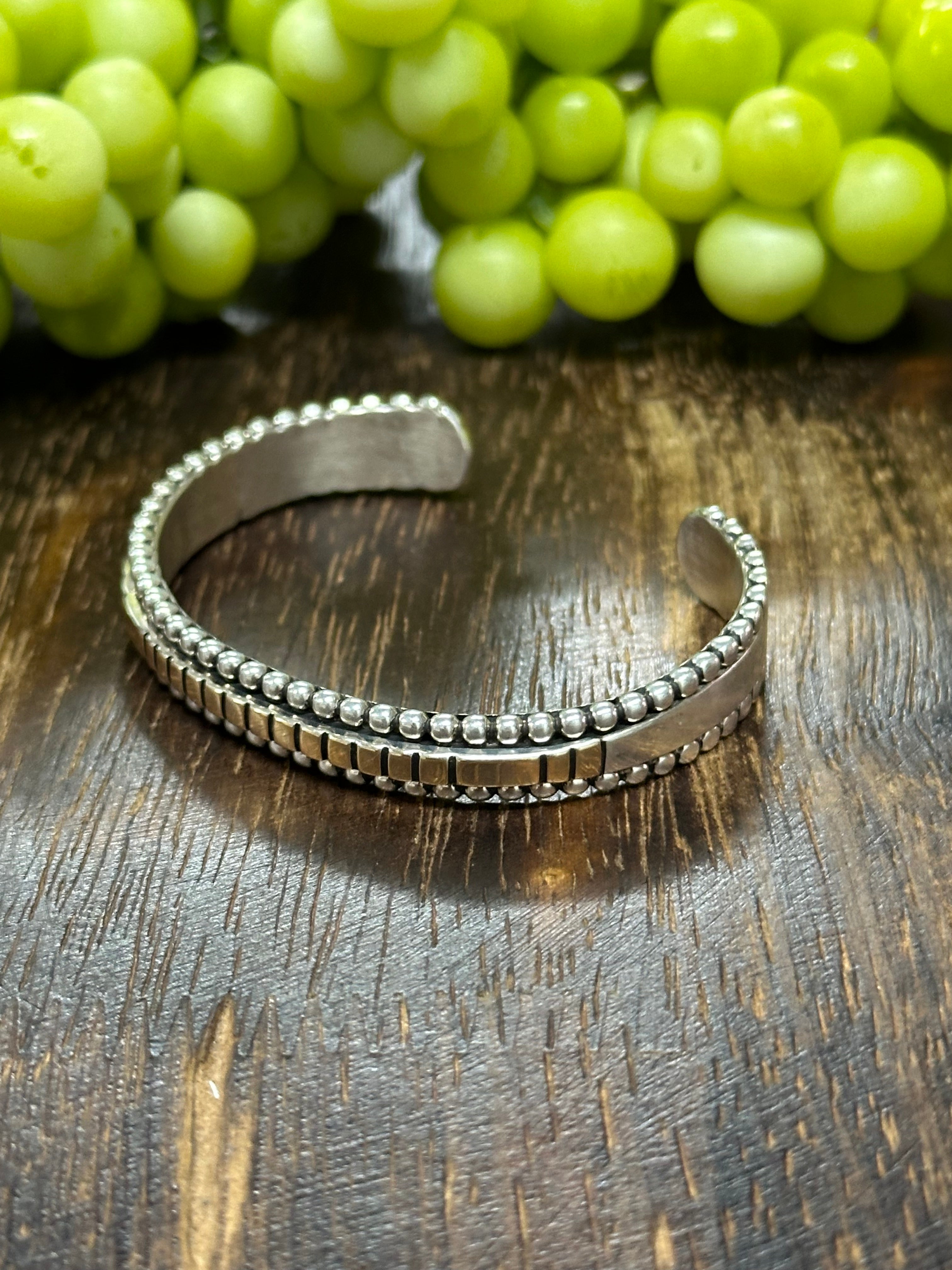 Jonathan Nez 14K Gold & Sterling Silver Cuff Bracelet. It measures 3/8 of an inch wide with an inside circumference of 5 1/8 inches and a gap of 1 inch. Signed by artist and stamped sterling silver.