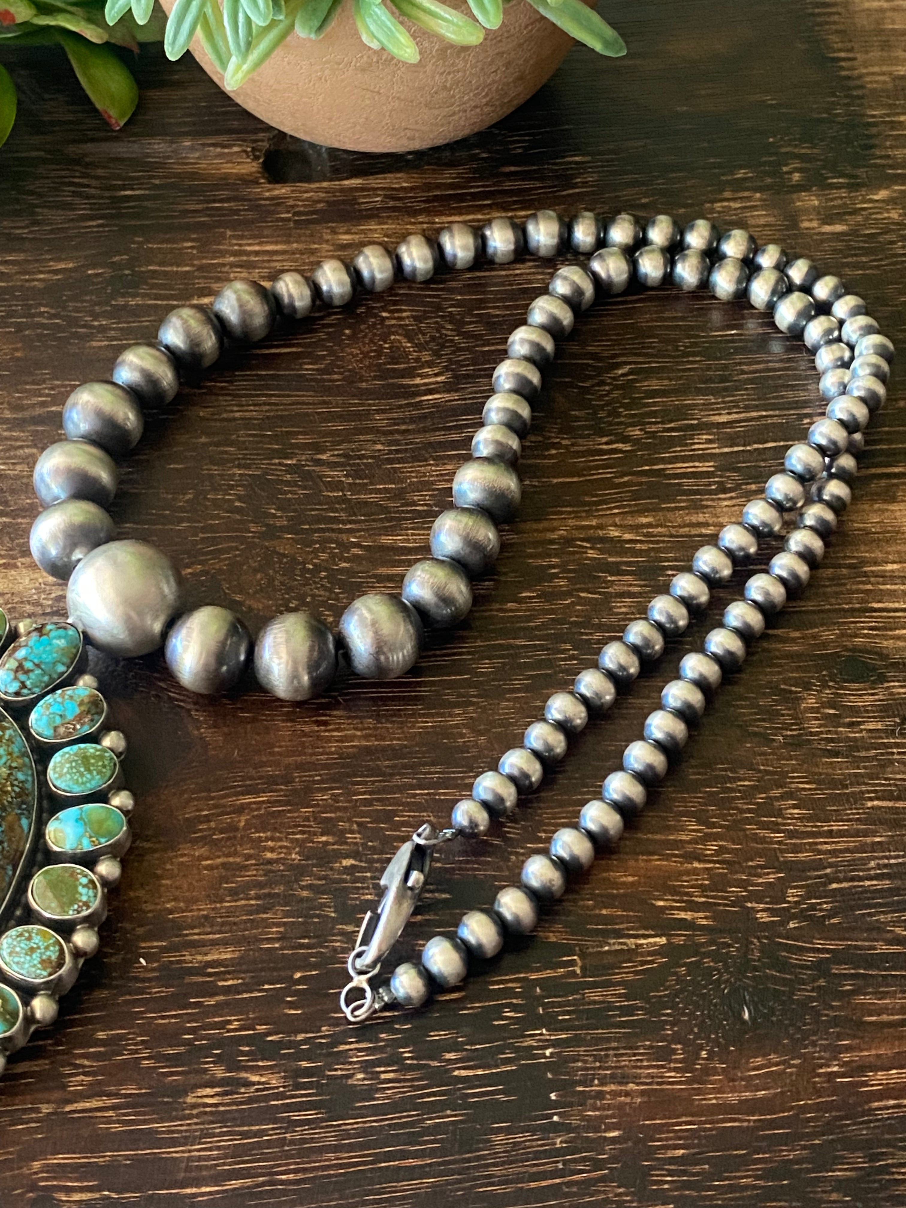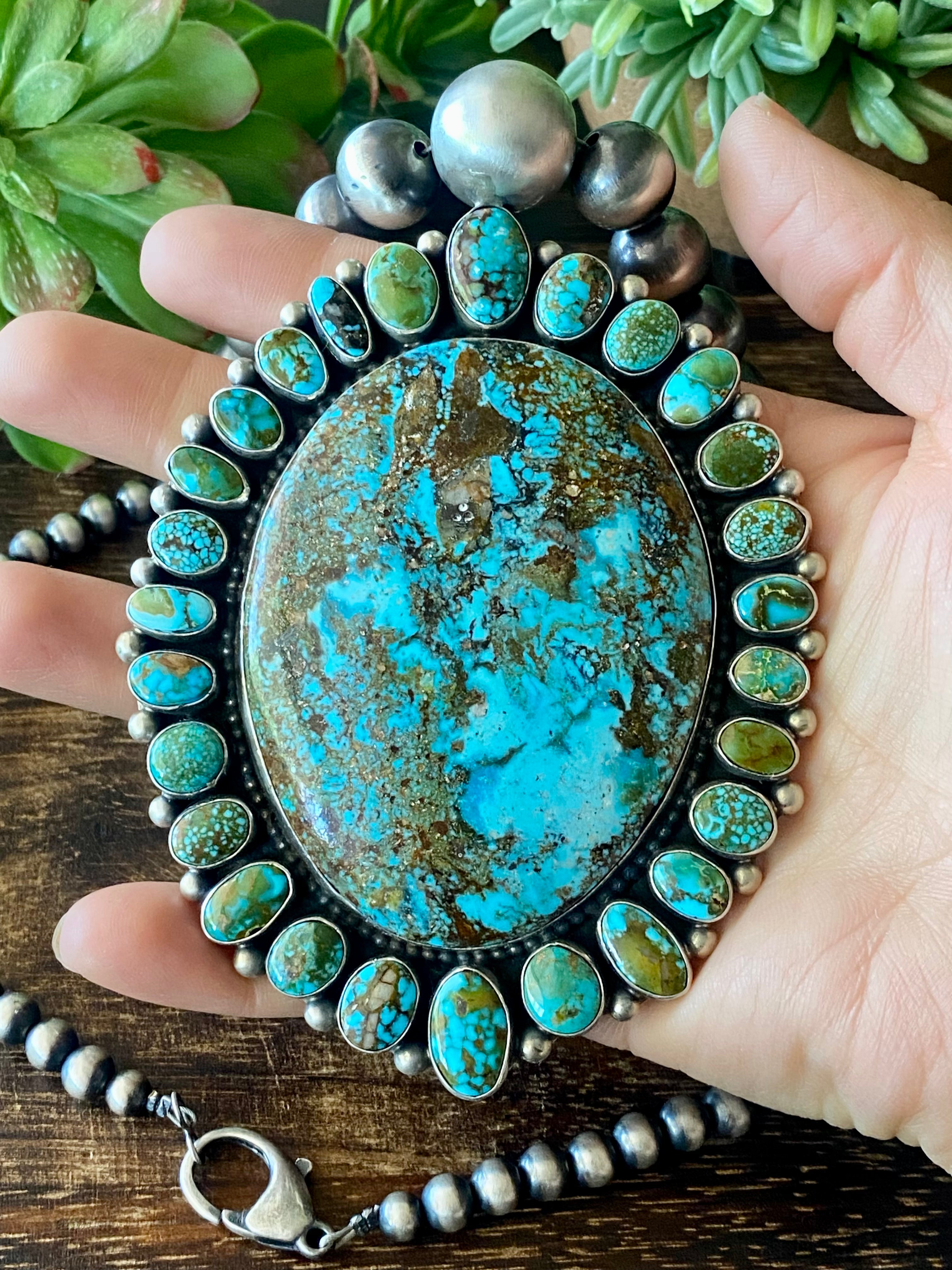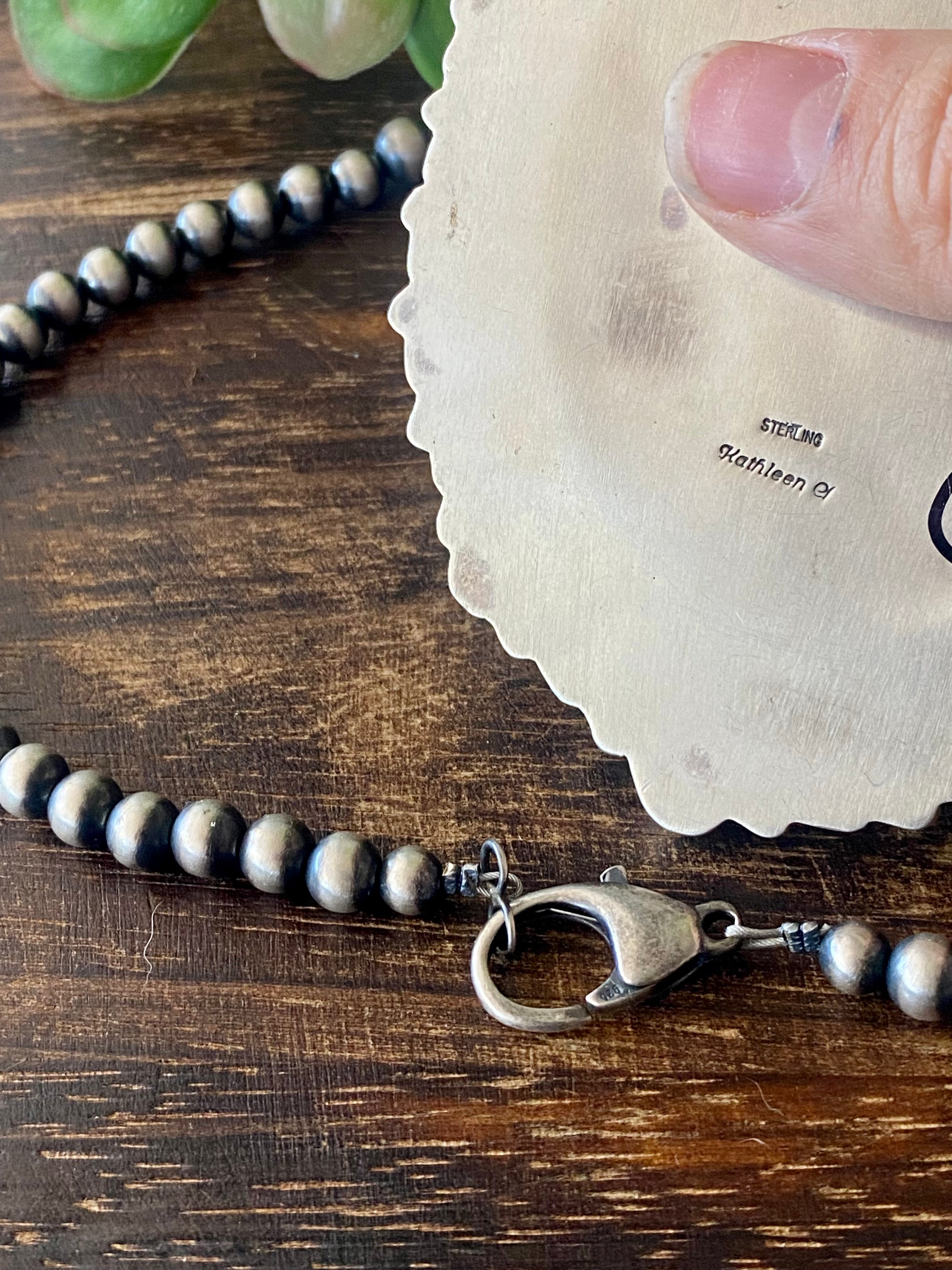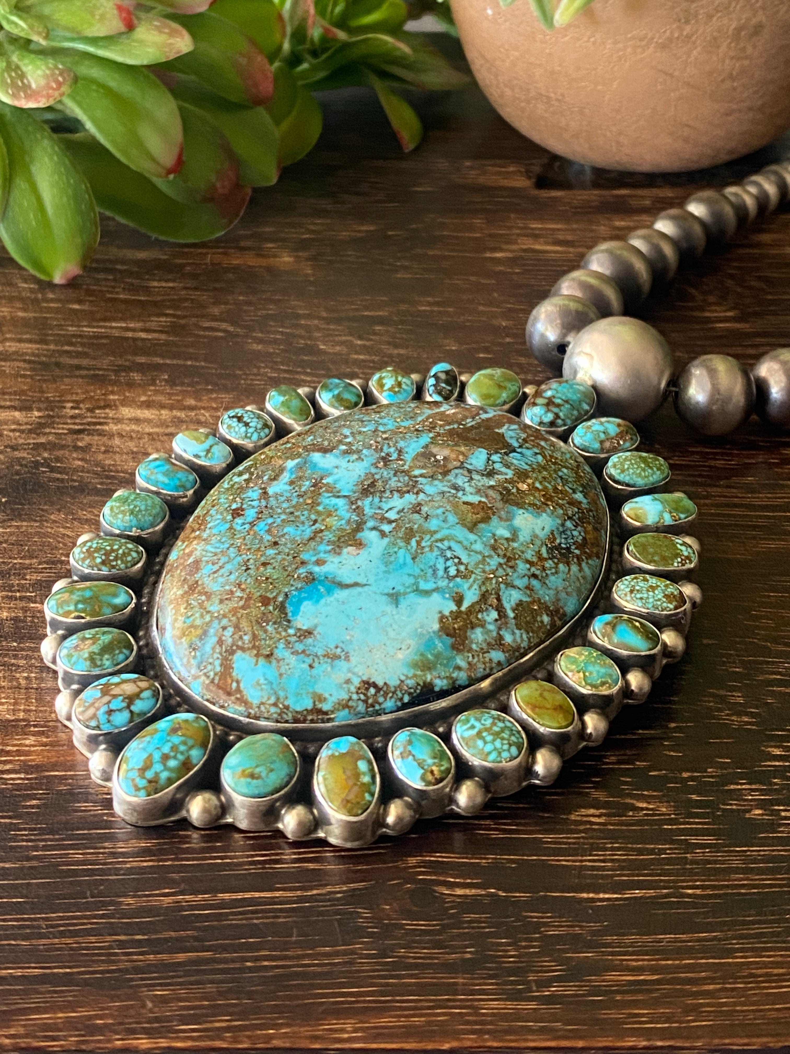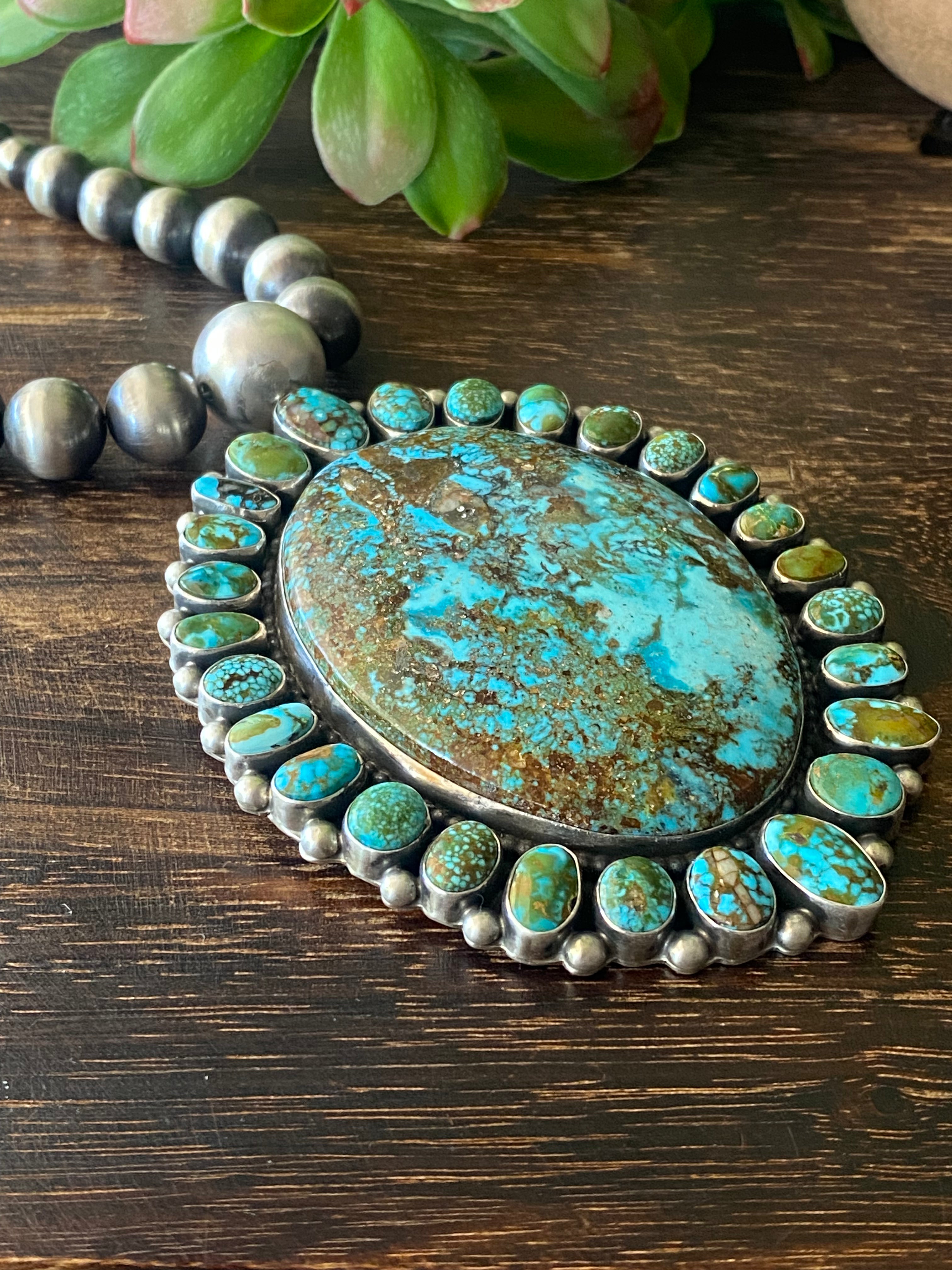Kathleen Chavez High Grade Kingman Turquoise & Sterling Silver Mega Necklace. The necklace measures 37 inches long with hang while the pearls by itself measures 28 inches long and the pendant by itself measures 4 3/8 inches long and 3 3/8 inches wide. Signed by the artist and stamped sterling silver.