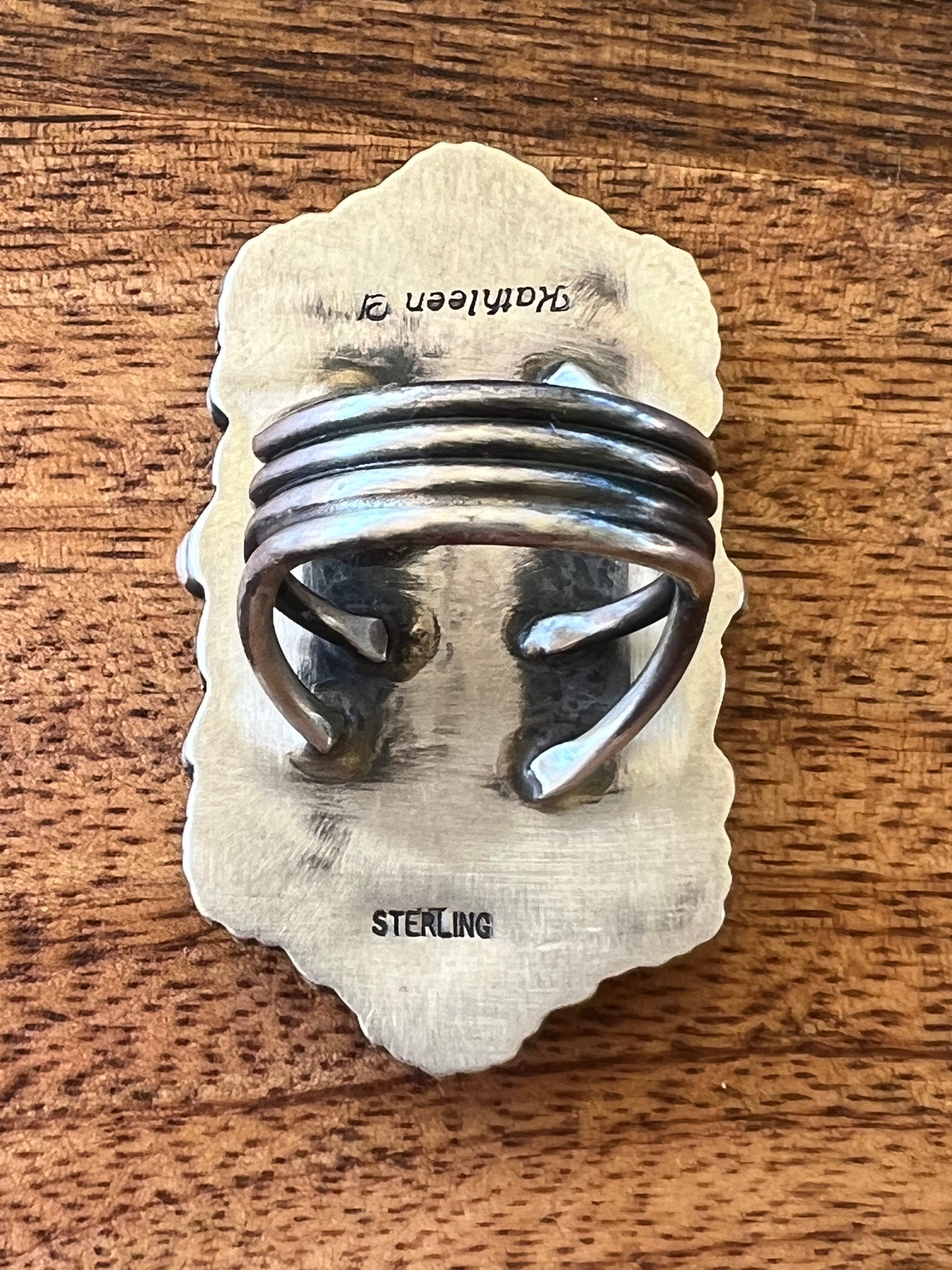 Kathleen Chavez Sonoran Gold Turquoise & Sterling Silver Ring Size 6. It measures 1 3/4 inches long and 1 inch wide. Signed by the artist and stamped sterling silver.