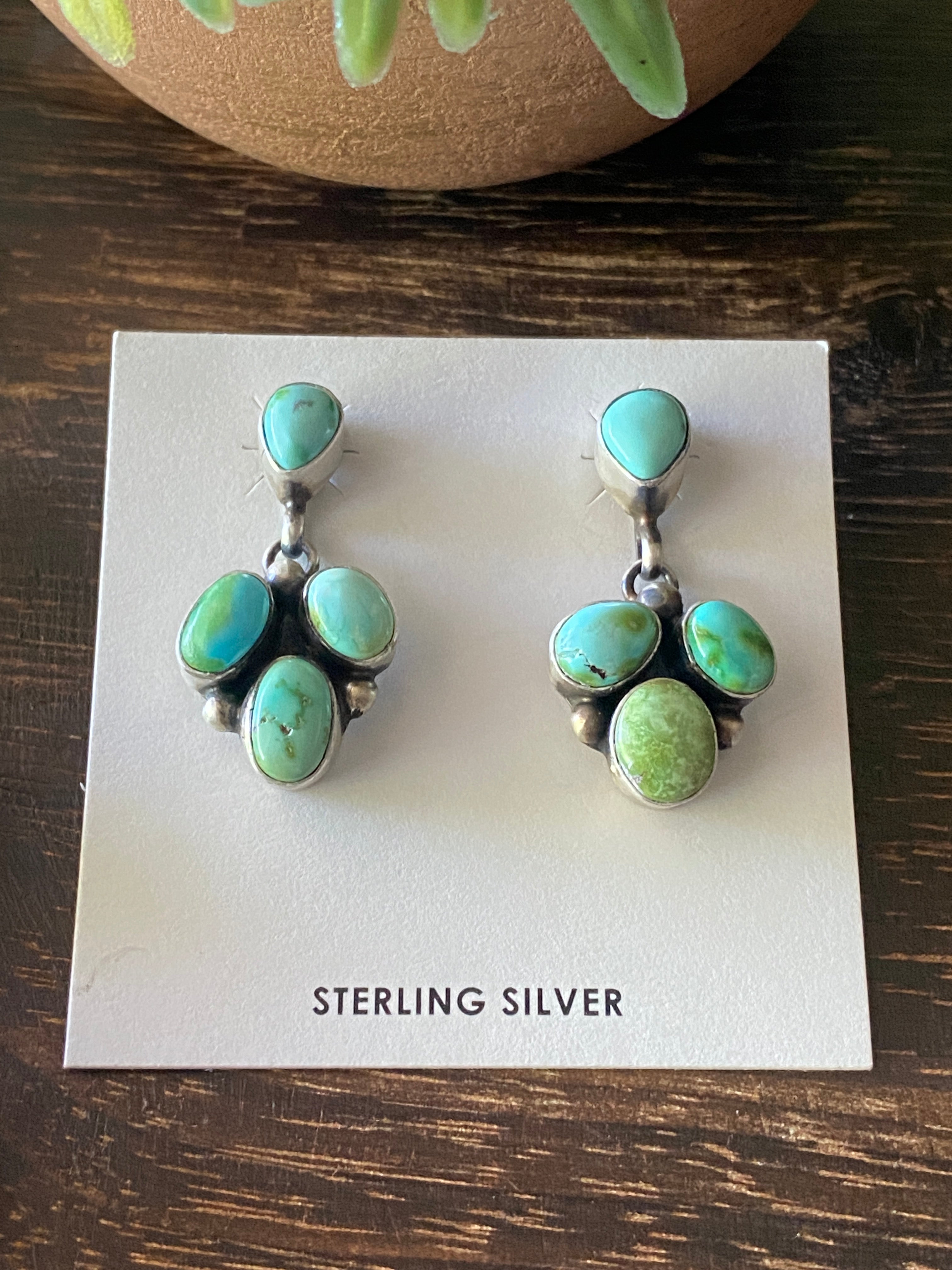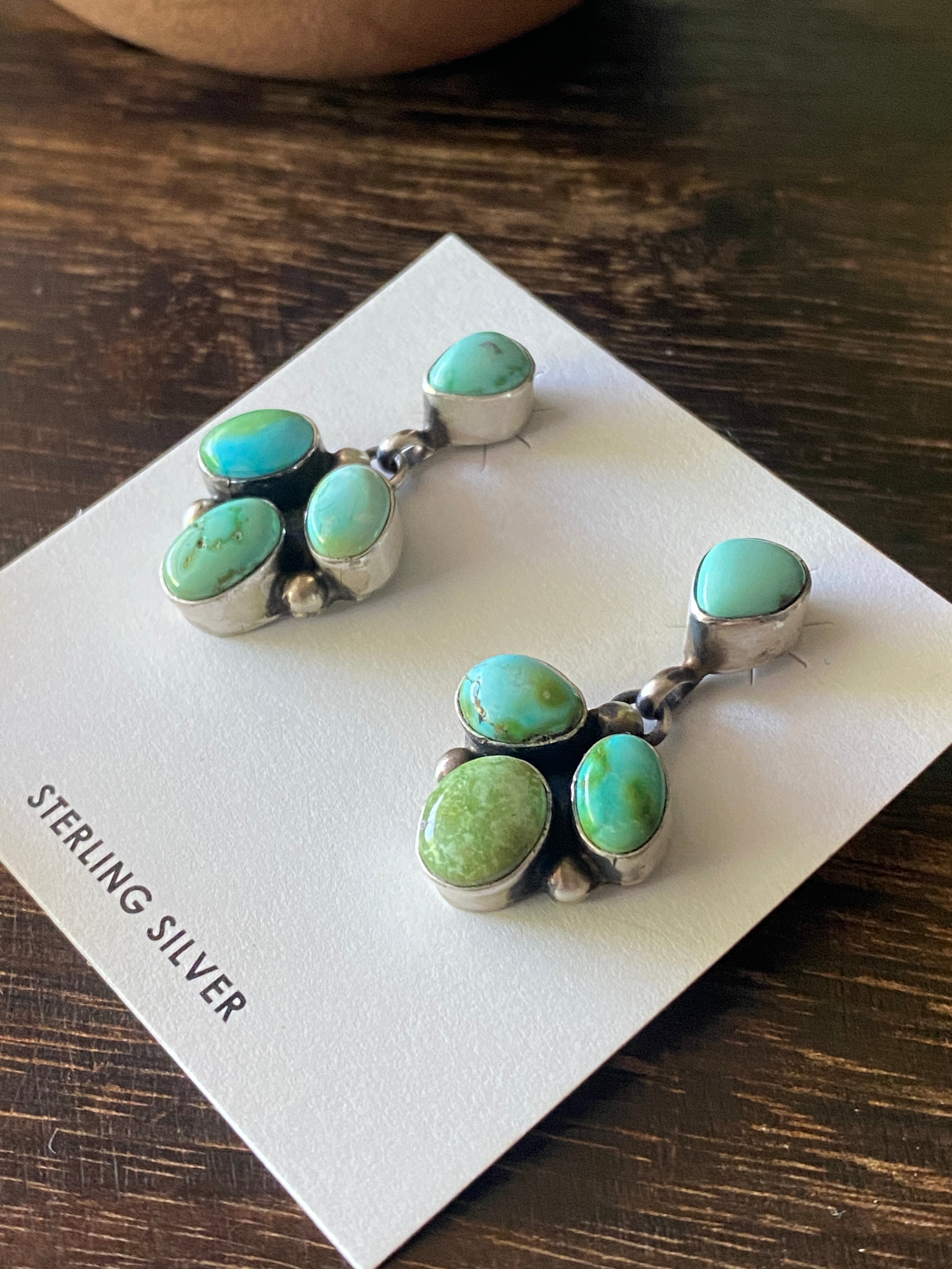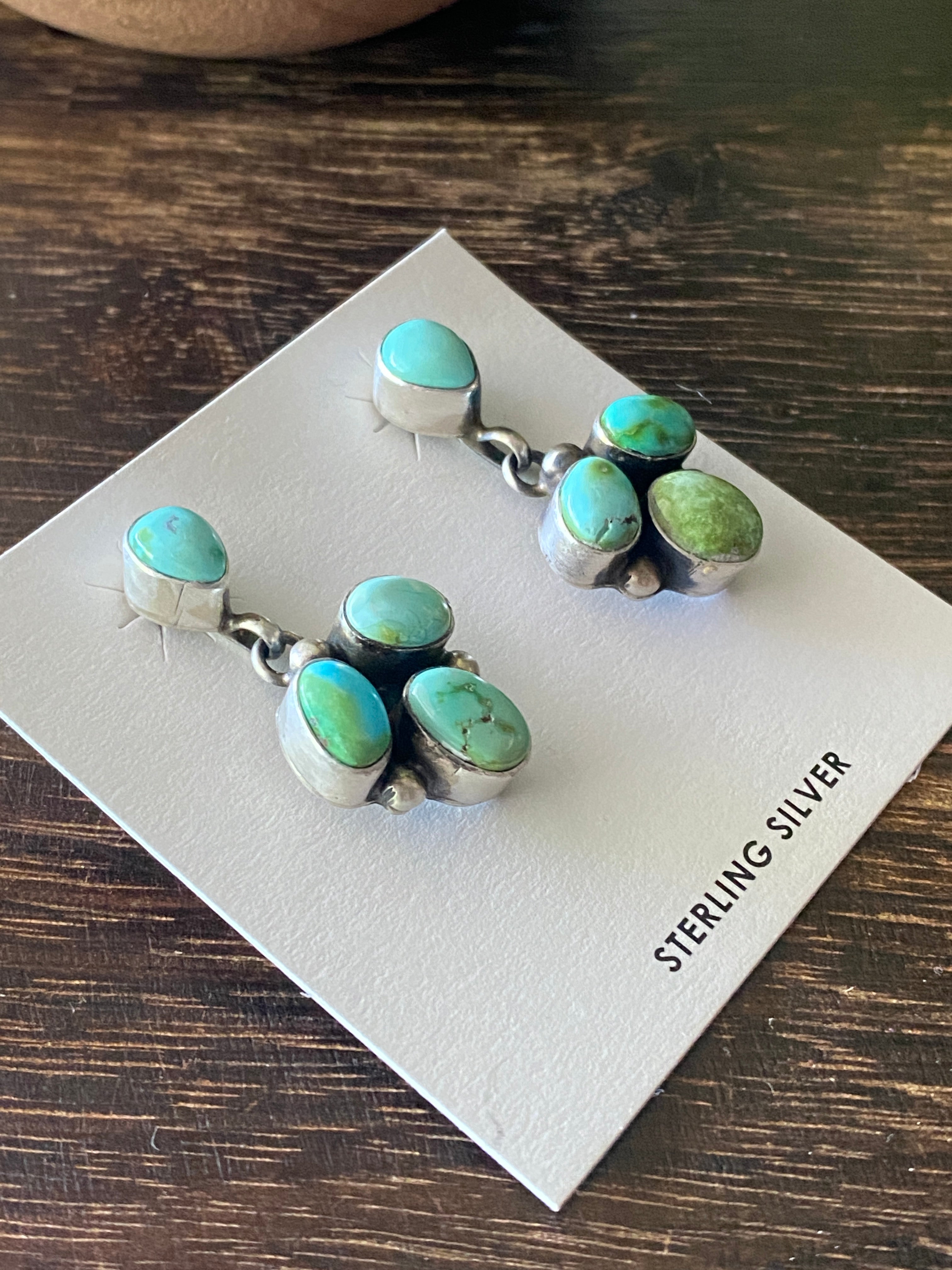 Kathleen Chavez Sonoran Gold Turquoise & Sterling Silver Squash Blossom Necklace Set. The necklace measures 30 inches long with hang while the earrings measure 1 3/8 inches long and just over 5/8 of an inch wide. Signed by the artist and stamped sterling silver.
