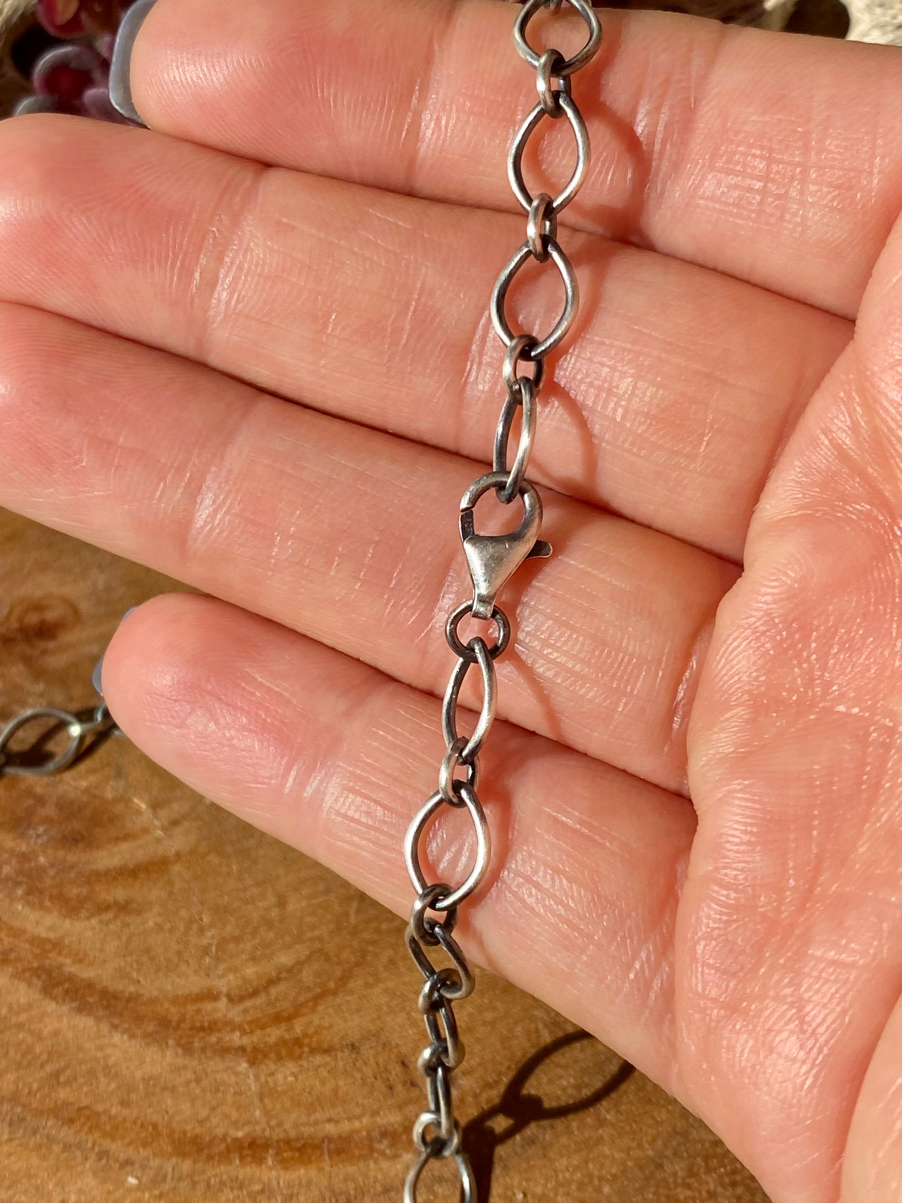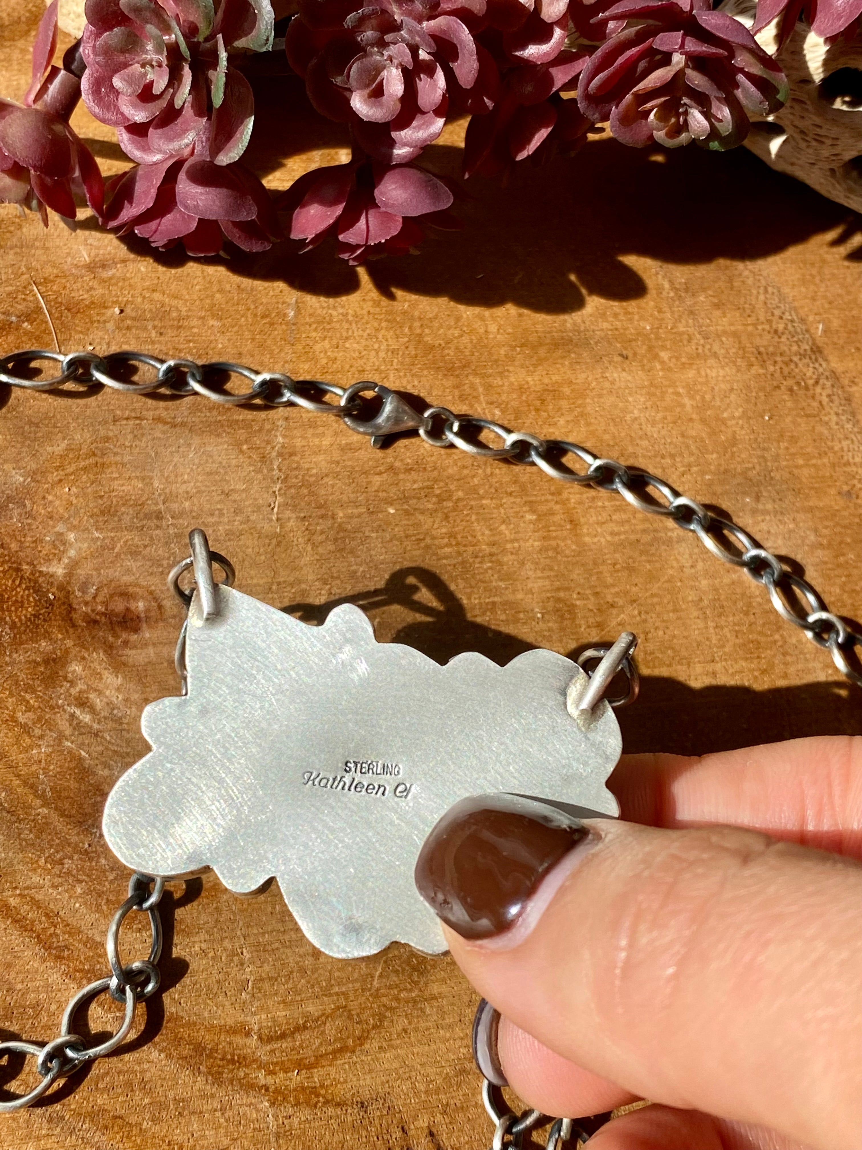 Kathleen Chavez Sonoran Mountain Turquoise & Sterling Silver Bar Necklace. The necklace measures around 21 inches long with hang while the chain by itself measures 18 inches long. Signed by the artist and stamped sterling silver.