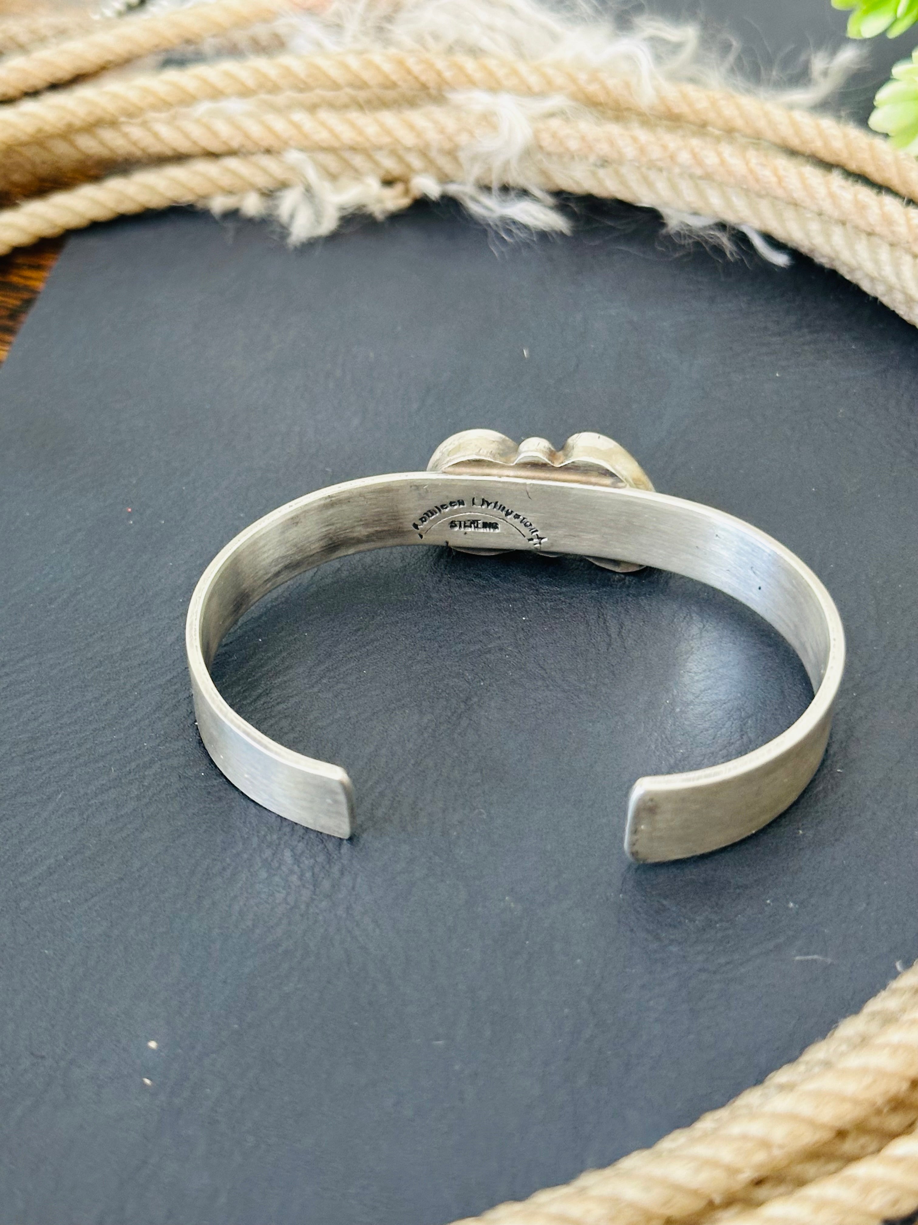 Kathleen Livingston Sonoran Mountain Turquoise & Sterling Silver Cuff Bracelet. It measures 3/8 of an inch wide with an inside circumference of 5 5/8 inches and a gap of 1 inch. Signed by artist and stamped sterling silver.