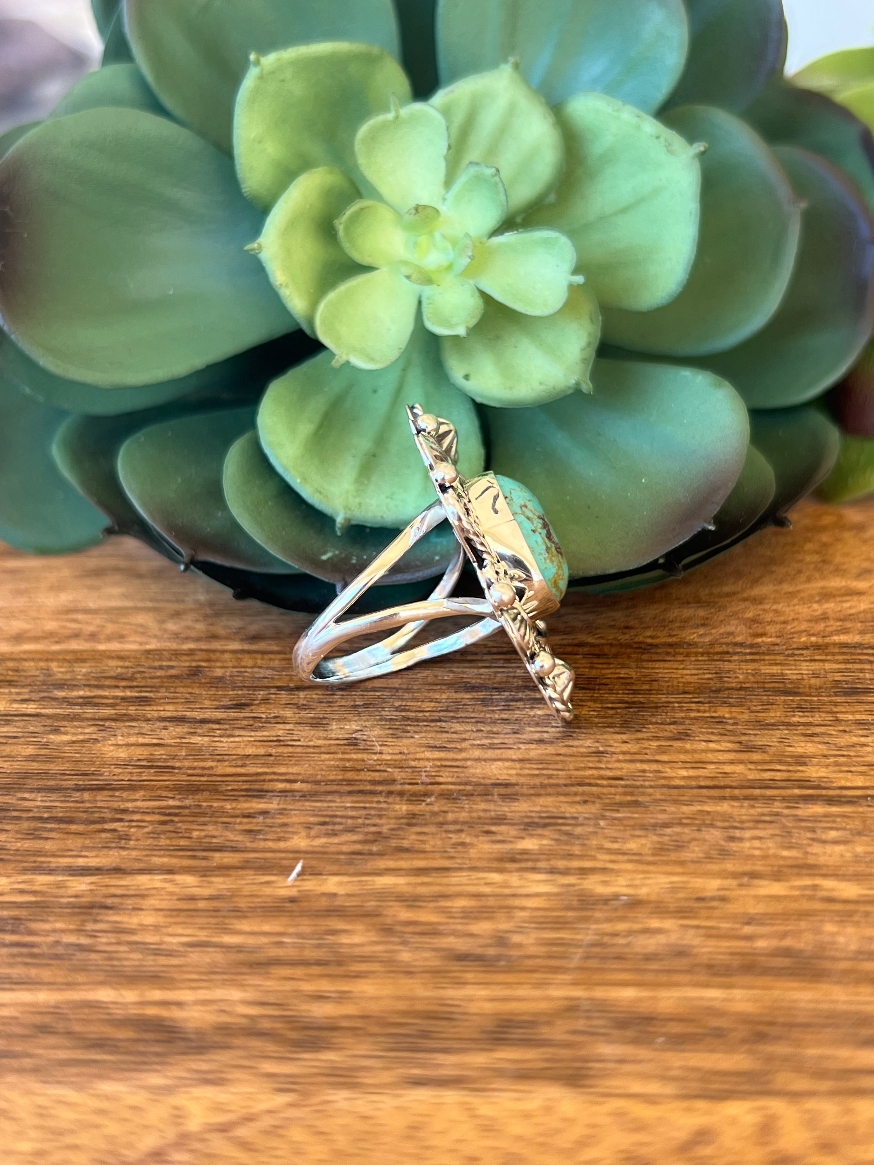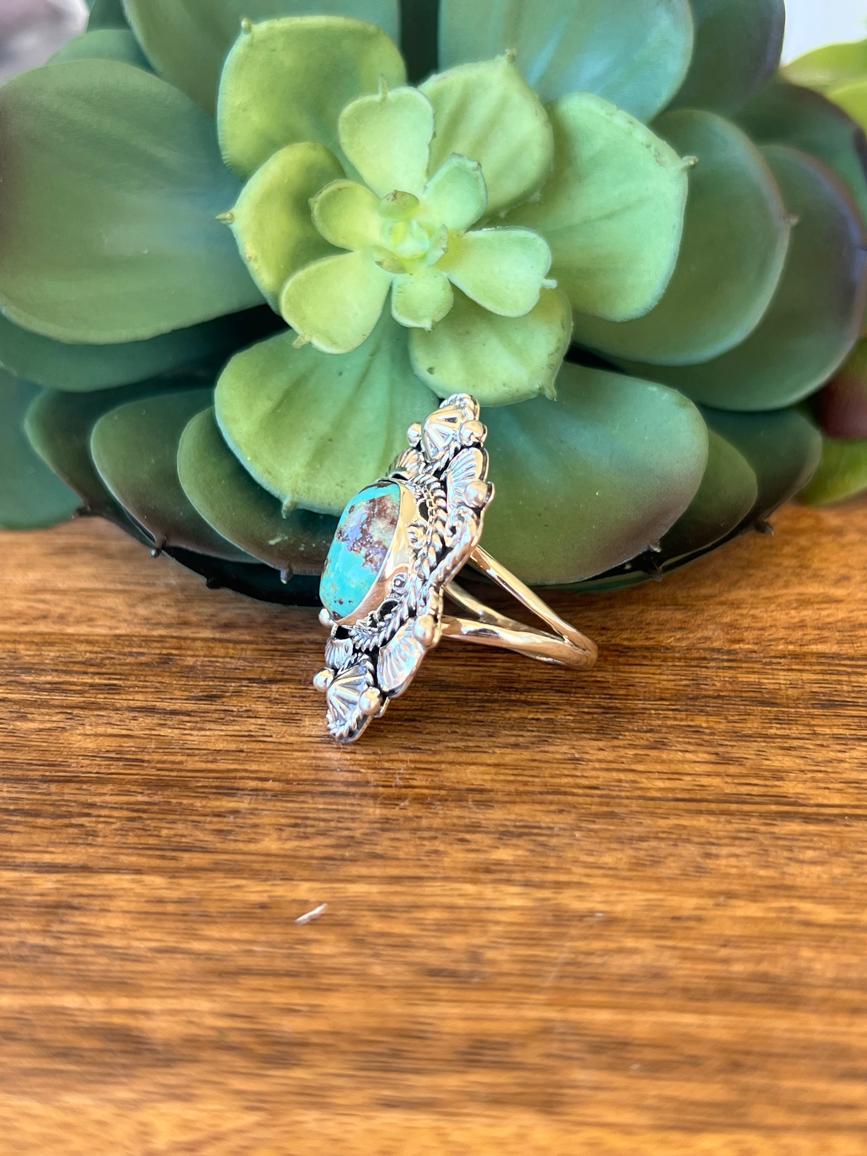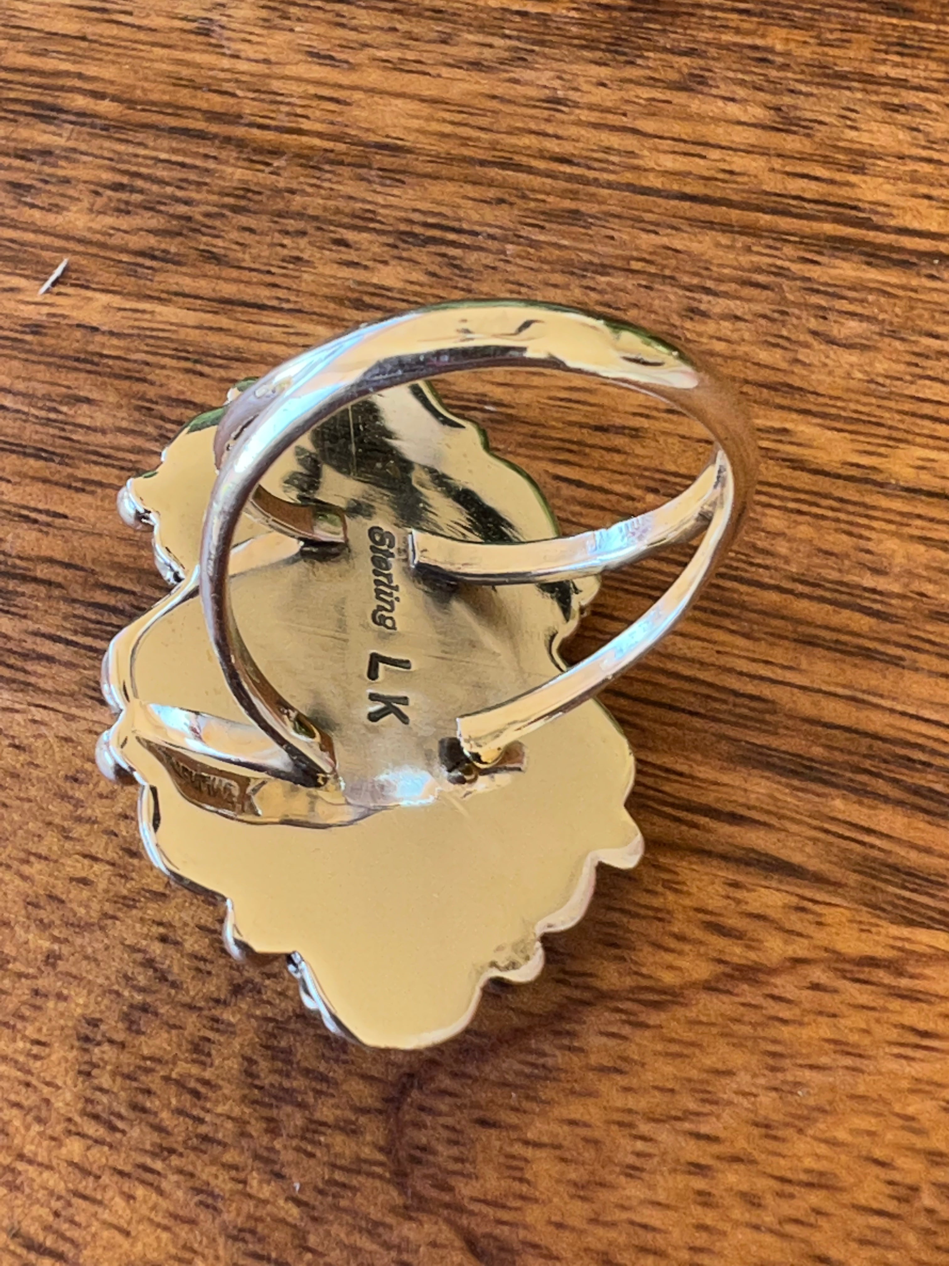 Larry Kaye Kingman Turquoise & Sterling Silver Ring Size 9.5. It measures a little under 1 1/2 finches long and 1 inches wide. Signed by the artist and stamped sterling silver.