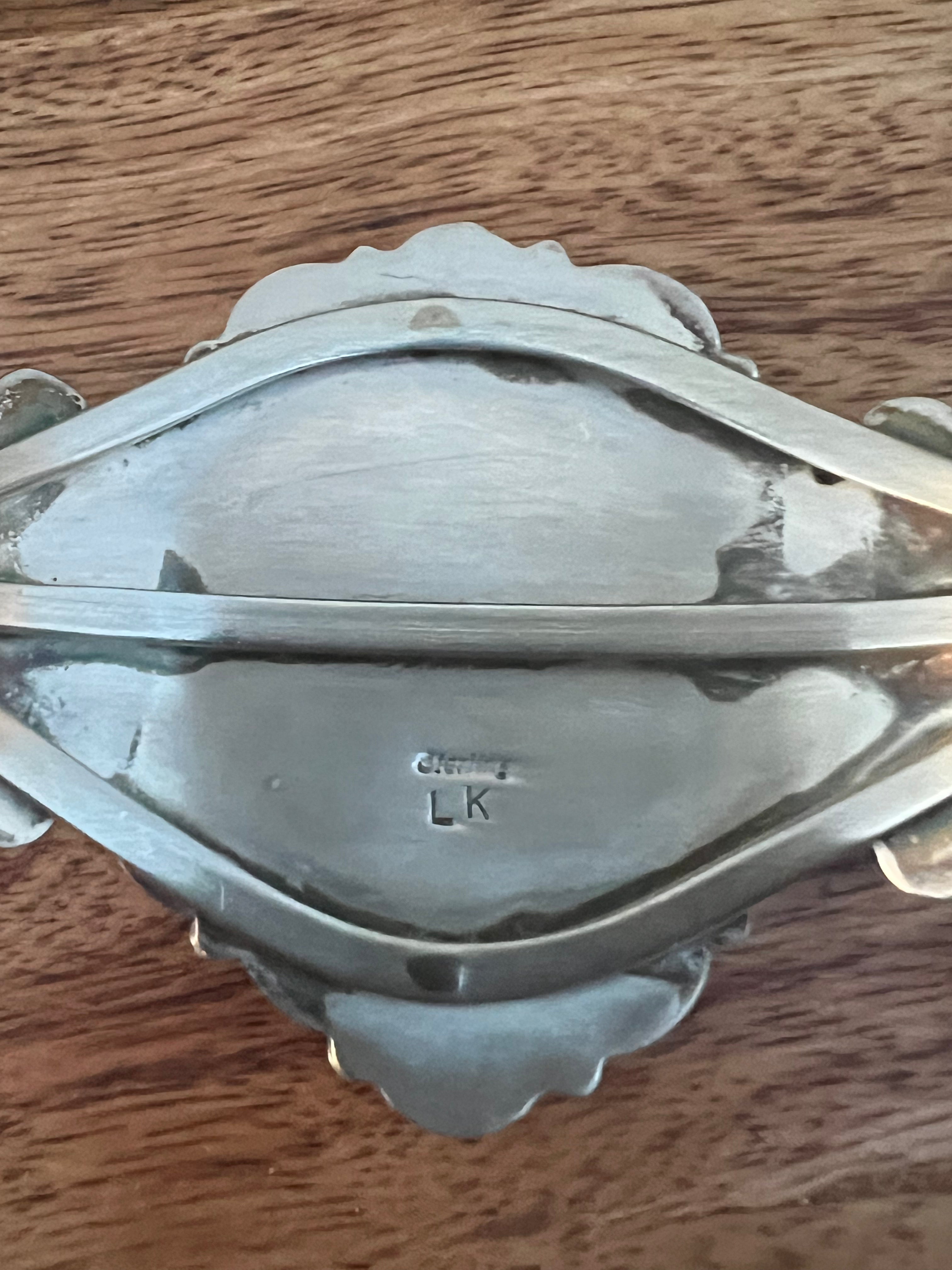 Larry Kaye Multi Stone & Sterling Silver Cuff Bracelet. It measures 2 inches wide with an inside circumference 5 1/2 inches & a gap of 1 1/4 inches. Signed by artist and stamped sterling silver.