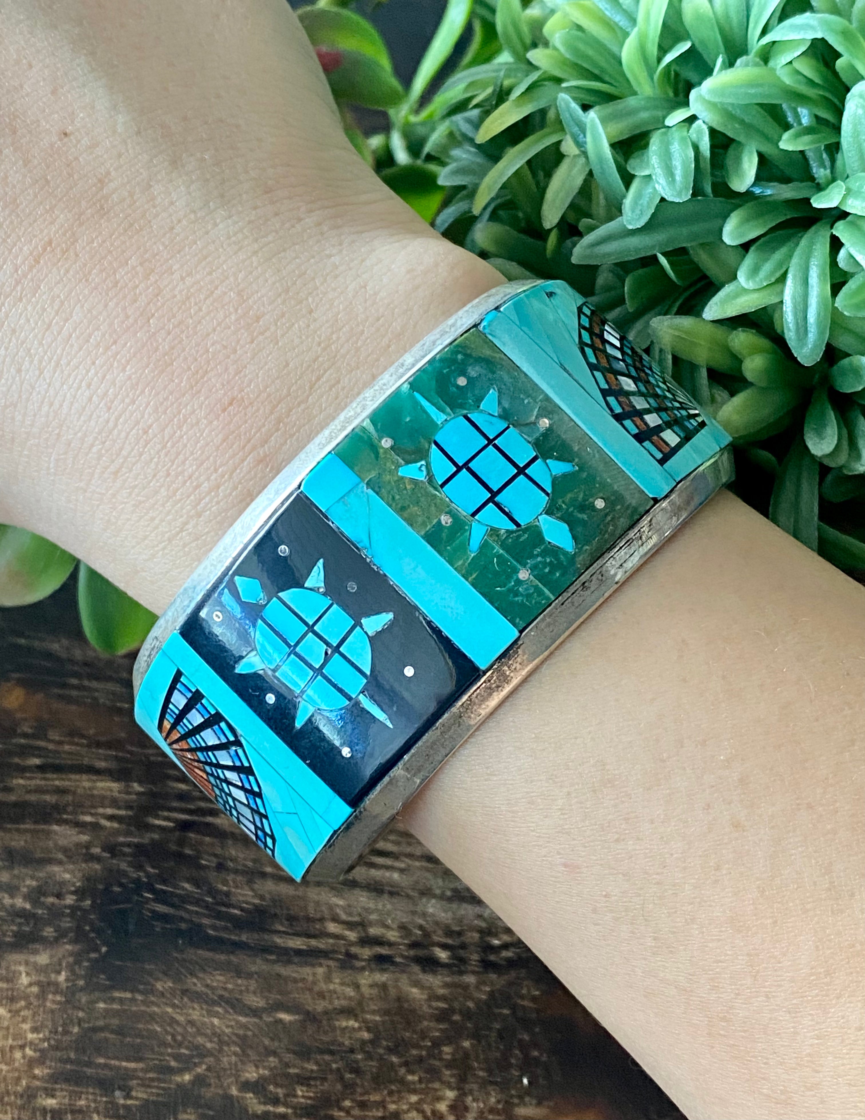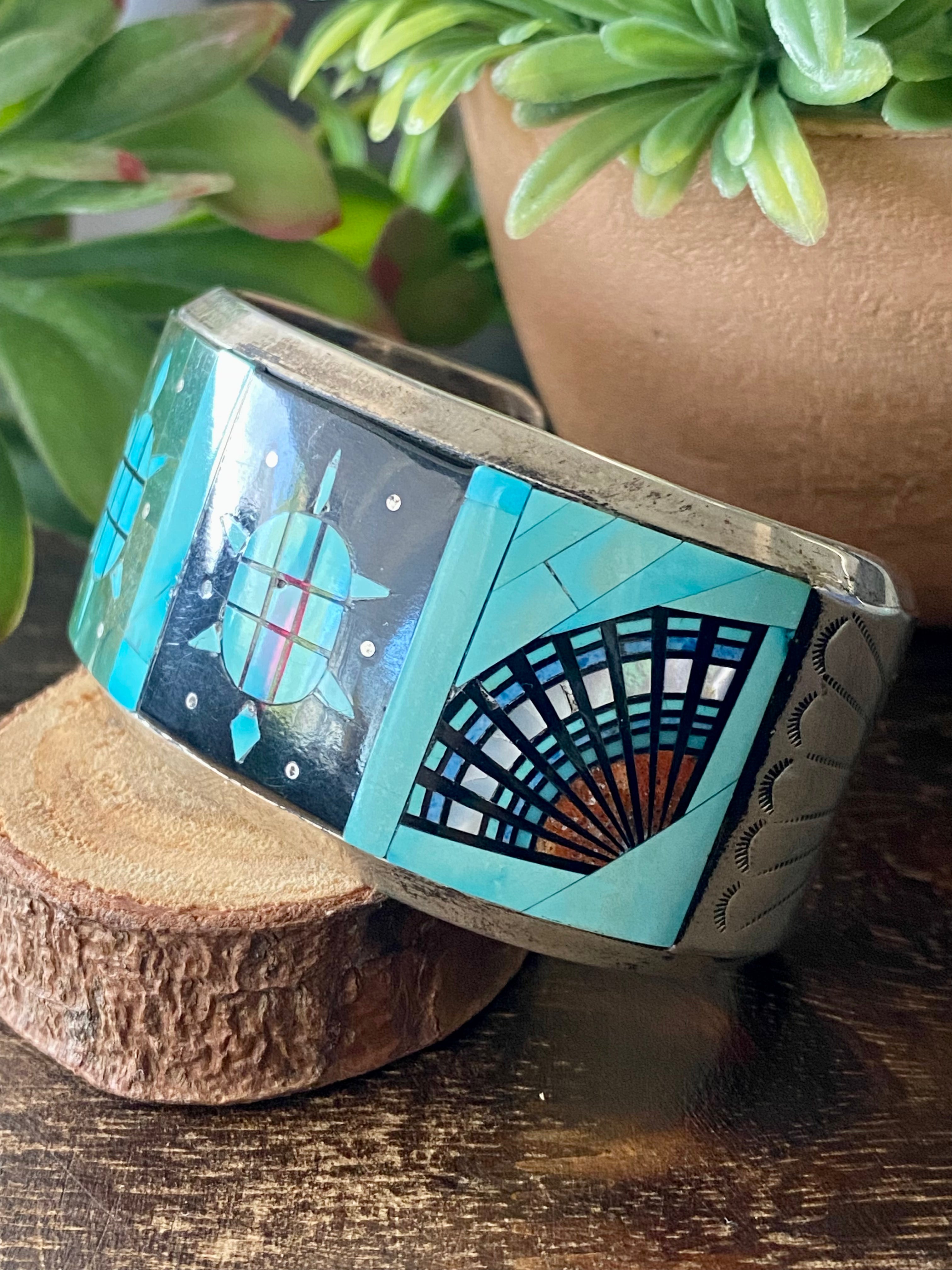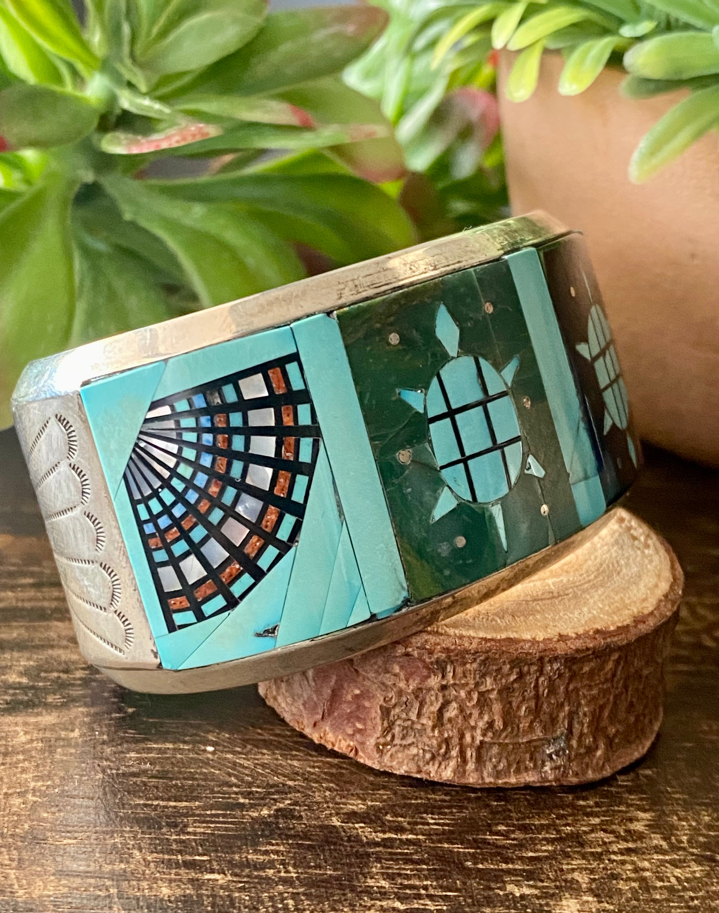 Bob Becenti & Lester James Multi Stone Sterling Silver Inlay Turtle Cuff Bracelet