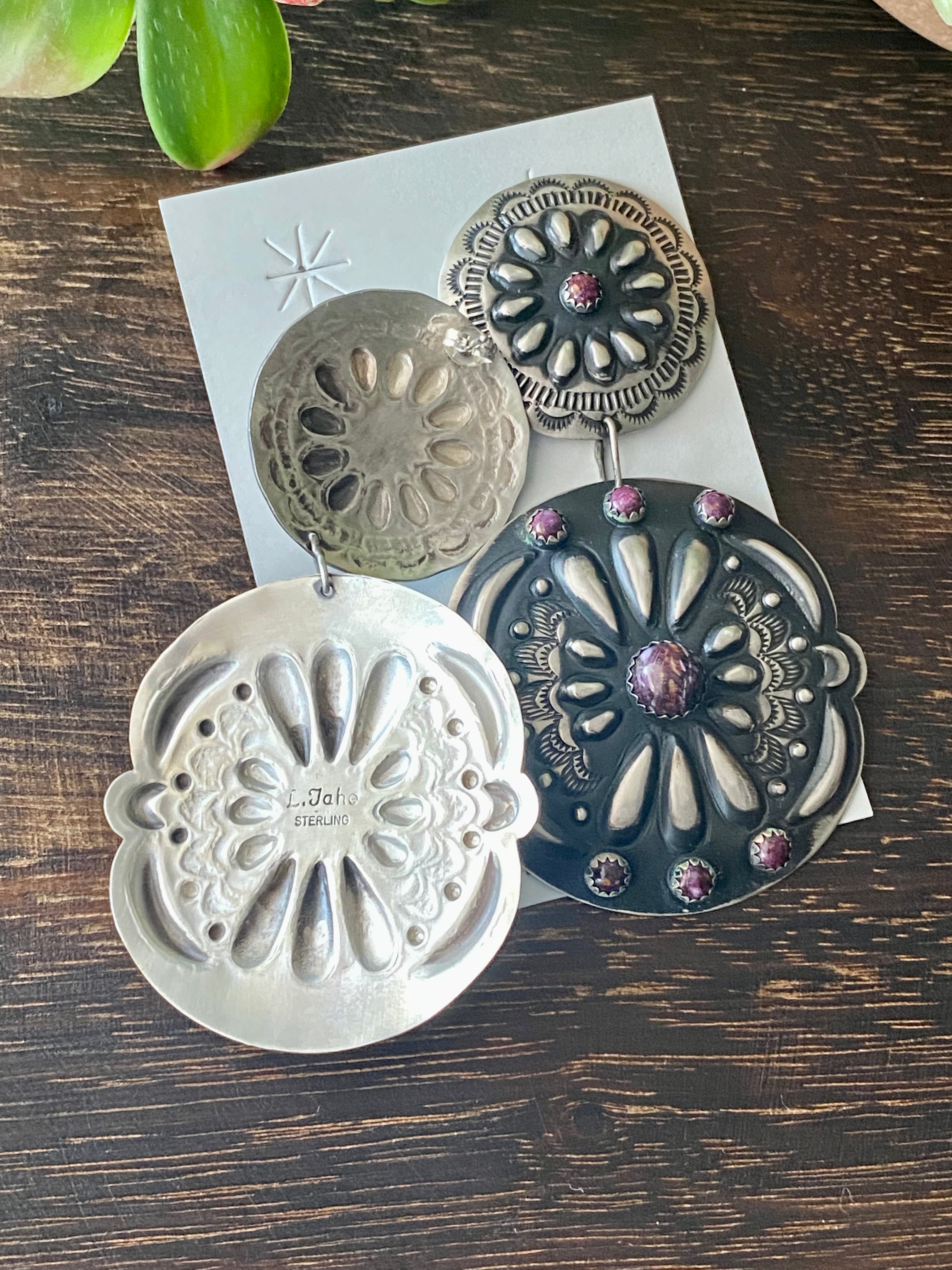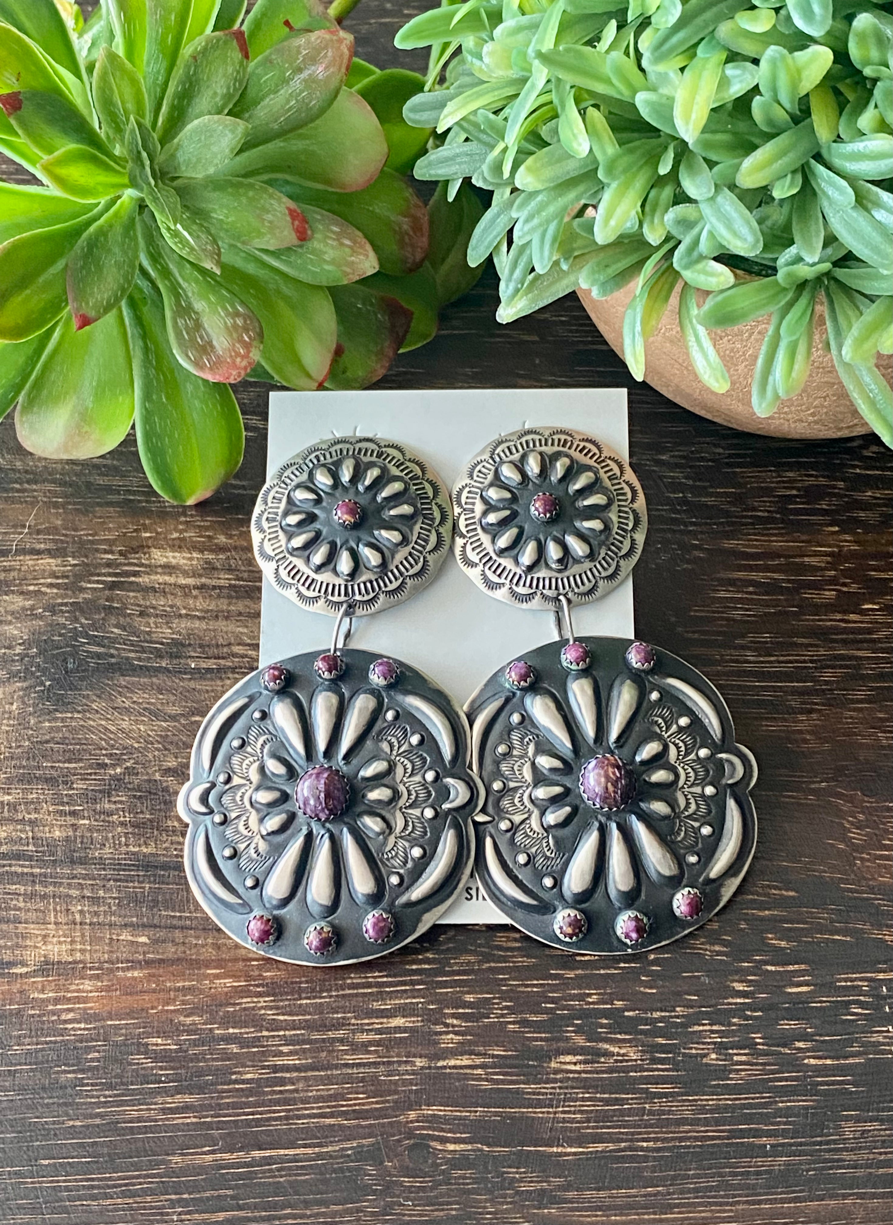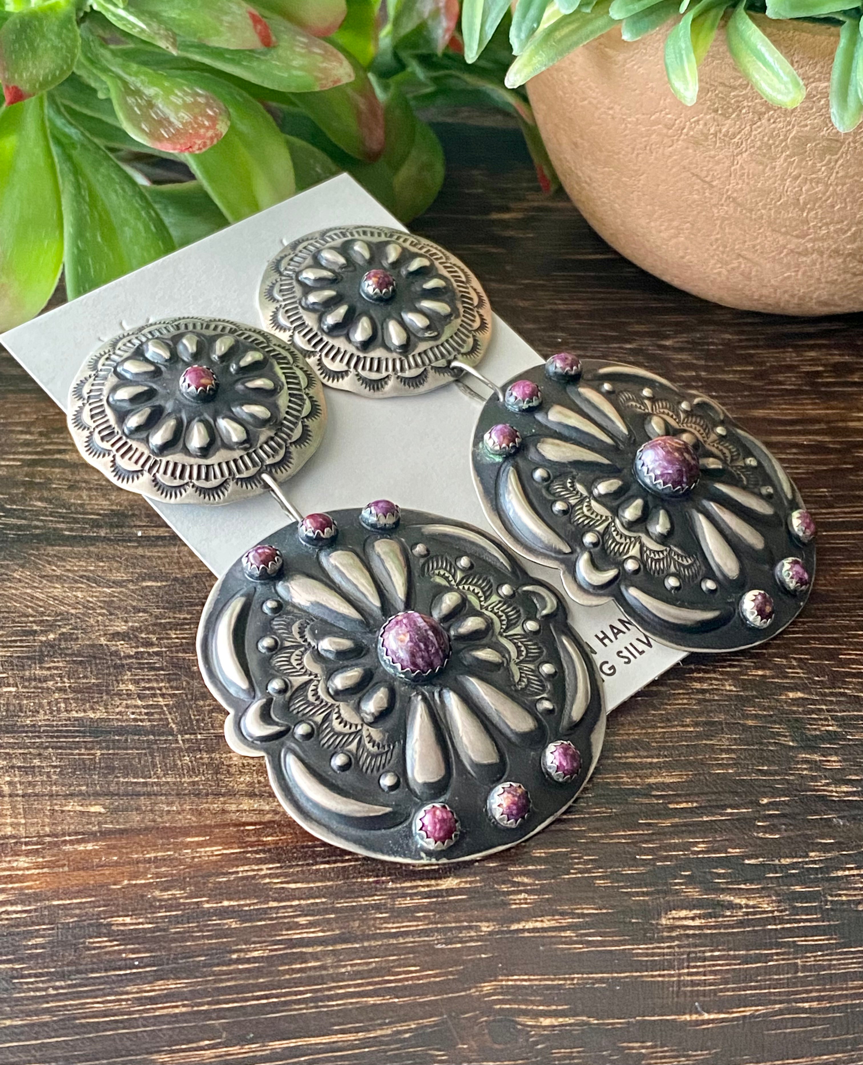 Leander Tahe Purple Spiny Oys & Sterling Silver Concho Post Dangle Earrings. It measures 3 1/2 inches long and just under 2 inches wide. Signed by the artist and stamped sterling silver.