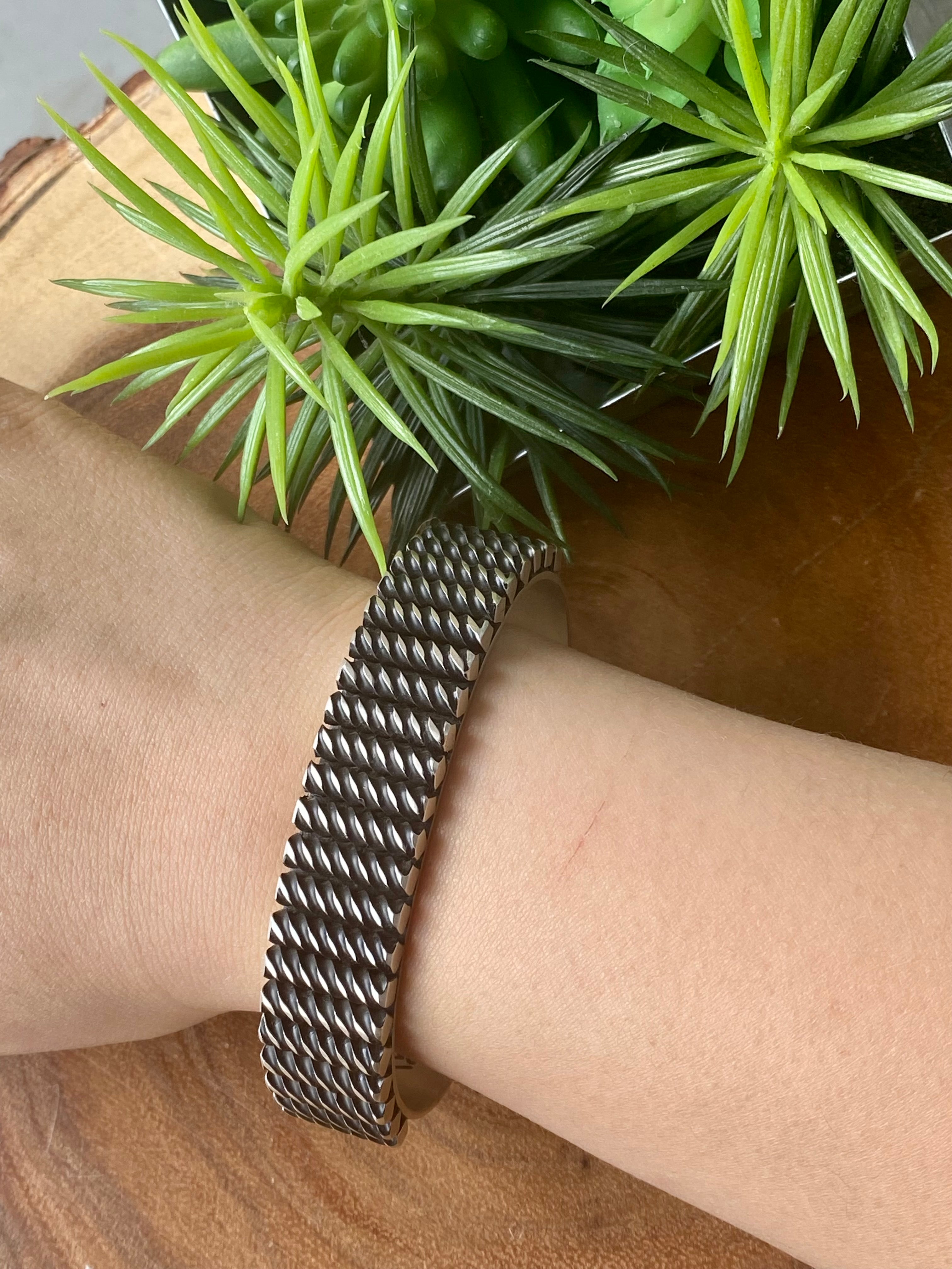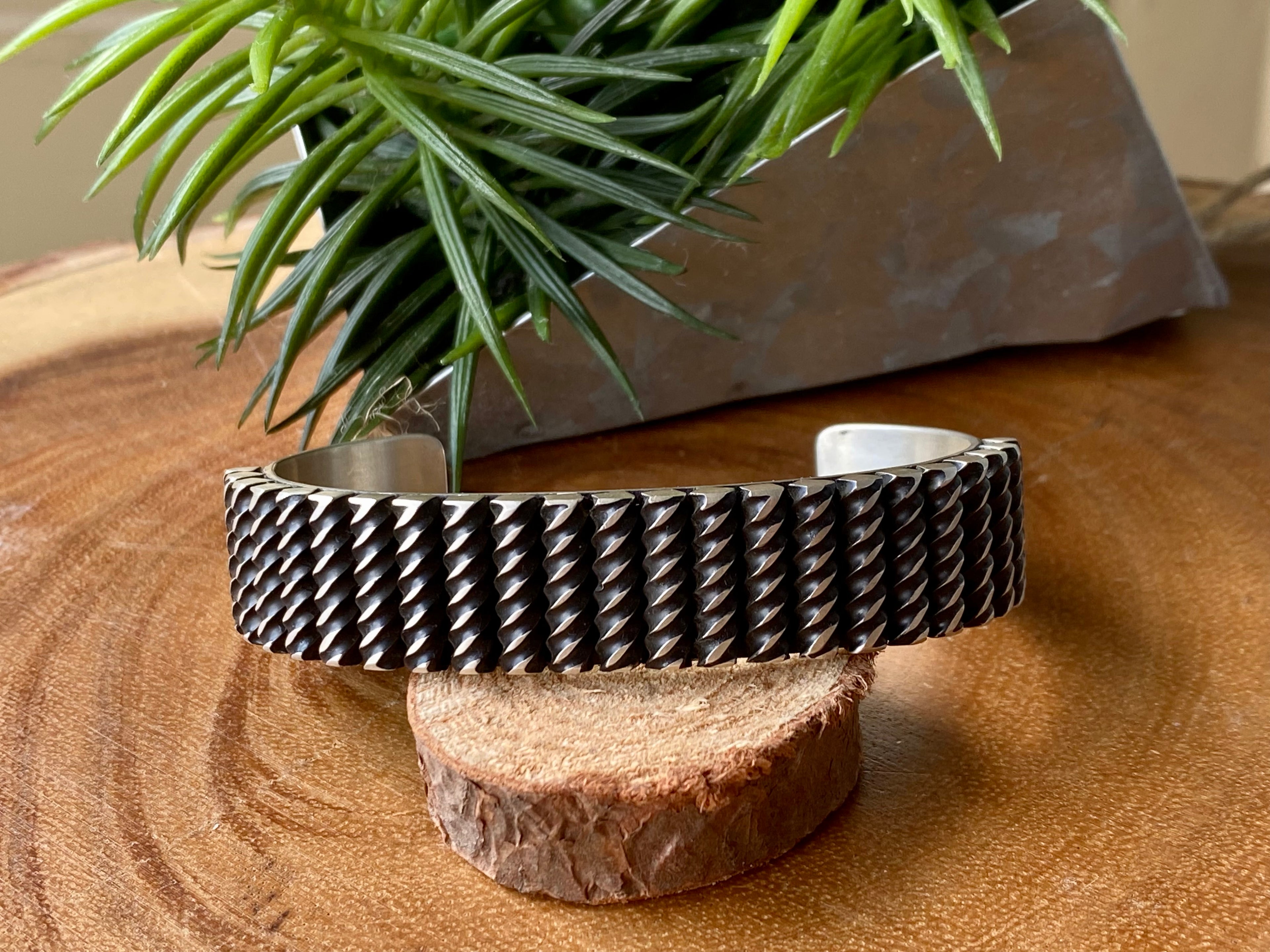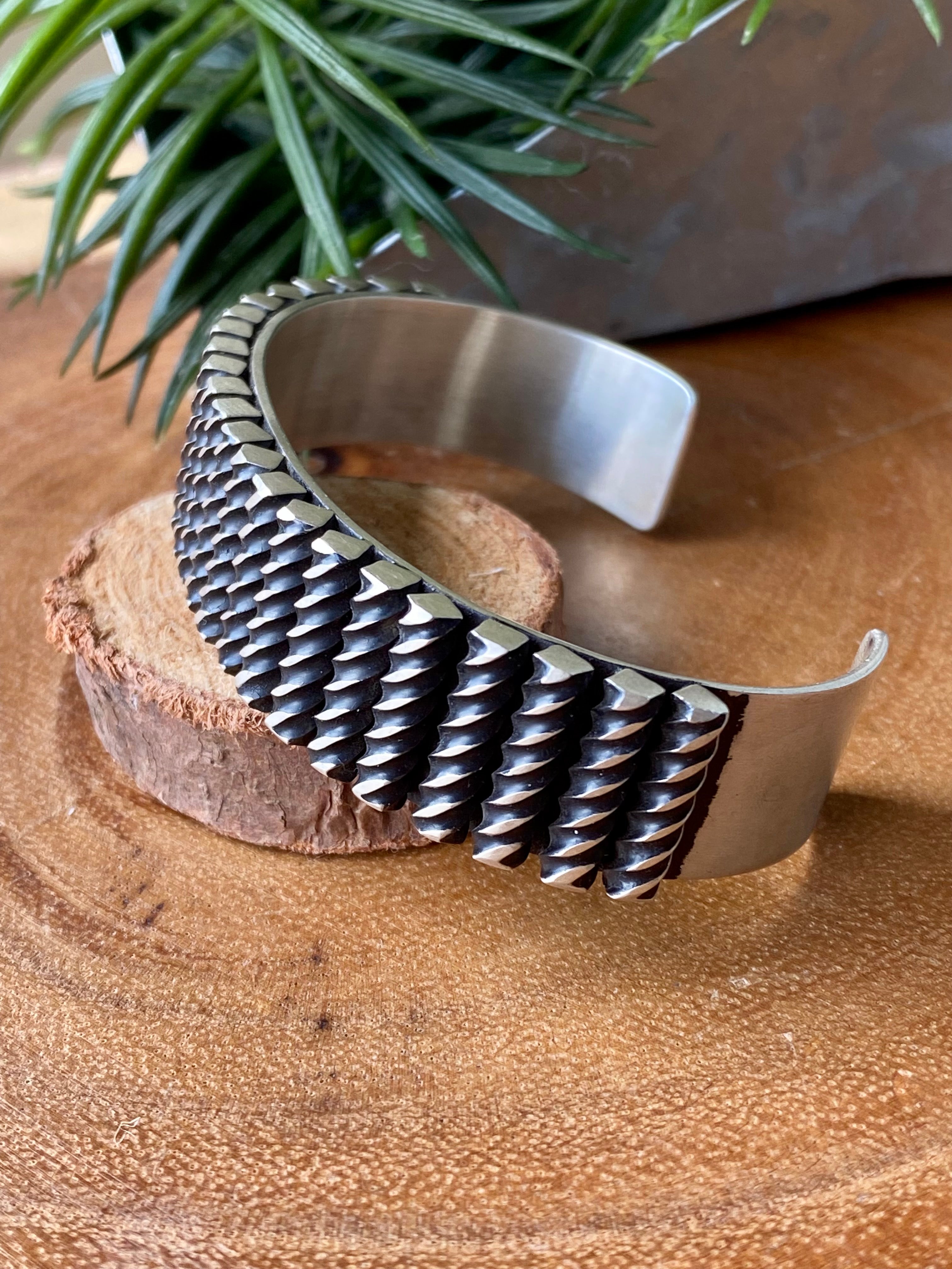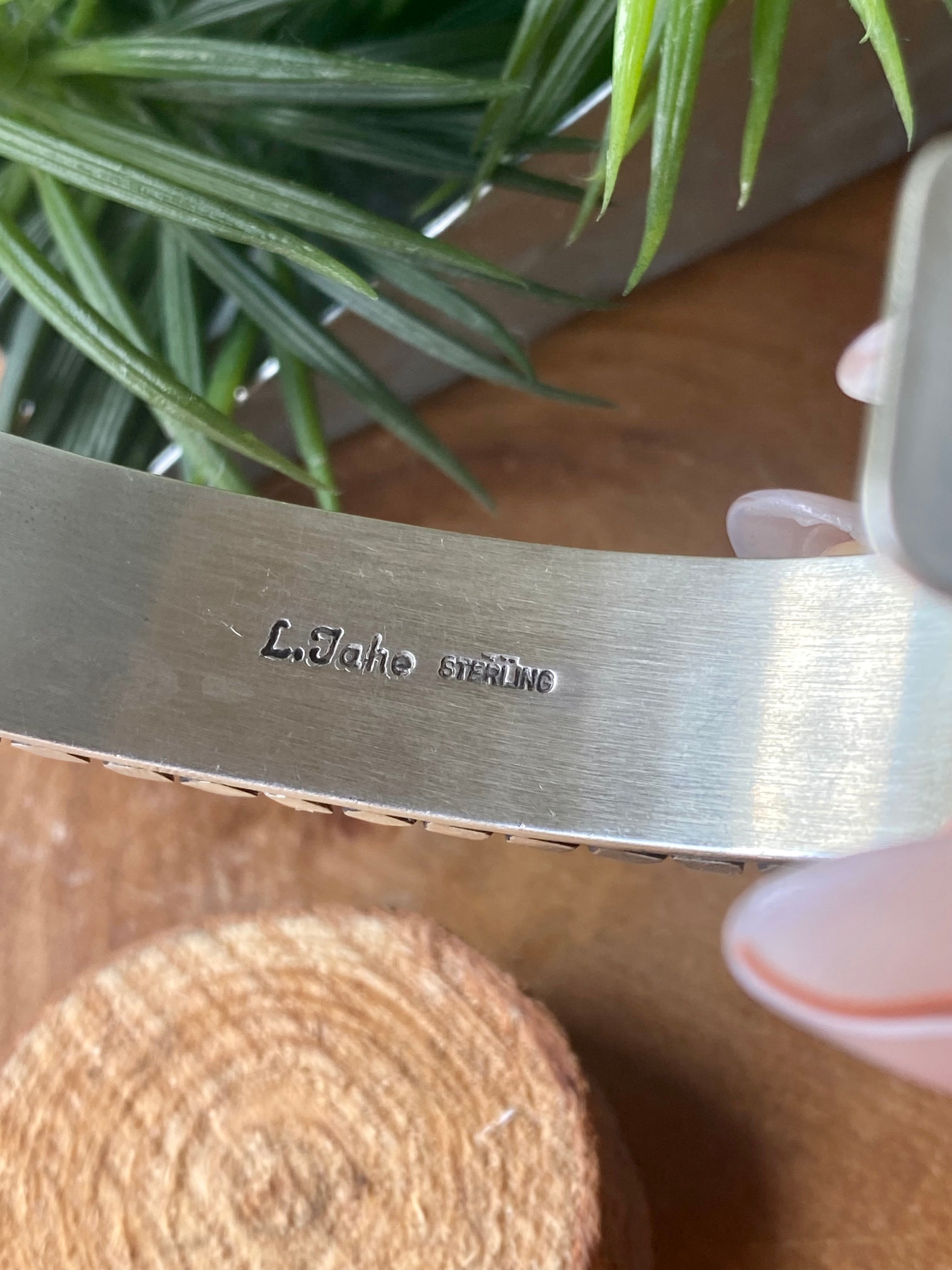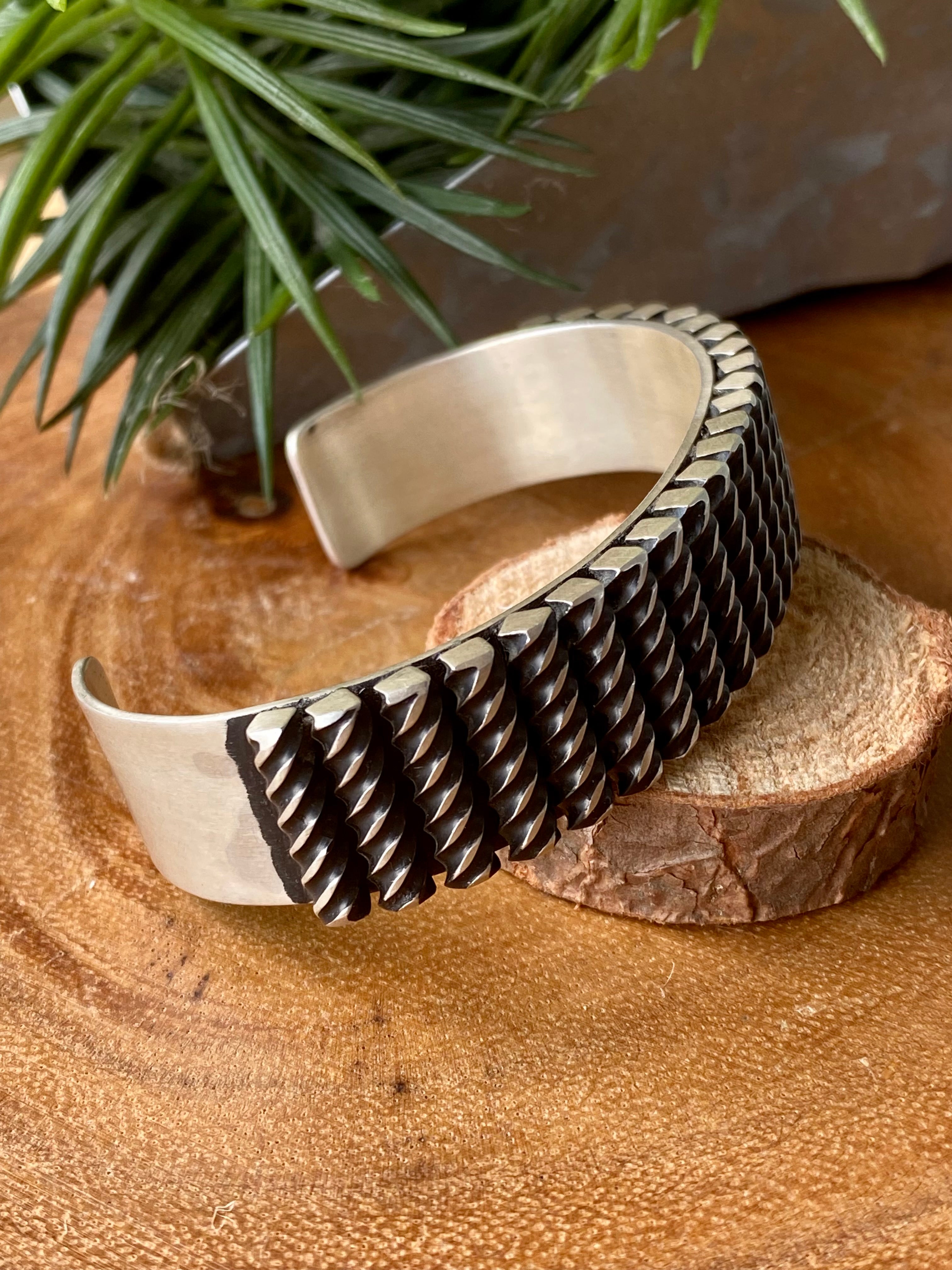 Leander Tahe Sterling Silver Men’s Cuff Bracelet. It measures 5/8 of an inch wide with an inside circumference of 5 3/4 inches and a gap of 1 5/8 inches. Signed by the artist and stamped sterling silver.