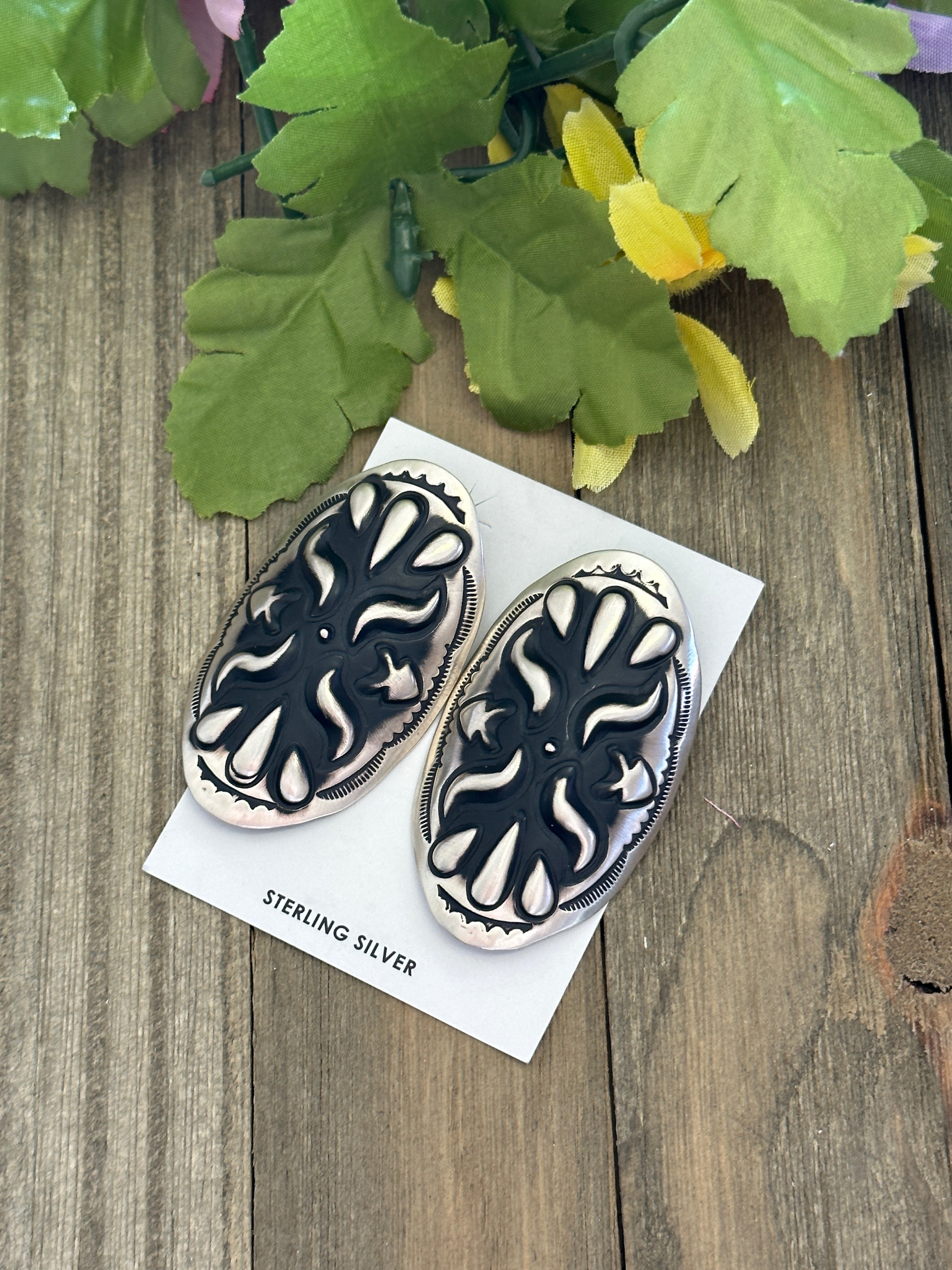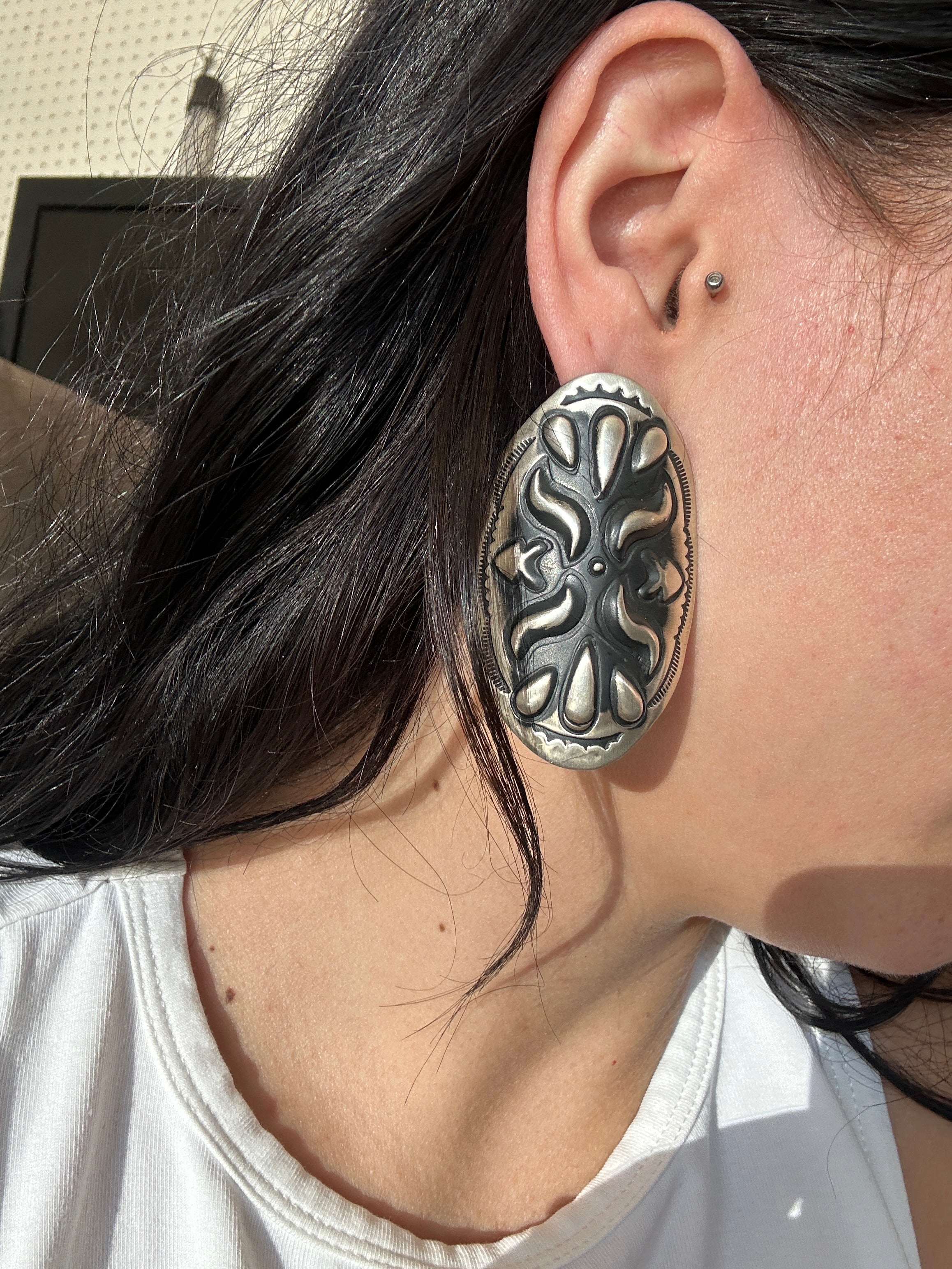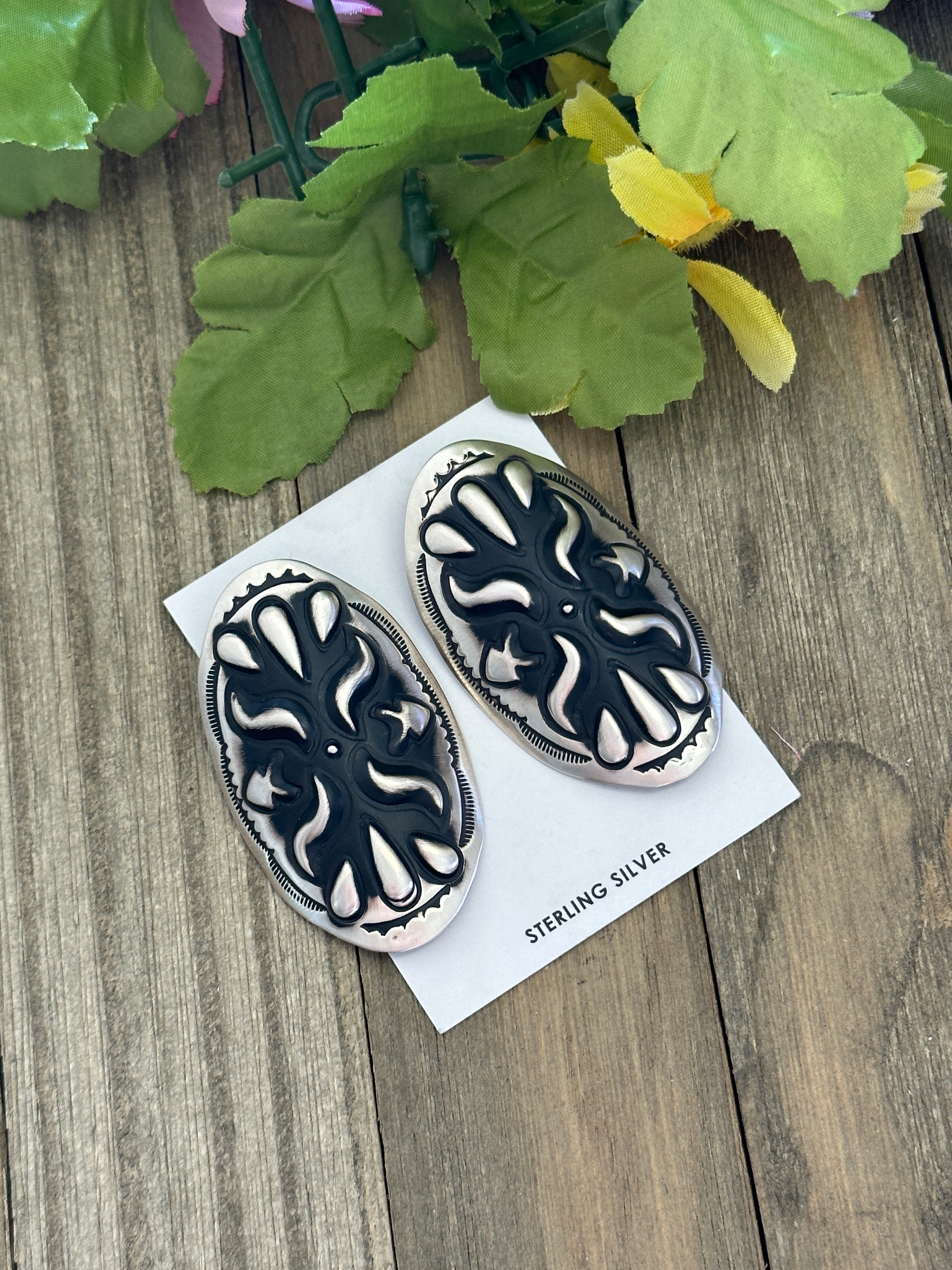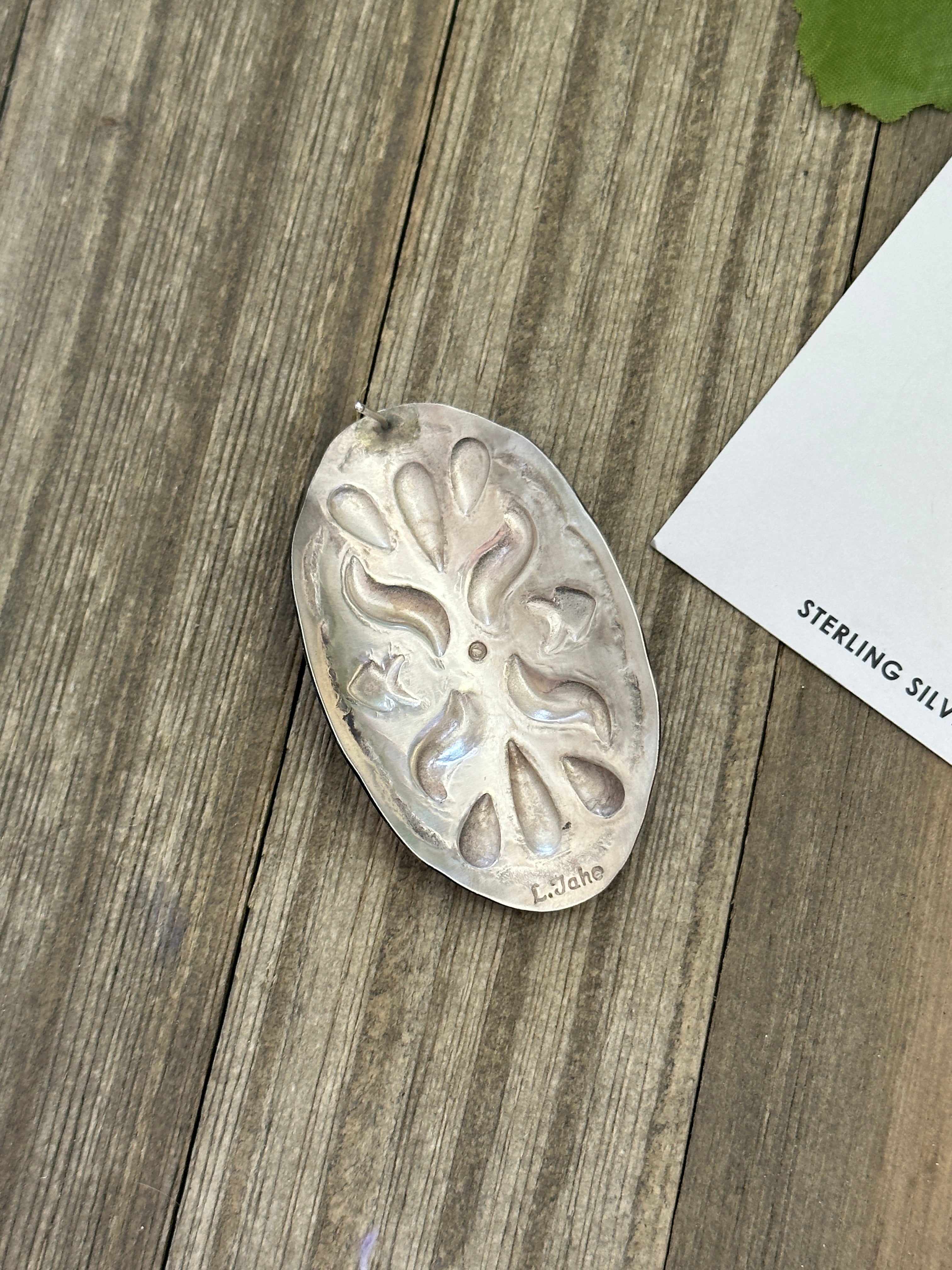 Leander Tahe Sterling Silver Post Dangle Concho Earring. It measures 2 1/4 inches long and 1 1/2 inches wide. Signed by artist and stamped sterling silver.