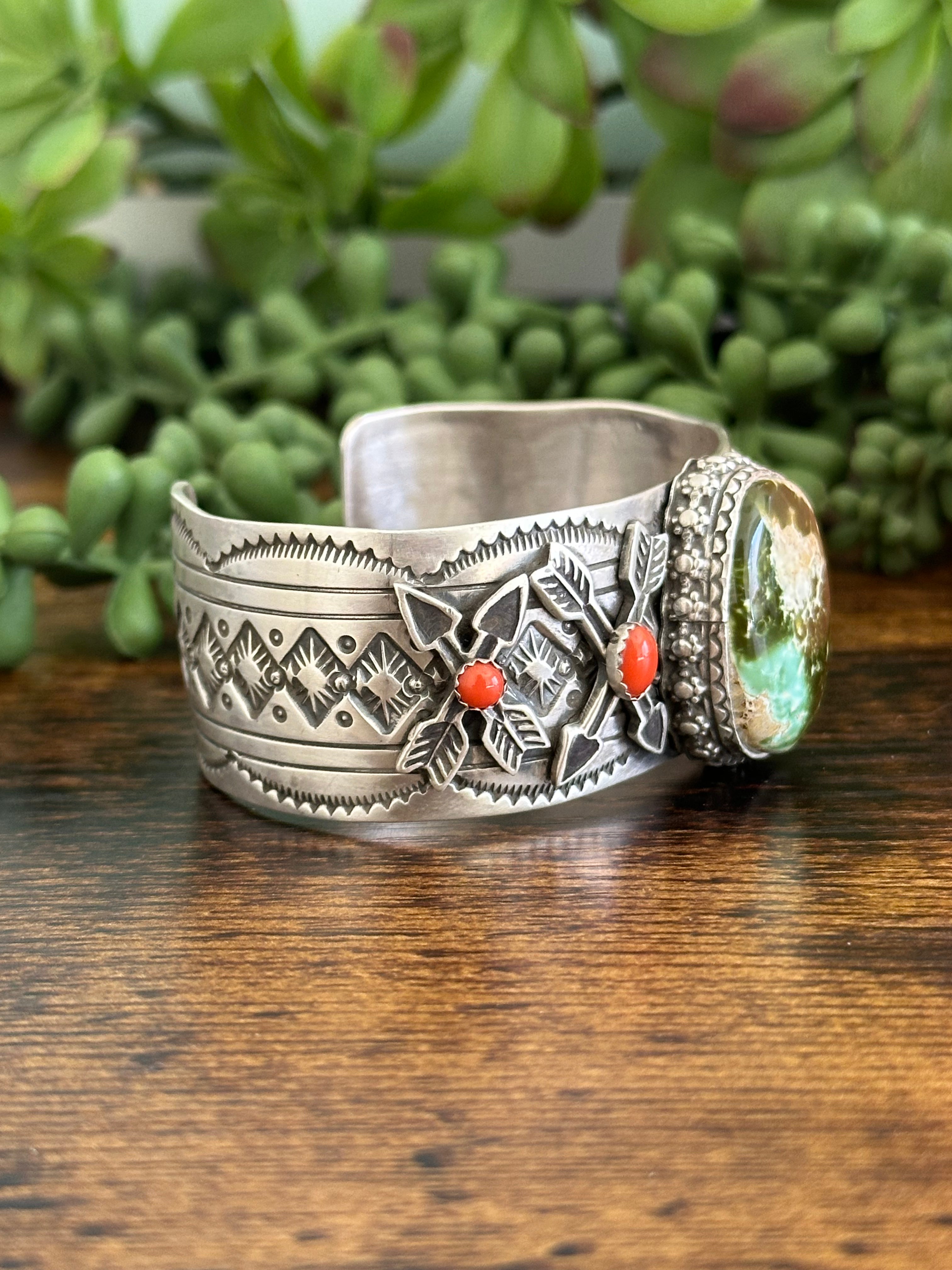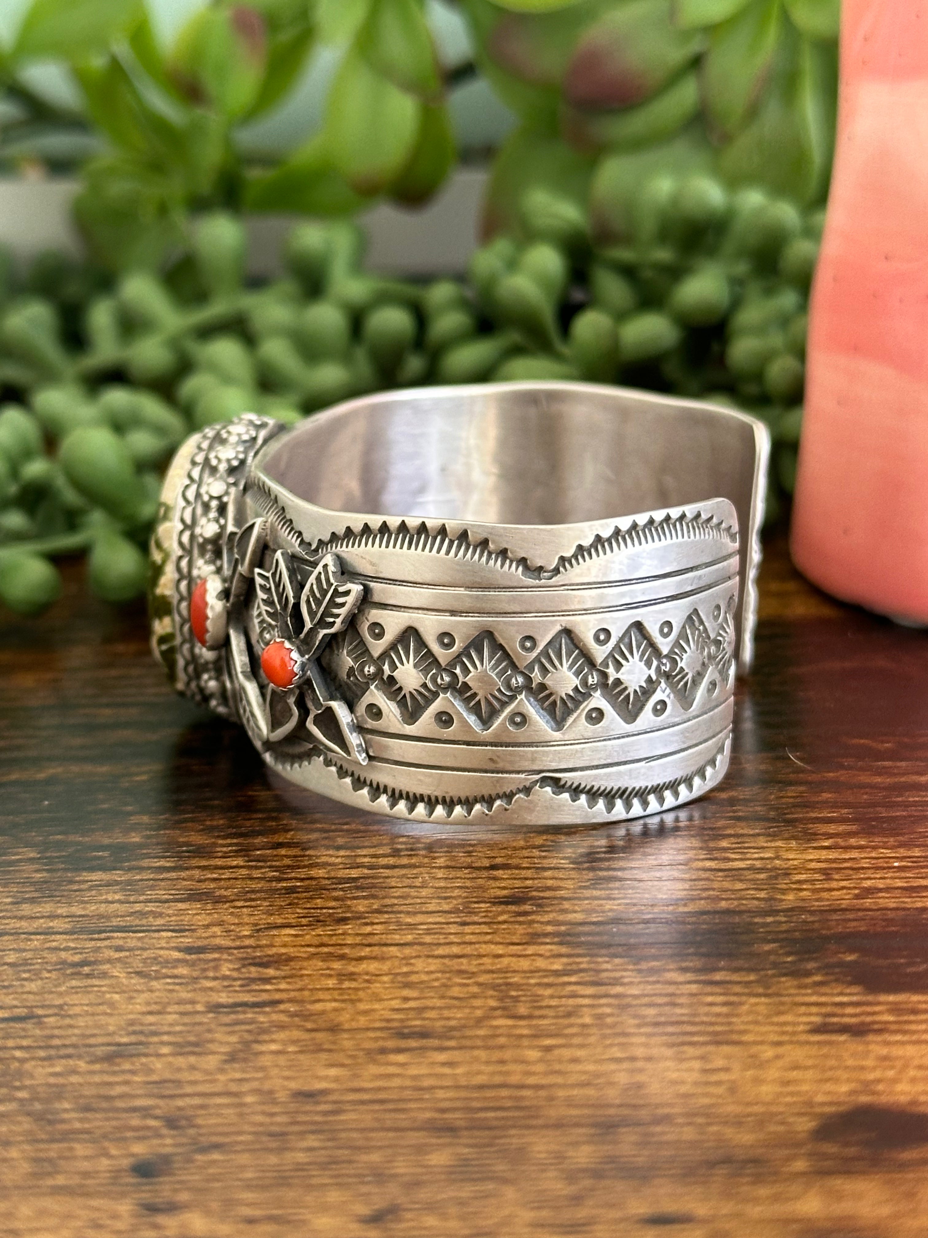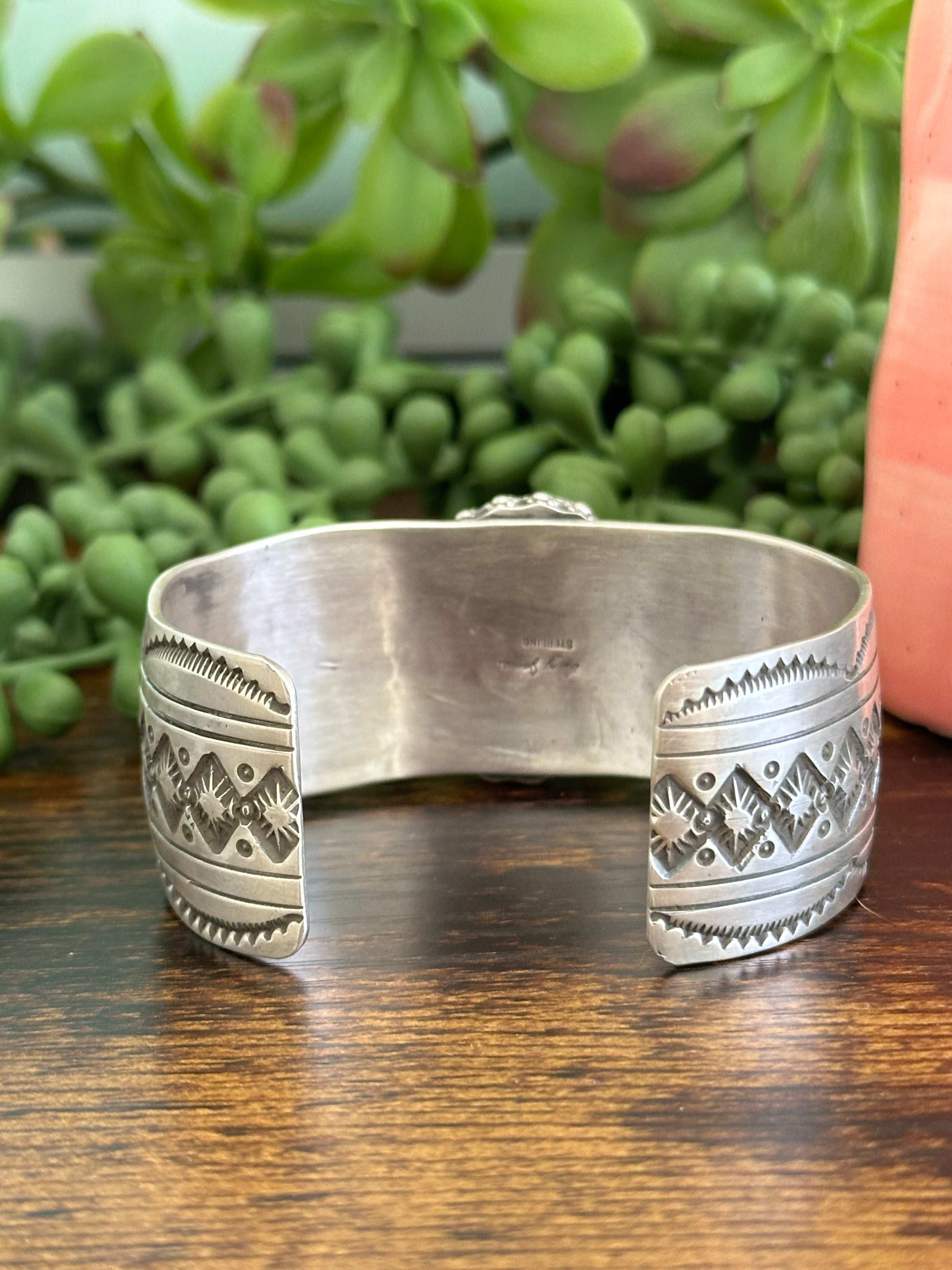 LeRoy James Multi Stone & Sterling Silver Cuff Bracelet. It measures 1 1/8 inches wide with an inside circumference of 6 inches and a gap of 1 1/8 inches. Signed by artist and stamped sterling silver.