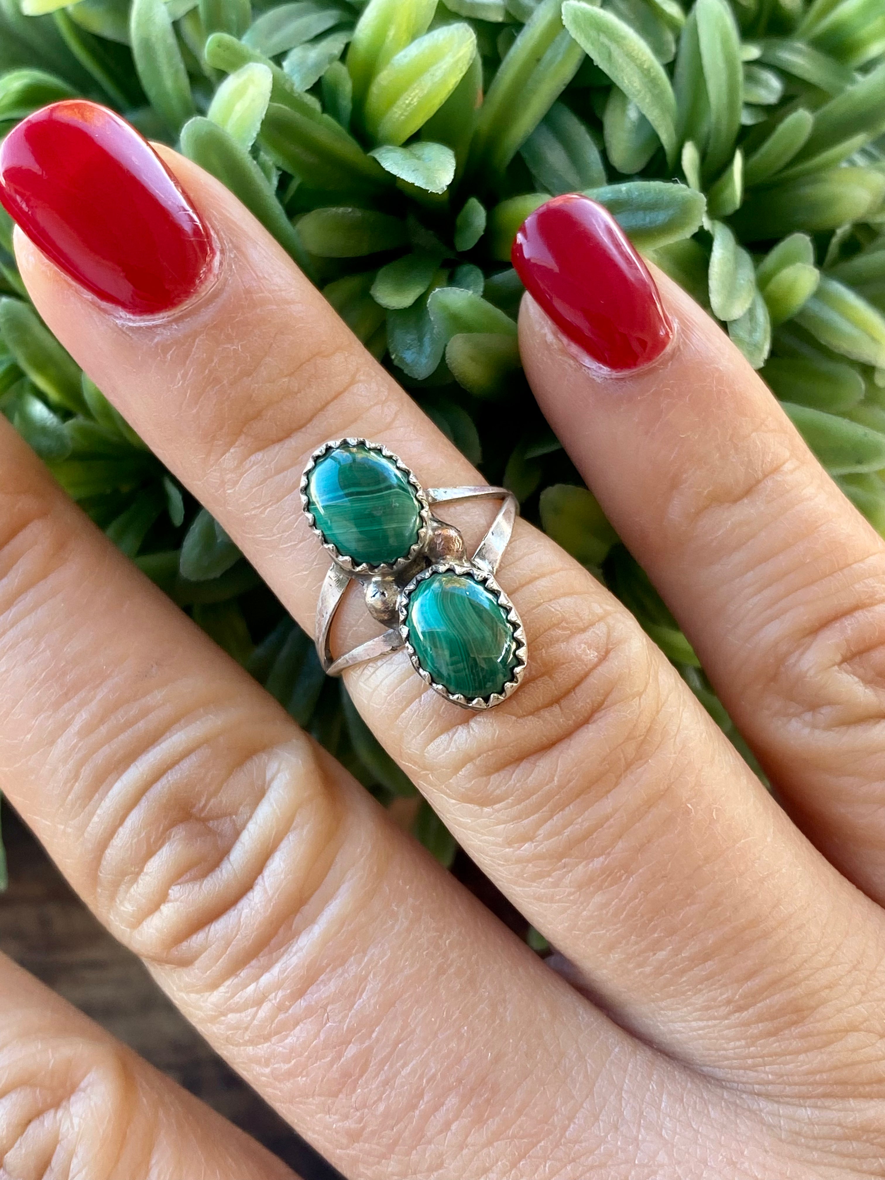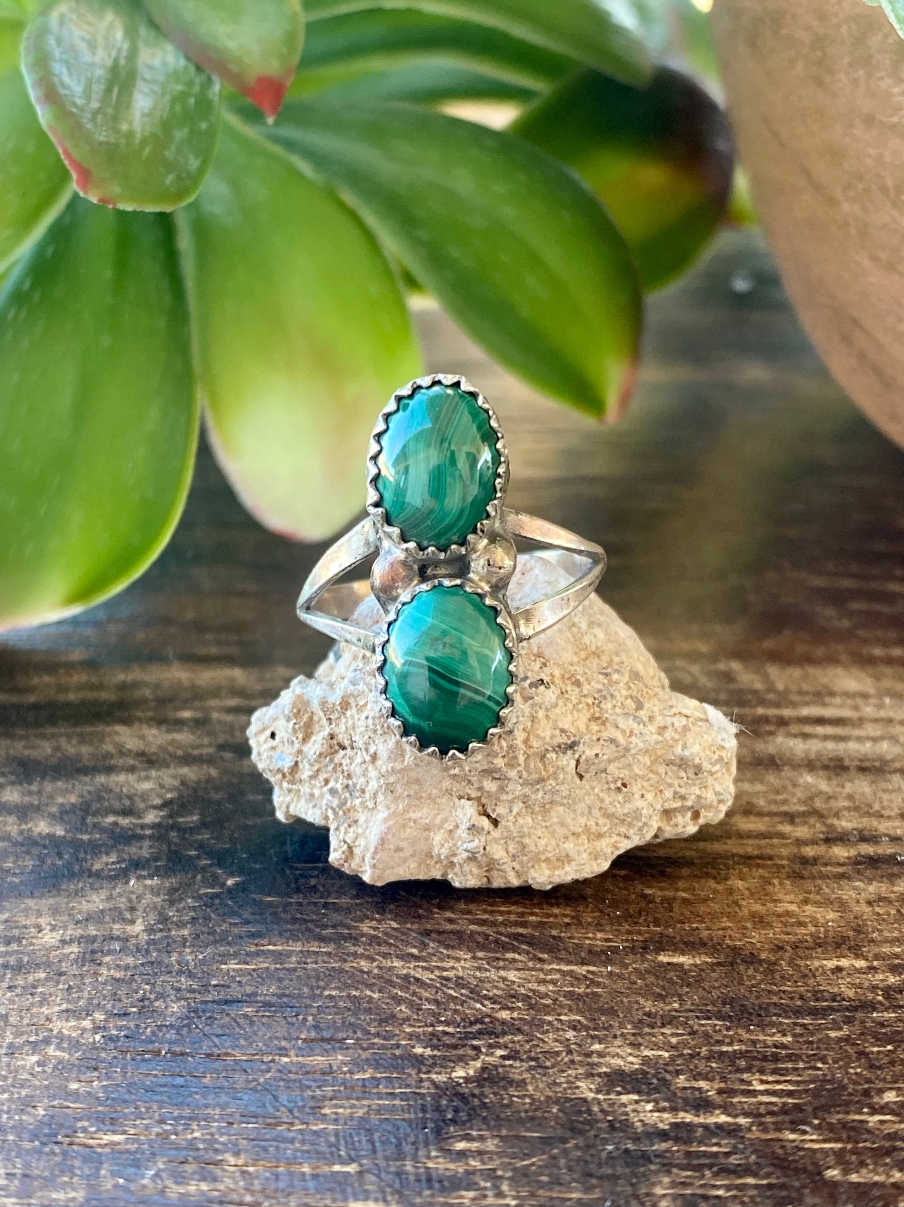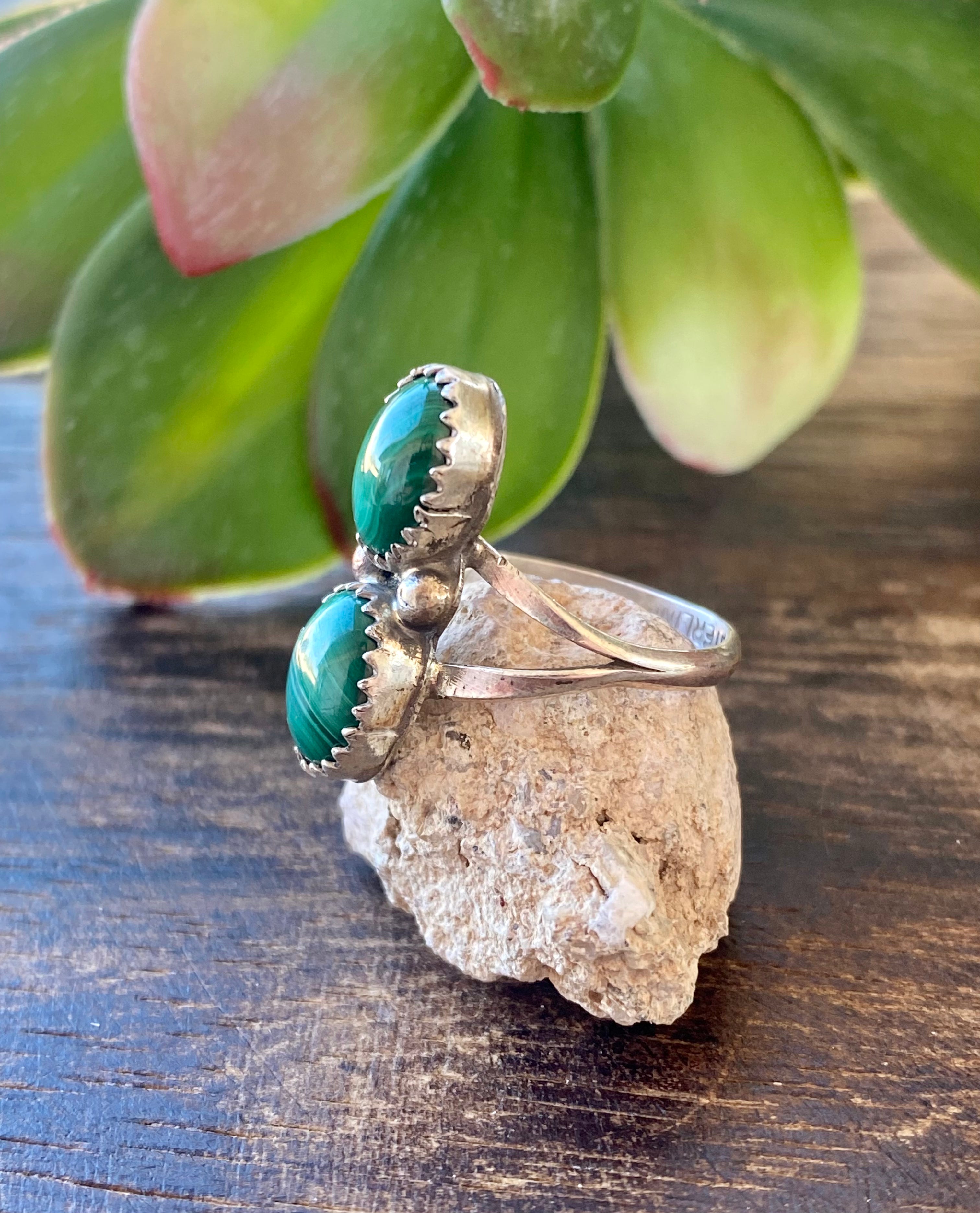 Linda Yazzie Malachite & Sterling Silver Ring. It measures just over 3/4 of an inch long and just over 1/4 of an inch wide. Stones will differ due to natural stones. Stamped sterling silver.