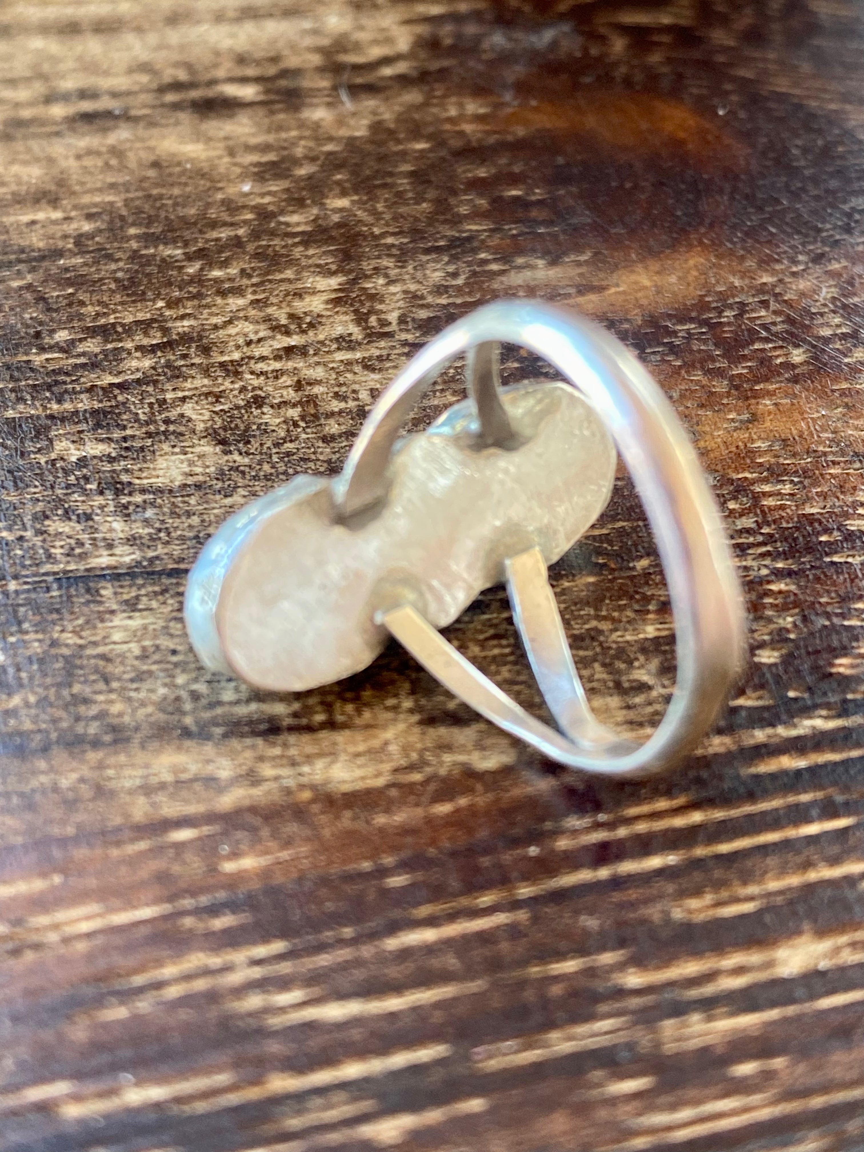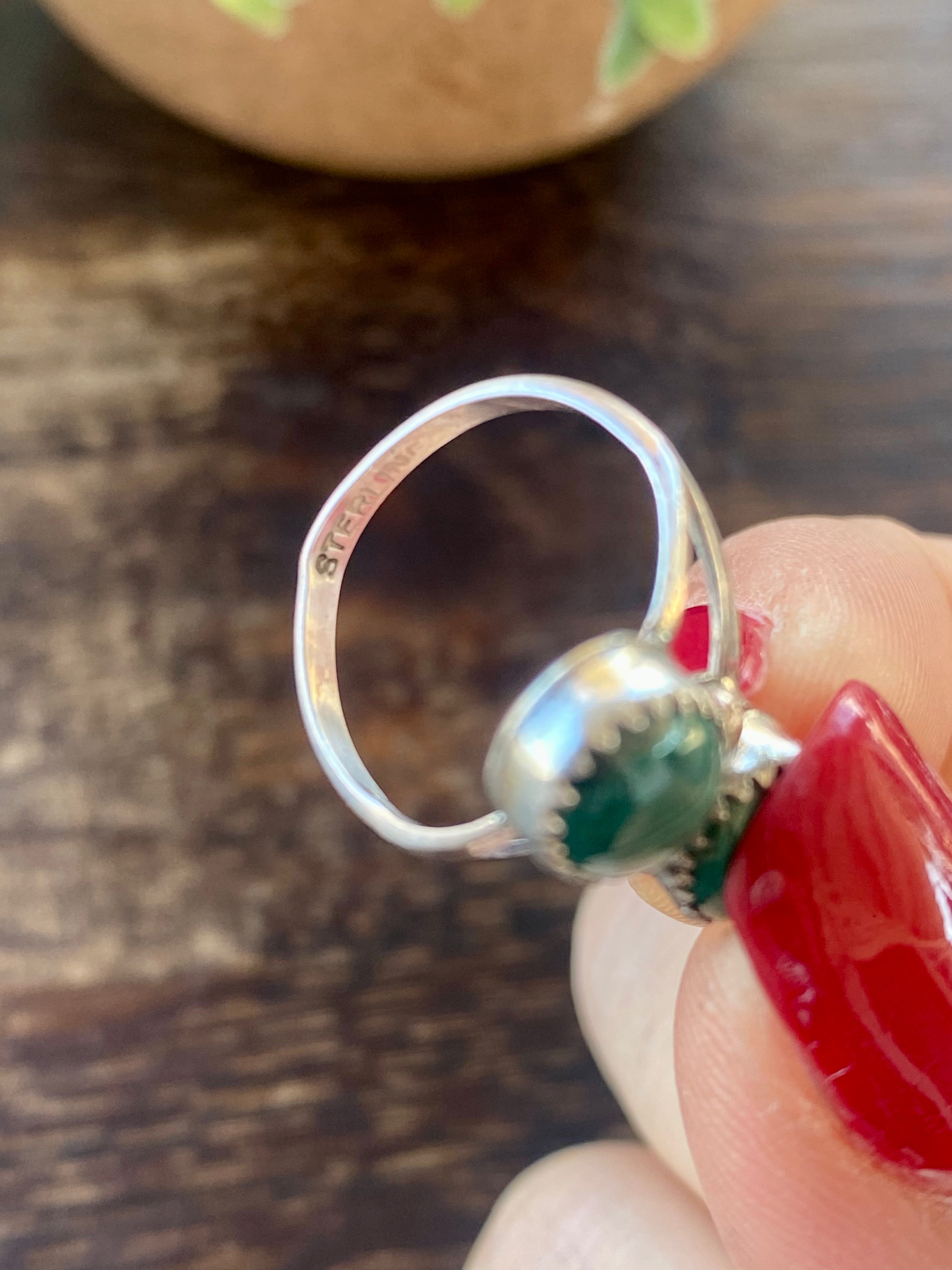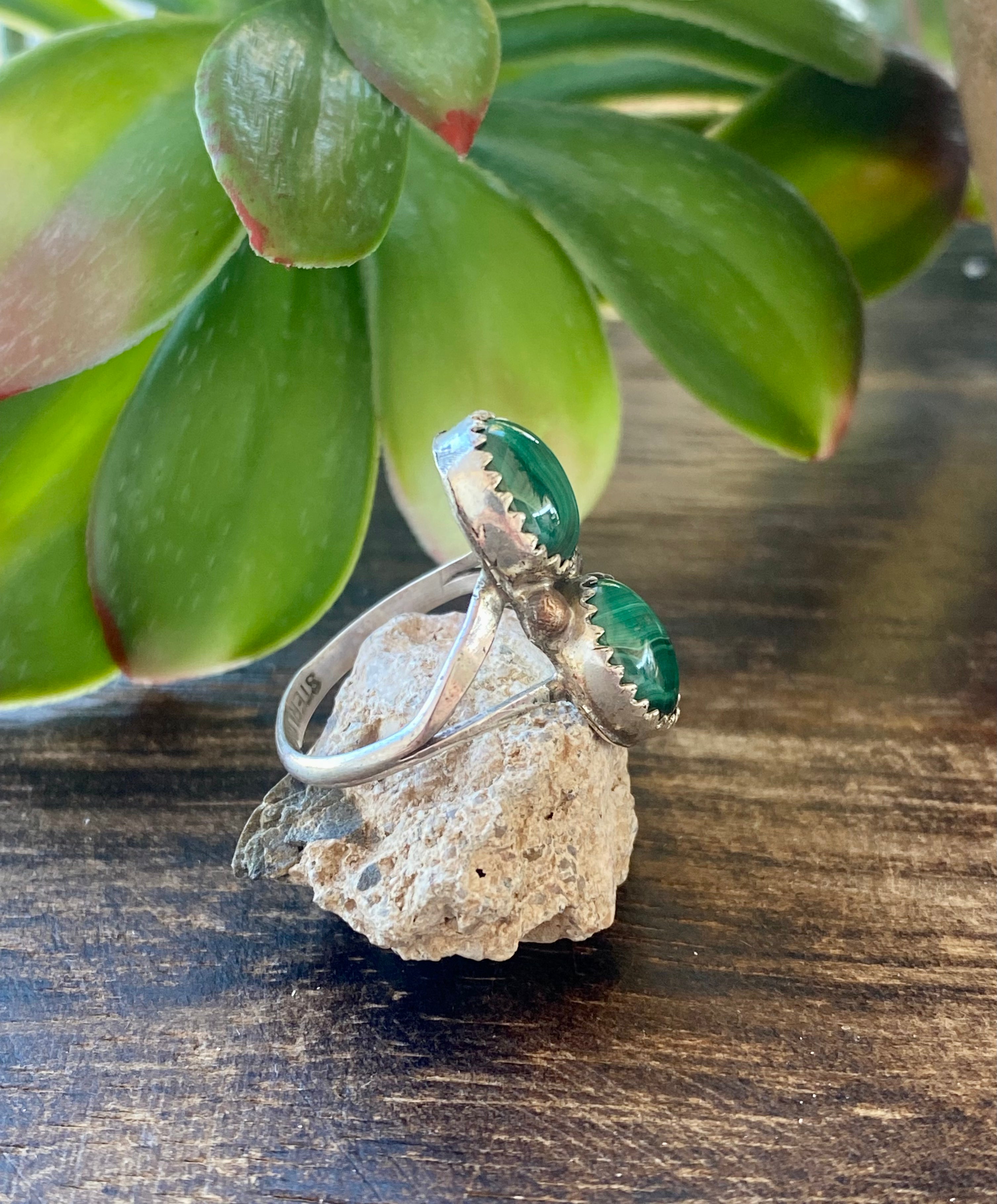 Linda Yazzie Malachite & Sterling Silver Ring. It measures just over 3/4 of an inch long and just over 1/4 of an inch wide. Stones will differ due to natural stones. Stamped sterling silver.