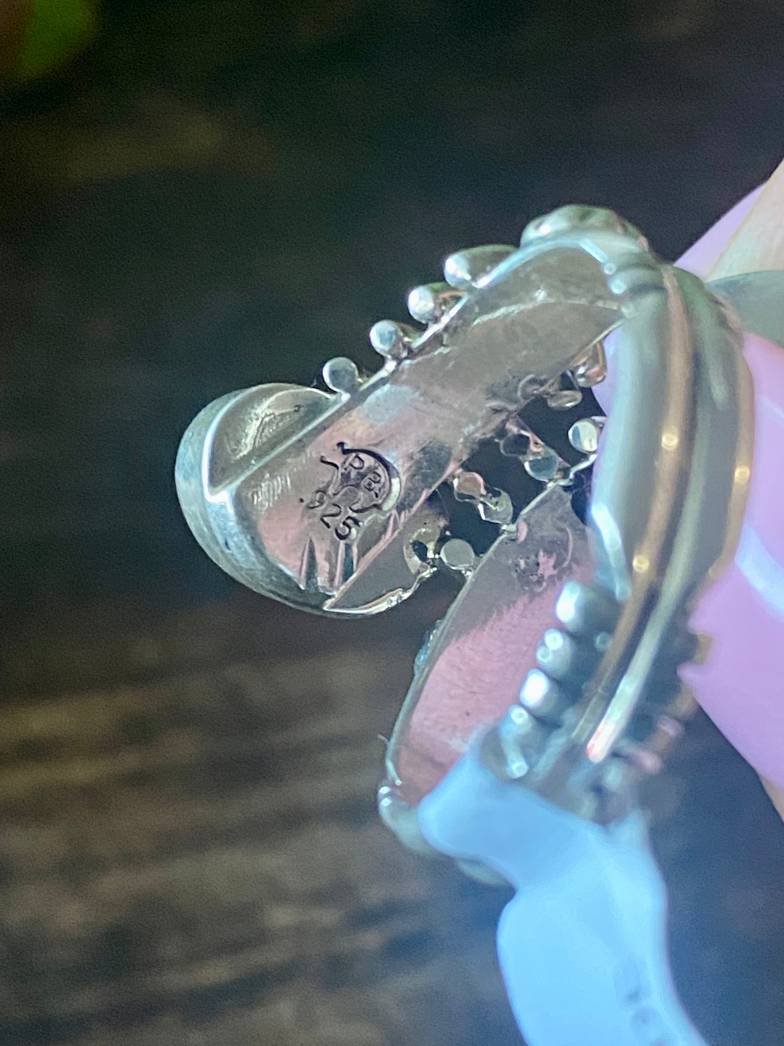 Loretta Smith Multi Stone & Sterling Silver Ring Size 8.5. It measures just under 1 inch long and 3/4 of an inch wide. Signed by the artist and stamped sterling silver.