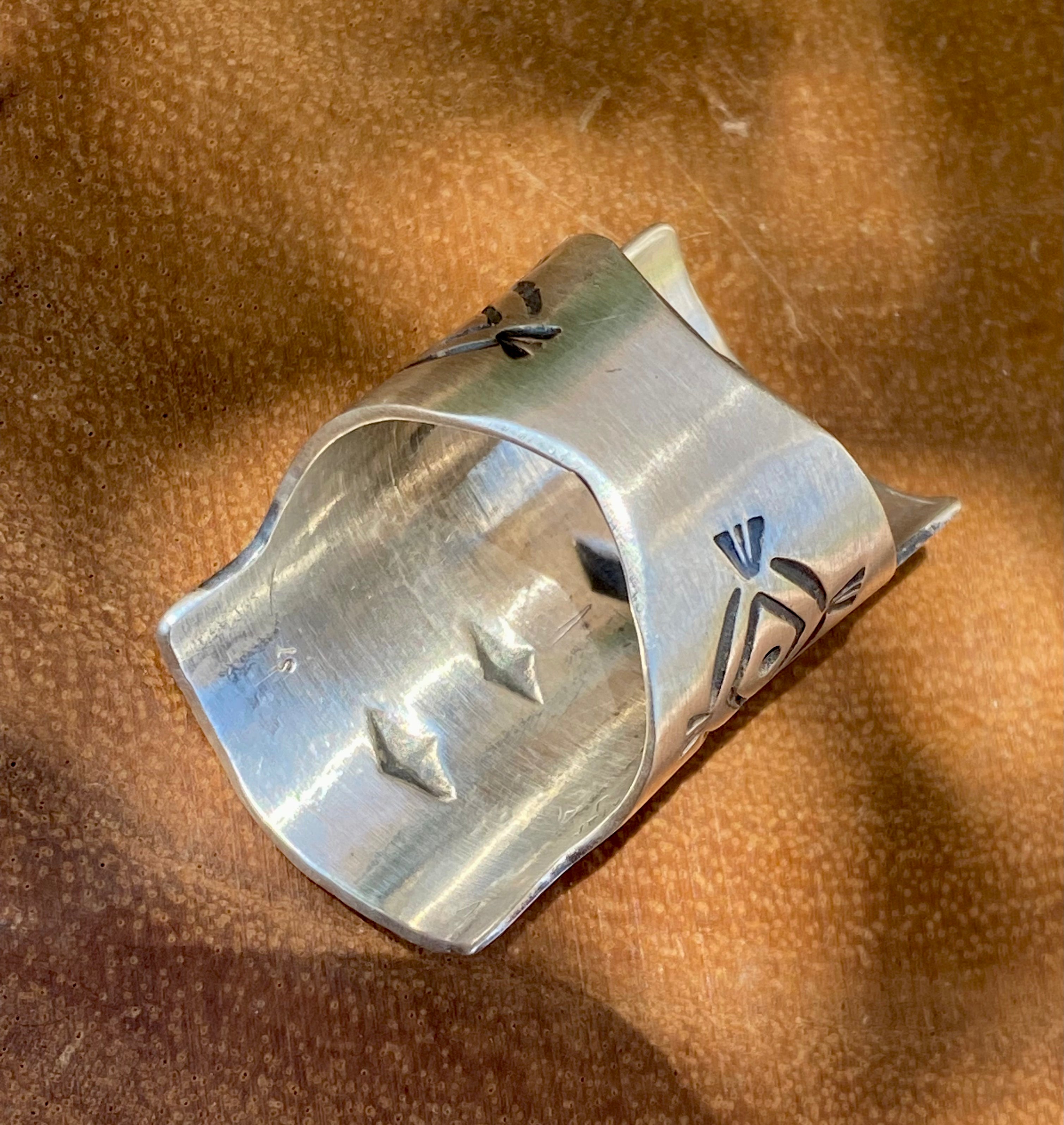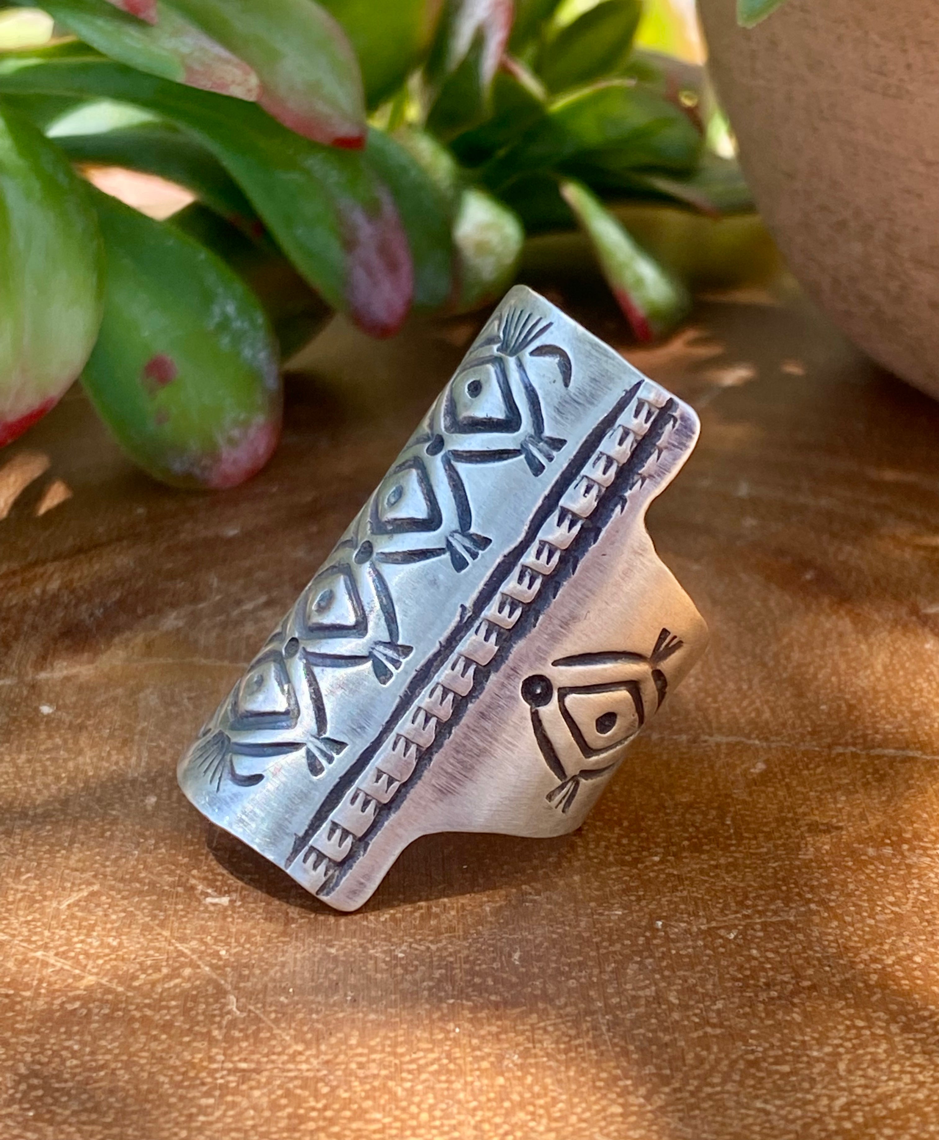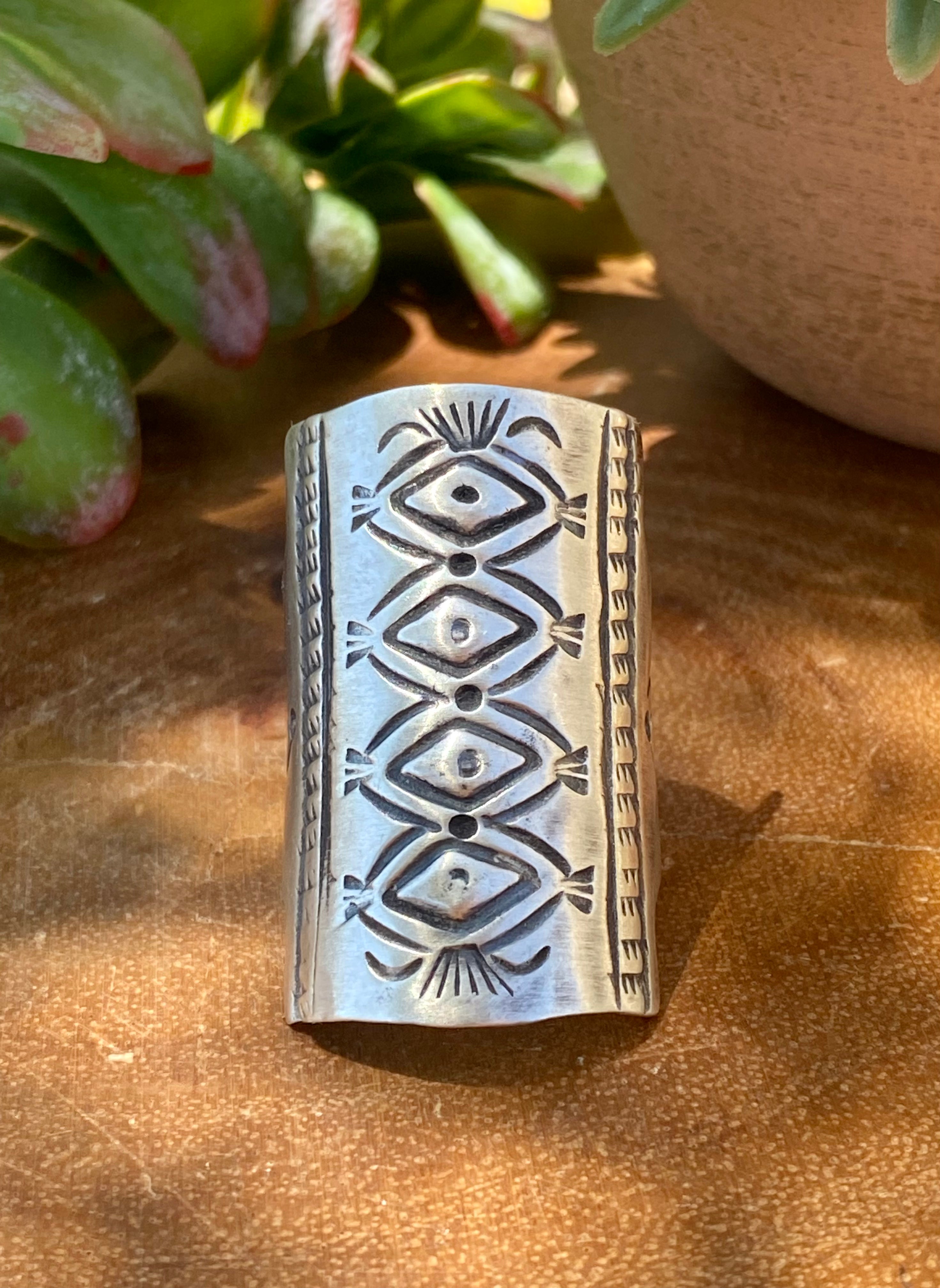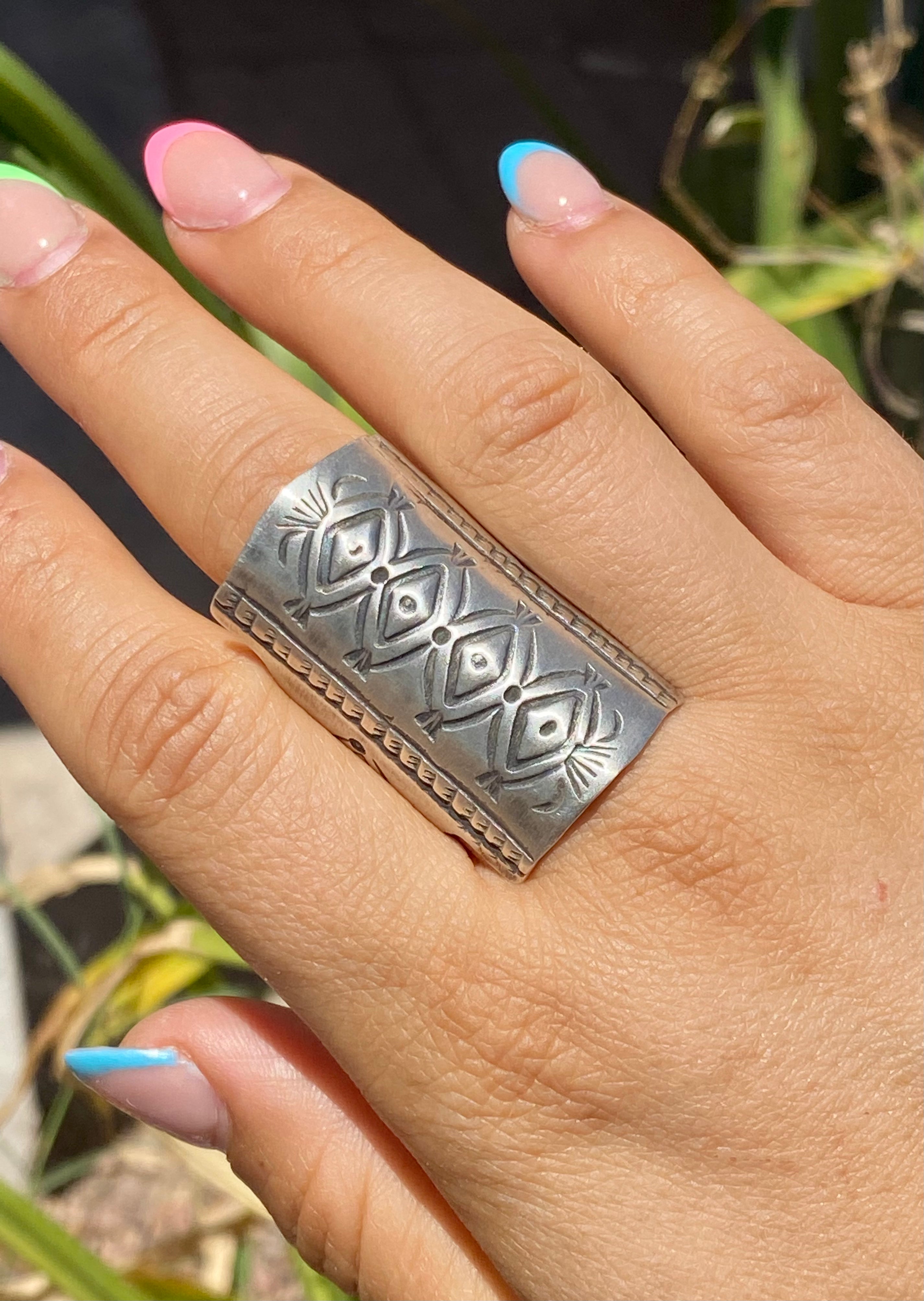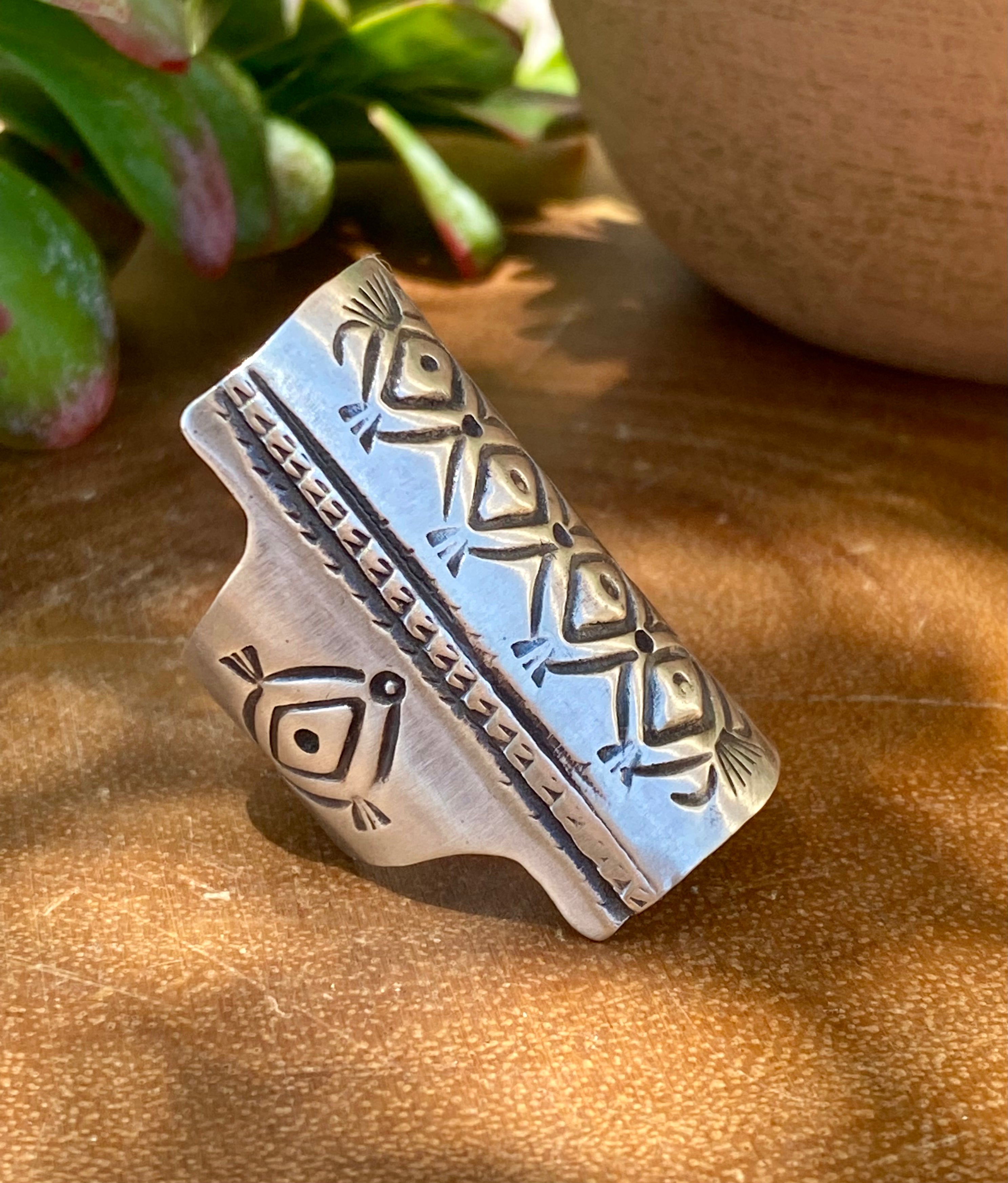 Marcella James Sterling Silver Ring Size 12.25. It measures 1 1/2 inches long and 7/8 of an inch wide. Signed by the artist and stamped sterling silver.