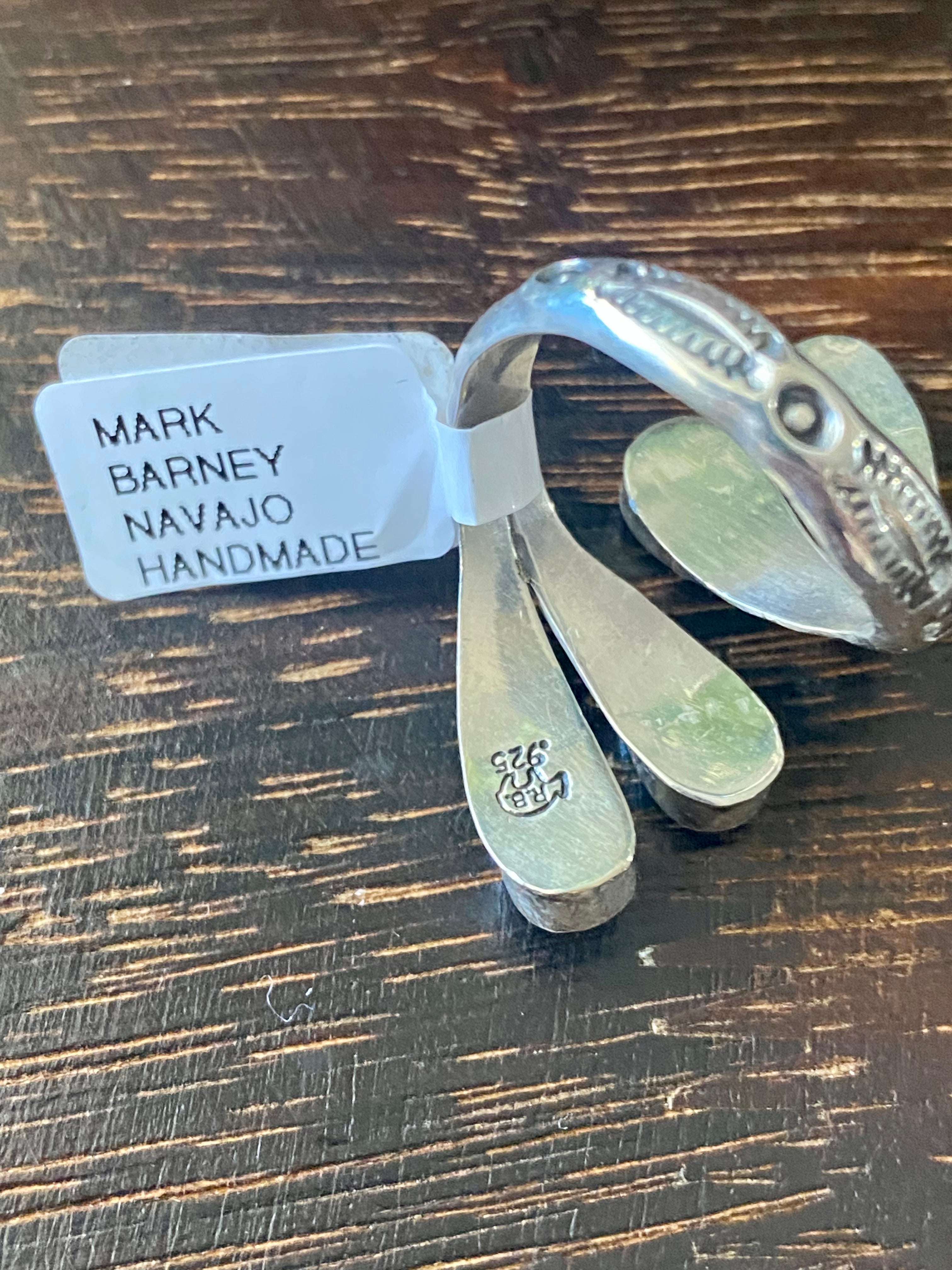 Mark Barney White Opal (Man-Made) & Sterling Silver Adjustable Rings. They measure just over 1 1/4 inches long and 3/4 of an inch wide. Signed by the artist and stamped sterling silver.