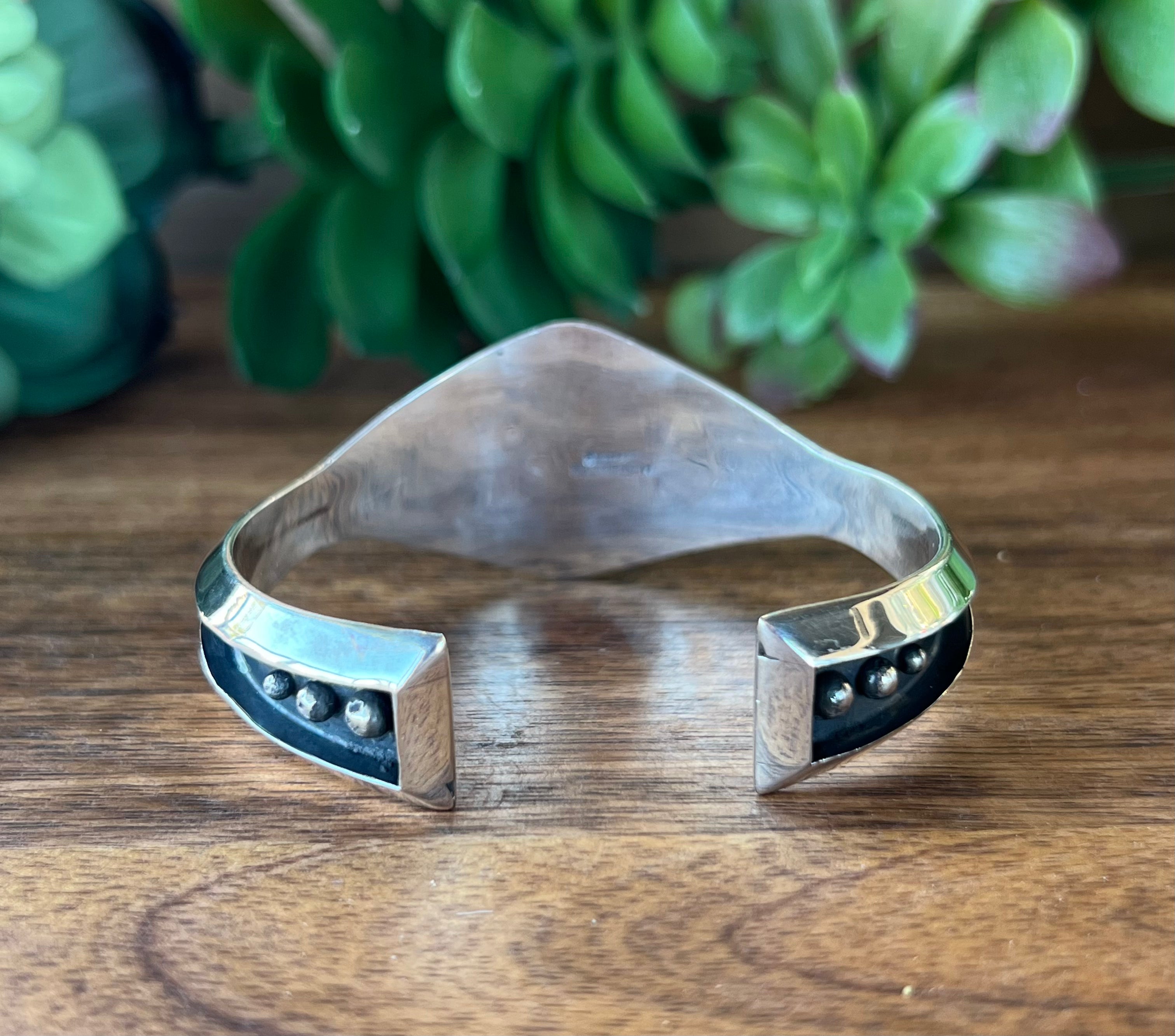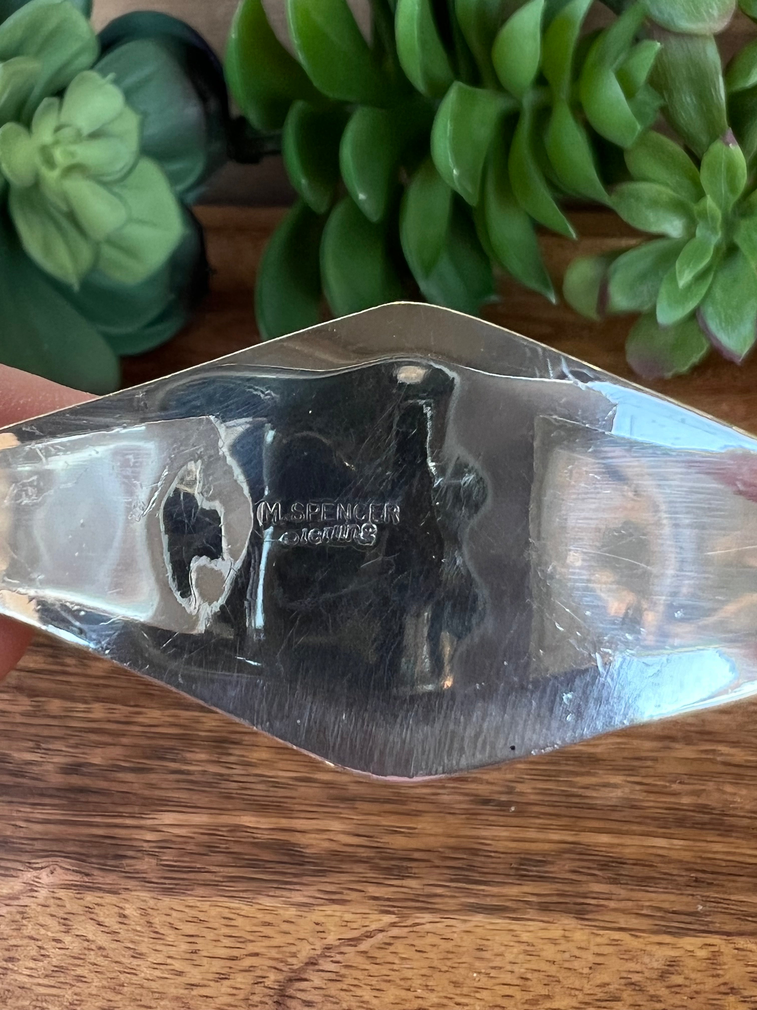 Mary Ann Spencer Lapis & Sterling Silver Cuff Bracelet. It measures 1 1/8 inches wide with an inside circumference of 5 5/8 inches and a gap of 7/8 of an inch. Signed by the artist and stamped sterling silver.