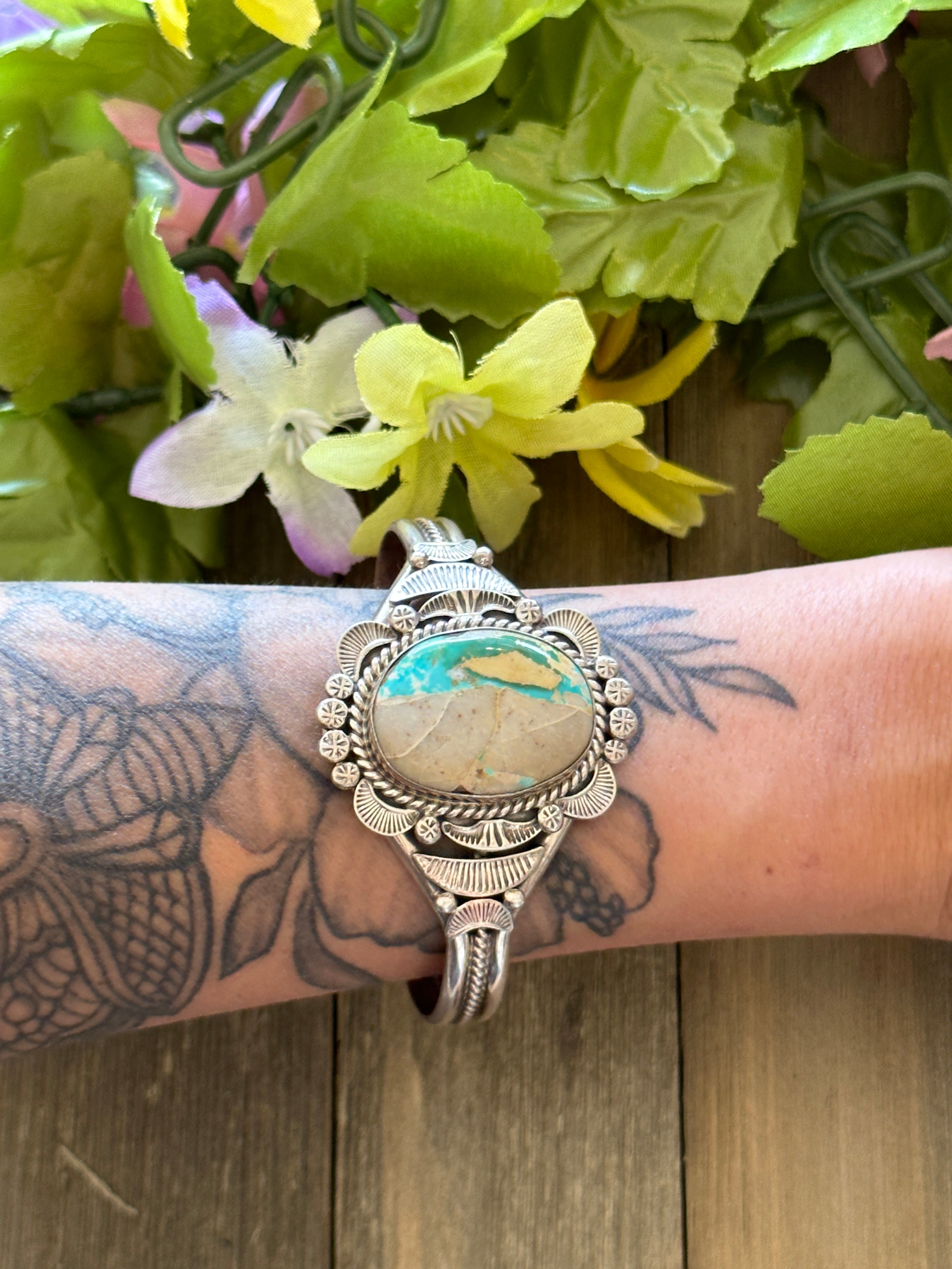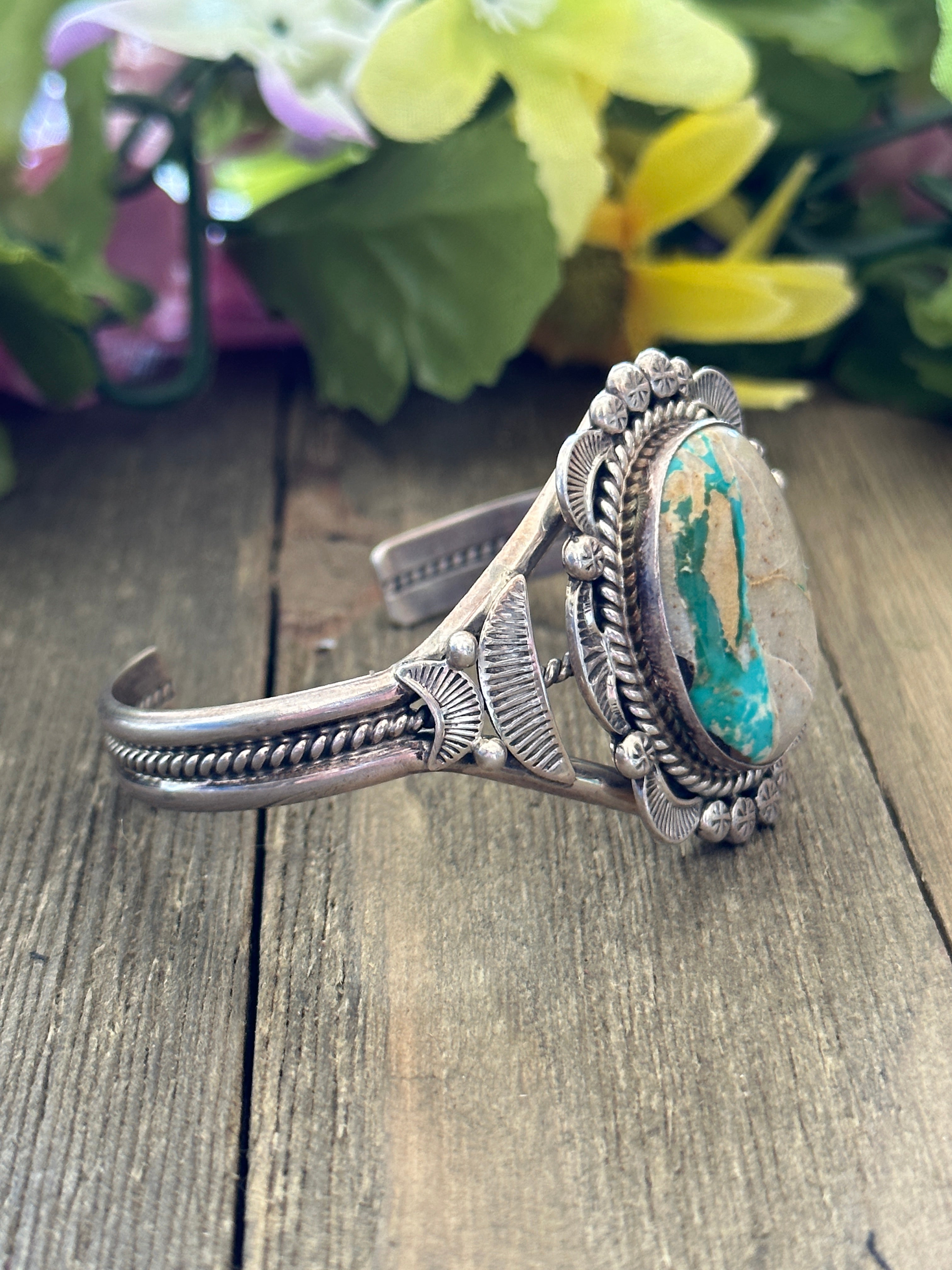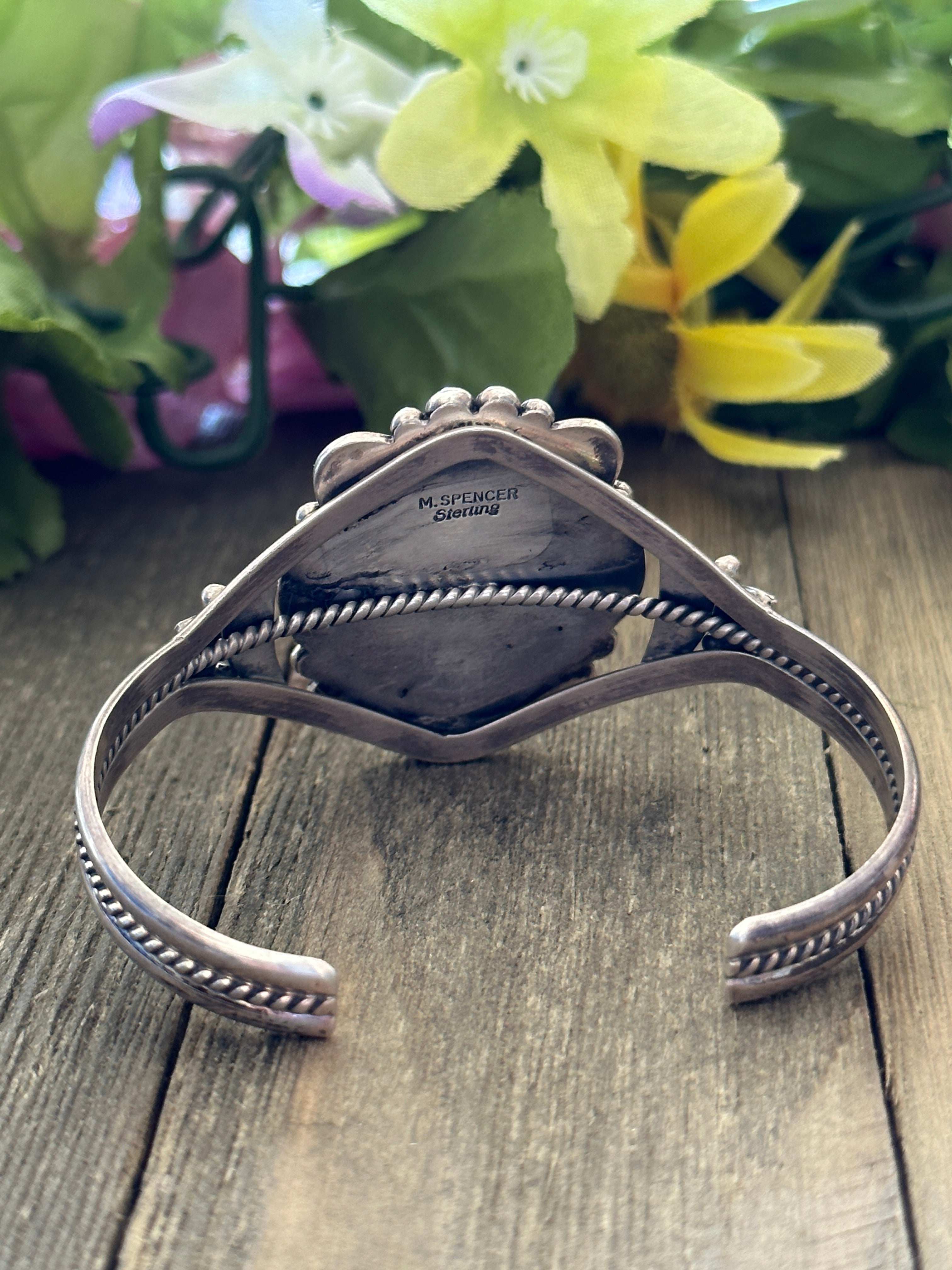 Mary Ann Spencer Royston Turquoise & Sterling Silver Cuff Bracelet. It measures 1 1/2 inches wide with an inside circumference of 5 3/8 inches and a gap of 1 1/8 inches. Signed by the artist and stamped sterling silver.